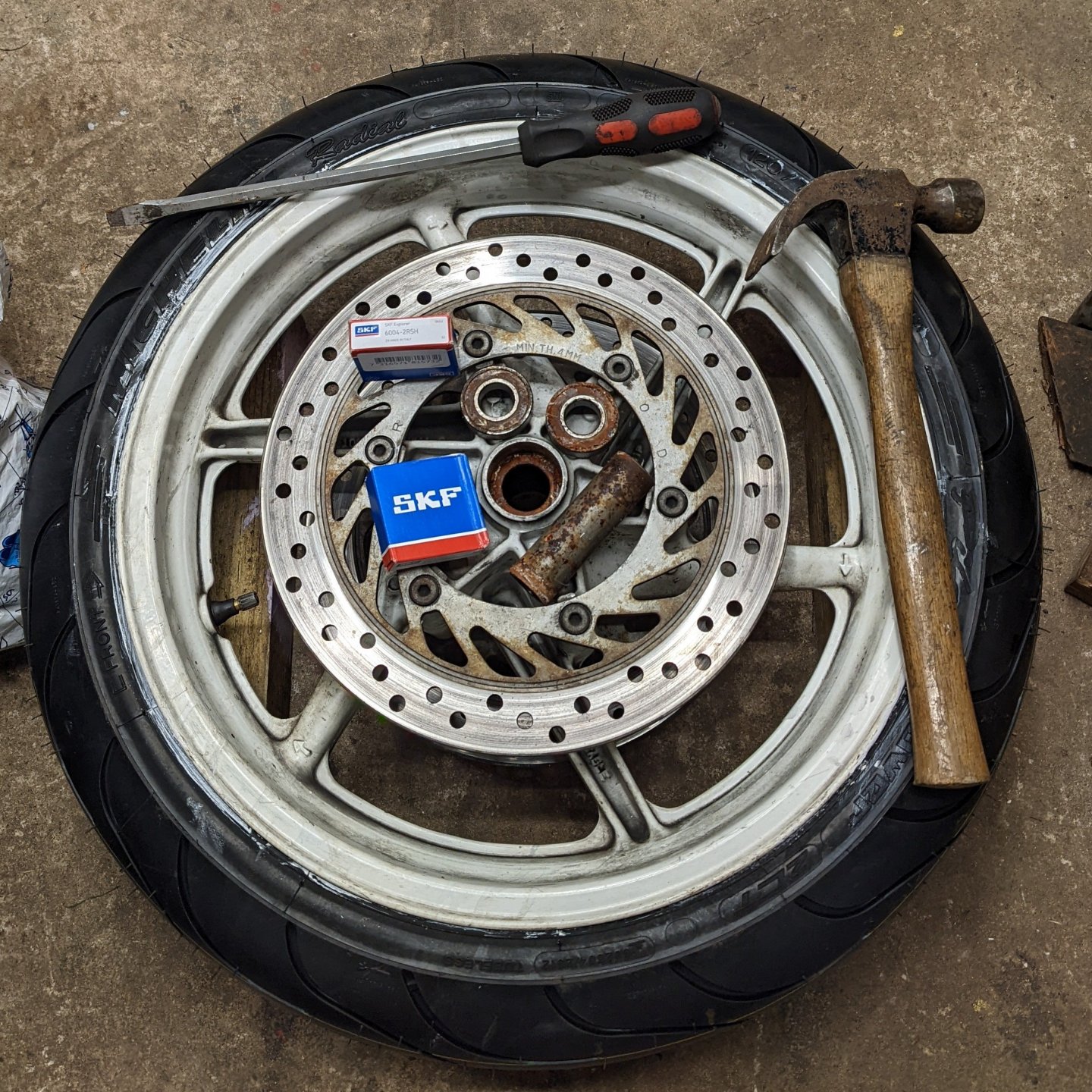 Few days to go now. Front tyre fitted at the old place, tenner all in. I remember now why I used to go there. He said it used to be 8 quid though. There was a fair bit of tread left, but I'm glad I got the wheel out because I noticed at least one bearing was notchy. Tyre man he say it fine, tyre man say he had tiger wheel come in so notchy it wouldn't rotate on the balancer and that was fine too. Off to the bearing shop afterwards for a couple of 6004's and then it was a 10min job with the hammer and special punch, lovely jubly. About 7 quid for two SKF Explorer bearings. Silky smooth and all is right again, nothing finer.4 points