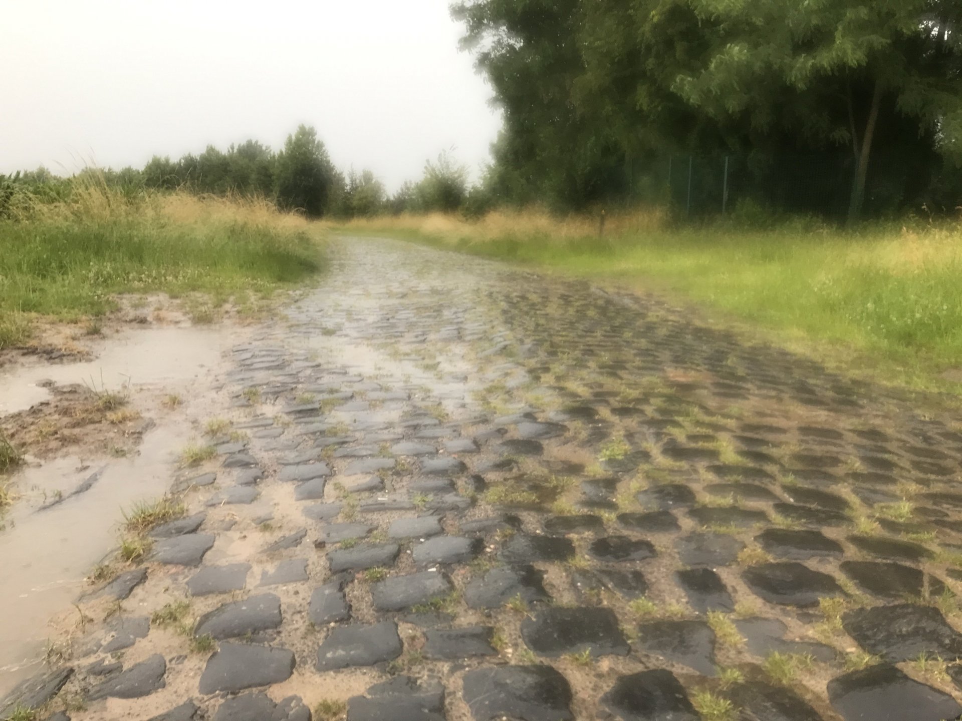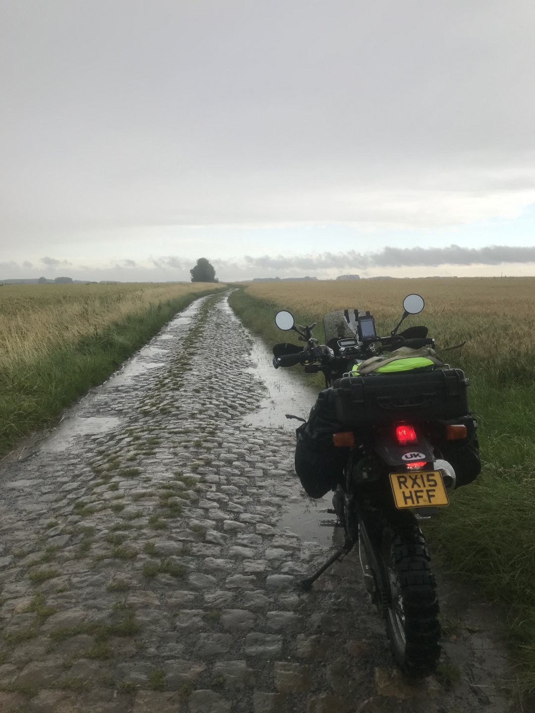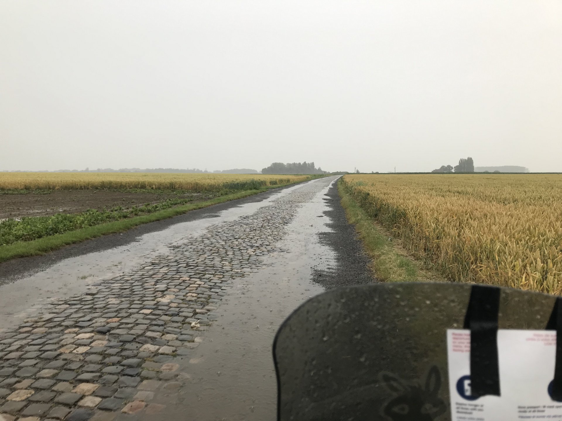 So today was what you might call an adventure. I’ve been looking forward to riding the pave (cobbled) roads for three years now and they didn’t disappoint. The weather however was something else, when it rains in France it feckin rains, none of this namby pamby stuff. I’m sat in an Irish bar in Compiegne now having a couple of pints of Guinness1 point