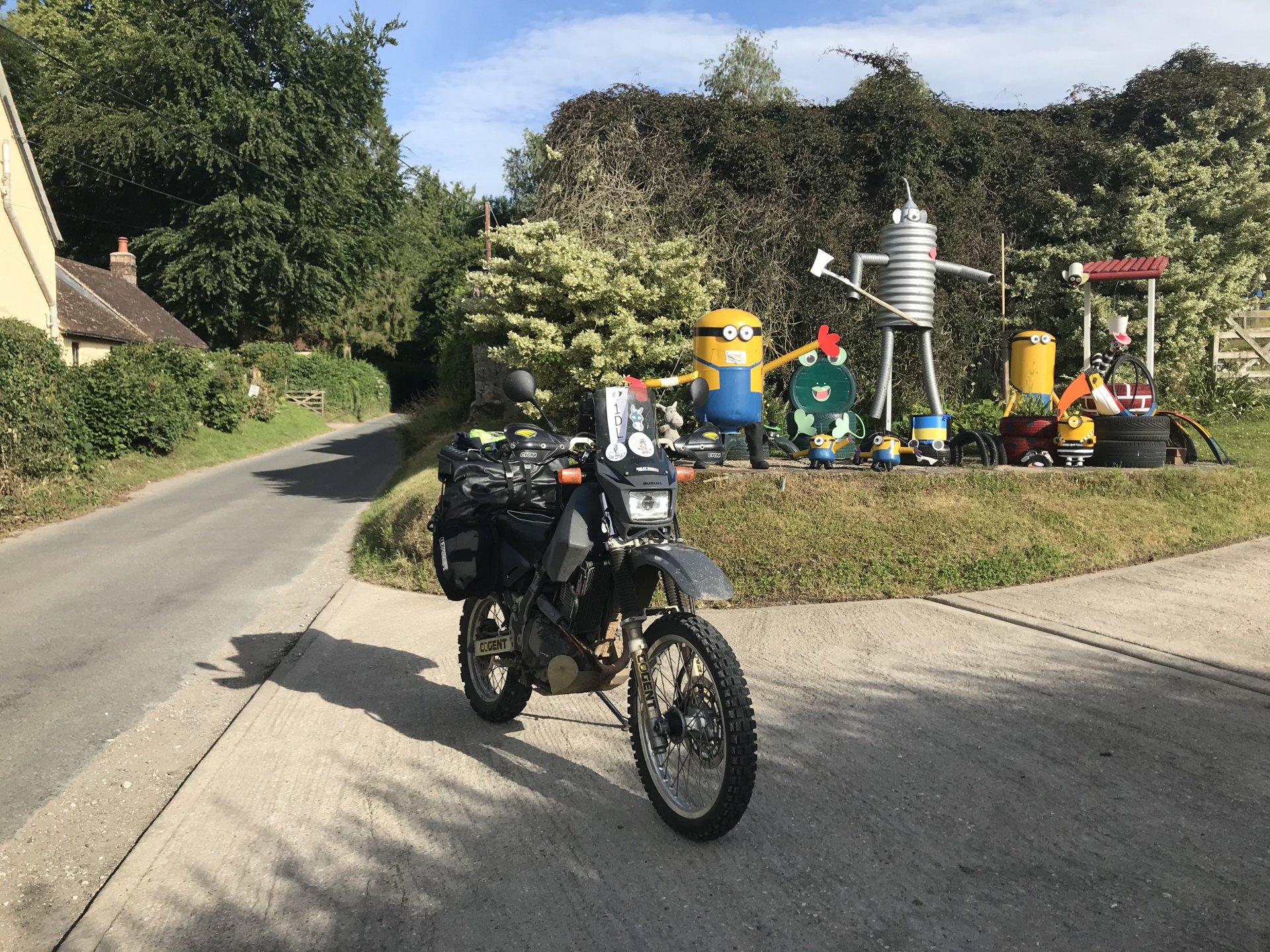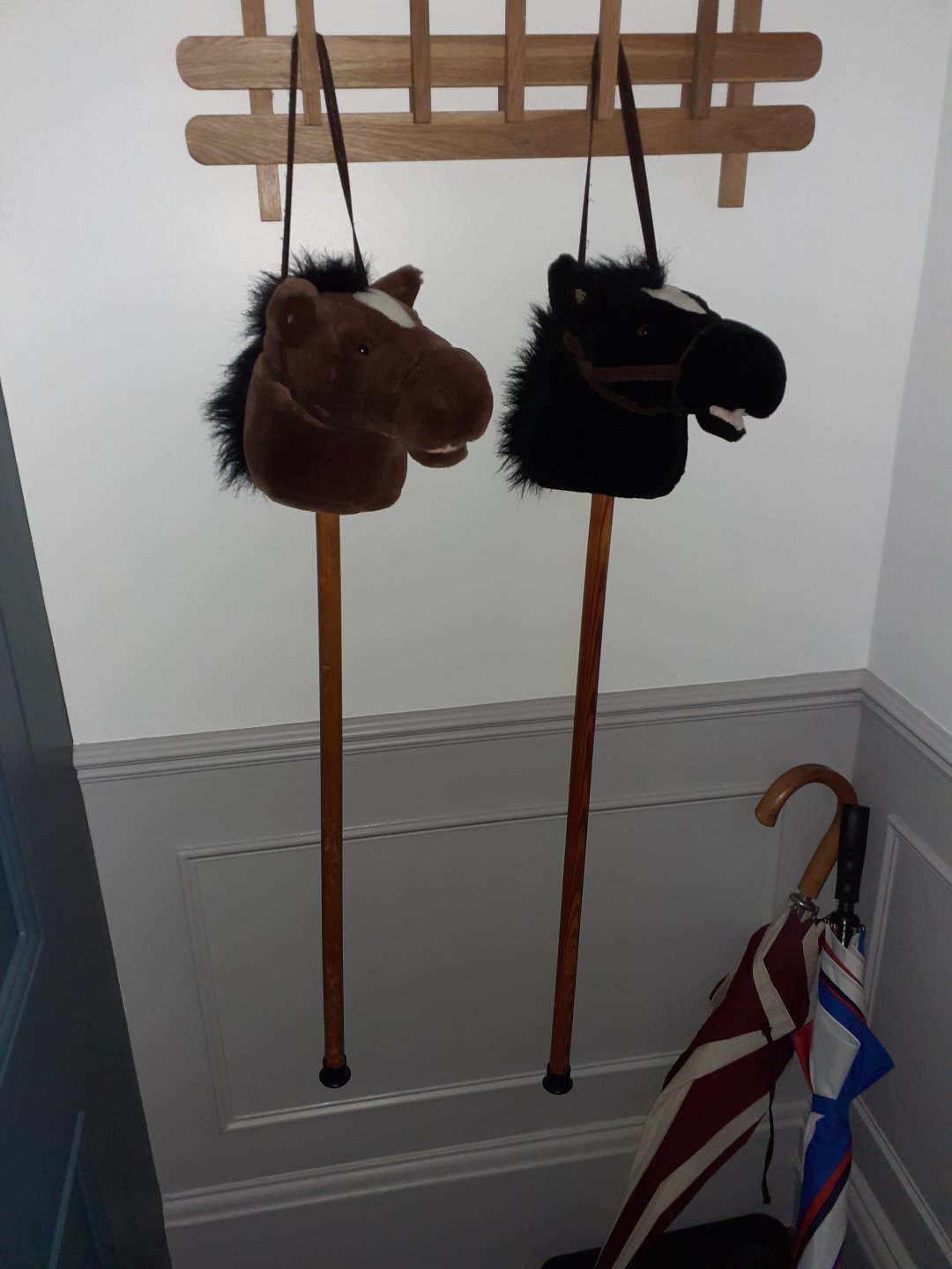 I went to north Devon to visit my son and his family plus to have a little ride round and look at a bit of scenery. The weather report lied as usual, those wankers at the Met Office should have their soft dangly bits put in a vice. Whilst passing over Exmoor in the pissing rain on the way there was a bright flash off to one side of me and an immediate noise like a bomb had gone off. I though the army were firing shells, but realised quickly it was a close by lighting strike. I shit myself! Visited Clovelly, the private village you pay to walk in (no driving allowed). The shop keepers I met were all really chatty, they had visited and then got jobs and moved in, one had been there 20 years, but still had a broad Birmingham accent. All goods are moved about by sledge and most houses had theirs stored outside the front door, chained up to stop tourists taking them home I reckon. Later went to The Valley of the Rocks and left it at the other end via a £2 toll road. Road as a description was a bit strong, it was about 5 feet wide with a heap of mud along the middle all along its twisting steepness. Trying to keep my left leg away from rocks and tree branches meant my front wheel hit the mud in the centre sometimes and caused a few hairy moments. Couldn't even stop and take pictures it was so narrow with drop offs into the surrounding woods. I stayed in a B&B that used to be the old vicarage in Barnstaple. The two hobby horses pictured were hanging on the coat rack.2 points