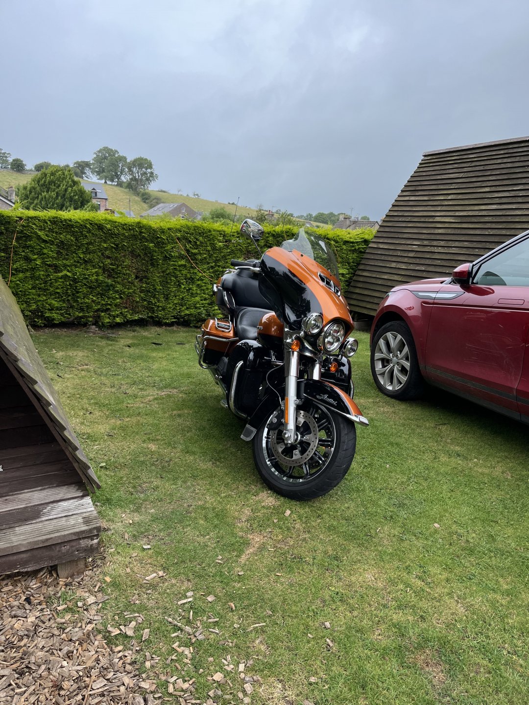 Everything everyone has said about avoiding riding this weekend was true. Forgot it was the first friday of the school holidays. Motorway packed, filtering bloody hard work and it pissed down. Nevermind made it to the Pennies and have decided as the weather is shite I’m going to postpone riding the Lake District til tomoz and mainly eat steak n lounge around. This beast (Ultrglide) weighs over 400kg! The bloke who rides it (with his wife on the back) is 73 and looks like a strong breeze would knock him over. Goes to show you can’t judge a book by its cover. I might remind him of that later cos (and you lot will love this) he spoke solely to Mr Slowly who knows almost nothing about the bikes and his wife insisted I looked at her kitchen pans Old people ay wot u gonna do?5 points
