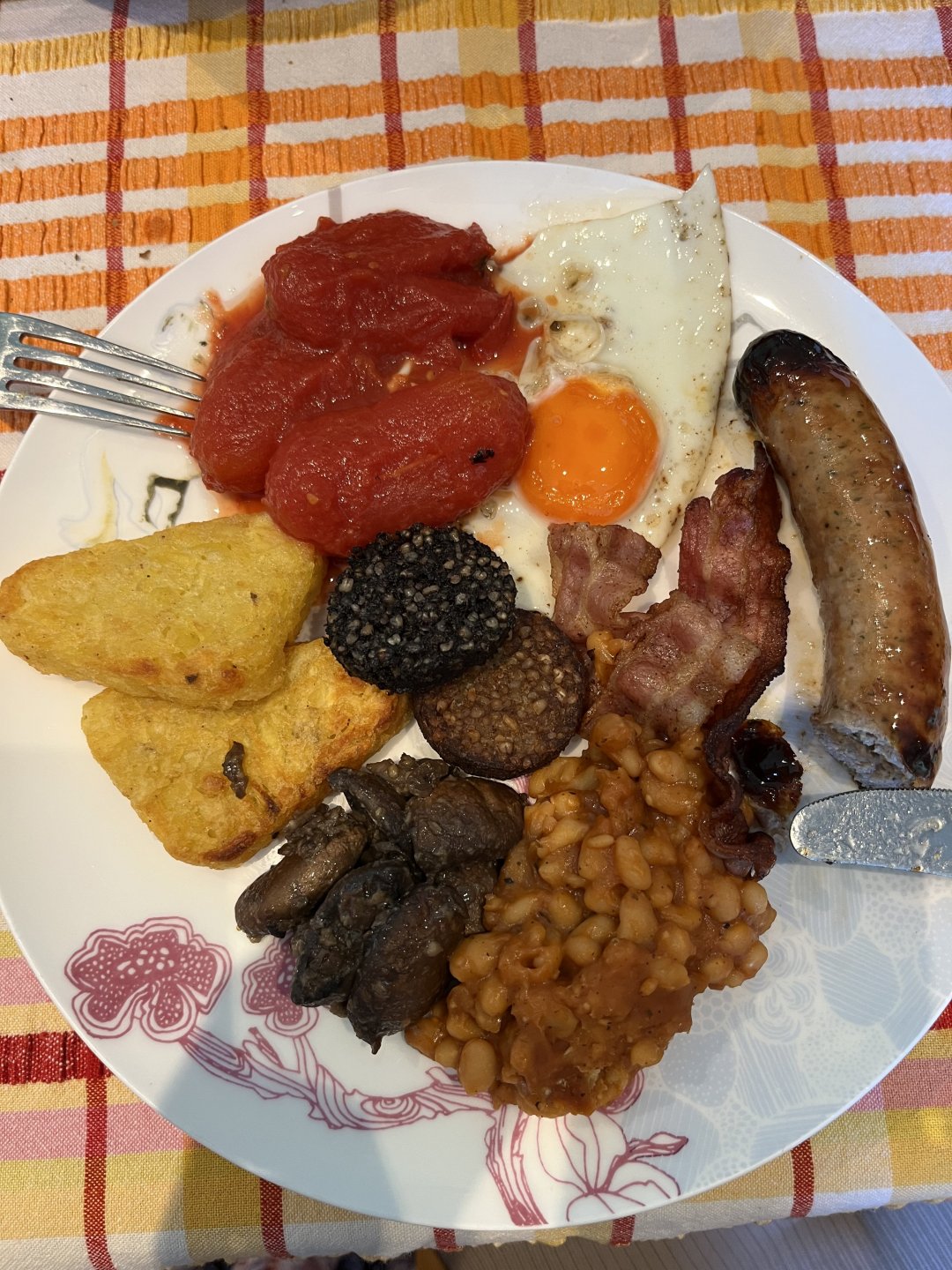 Full English this morning. Sausage, Egg, Bacon, Hash browns, Plum tomatoes, Mushrooms, Beans, Black pudding, White Pudding and toast (made with thick sliced tiger childrens bread Couldn't photograph anyone else's because they piled it so high it looked shocking. Everyones been in a food coma for over an hour now2 points