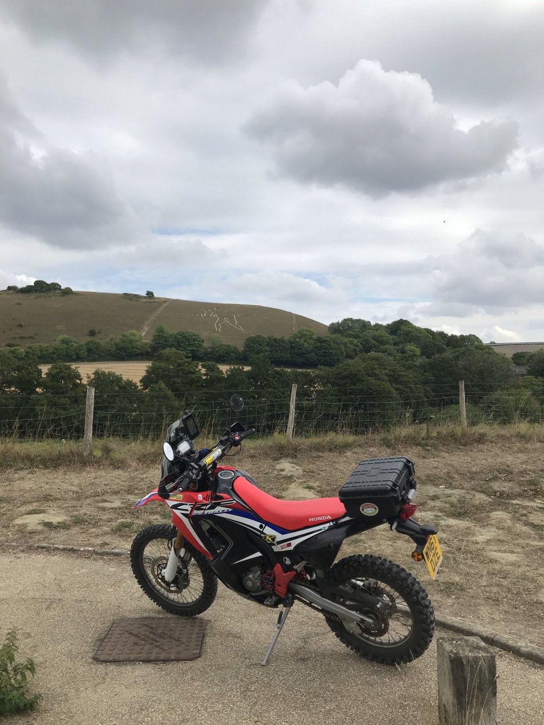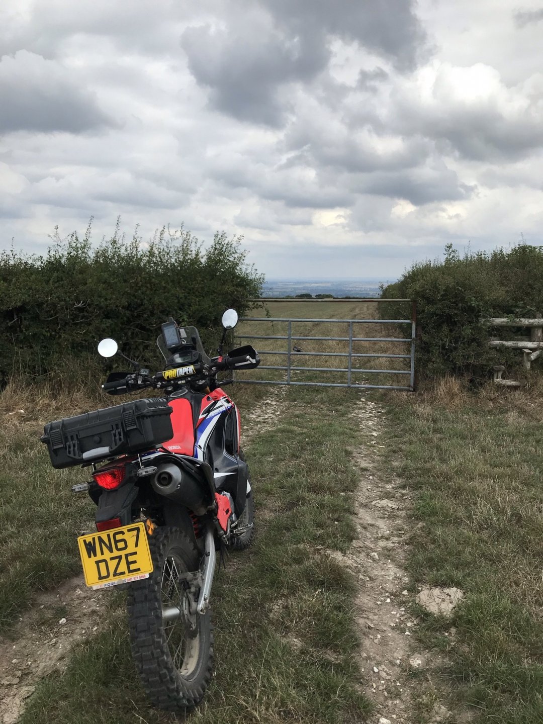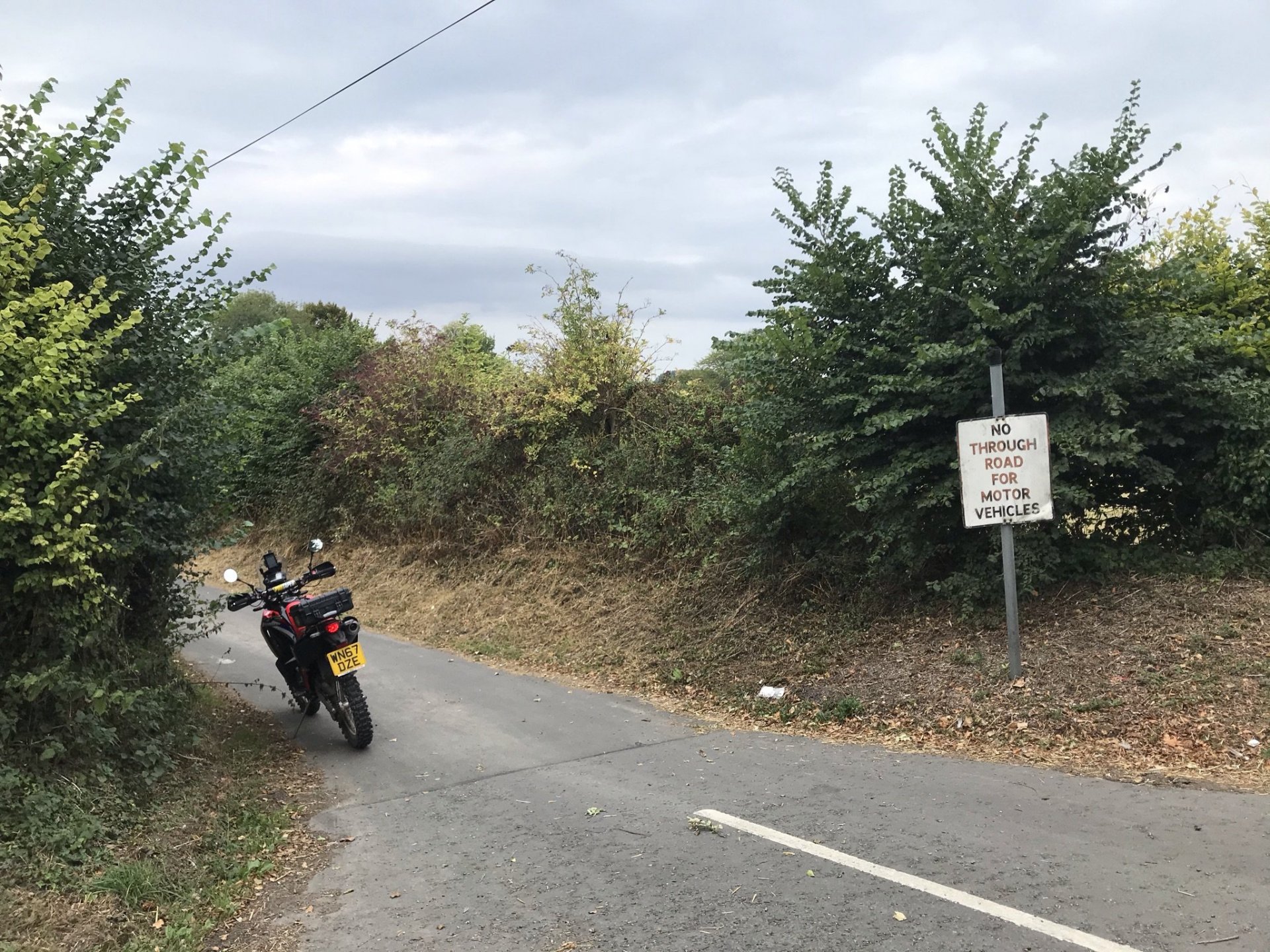 Next up was another lane that I've passed many times but never ridden . This is a Byway (open to all traffic) and yet there are locked gates at both ends, I just rode around the gates and carried on........... Further up the road I got to another lane that was completely blocked with farm machinery, there was no way past this one but obviously the rich land owners around these parts don't give a toss about the law Next I rode down into Cerne Abbas to see the famous land mark on the hill, if you zoom in you can clearly see that this dude rode a Honda Rally Just at the entrance to the next lane I stopped to take this photo of the drive leading up to some posh pad , a lady who was driving down would down her window and told me that I shouldn't be parked there So onto another a couple of lanes with glorious views.................... and then this one which involved opening and closing five gates along it's length1 point
