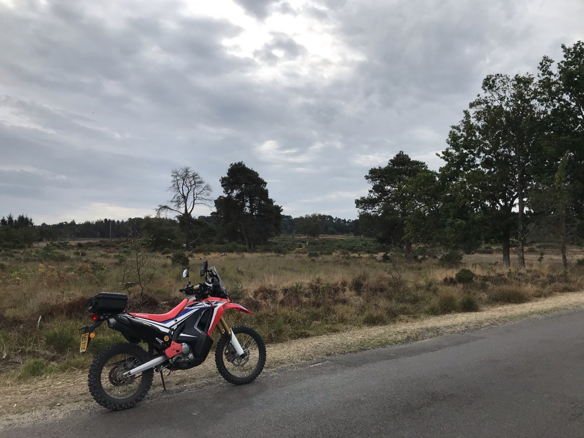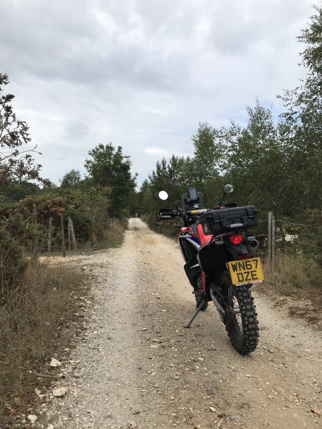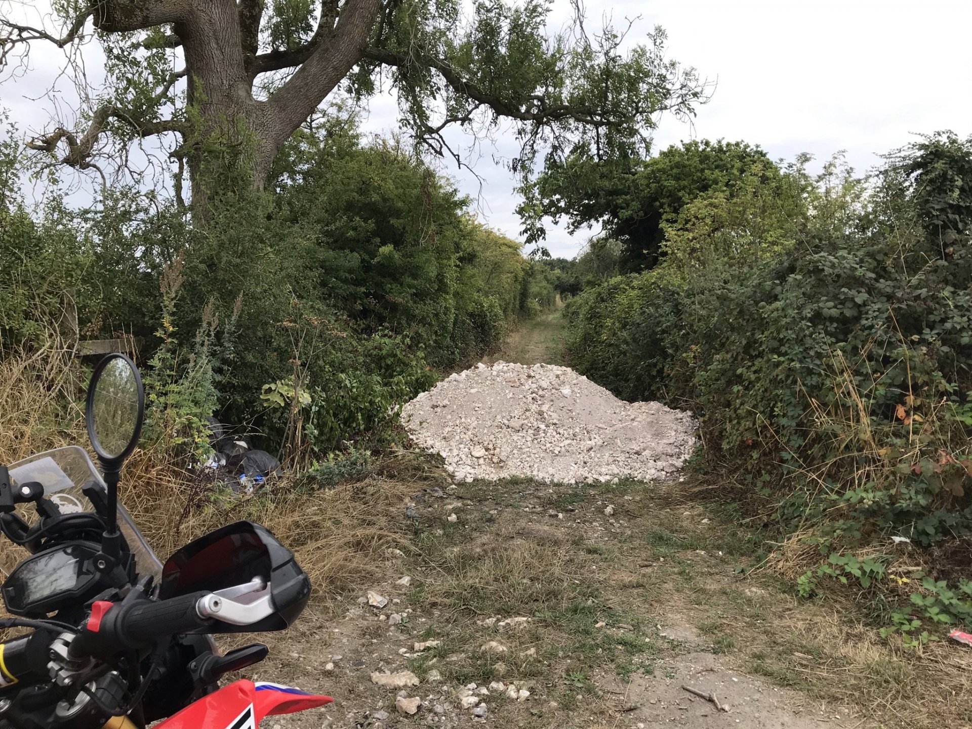 Now most of the lanes so far had been climbs or descents over chalk or rock and they were bone dry so the next lane came as a bit of a shock. It started well with a lovely old sign just off the main road............ Then I had to hunt a bit to find the entrance as it went across someone's drive right outside of their posh house Once I got into the lane I first noticed that there was a lot of vegetation and it was very green , this ,meant that there had to be a water course underneath and that usually means boggy going. The vegetation was thick and you couldn't see the ruts underneath so there was a lot of paddling of legs to keep everything upright............... After about 15 minutes to do about half a mile I came to more solid ground (thank god) and stopped for a coffee. While I was stopped I noticed this very ambiguous sign which just about sums up how rights of way in England . It says 'Public route to Public path ' WTF is that supposed to mean ?? The next lane is a bit contentious but the gate wasn't locked today so I carried on up Everley Down. Then I cam to a new lane (to me) and found that someone doesn't want us to ride it I just rode over the pile of chalk/rubble and carried on............ Now I had to do a bit of roadwork to get down to an area of Dorset that reminds me of parts of France. It's heath type land with lots of sand and fir trees...............3 points