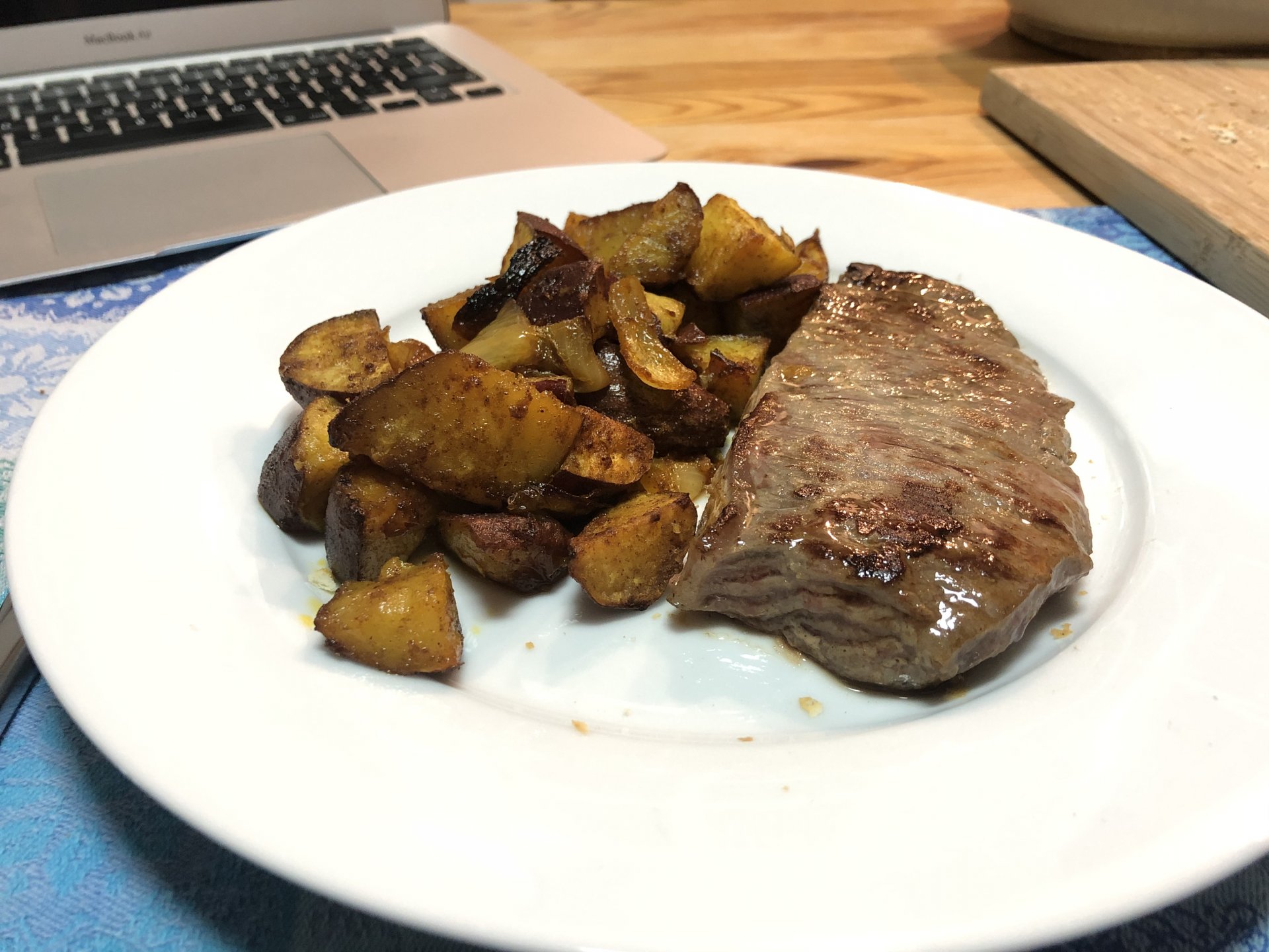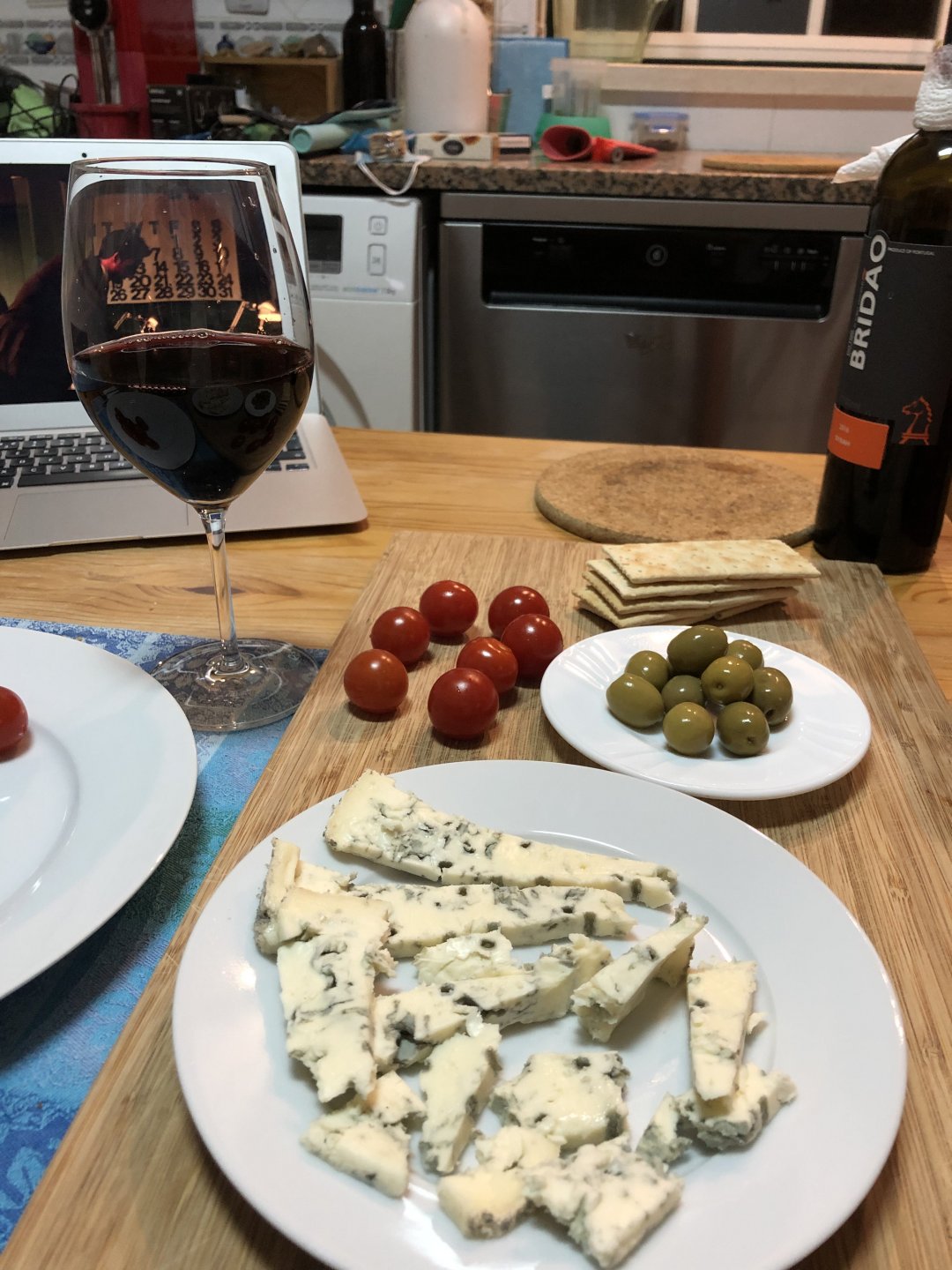 After a day's riding under a rain storm and not much else to eat but some hot soup at lunch and fruit. This evening's dinner... An entree of spicy gorgonzola, some olives and some amazing cherry tomatoes, I missed the flavor of tomatoes in this area. The wine is a local grown Syrah, very much my favourite bottle of red for the price. For mains, I had some oven cooked sweet potatoes and onions, lightly seasoned with turmeric and heavy on the paprika, and a small steak, bloody rare on the inside.1 point