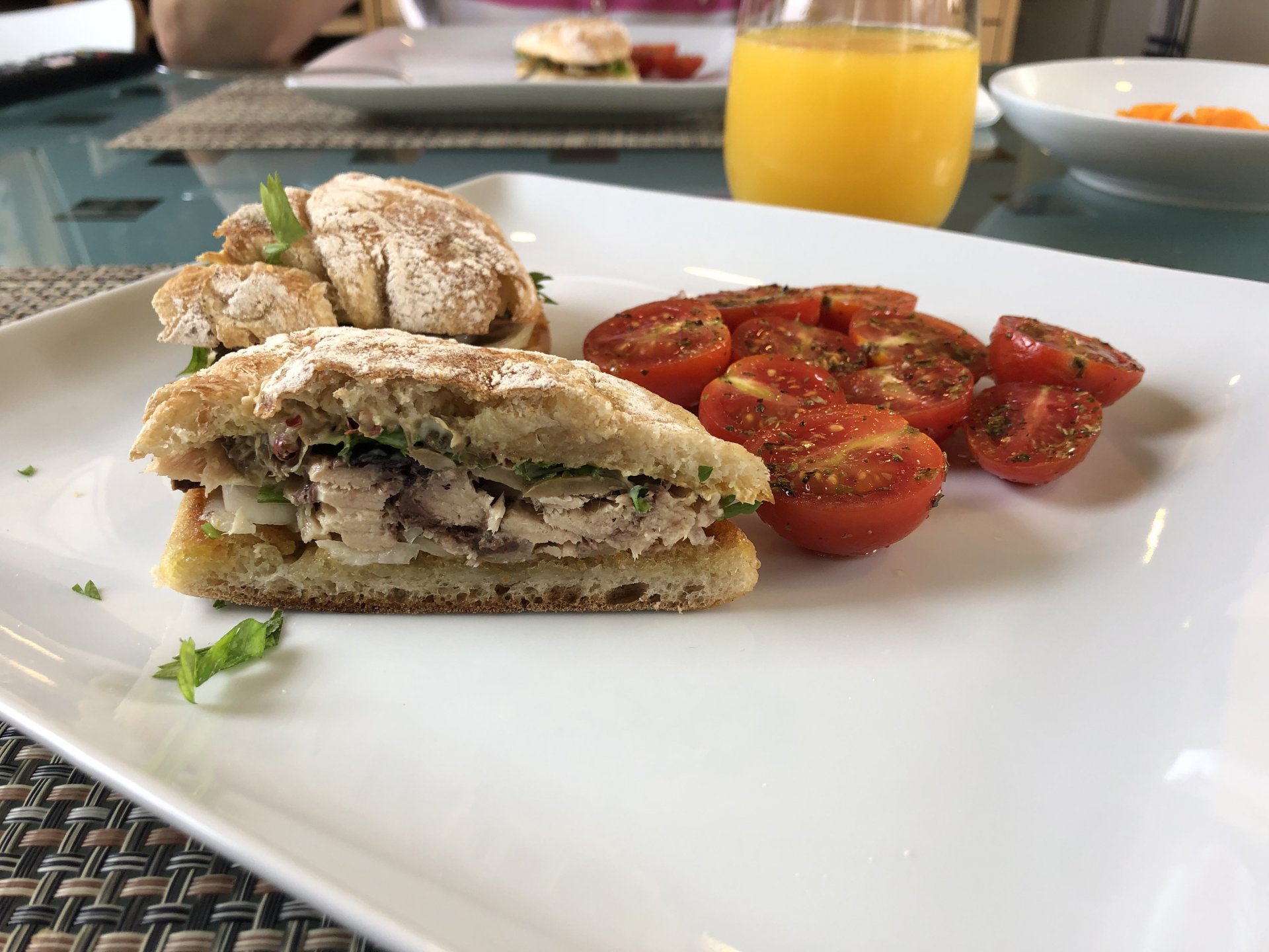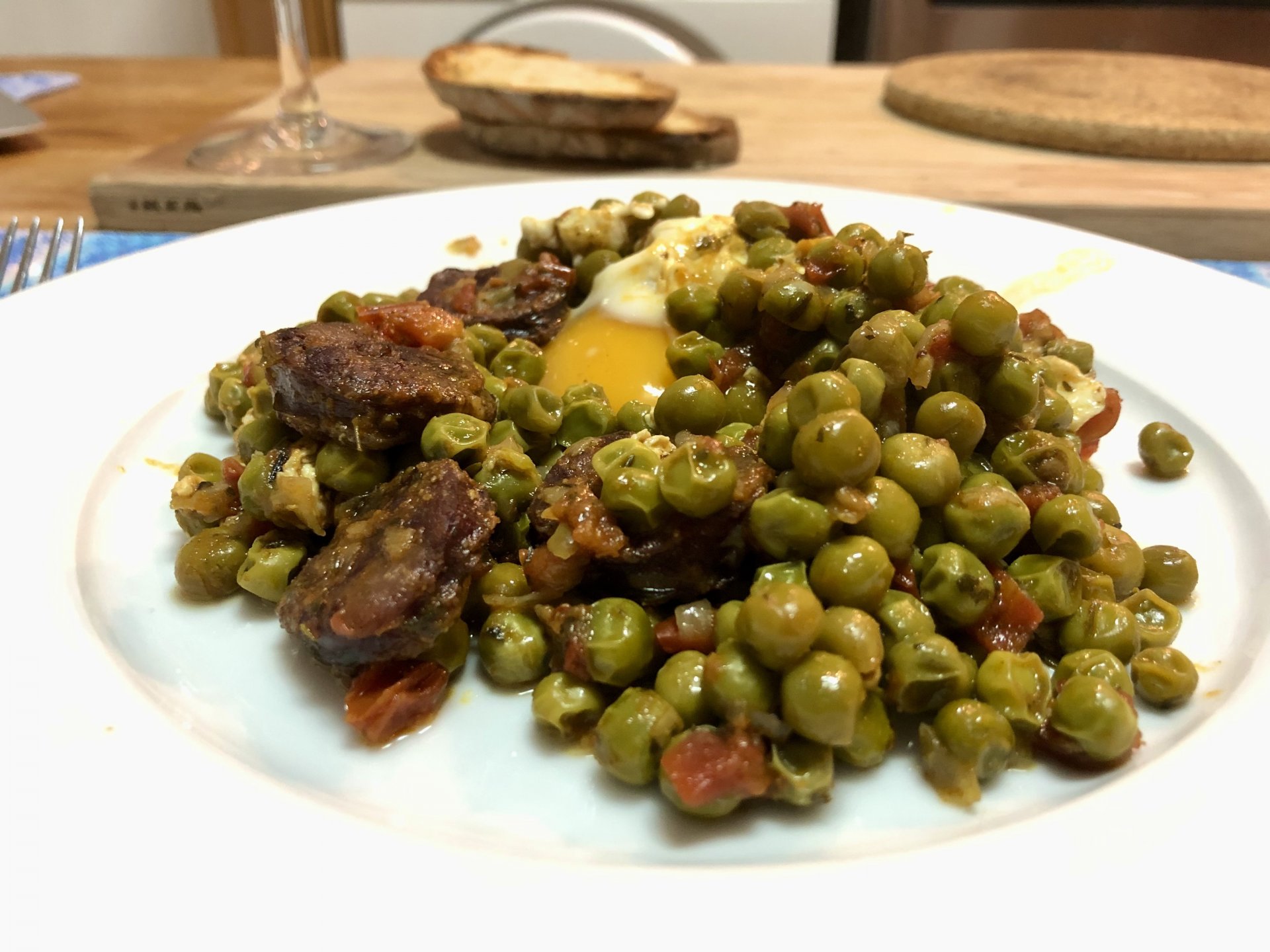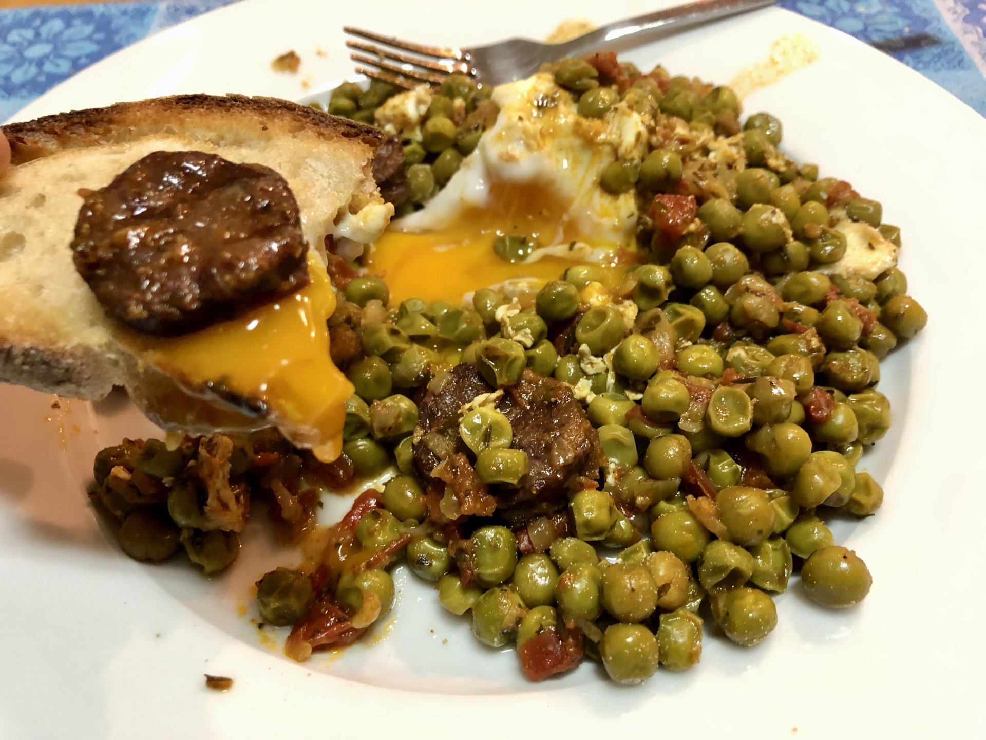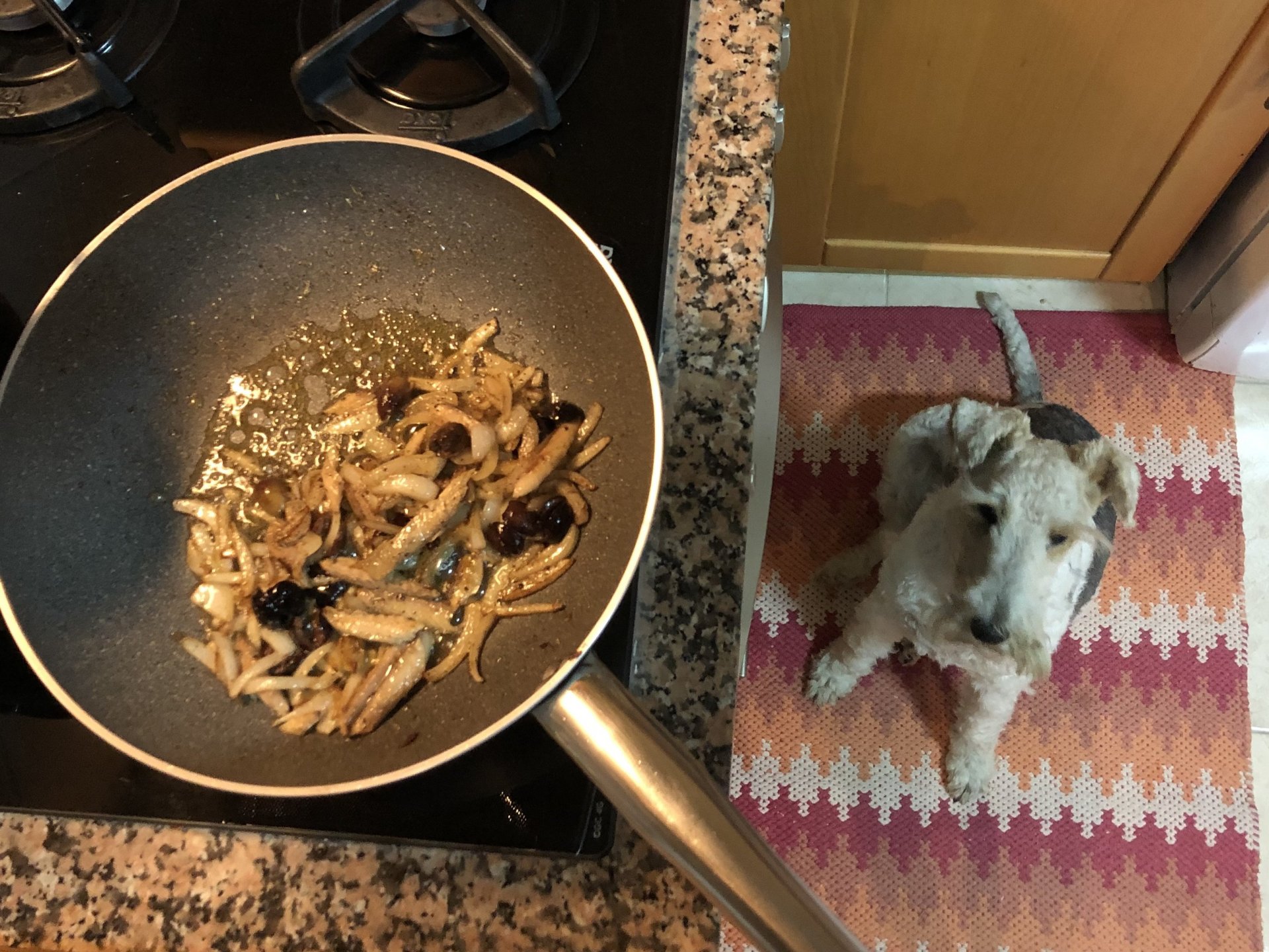 Warning, couple of meals in this post are about to offend certain sensitive personalities that are more of the cheeseburger persuasion. Quick 20 minute fresh cherry tomato pasta: Canned horse mackerel sandwich Leftover grilled camembert and tomato bruschetta Hotdogs, with caramelized onion relish Mum's leftover squid from the previous day, turned into pasta the day after Proper summer meal, the amazingly sweet pineapple was the star Grilled courgette sandwich, with canned fish. It's a great sandwich, with olives and capers. Pantry sandwich, whatever's at home and opened goes in Basil and mint pesto, it was pretty much perfect Perfecting my Broccoli pasta, it's getting there and probably my favourite thing to cook right now. Although it's a paella pan, let's not offend anyone and just call it rice Vegetarian dinner: grilled aubergines, sautéed mushrooms with garlic, and salad. A simple onion omelette Lea the Terrier, very interested in this pasta sauce as soon as the anchovies started falling apart. No pictures of the end result. Octopus "à Lagareiro", baked with olive oil and potatoes. I obviously didn't cook it, a very nice restaurant did. "Lagareiro" is the man that operates the traditional olive oil press, most "Lagareiro" dishes are oven baked with garlic and potatoes, and a healthy dose of extra virgin high quality olive oil. The pesto was this place's touch and it worked. Giulia is an italian lady I know, she runs a restaurant in Germany and most dishes always feature peas thrown in one way or the other. I remembered her for some reason and peas went into the pasta, the result was pretty great. Comfort food, peas with quality chorizo from the Alentejo black pigs. I put a few different spices like turmeric, a lot of cumin, smoked paprika, some herbs, the home grown egg gifted by my neighbour finished it off perfectly and was a touch of love.1 point