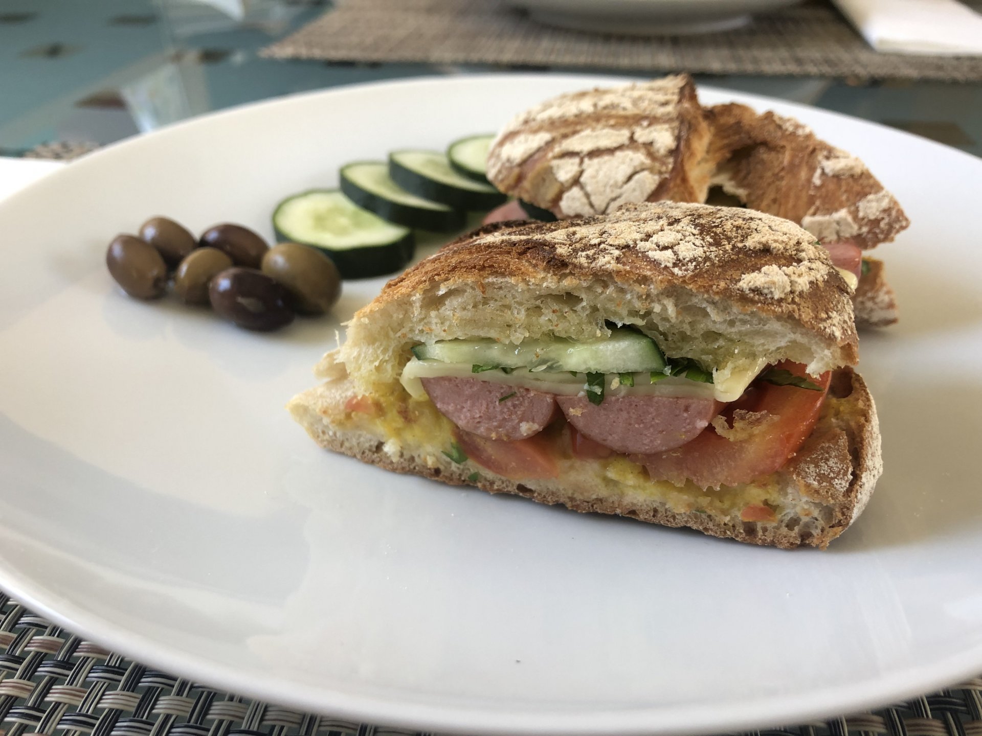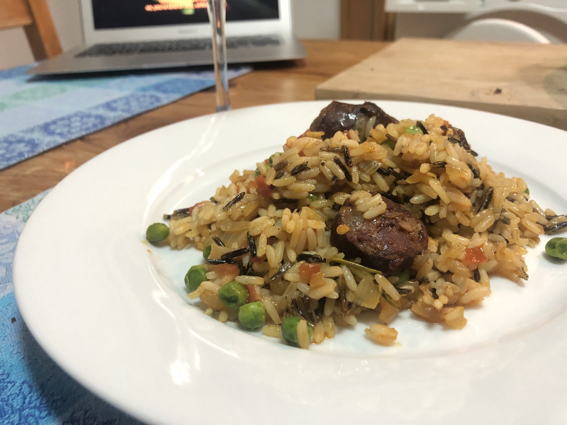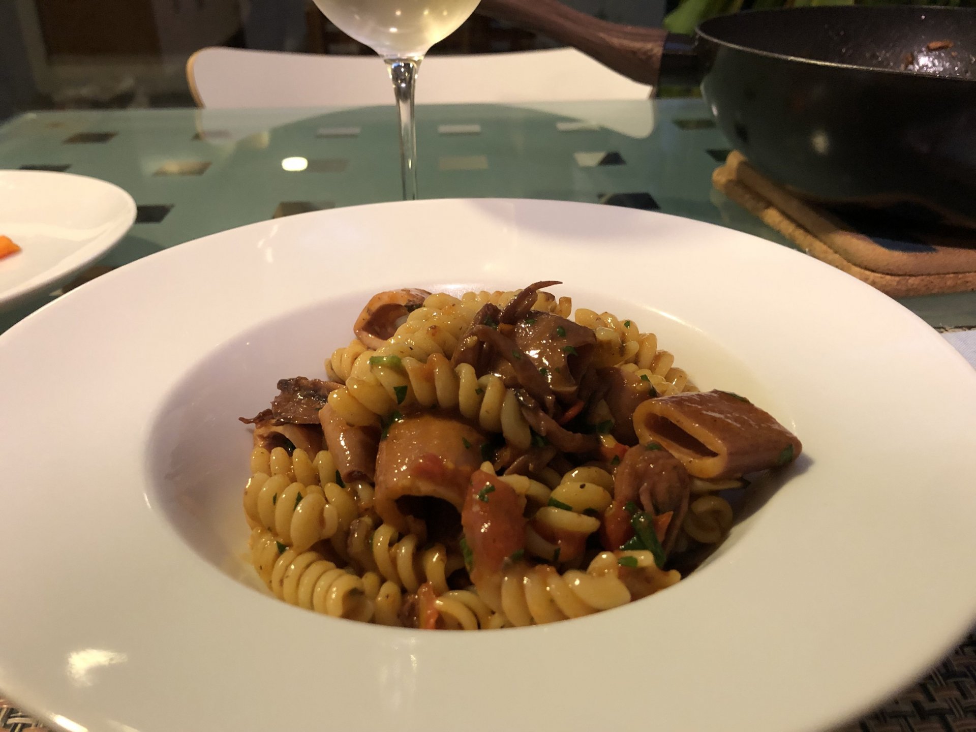 Warning, couple of meals in this post are about to offend certain sensitive personalities that are more of the cheeseburger persuasion. Quick 20 minute fresh cherry tomato pasta: Canned horse mackerel sandwich Leftover grilled camembert and tomato bruschetta Hotdogs, with caramelized onion relish Mum's leftover squid from the previous day, turned into pasta the day after Proper summer meal, the amazingly sweet pineapple was the star Grilled courgette sandwich, with canned fish. It's a great sandwich, with olives and capers. Pantry sandwich, whatever's at home and opened goes in Basil and mint pesto, it was pretty much perfect Perfecting my Broccoli pasta, it's getting there and probably my favourite thing to cook right now. Although it's a paella pan, let's not offend anyone and just call it rice Vegetarian dinner: grilled aubergines, sautéed mushrooms with garlic, and salad. A simple onion omelette Lea the Terrier, very interested in this pasta sauce as soon as the anchovies started falling apart. No pictures of the end result. Octopus "à Lagareiro", baked with olive oil and potatoes. I obviously didn't cook it, a very nice restaurant did. "Lagareiro" is the man that operates the traditional olive oil press, most "Lagareiro" dishes are oven baked with garlic and potatoes, and a healthy dose of extra virgin high quality olive oil. The pesto was this place's touch and it worked. Giulia is an italian lady I know, she runs a restaurant in Germany and most dishes always feature peas thrown in one way or the other. I remembered her for some reason and peas went into the pasta, the result was pretty great. Comfort food, peas with quality chorizo from the Alentejo black pigs. I put a few different spices like turmeric, a lot of cumin, smoked paprika, some herbs, the home grown egg gifted by my neighbour finished it off perfectly and was a touch of love.1 point