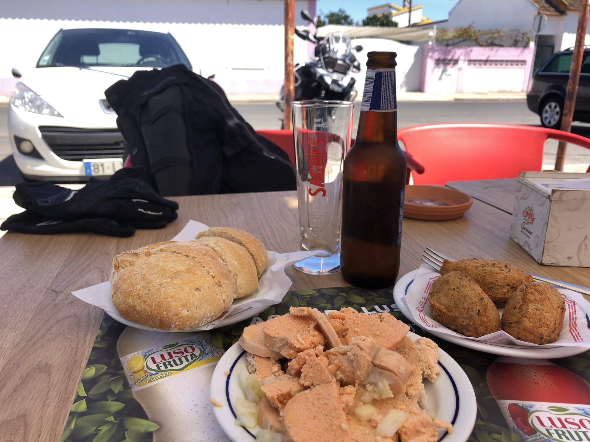 Today's lunch, roe salad and codfish cakes. They are made from codfish and potatoes, not really cakes but that's how it's translated. If you ever come by Portugal and see these around a cafe just point and ask for them. Typical, inexpensive and very good. You can give the roe a pass though, can't see most brits liking that even though it's great.1 point