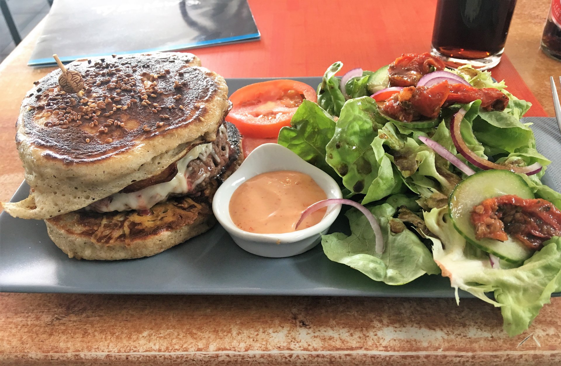 trawling through some photos yesterday amd came across this from our last Britanny trip. In Britanny they make ( apart from crépes) whant they call "Kouign" ( pronounced "Queen") which are pancakes more like blinis and can be savoury or sweet. This restaurant extrapolated this and produces a "Burger Kouine" ( burger King, get it?) which has "Kouine" instead of a bread bun. Bloody lovely! uuuurrrpsss !1 point
