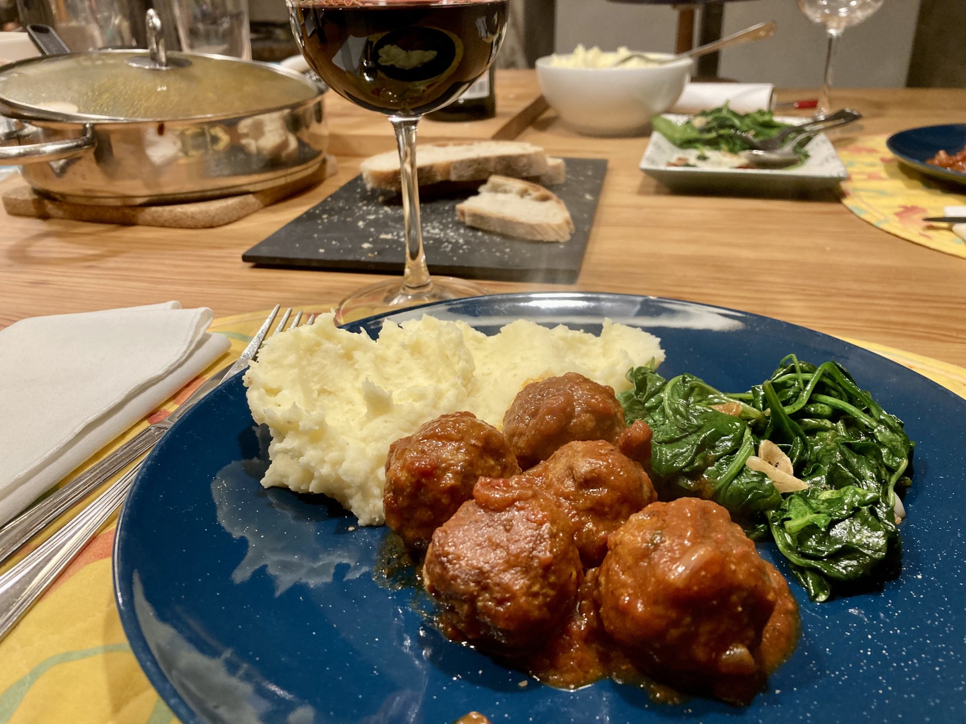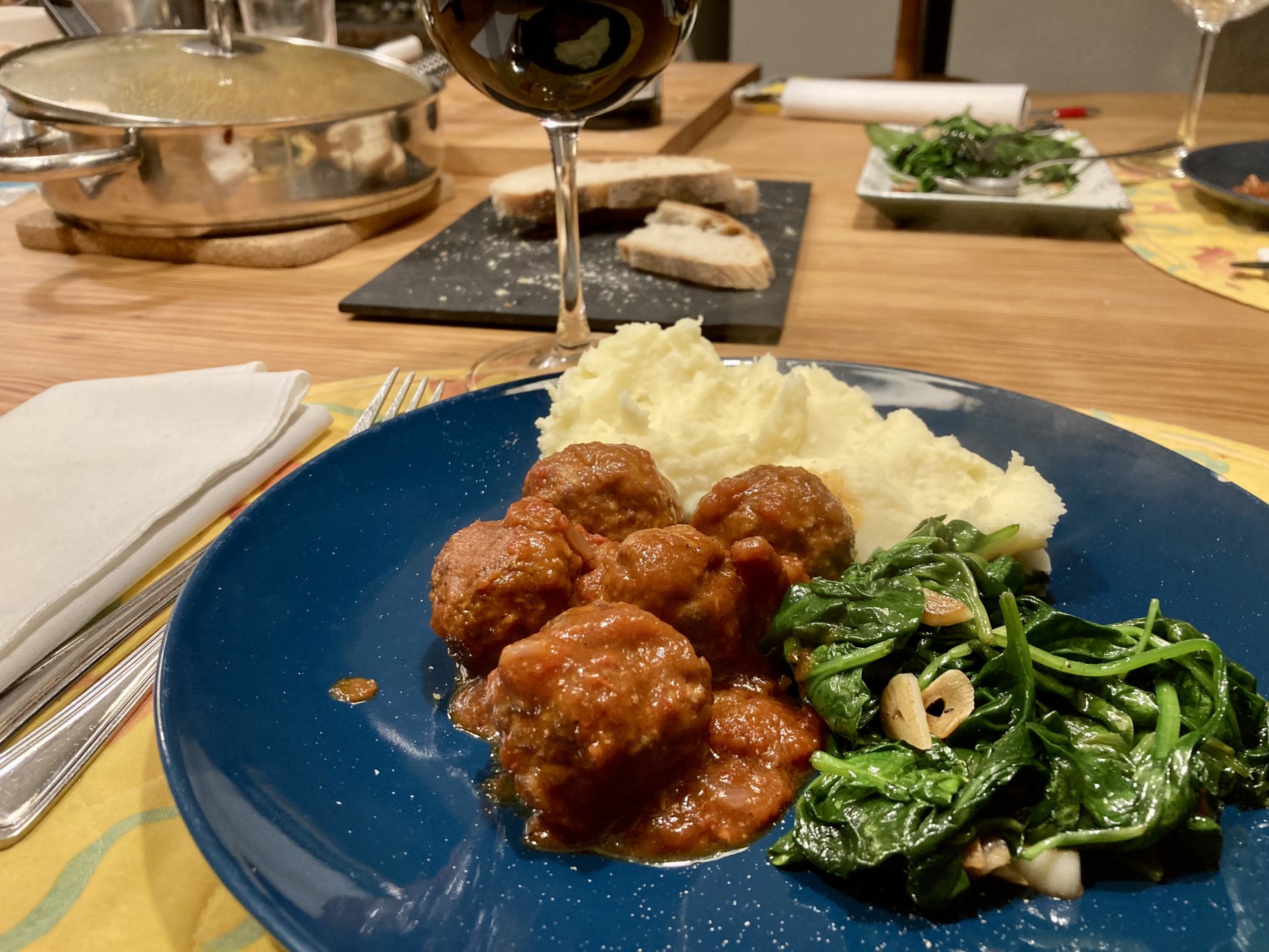 @Sofia’s meatballs and mashed potatoes with spicy garlicky baby spinach. The meatballs had my moroccan spice mix, and love, which made them delicious. It was amazing, and I’m typing this with a happy belly as I finish the second portion. The red wine is a Castelares Reserva, which is currently my favourite red wine, bought for special occasions2 points
