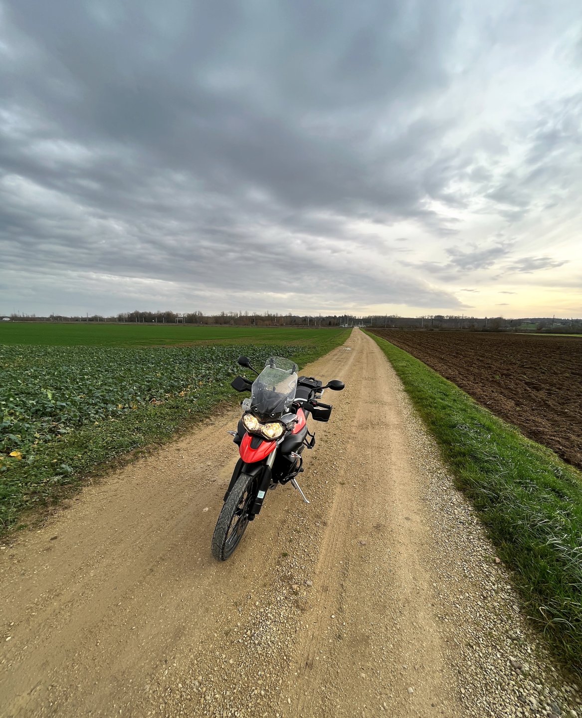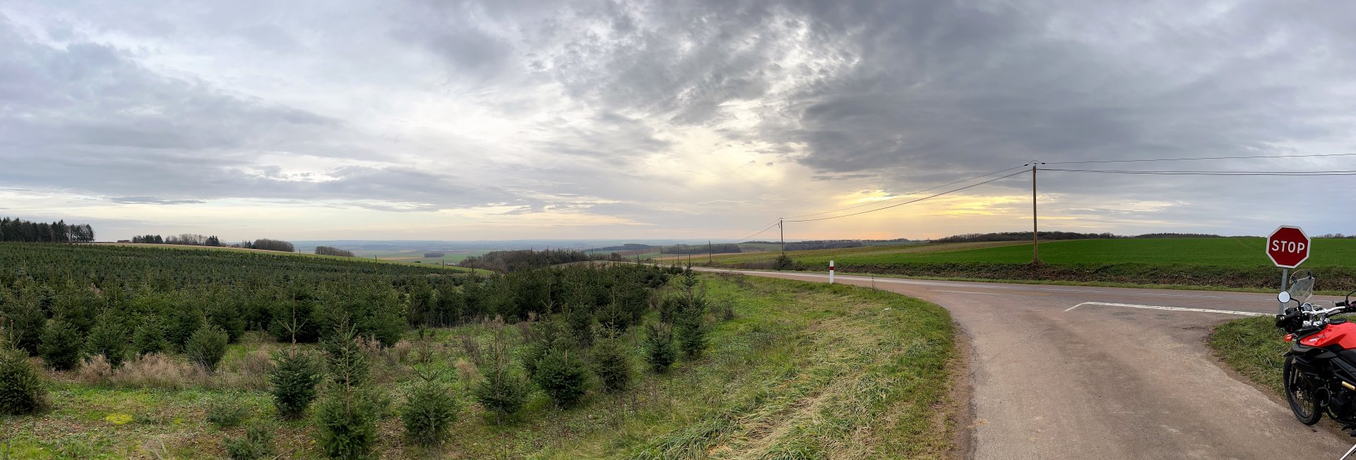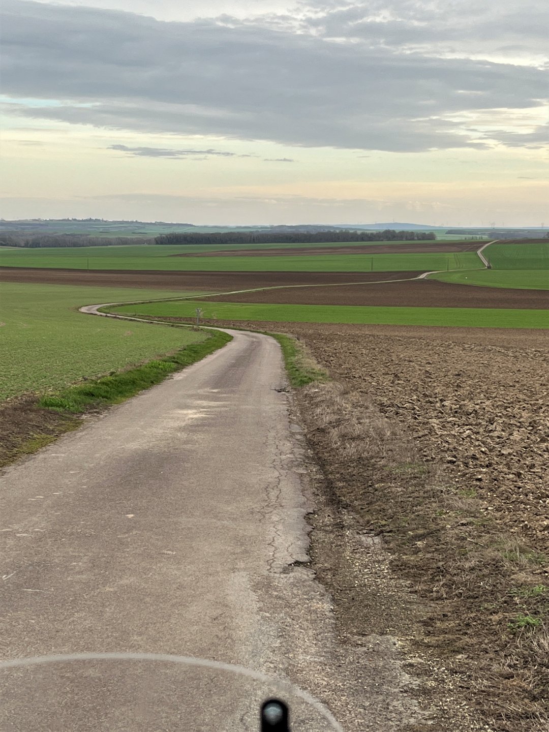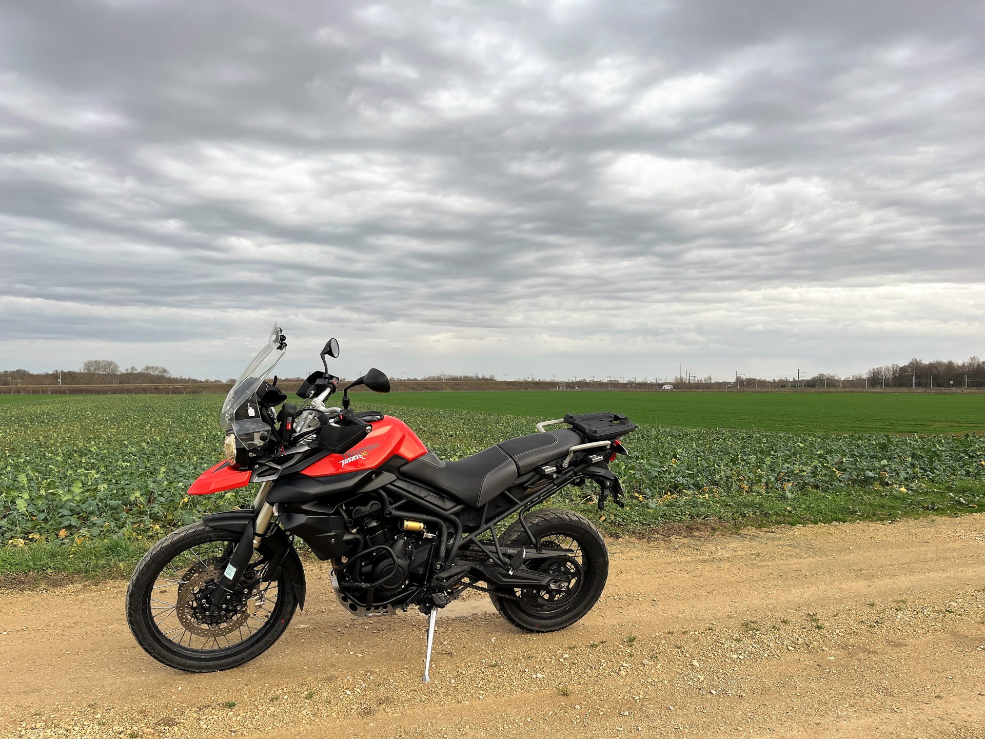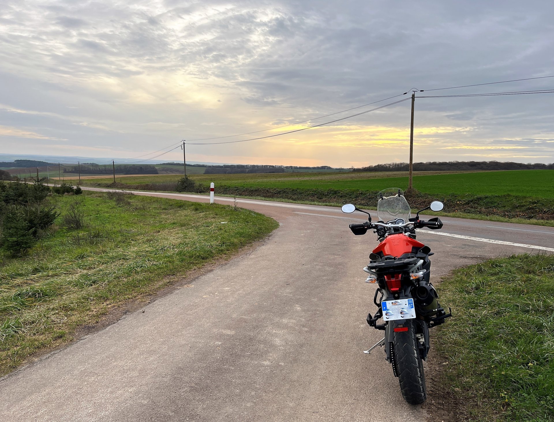 Got out for a couple of ours on the tiger this afternoon, overcast and dampish but pleasantly positive temperatures. I rode Northwards into the Forét D'Othe and had a troll round just following my nose. I only stopped a couple of times cos I'm using my phone for pics and it's a palaver with winter gloves etc. I found some nice, not too wet, gravel tracksnorth of Esnon and followed it round in a loop bringing me back alomost to it's starting point about 8 or 10 km later Having been northish for about 45 minutes, I turned east and rode towards what would have been a nice sunset had the clouds not been quite so thick Light was failing so I turned southwards and left a bit back towards Home along some nice open back roads Got home just as dusk started setting in.7 points