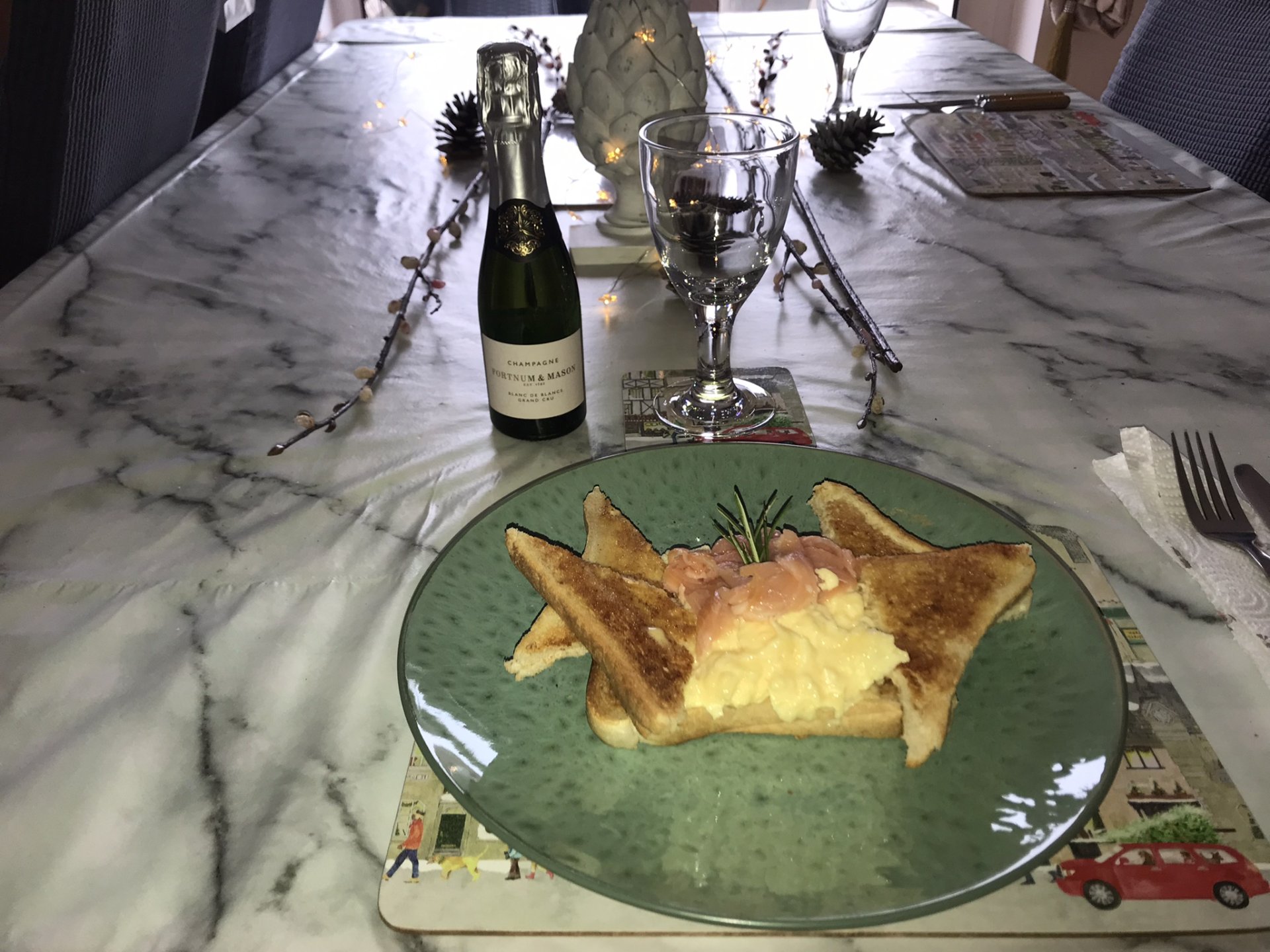 I didn't get any pics of our Christmas day feed but My Sister dis us proud. We we're expecting a cold buffet and we'd brought cheese ( French , smelly) and wine ( White, St Bris, sauvignon and Red, St Bris, Cesar) but she surprised us with a massive tradional Christmas dinner. Ham in place of turkey but otherwise the full monty, sprouts, stuffing balls, bread sauce, pigs in blankets etc etc etc. I hadn't had a "Proper" Christmas dinner in 20 years so Best Christmas Present Ever! This was our new years trough, just the 4 of us ( No1 being still in Liverpool) we'd visited Bicester Village luxury designer outlet hell-hole on the 28th cos the twins wanted Vivienne Westwood Jewlery, which they got. On arriving home on the 29th we learned of Westwood's death. the twins wanted to do a Vivienne Westwood themed table : Then came the food. The "entrée" ( which I skipped and just had another drink) forgetting to take a pic till after the battle... A dozen "Escargots de Bourgone aux beurre d'ail" ( Snails in garlic butter sauce). Followed by Honey braised beef in a cider sauce with Gratin Dauphinoise, All washed down with a nice bottle of Chablis. Yule log from the local patisserie to finish but I was too pissed and busy eating to take a pic2 points