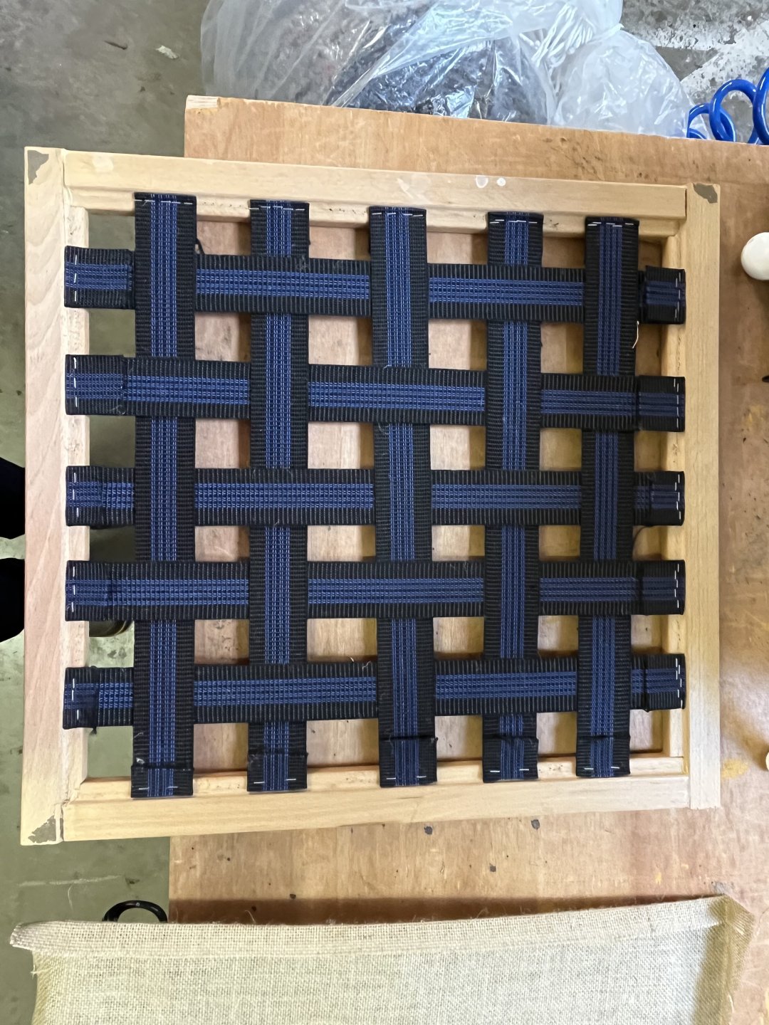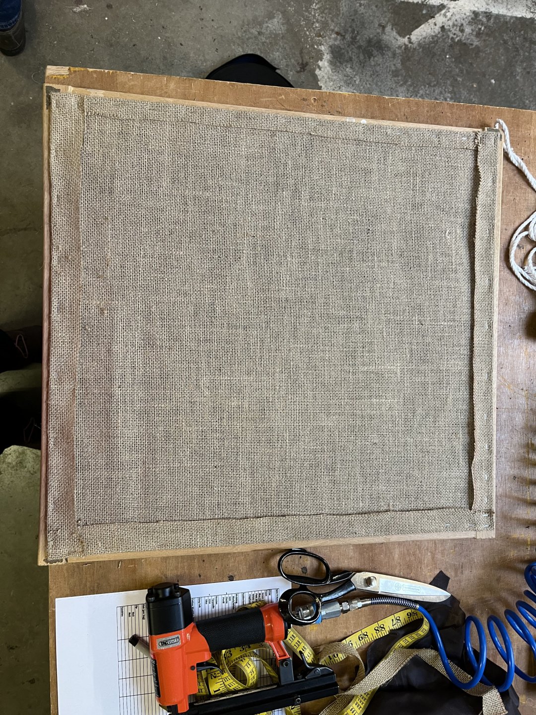 @Earache Quite happy with the first session considering I’ve never used any of the tools (apart from scissors) before, so the base is nearly ready. Started off with a layer of nylon with foam attached that crumbled to a choking dust when you touched it, rubber webbing that had degraded to the point of disintegration and some bizarre packing tape repair which only farmer genetics would consider ok oh and so many awful staples. New webbing, a layer of hessian and some recycled felt, just one more layer before tackling the big stuff.3 points