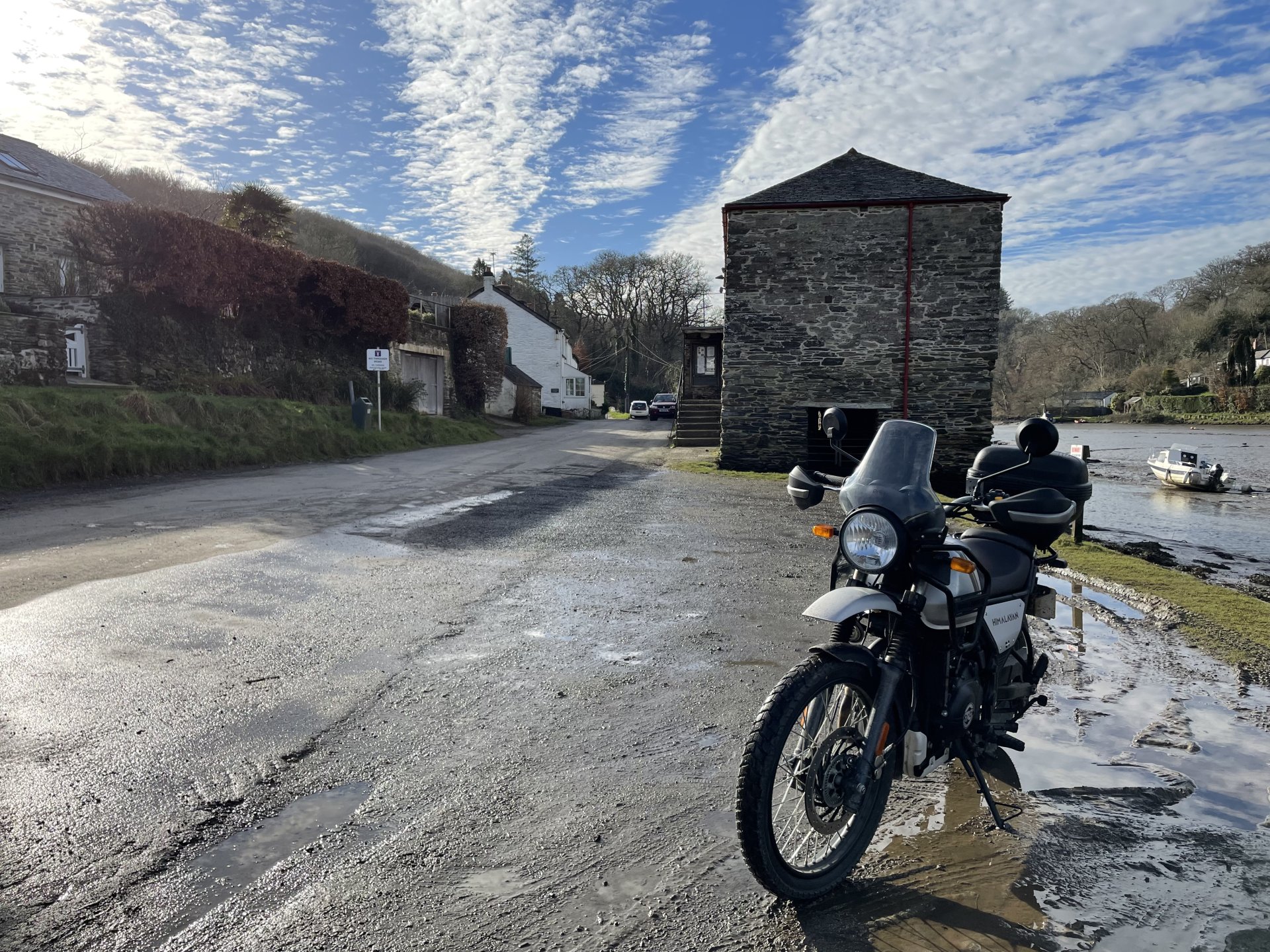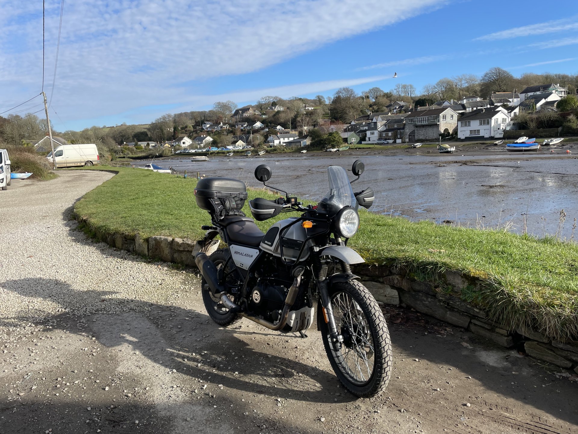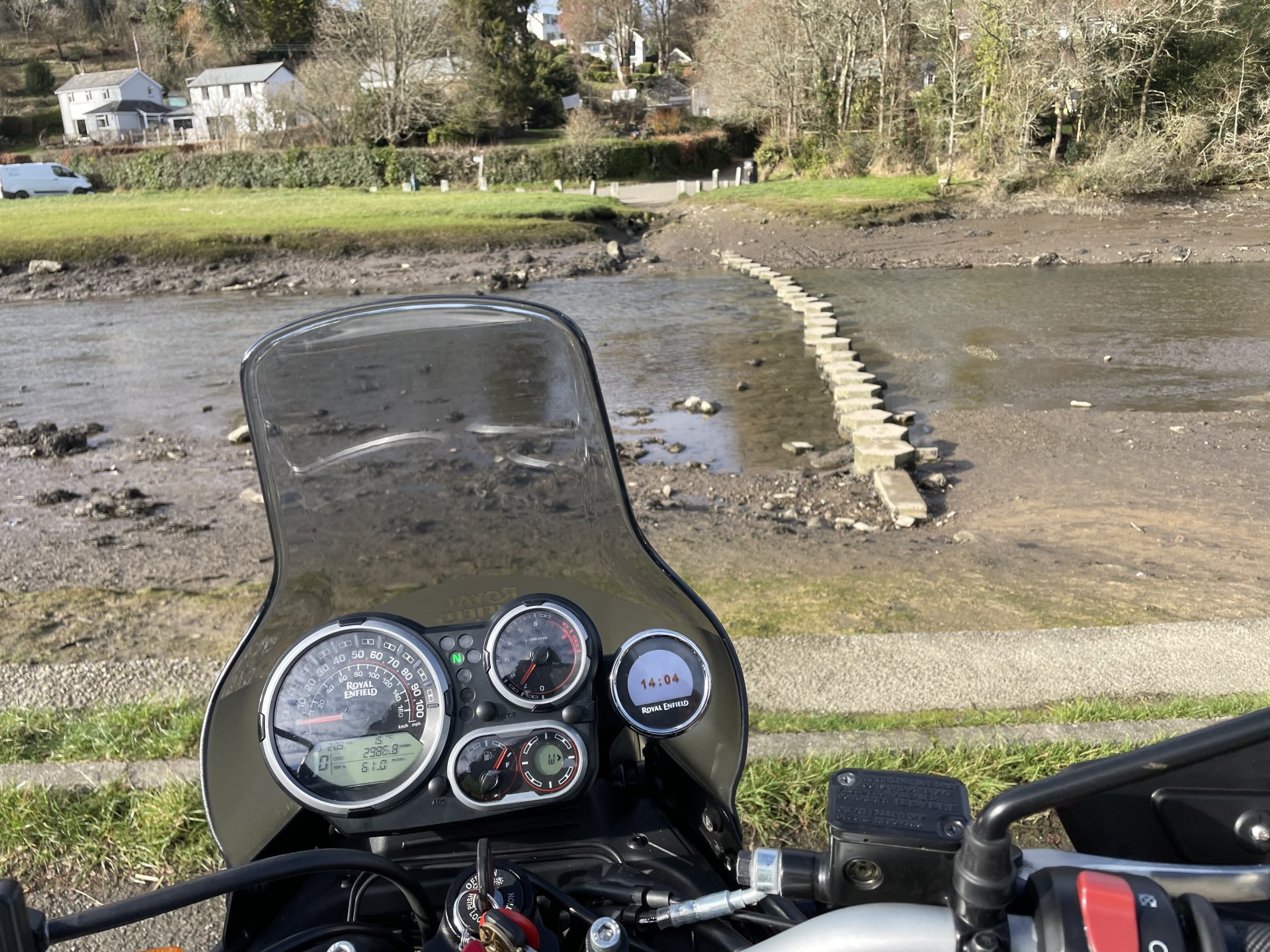 Seeing my Himalayan’s days with me are numbered I was keen to get out for maybe a last bimble about. I went to a village called Lerryn about two miles as the crow flys from my house. Problem is that it is the on the other side of the river so it is about 15 miles to ride around. Well not so much of a problem as the sort of roads for the majority of the way are very well suited to the Himalayan. Mostly back lanes and B roads way below the sort of speeds that it feels breathless. Lerryn itself is an old and very beautiful place that is dominated by the tidal river. I love it there but as is the case with many scenic Cornish village’s anybody from them is eventually priced out. There is a small estate, formally social housing, just up the hill but apart from that the property values are eye watering. Anyway the tide was out today so probably not at its prettiest but still lovely. There is a shot of the stepping stones across the river, not to be attempted after a drink, I am sure you can guess how I know about that fact. Further up river from Lerryn is the tiny hamlet of St Winnow. One house one farm, a boatyard and a medieval 14th century church. The church itself is the wedding venue of choice for those who can afford it, as it is only practically accessible from the river. Absolutely idyllic place for such festivities. St Winnow church is also the ancestral church for the Vivian family. Baronial Blue bloods, MP's and such, in fact the old Lord Baths mother was a Vivian. When I got home I cracked 3000 miles on the Himalayan.1 point