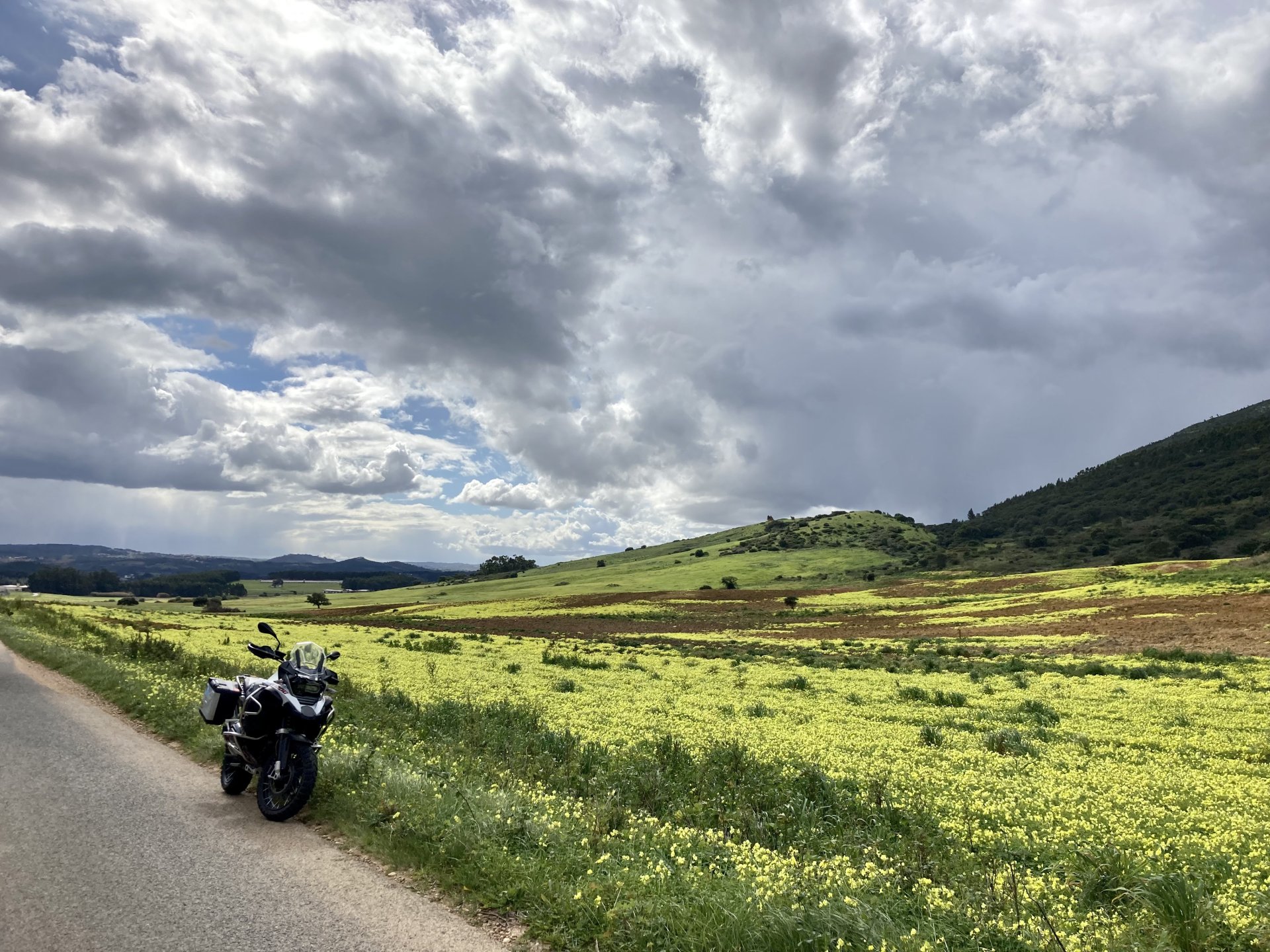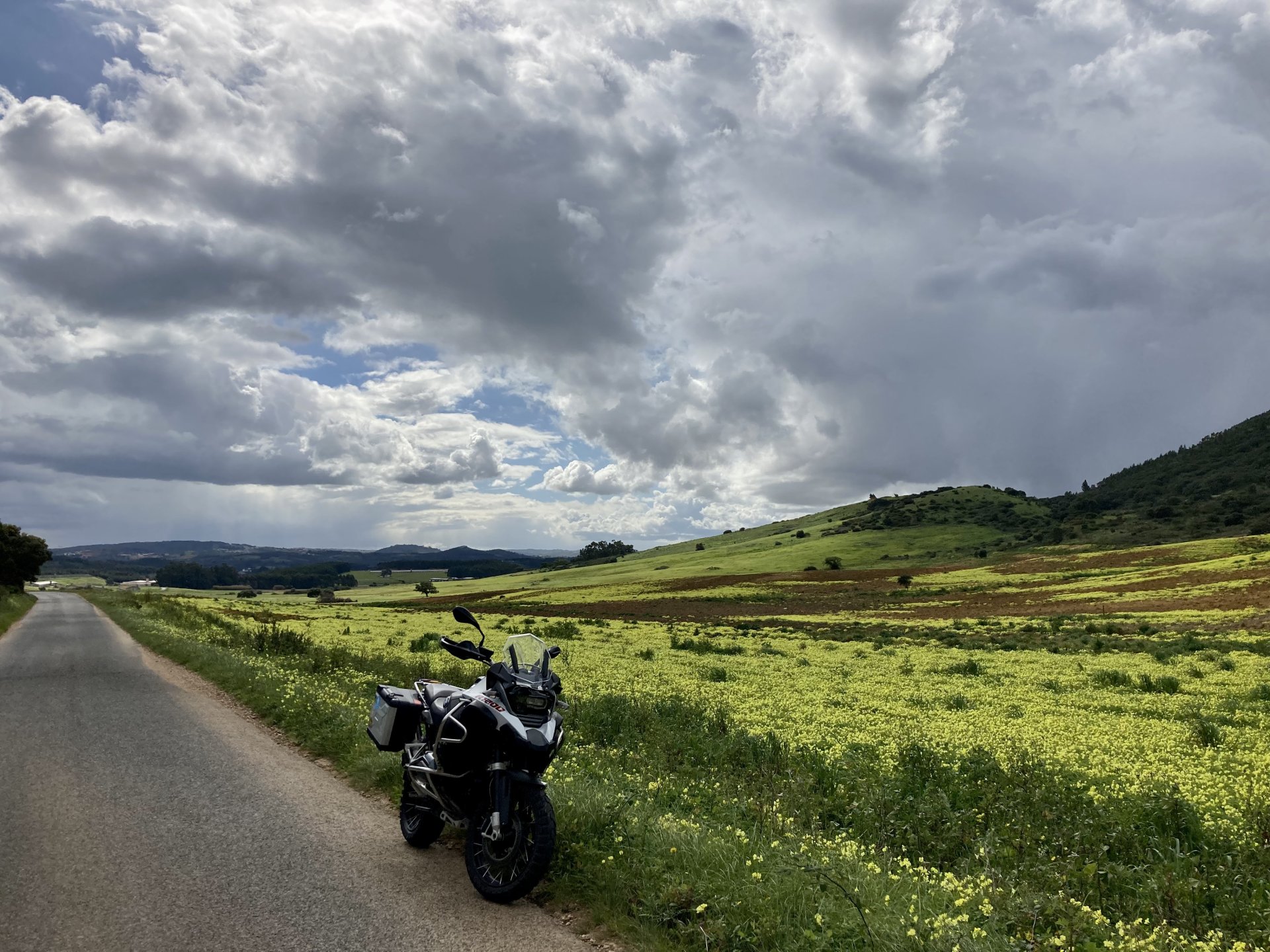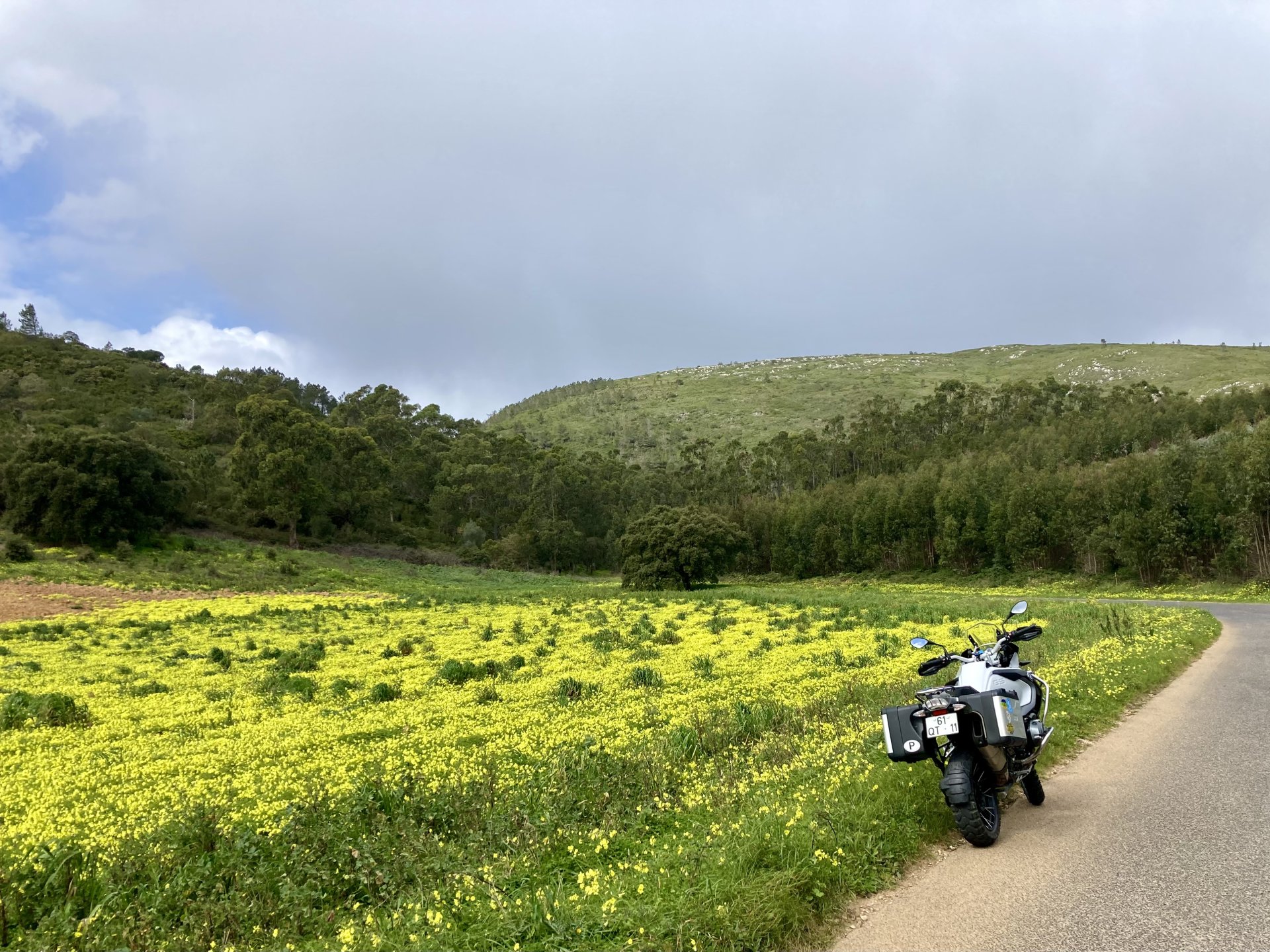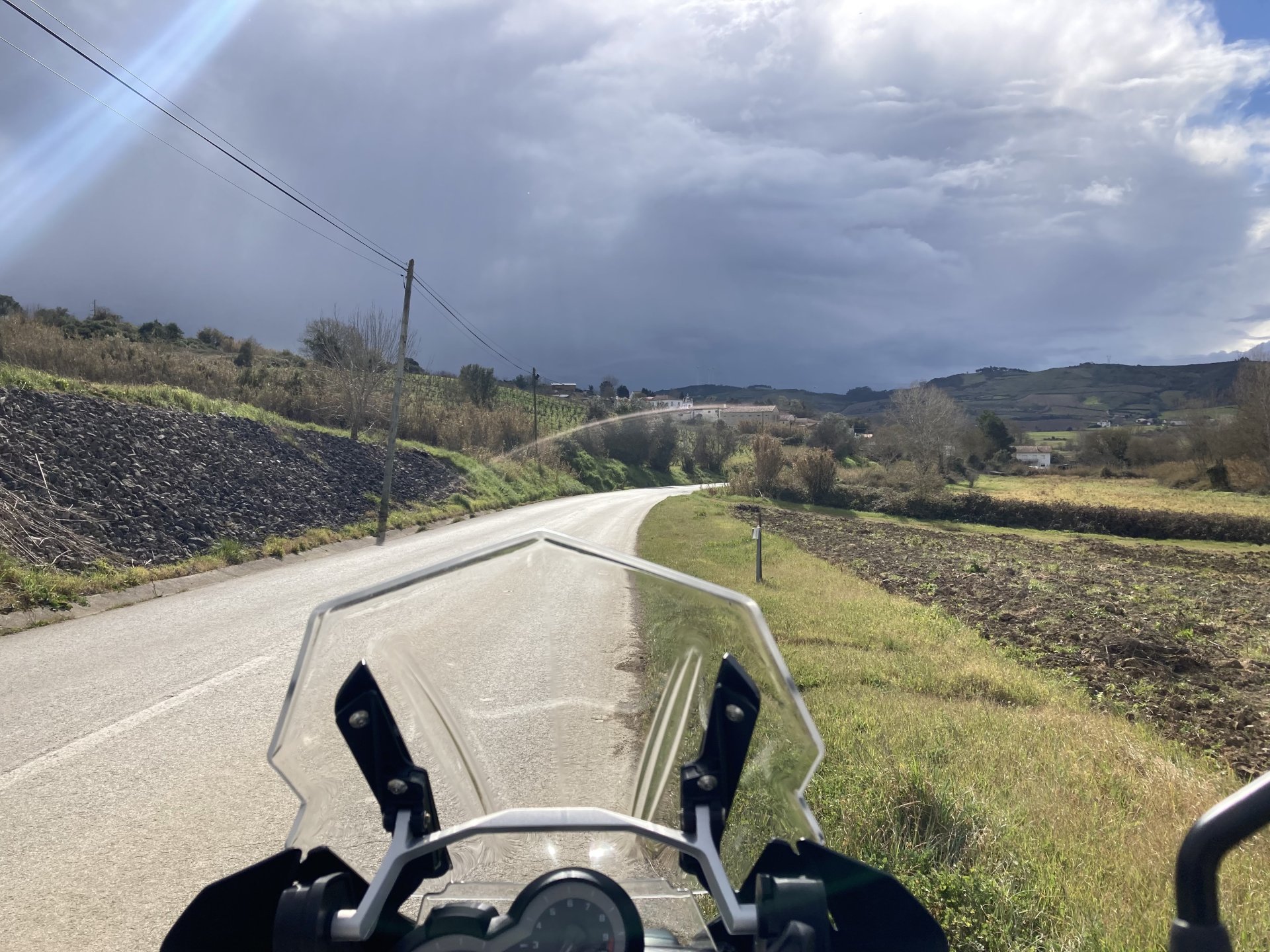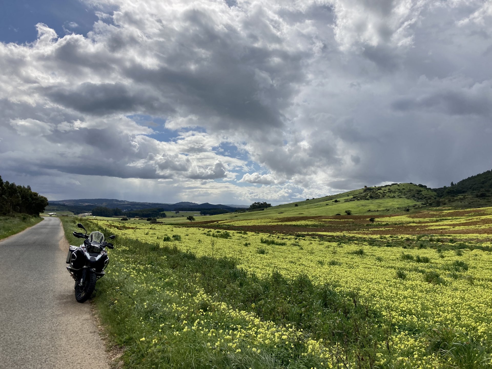Not a ride report, just going to @Sofia's from my place. It could be a 40 minute ride by taking the motorway, but I prefer to turn it into a 2 hour thing via small roads, money saved on the toll pays for lunch plus I just like these roads. Woke up feeling fresh after a very cold night in the countryside, clear blue skies but with rain for later in the day. Enjoyed a coffee outside listening to the morning After some work, I tidied the place and closed it ready for a few days with no person living there. Then packed my luggage onto the bike and off I went now at around well after mid day. I'm sure @XTreme would be in a panic anticipating starting a non Honda motorcycle, so this is just for him. I like the sound of the first start, more so when it's colder. Half an hour later, I stop to take pictures of a field of flower, this is also something @Slowlycatchymonkey would really find troublesome, her adventures are so packed with action she can´t afford one minute stopped somewhere. As I climbed the hill the temperature that had varied from 10 to 13ºC went to 5º at the top, with a little rain as we went up. Stopped at the cafe for lunch, looking forward to something warm to eat. Outside there were two 4WDs from the forest firefighters. Today they probably wouldn't fight anything but it's good to see they're around at least to clean hazards before the fire season. Let's hope Portugal can change the disgraceful course we have been having regarding forest fires. My lunch consisted of a burger complete with the exuberance of two slices of tomato inside. It was warm and nice and really hit the spot. First time I've sat inside this place in years, but today the outside wasn't a nice place to eat. A nice espresso to finish off and get back on the bike. When I first started coming here you would eat a burger, drink something and have coffee, and you'd have change from a 5 Euro note, now it's 7€, and it manages to surprise me every time. Same thing in a coastal town and that won't pay for the sandwich itself. Even though I sent a few emails and thought I had things under control during lunch, a few minutes after being on the bike the phone rings and I decide to give a client my attention and check a few things properly instead of having this issue in the back of my mind. Stopped at the side of the road: 20 minutes later and it looks like I'm riding into a storm, so stop and put the phone away. After that I zig zag avoiding the dark clouds that eventually catch me just 15 minutes before arriving at Ericeira, a proper rainfall for the last few kms, shame as I had washed the bike yesterday. There you go, turning a mundane trip into a ride report!6 points