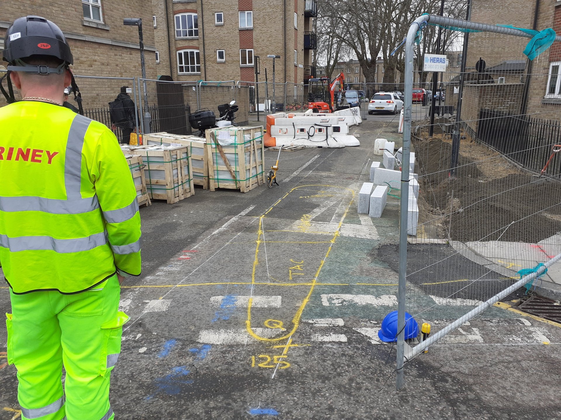 Busy day today, left home at 7am, got to site at 8am, did a bit of setting out and then left my bike inside the fencing the blokes had set up around themselves. It was across the road from our new office that has no parking, so handy if they kept an eye on it. Went into the office for an hour, swapped my bike trousers for jeans (I was melting from the setting out in full bike gear) and then came back out and jumped on to the train at Whitechapel station to go to a site meeting in Shoreditch. As I got on the train I heard the station announcer say "Can Inspector Sands please contact the control room". Now that rang a bell, some sort of code. I googled it when I came back up to the surface at Shoreditch, it means a fire alarm has gone off but they don't want to evacuate the station. Met 'Julian from Guildford' in Strype Street and talked about his S278 works, popped into the Petticoat Lane camping shop and bought some maps, then walked back to the station via Spitalfields Market and went back to Whitechapel Station on the train. No sign of a fire there luckily, came out to find the small fenced site with my bike inside has suffered a gas leak, caused by the blokes with their mini digger digging out a couple of gulley pots I asked them to renew. I risked leaving my bike there again whilst they waited for the gas board (Cadence) to come out and repair the pipe and went back to the office where I knocked out some sign drawings, did some estimates and listened out for a gas explosion across the road. I went back at 3pm, unlocked my bike and asked the gas men to let me out, their van was blocking me in. Left them slapping a big elastoplast onto the pipe and fought my way home through east London's expert drivers/wankers. Home by 4:30pm. Picture of my bike now blocked in by pallets of kerbs and some of my artwork, Banksy, I shit him!4 points