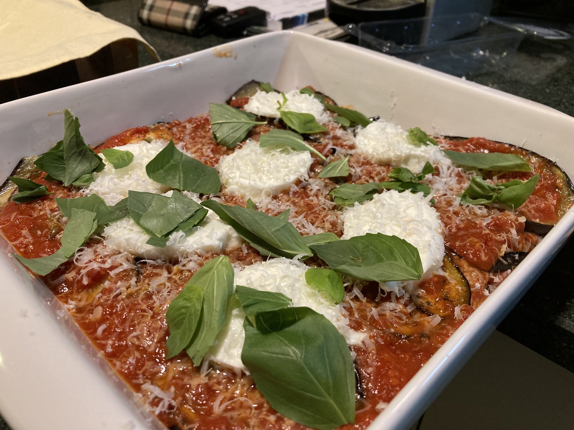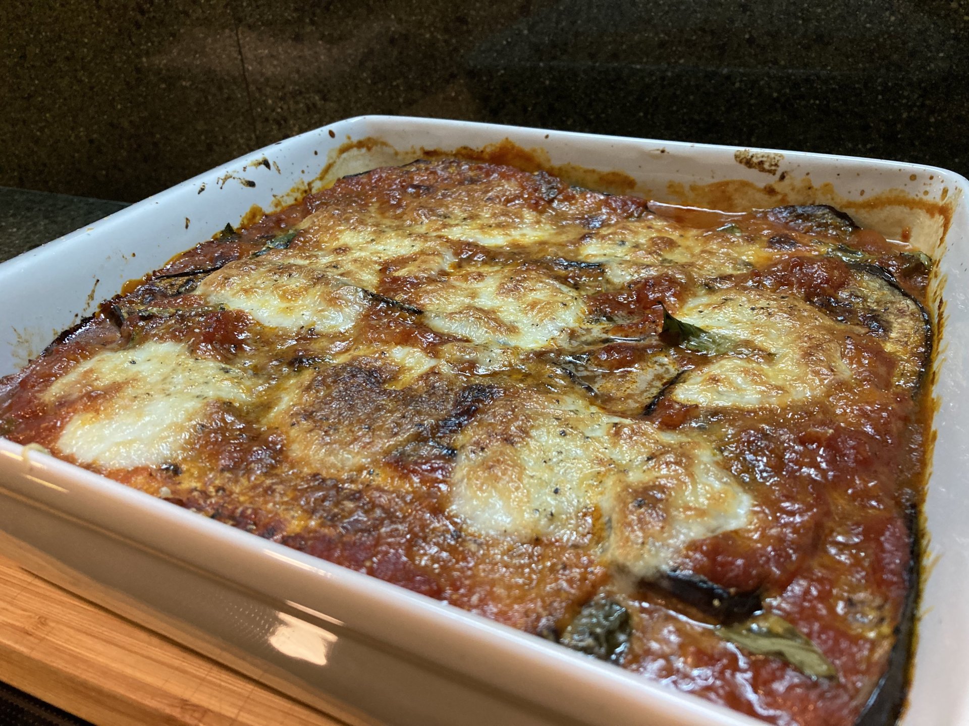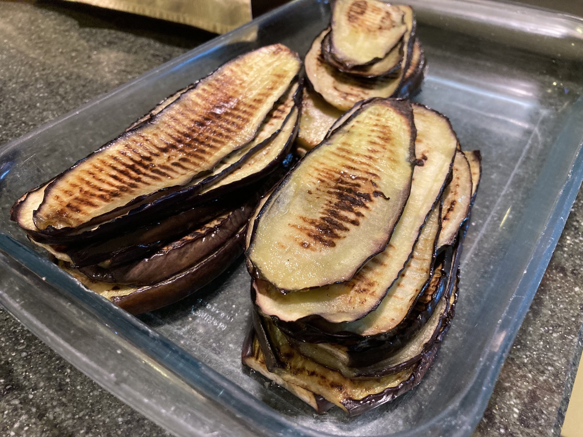 Again, melanzane alla parmigiana. You grill aubergine, nothing except heat and a tiny bit of olive oil to moisten them. Then assemble the whole thing in layers similar to a moussaka or a lasagna except no pasta or meat. Tomato sauce (cooked, not from a jar!) / aubergine / tomato sauce + basil + mozzarella + parmesan, and repeat with variations of no mozzarella or no parmesan in a layer, mid layer: Top layer has to have parmesan, for the crust. This might be more delicious than lasagna, and goes better with toasted bits of bread since there's no pasta in it.1 point