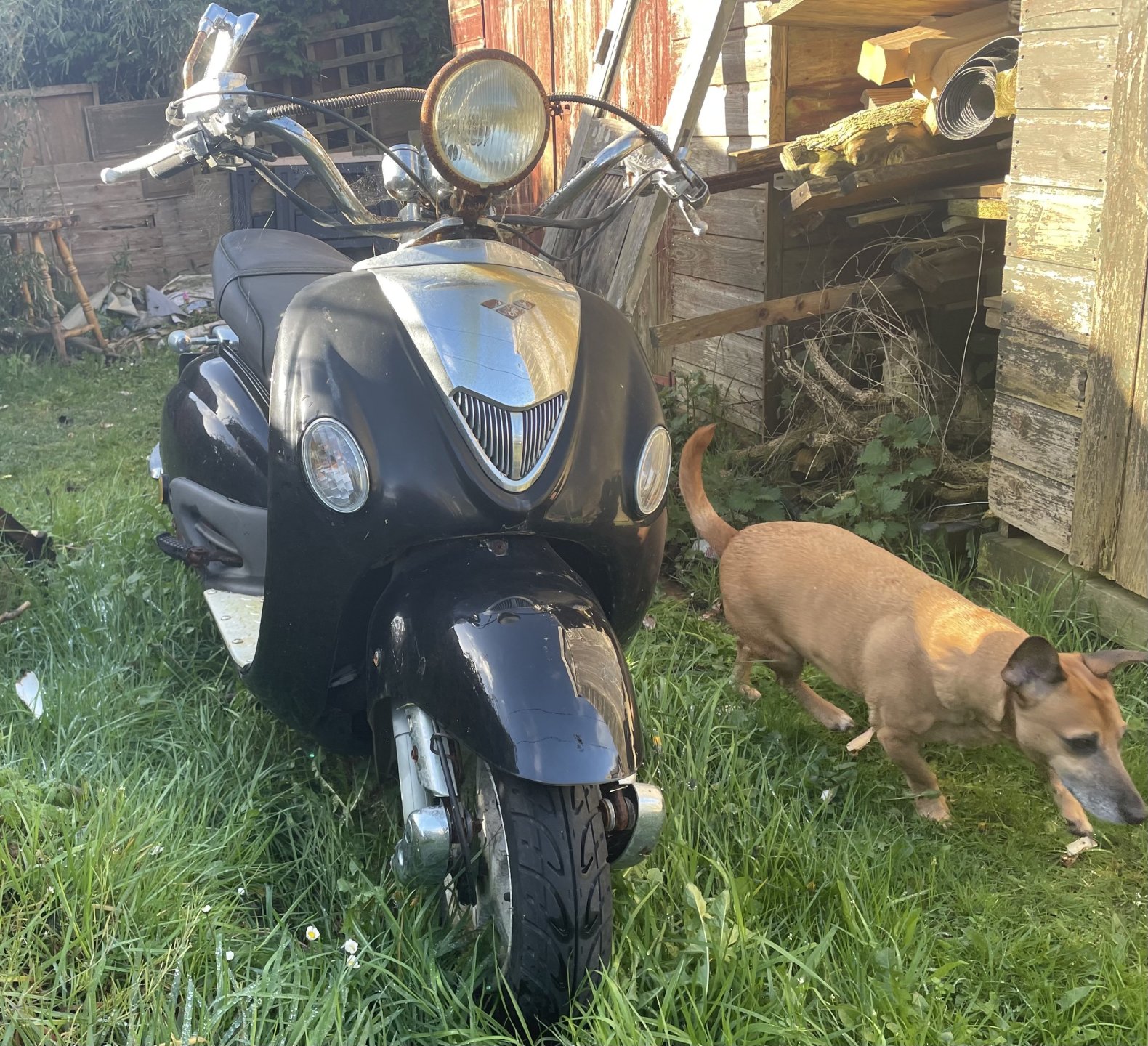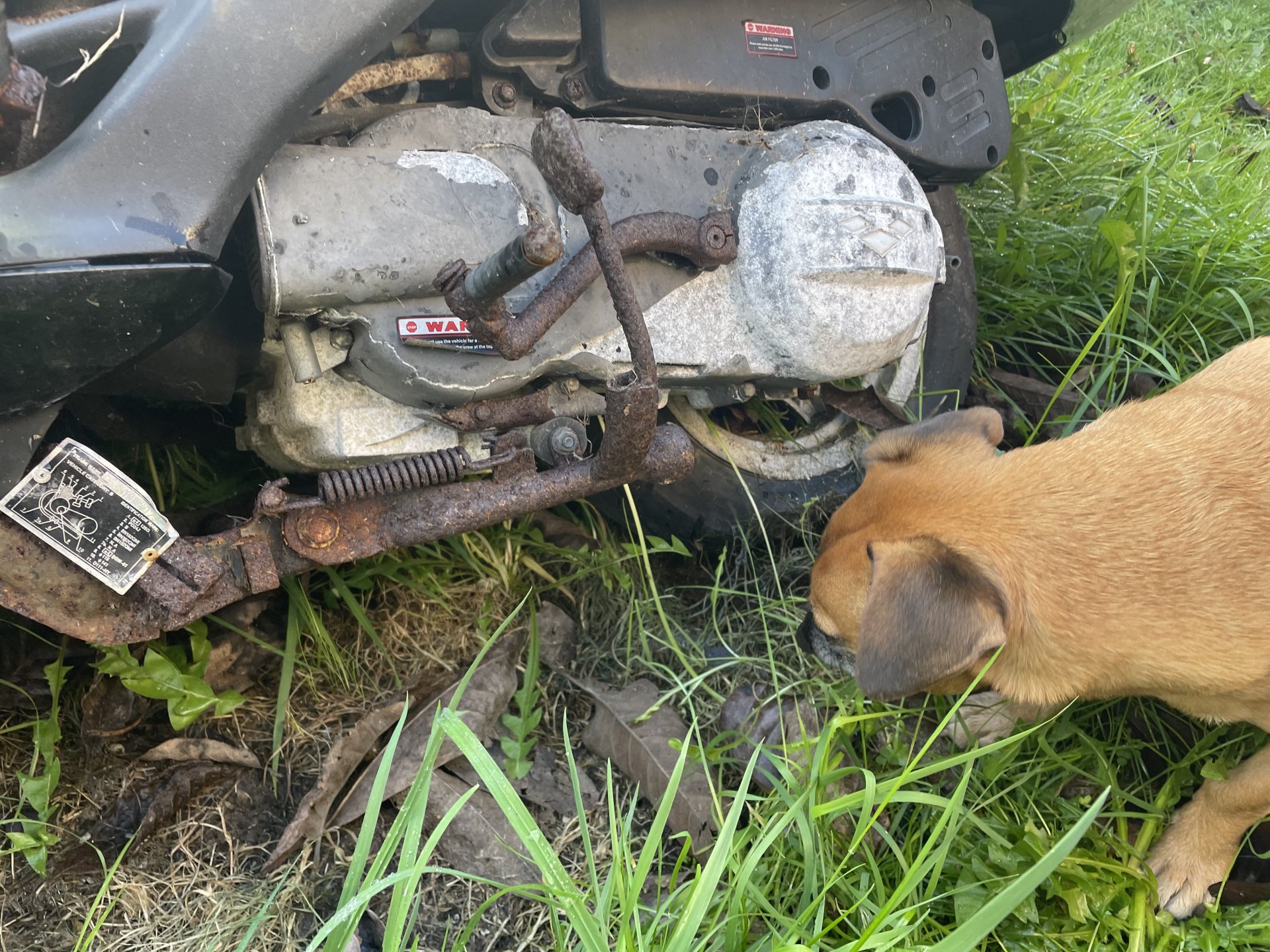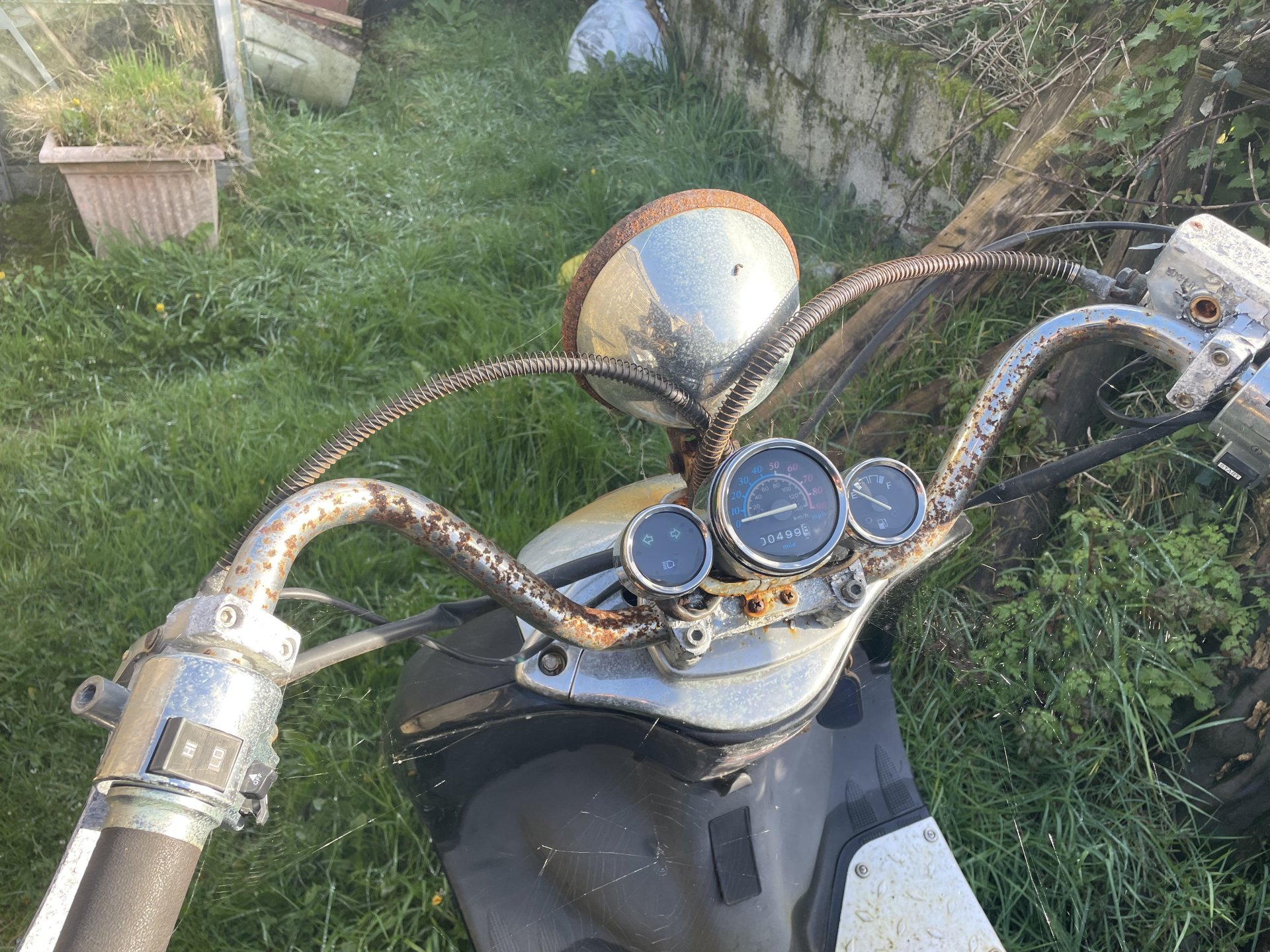 Talking about potential rust on some less than premium brand bikes I thought I would show you a project I abandoned very early on. A mate of mine gave me a Lexmoto Valencia twist and go scoot for my boy. We though it would get him on the road for a few hundred. The scoot belonged to his aunty who passed away and he just wanted it gone. So I went and got it and pushed it back home, he lives across the park from me. Like he said it was a bit rough but had only done 498 miles in his Aunts hands from new. I had a look over it when I got it back and was shocked by how much it had rusted. It did live outside under a cover but had seen no wet riding or road salt. First things first I wanted to hear it run before spending anything. There was a vacuum type pet cock that was locked shut and the carb was also locked up. I them connected a battery and got it running on brake cleaner. It sounded as sweet as a nut and wanted to run. All the electrical stuff worked. Anyway I thought get some air in the tyres, the tyre valve crumbled in my hand, I tried to get the wheel off and the axel was rusted solid. At this point it was obviously going to be a lost cause. Battery, Tyres, fuel system, brakes and god knows what else, just to get a functional rusty heap. So now it is garden art, I have been meaning to ask my mate if he wants it back but I reckon it will be going to the scrappy. The point I am getting to is these things need to be carefully looked after or they will dissolve before your eyes. Oh and the Dear Boy was on rat patrol.4 points