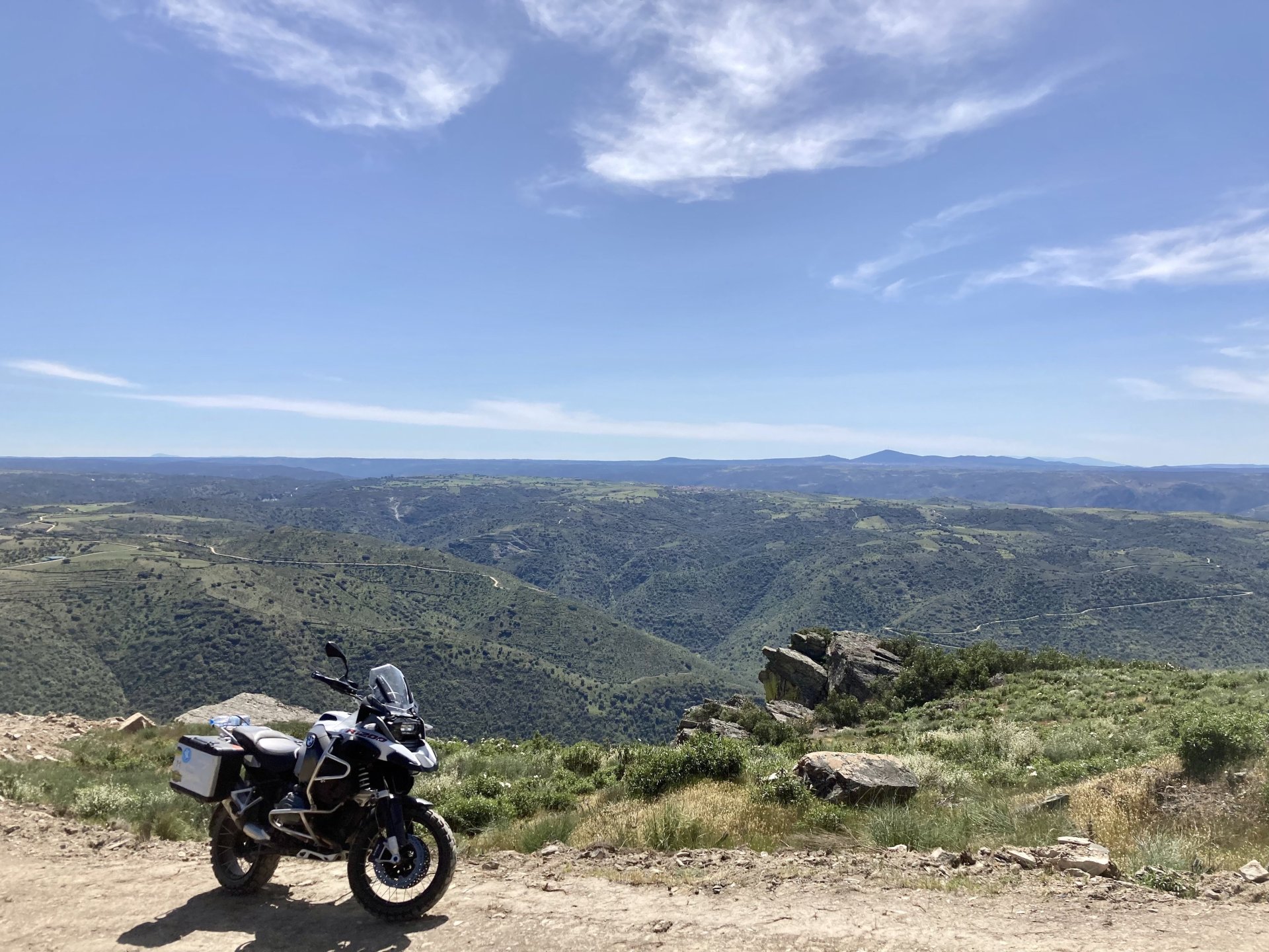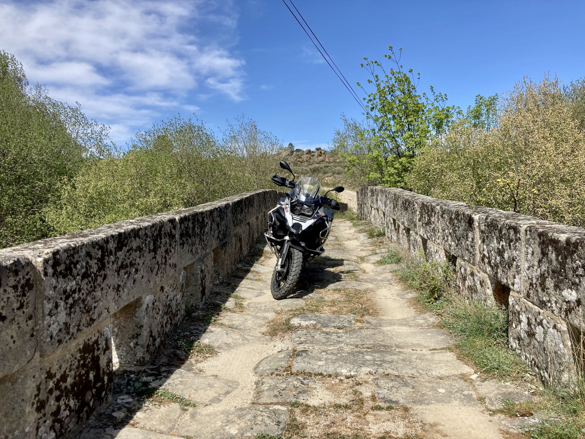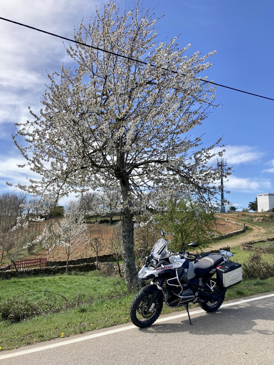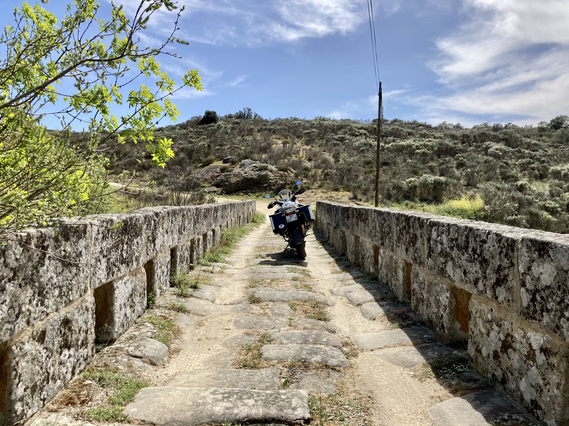 I woke up a little hungover, but quickly made progress, not wanting to waste the morning and with a big motorcycle day ahead. Finished my emails, had a nice shower, and enjoyed breakfast, the work then called me back and turns out it was about 09:30 by the time I was leaving. It was a coldish morning, temperatures were maybe around 7 or 8ºC until about 10AM, maybe later, but it felt way colder than that. Felt like even when stopped the wind was freezing cold. The roads were perfect, and I followed the border Lots of trees in bloom, the camera on my phone doesn't do them justice. I didn't even stop in Miranda do Douro, although it is a charming town ideal for a stroll around and a coffee it had quite a few cars and I didn't feel like putting up with a crowd. Even saw a few british plated bikes, clearly making the best of the beautiful day. I rode south, back south and heading all the way to Ericeira to meet up with Sofia, which is very far away and feels world's apart. Stopped in one of the coolest Douro viewpoints for a few minutes, before lunch: I thought my head was hurting from the previous day's excess drinking, but it was getting worse regardless of water drinking, and then I started getting this painful feeling in my sinus, it finally hit me that it was all the trees in bloom causing my hay fever to go wild. Quick stop by the pharmacy in Freixo de Espada à Cinta, got a few pills for that specifically as my nasal spray wasn't cutting it, and after a lunch sandwich I took a couple. Rode up to spend a while enjoying the views at Penedo Durão, so got there, took a few pictures and sat down for a while. The clean air and pills made their magic and I was already feeling a lot better. The vultures and griffons are amazing to watch, in person you can really see how big they are. Time to go, and head down to the river, but first via possibly the dirt road with the best view in Portugal that I know off: Last time I was here this road was more like a wide trail, seems like someone brough a proper machine and widened and flattened it. I hope they don't tarmac it, it would be a shame. It leads to this: Further south and after a few kms of a really nice twisty part of the N221, I take my final stop before pointing the GS south and jump on a motorway. Got to love my country where you're on a nice small tarmac road, follow a detour along a dirt road indicating "national monument" and end up riding down this. As always, it feels flat on a picture: The national monument was an old stone bridge with the ruins of a water mill next to it. It's an idilic location It was now 15:15, and the GS made it to Ericeira, a 4,5 hour trip according to google maps, by 19:00, including a small detour to buy the dogs a toy. Google maps indicates 470km between Freixo de Espada à Cinta (where I fueled up), and Ericeira, I took a little detour to go see the views, the dirt road, etc, and still made it to Ericeira without the fuel reserve light lighting, I love this bike.6 points
