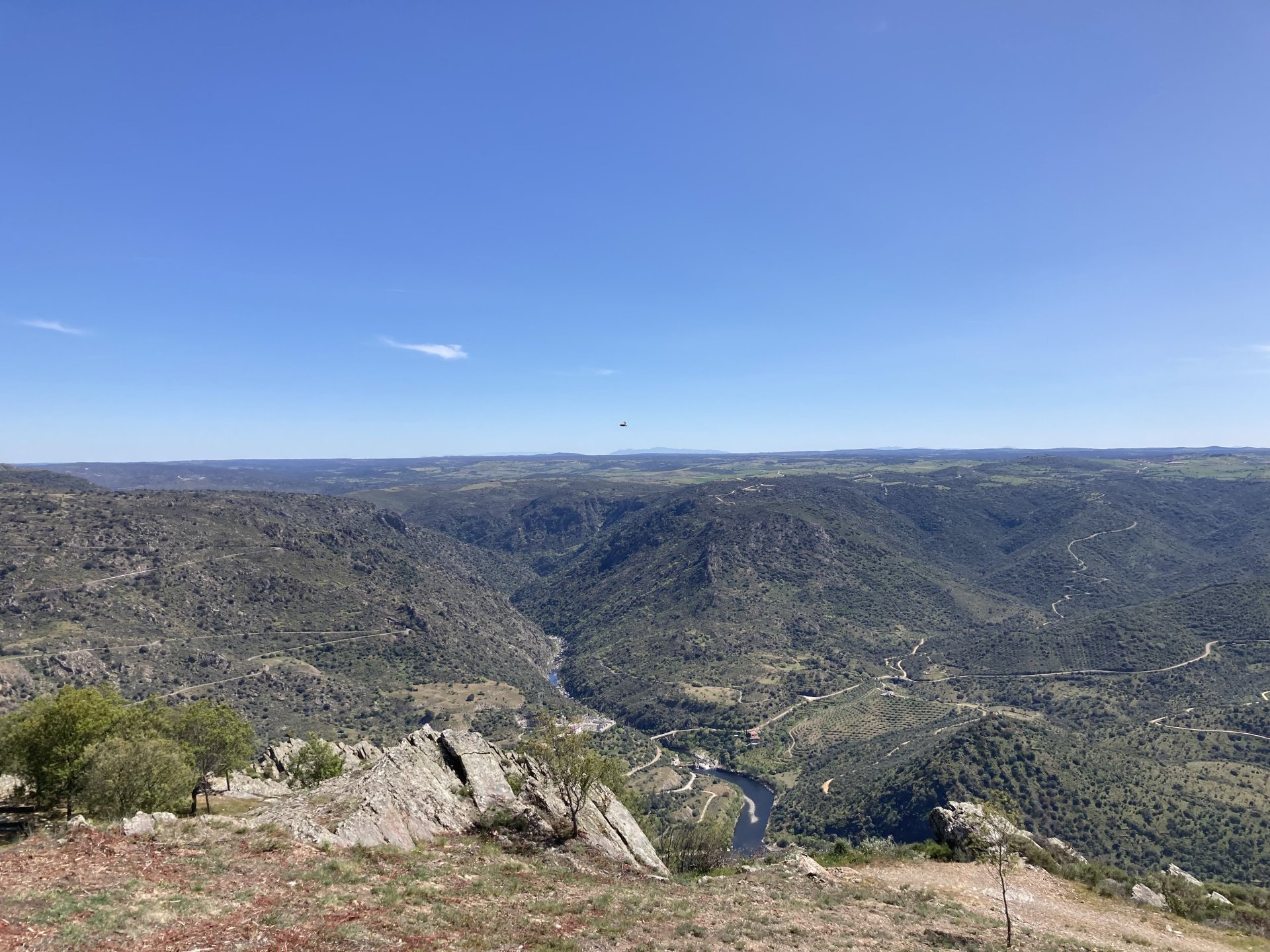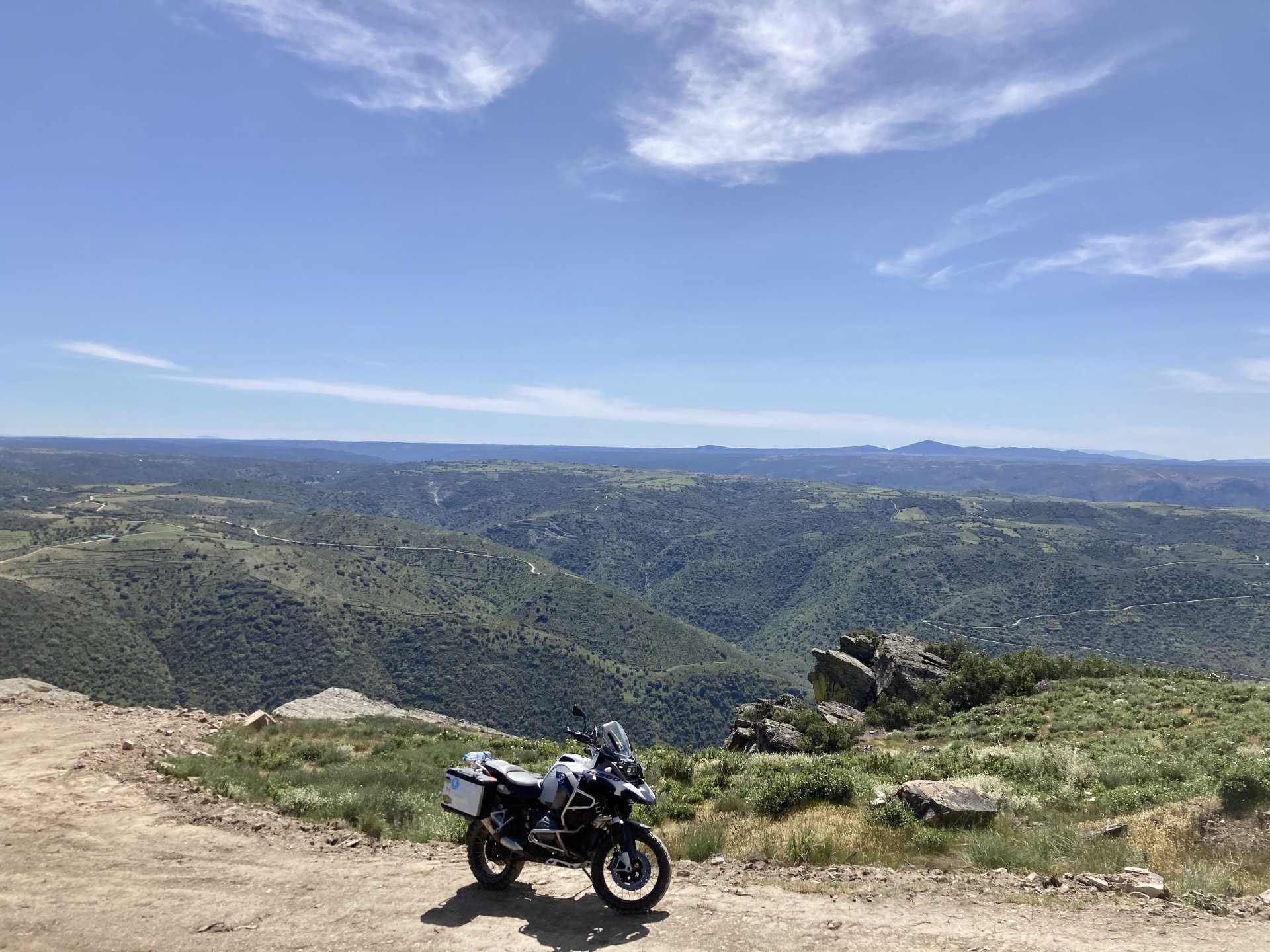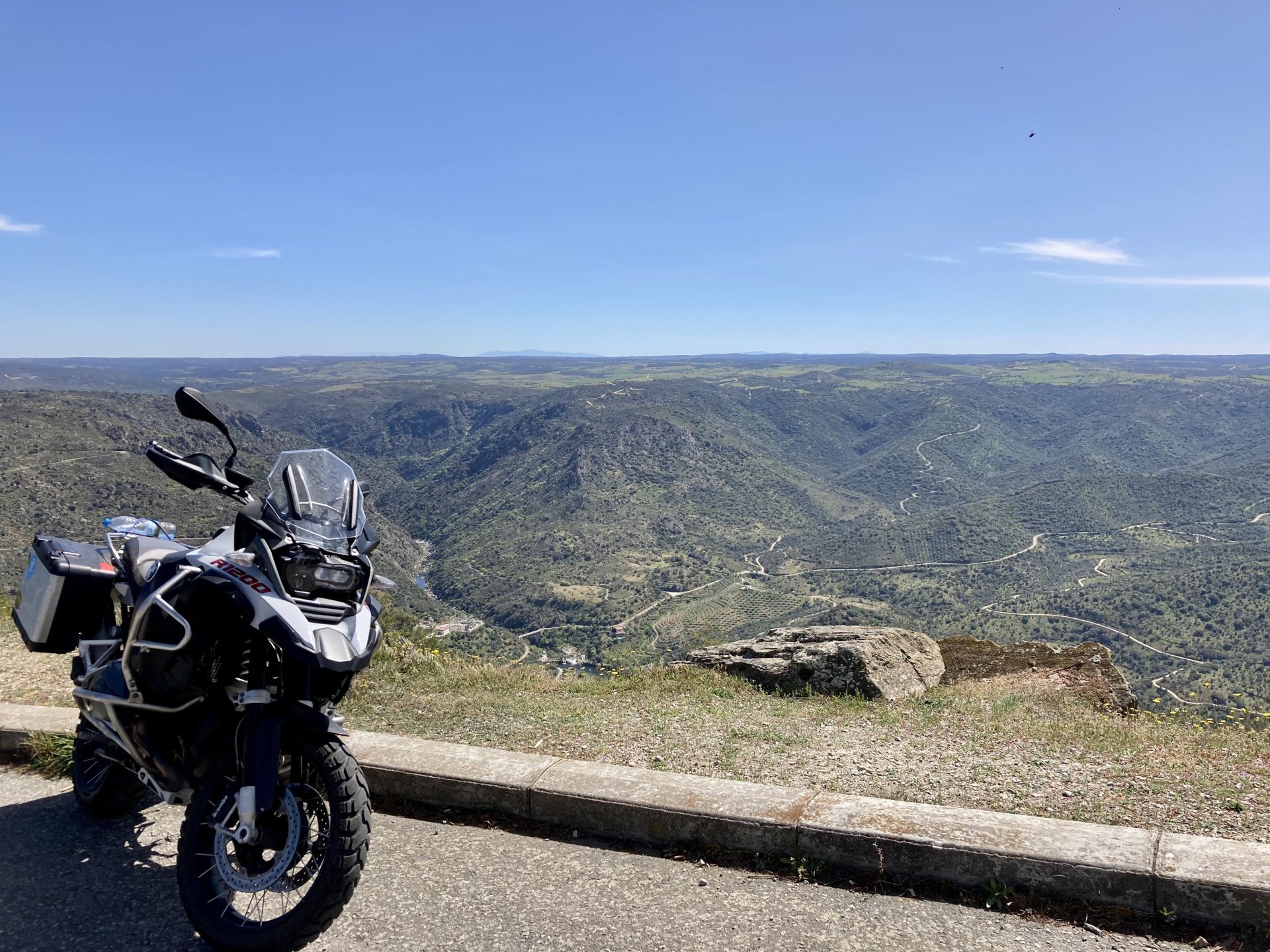 I woke up a little hungover, but quickly made progress, not wanting to waste the morning and with a big motorcycle day ahead. Finished my emails, had a nice shower, and enjoyed breakfast, the work then called me back and turns out it was about 09:30 by the time I was leaving. It was a coldish morning, temperatures were maybe around 7 or 8ºC until about 10AM, maybe later, but it felt way colder than that. Felt like even when stopped the wind was freezing cold. The roads were perfect, and I followed the border Lots of trees in bloom, the camera on my phone doesn't do them justice. I didn't even stop in Miranda do Douro, although it is a charming town ideal for a stroll around and a coffee it had quite a few cars and I didn't feel like putting up with a crowd. Even saw a few british plated bikes, clearly making the best of the beautiful day. I rode south, back south and heading all the way to Ericeira to meet up with Sofia, which is very far away and feels world's apart. Stopped in one of the coolest Douro viewpoints for a few minutes, before lunch: I thought my head was hurting from the previous day's excess drinking, but it was getting worse regardless of water drinking, and then I started getting this painful feeling in my sinus, it finally hit me that it was all the trees in bloom causing my hay fever to go wild. Quick stop by the pharmacy in Freixo de Espada à Cinta, got a few pills for that specifically as my nasal spray wasn't cutting it, and after a lunch sandwich I took a couple. Rode up to spend a while enjoying the views at Penedo Durão, so got there, took a few pictures and sat down for a while. The clean air and pills made their magic and I was already feeling a lot better. The vultures and griffons are amazing to watch, in person you can really see how big they are. Time to go, and head down to the river, but first via possibly the dirt road with the best view in Portugal that I know off: Last time I was here this road was more like a wide trail, seems like someone brough a proper machine and widened and flattened it. I hope they don't tarmac it, it would be a shame. It leads to this: Further south and after a few kms of a really nice twisty part of the N221, I take my final stop before pointing the GS south and jump on a motorway. Got to love my country where you're on a nice small tarmac road, follow a detour along a dirt road indicating "national monument" and end up riding down this. As always, it feels flat on a picture: The national monument was an old stone bridge with the ruins of a water mill next to it. It's an idilic location It was now 15:15, and the GS made it to Ericeira, a 4,5 hour trip according to google maps, by 19:00, including a small detour to buy the dogs a toy. Google maps indicates 470km between Freixo de Espada à Cinta (where I fueled up), and Ericeira, I took a little detour to go see the views, the dirt road, etc, and still made it to Ericeira without the fuel reserve light lighting, I love this bike.6 points