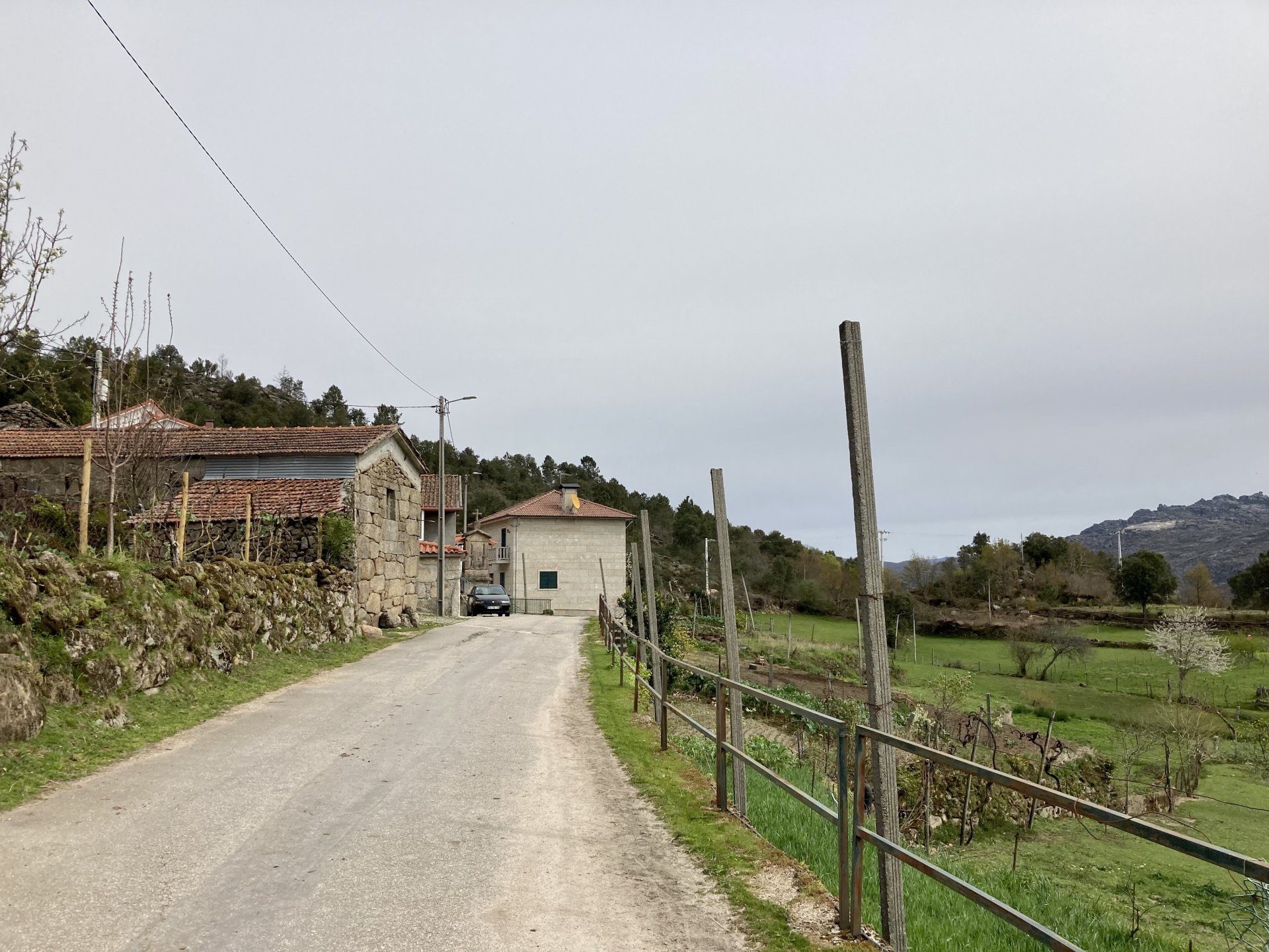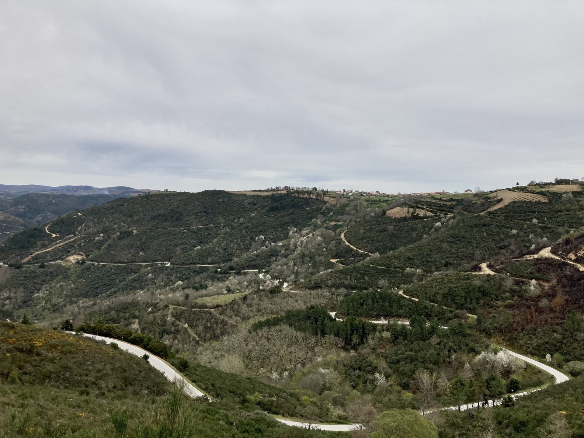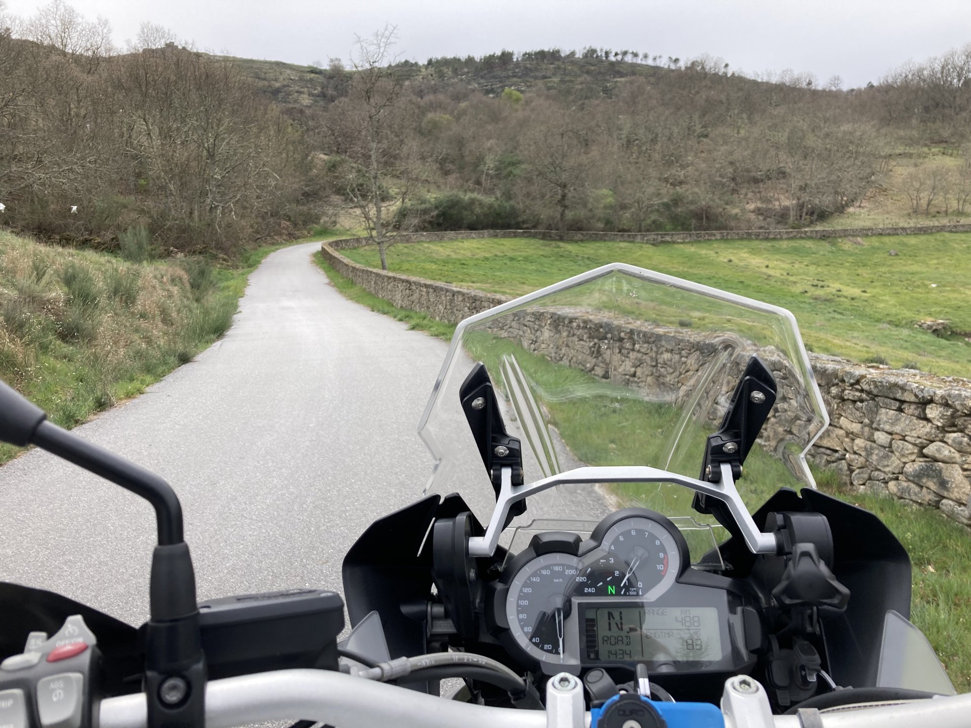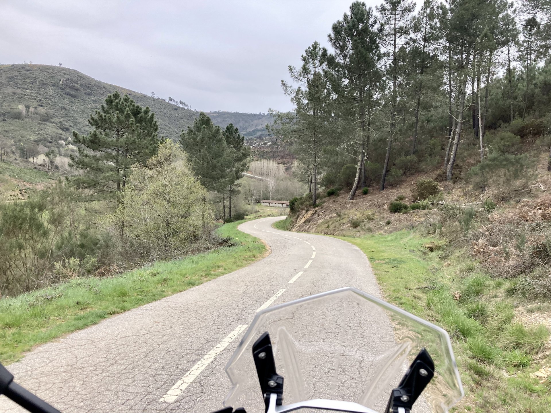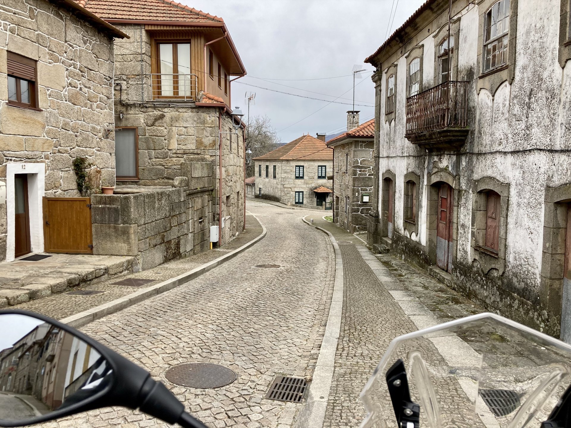 If you look at a map of Portugal and look at the north border with Spain, and follow the half of it most inland, that's where this ride will take place. I had a short meeting in a bank in Vila Nova de Gaia, and only ended up leaving well after 9:30, got on the motorway north to Braga and from there got on the small roads, took the N103 firstly heading northeast to go past the edge of the Gerês natural park with it's charming old villages, it's landscape so bucolic it feels like it's manicured by god. It's very pretty place but not one for today. This was still on monday but the start of the holly week, and Spaniards must not have saints in Spain as they all flock to Portugal, Braga being a very important catholic town is invaded by tourists so I wanted none of that. Stopped at a big shop to buy a charging cable for my phone right after Braga, and had some breakfast before setting off properly inland. A few kms after, and although the N103 is very nicely surfaced, constantly presenting series of bends that allow you to enjoy any motorcycle from the most modest to a proper fast sports bike, I got away from it and onto smaller, narrower, and twistier roads off over the hills. A brief stop near the small village of Xertelo presented me with a very typical Gerês landscape. I was surprised that I couldn't ride through the village and carry on the other side as they only allow local vehicles inside, being a protected landscape they obviously mean for you to enjoy the place with no cars driving around, so I took a short stroll around before returning the one or two kms back to the main secondary road : Back on and shortly after I needed a pee, so got 50 meters off the road and came upon this place: A brief phone conversation had me stop to check some stuff on my phone and call someone back, while I talk the cows arrived back at their field and maybe one car drove past, this is quiet living here: The weather wasn't warm, but it wasn't cold either, the sky was very much overcast which ruins some of the pictures as everything looks like it should when it has a blue sky above. Arrived at Montalegre (translated to HappyHill), and stopped by the castle for a visit, I had never been here before and it is worthy of a stop. This place also marks the end of the typical Minho landscape and suddenly it feels more Tras os Montes, it's a place of harsh weather, lots of cold and ice, high winds, stone houses and hard people with tough lives, it feels epic and ancient too, and VERY different to the south. Montalegre has a beautifully fixed up castle worthy of a stop. It's on the border of Portugal and obviously served an important purpose in defending territory back in 1273, when it was firstly built. The tower came later, and sadly it was closed on my visit so had to stick to climbing one of the walls. Some of the castles I've visited don't really mind safety and you climb up and down walls along narrow uneven stone steps with a drop to one side and a wall to the other, here and probably being visited by lots of spaniards they made it tourist friendly with proper steps and rails. I could do with a stop for a snack but most of the restaurants were closed, I didn't feel like properly sitting down in a restaurant and having a proper lunch and couldn't find a place with seating outside, so moved on. Exiting Montalegre, I like the mix of very well kept old stone houses and the modern underground recycling bins: Traffic jam in Montalegre At around 2PM, I stopped at a small village, and got into a cafe to ask for a sandwich. Took a picture while the kind sir thinly sliced some presunto (raw bacon to you all), and made me a deliciously simple small sandwich. The cafe owner was very surprised I didn't go for his recommendation of going to the local restaurant and "eating properly", a proper Trasmontano lunch would invalidate riding in the afternoon I ate outside while chatting to an older gentleman, no pictures as the camera would have ruined the moment. For @yen_powell, a church and a cemetery I rode on heading East always quite close to the border, and mostly away from main roads. Another stop for a call: I intended on not stopping for pictures except in places where I actually stopped for whatever reason, but this made me stop and get off the bike for a picture of the road ahead, just to have the location saved when looking for it in the future, the surface could maybe do with a refresh but it had character, and if you look at the picture below you'll surely see what I like about this Another stop for urination, on an amazing location: I intended to stay for a while to enjoy the place and the river sounds but started to get swarmed with mosquitoes so went away. Instead stopped in Vinhais to have an espresso and figure out where to sleep. It was past 16:30 when I stopped in Vinhais, while enjoying my coffee I looked on google maps and found a few locations close by, all that interested me were either booked or didn't rent for just one night stay. Doesn't matter, I decided to carry on small roads and stop later at Bragança. The roads though the Montesinho (little hill) Natural Park (https://goo.gl/maps/nDo8TfSDmuXbK8Lz7) are gorgeous. Most of it is old chestnut tree forests, and it feels amazingly old like you could expect to see a night riding though on horseback, it feels like 3 or 500 years ago, but I feel like pictures didn't make the place justice, you loose a lot of the naked trees with the grey sky we had. I'll have to come back in prettier light, and I'm sure it's a great place to visit when the leaves are changing and in chestnut season. Bragança is the capital city of Tras os Montes, it's got a castle, an historic center, but I got a little fed up with it. Rode up to a hotel with underground parking for the bike, and stood in a line after 3 or 4 spaniards in front, the guy at the check in desk didn't seem to get a move on, that clearly wasn't for me so I walked out, phoned a small rural place in a villag