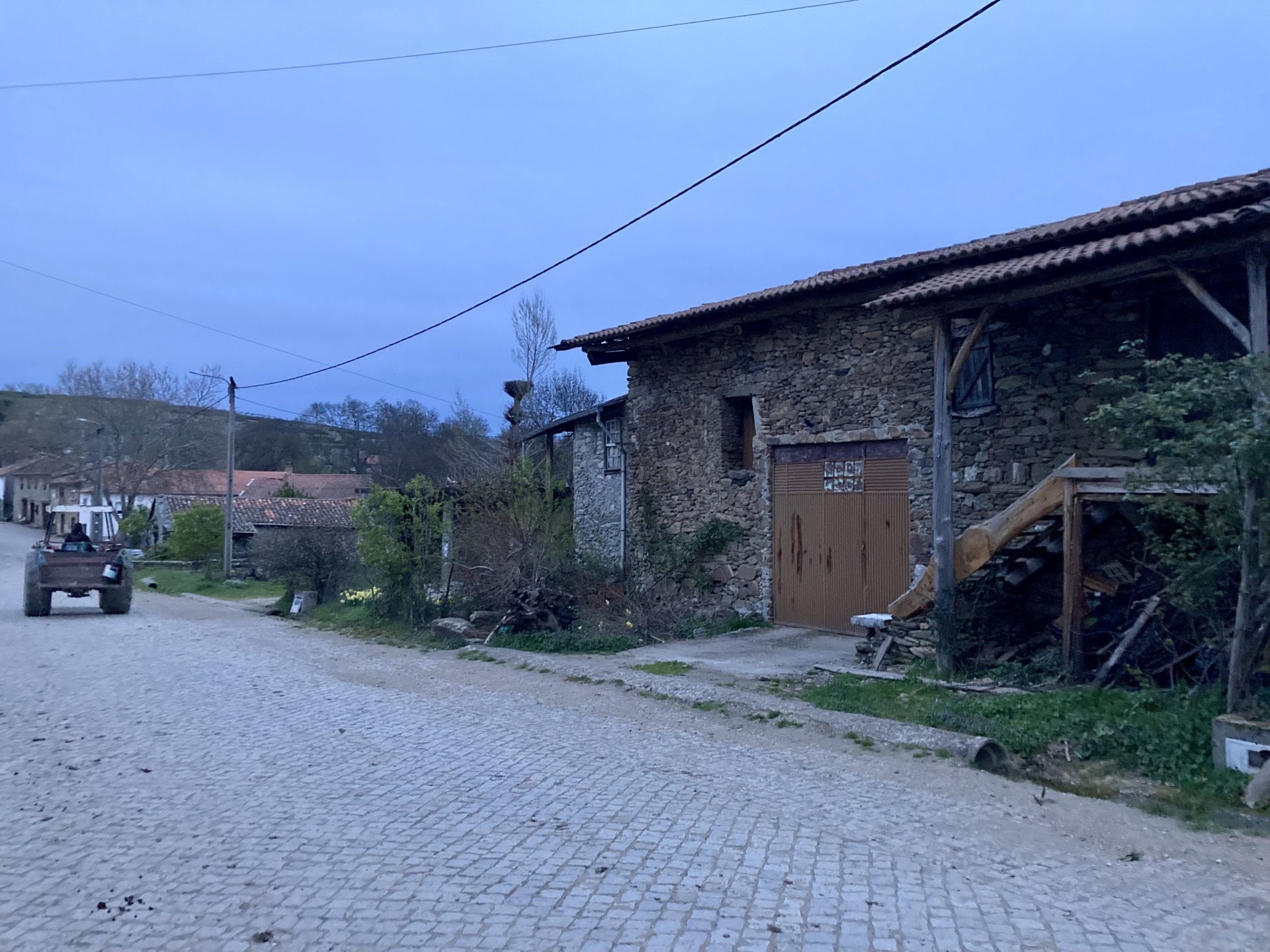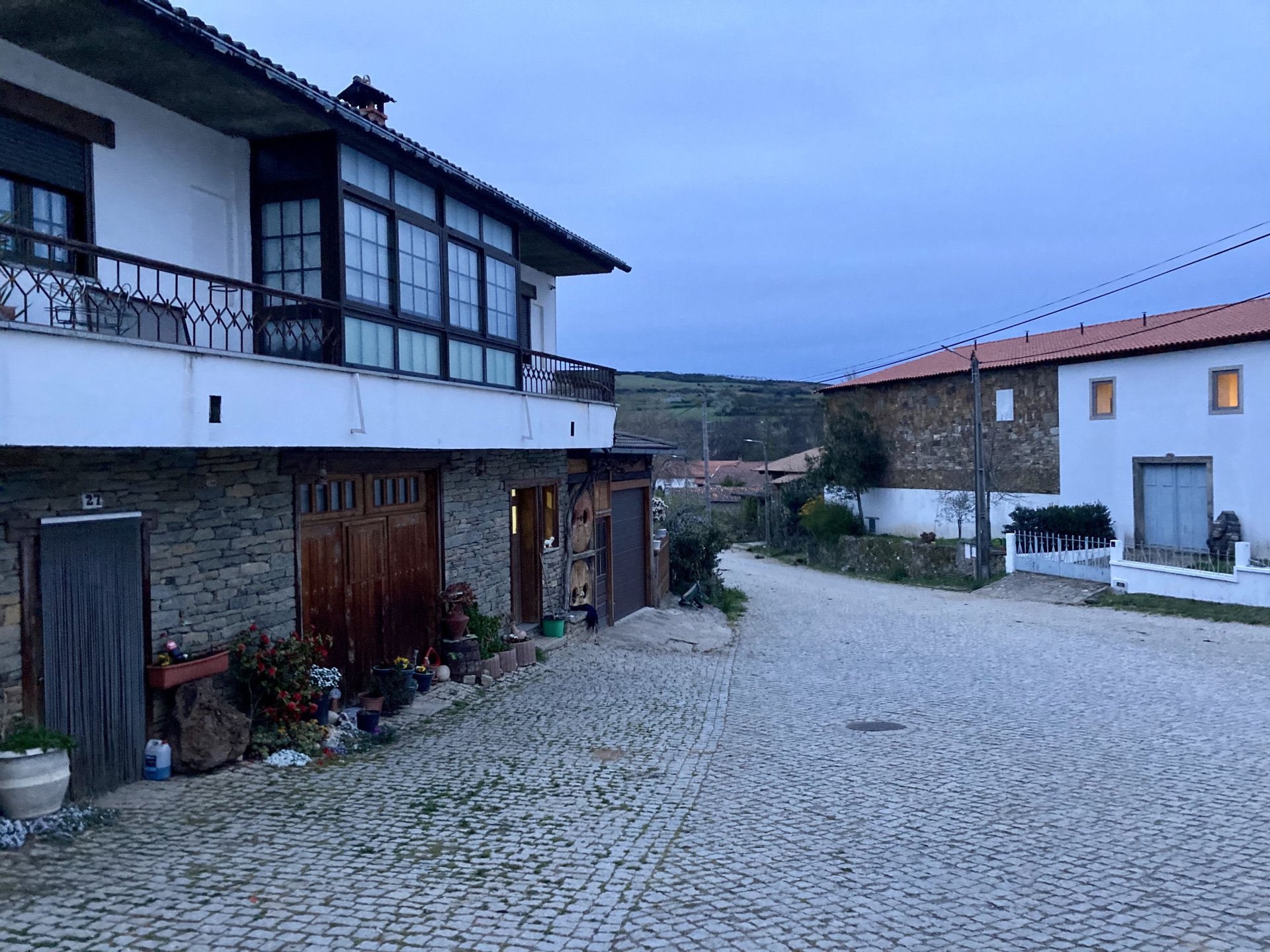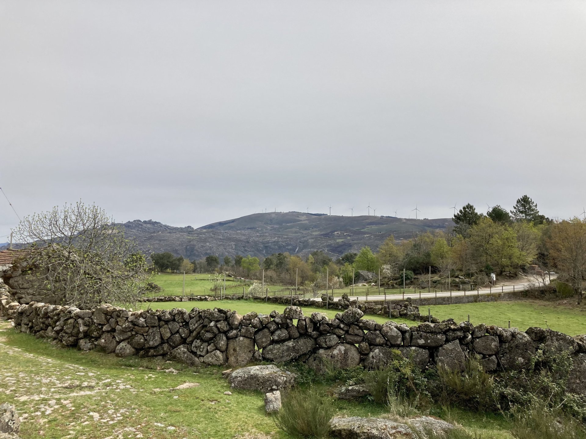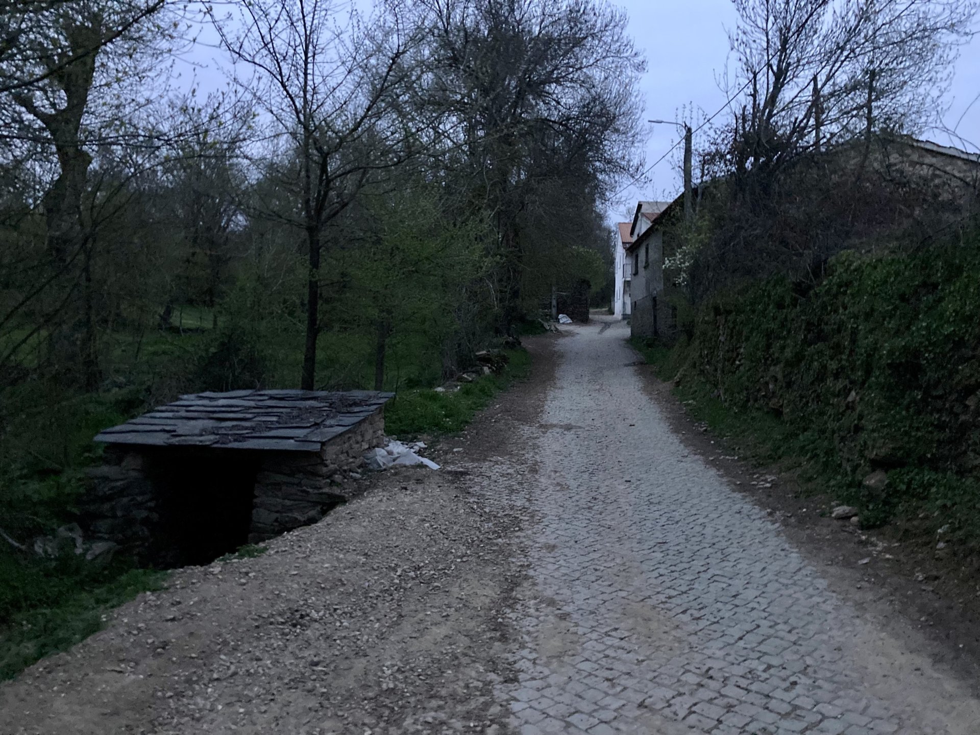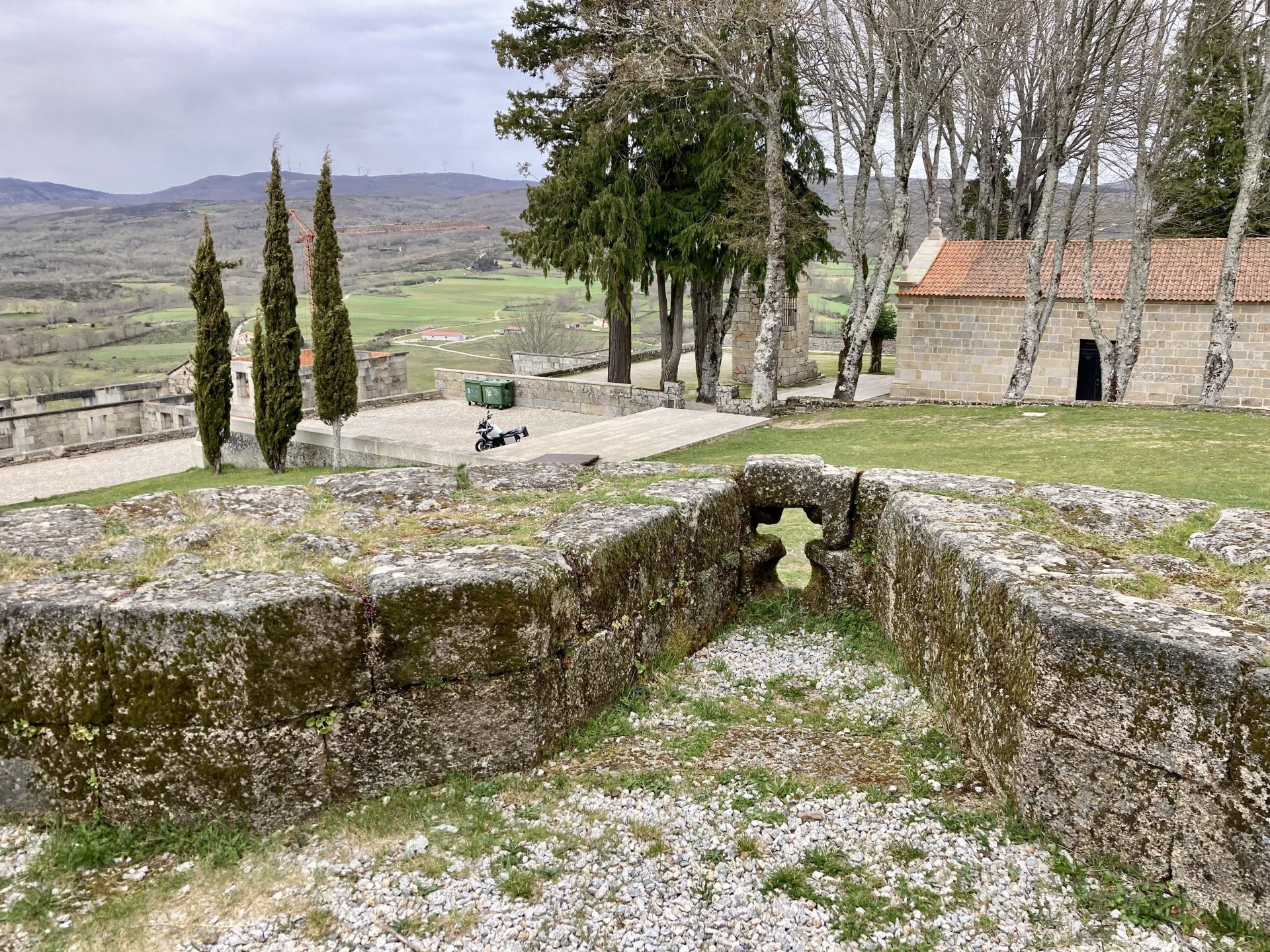 If you look at a map of Portugal and look at the north border with Spain, and follow the half of it most inland, that's where this ride will take place. I had a short meeting in a bank in Vila Nova de Gaia, and only ended up leaving well after 9:30, got on the motorway north to Braga and from there got on the small roads, took the N103 firstly heading northeast to go past the edge of the Gerês natural park with it's charming old villages, it's landscape so bucolic it feels like it's manicured by god. It's very pretty place but not one for today. This was still on monday but the start of the holly week, and Spaniards must not have saints in Spain as they all flock to Portugal, Braga being a very important catholic town is invaded by tourists so I wanted none of that. Stopped at a big shop to buy a charging cable for my phone right after Braga, and had some breakfast before setting off properly inland. A few kms after, and although the N103 is very nicely surfaced, constantly presenting series of bends that allow you to enjoy any motorcycle from the most modest to a proper fast sports bike, I got away from it and onto smaller, narrower, and twistier roads off over the hills. A brief stop near the small village of Xertelo presented me with a very typical Gerês landscape. I was surprised that I couldn't ride through the village and carry on the other side as they only allow local vehicles inside, being a protected landscape they obviously mean for you to enjoy the place with no cars driving around, so I took a short stroll around before returning the one or two kms back to the main secondary road : Back on and shortly after I needed a pee, so got 50 meters off the road and came upon this place: A brief phone conversation had me stop to check some stuff on my phone and call someone back, while I talk the cows arrived back at their field and maybe one car drove past, this is quiet living here: The weather wasn't warm, but it wasn't cold either, the sky was very much overcast which ruins some of the pictures as everything looks like it should when it has a blue sky above. Arrived at Montalegre (translated to HappyHill), and stopped by the castle for a visit, I had never been here before and it is worthy of a stop. This place also marks the end of the typical Minho landscape and suddenly it feels more Tras os Montes, it's a place of harsh weather, lots of cold and ice, high winds, stone houses and hard people with tough lives, it feels epic and ancient too, and VERY different to the south. Montalegre has a beautifully fixed up castle worthy of a stop. It's on the border of Portugal and obviously served an important purpose in defending territory back in 1273, when it was firstly built. The tower came later, and sadly it was closed on my visit so had to stick to climbing one of the walls. Some of the castles I've visited don't really mind safety and you climb up and down walls along narrow uneven stone steps with a drop to one side and a wall to the other, here and probably being visited by lots of spaniards they made it tourist friendly with proper steps and rails. I could do with a stop for a snack but most of the restaurants were closed, I didn't feel like properly sitting down in a restaurant and having a proper lunch and couldn't find a place with seating outside, so moved on. Exiting Montalegre, I like the mix of very well kept old stone houses and the modern underground recycling bins: Traffic jam in Montalegre At around 2PM, I stopped at a small village, and got into a cafe to ask for a sandwich. Took a picture while the kind sir thinly sliced some presunto (raw bacon to you all), and made me a deliciously simple small sandwich. The cafe owner was very surprised I didn't go for his recommendation of going to the local restaurant and "eating properly", a proper Trasmontano lunch would invalidate riding in the afternoon I ate outside while chatting to an older gentleman, no pictures as the camera would have ruined the moment. For @yen_powell, a church and a cemetery I rode on heading East always quite close to the border, and mostly away from main roads. Another stop for a call: I intended on not stopping for pictures except in places where I actually stopped for whatever reason, but this made me stop and get off the bike for a picture of the road ahead, just to have the location saved when looking for it in the future, the surface could maybe do with a refresh but it had character, and if you look at the picture below you'll surely see what I like about this Another stop for urination, on an amazing location: I intended to stay for a while to enjoy the place and the river sounds but started to get swarmed with mosquitoes so went away. Instead stopped in Vinhais to have an espresso and figure out where to sleep. It was past 16:30 when I stopped in Vinhais, while enjoying my coffee I looked on google maps and found a few locations close by, all that interested me were either booked or didn't rent for just one night stay. Doesn't matter, I decided to carry on small roads and stop later at Bragança. The roads though the Montesinho (little hill) Natural Park (https://goo.gl/maps/nDo8TfSDmuXbK8Lz7) are gorgeous. Most of it is old chestnut tree forests, and it feels amazingly old like you could expect to see a night riding though on horseback, it feels like 3 or 500 years ago, but I feel like pictures didn't make the place justice, you loose a lot of the naked trees with the grey sky we had. I'll have to come back in prettier light, and I'm sure it's a great place to visit when the leaves are changing and in chestnut season. Bragança is the capital city of Tras os Montes, it's got a castle, an historic center, but I got a little fed up with it. Rode up to a hotel with underground parking for the bike, and stood in a line after 3 or 4 spaniards in front, the guy at the check in desk didn't seem to get a move on, that clearly wasn't for me so I walked out, phoned a small rural place in a villag