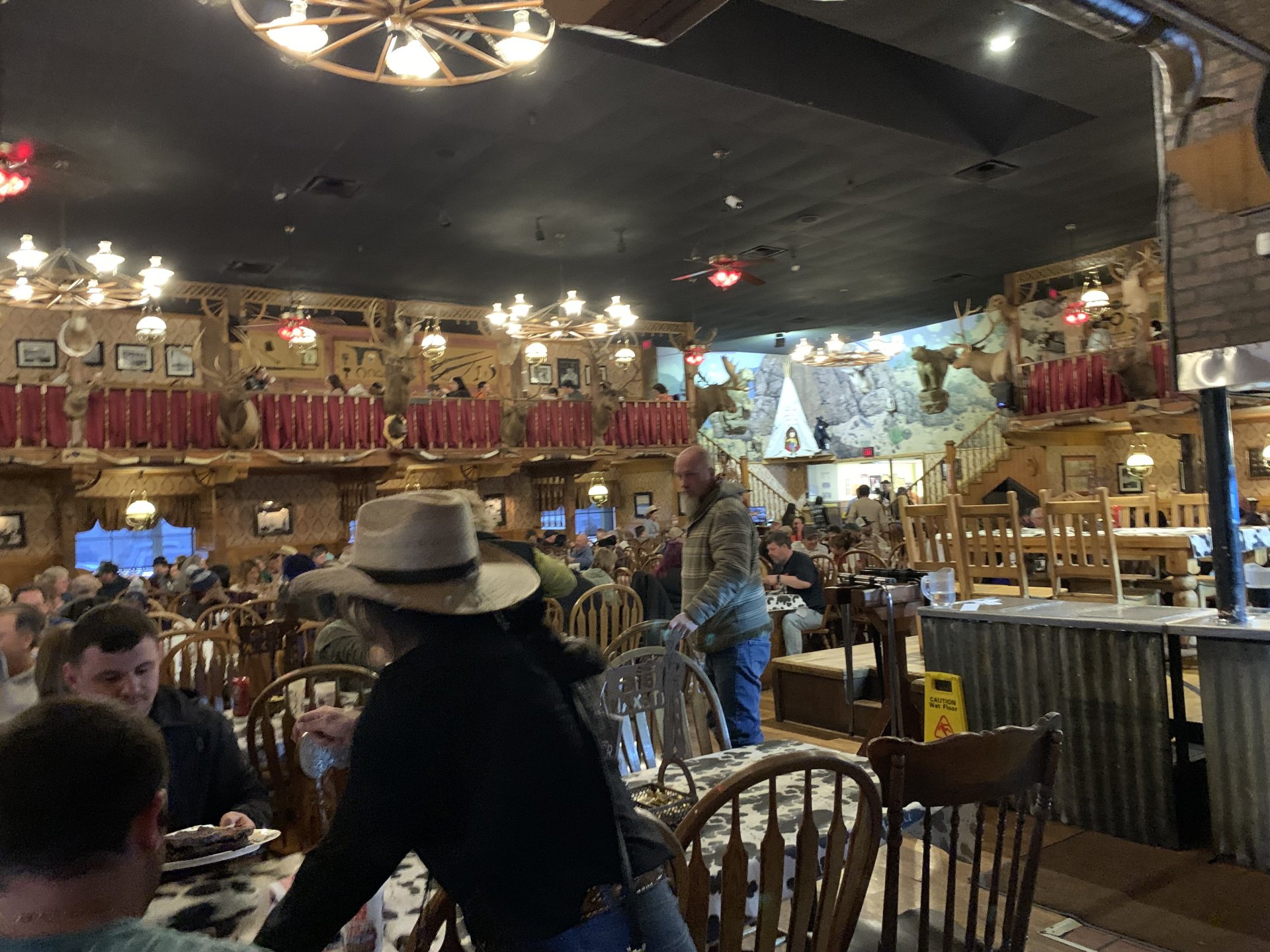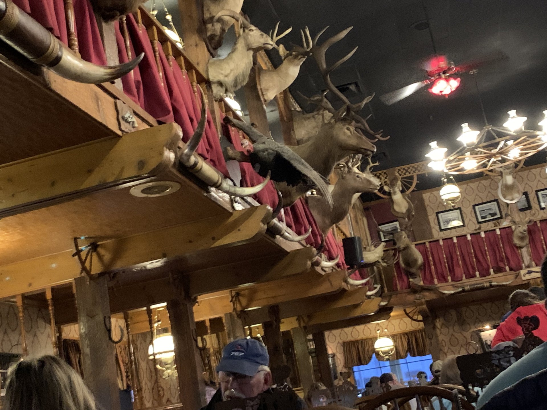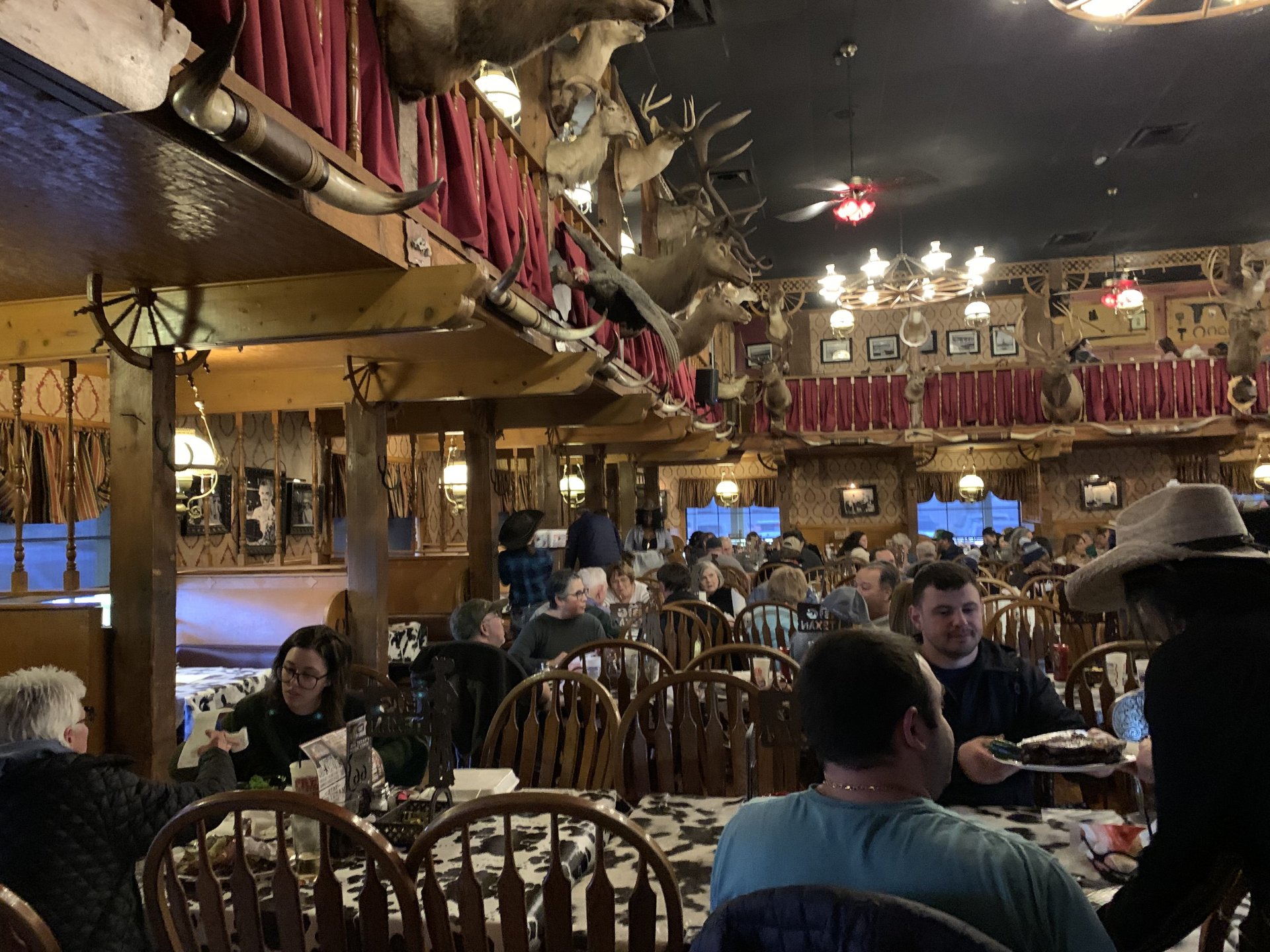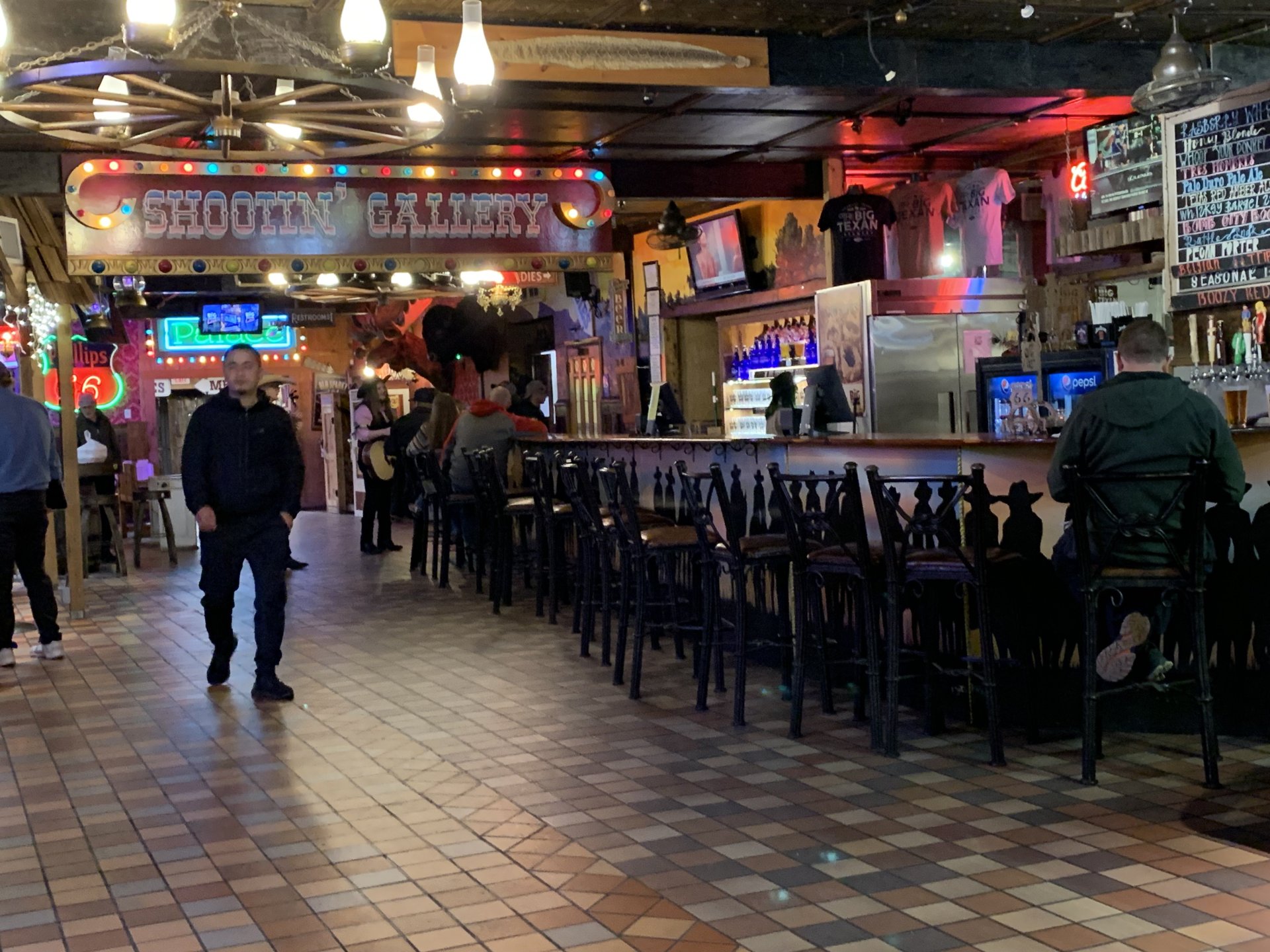 Dave and Debbie finally made it to Amarillo and we set off for the wife's favorite restaurant in town; The Big Texan. Weird kinda place that is decorated like an old west saloon and serves huge assed steaks. Dave had a 24 oz, slab of meat while the ladies had smaller portions. Me, not really being a meat eater, just had some beers. Very good, too.5 points