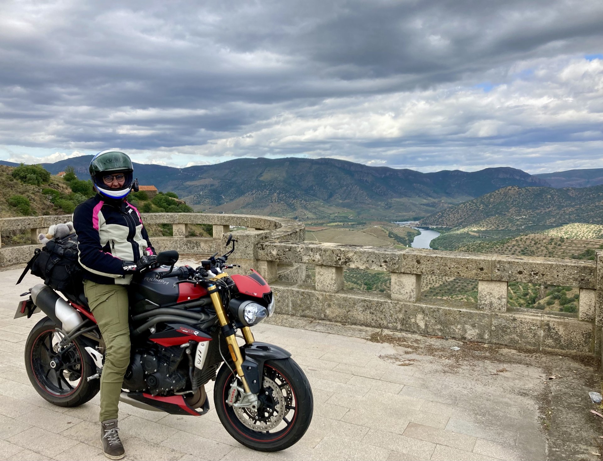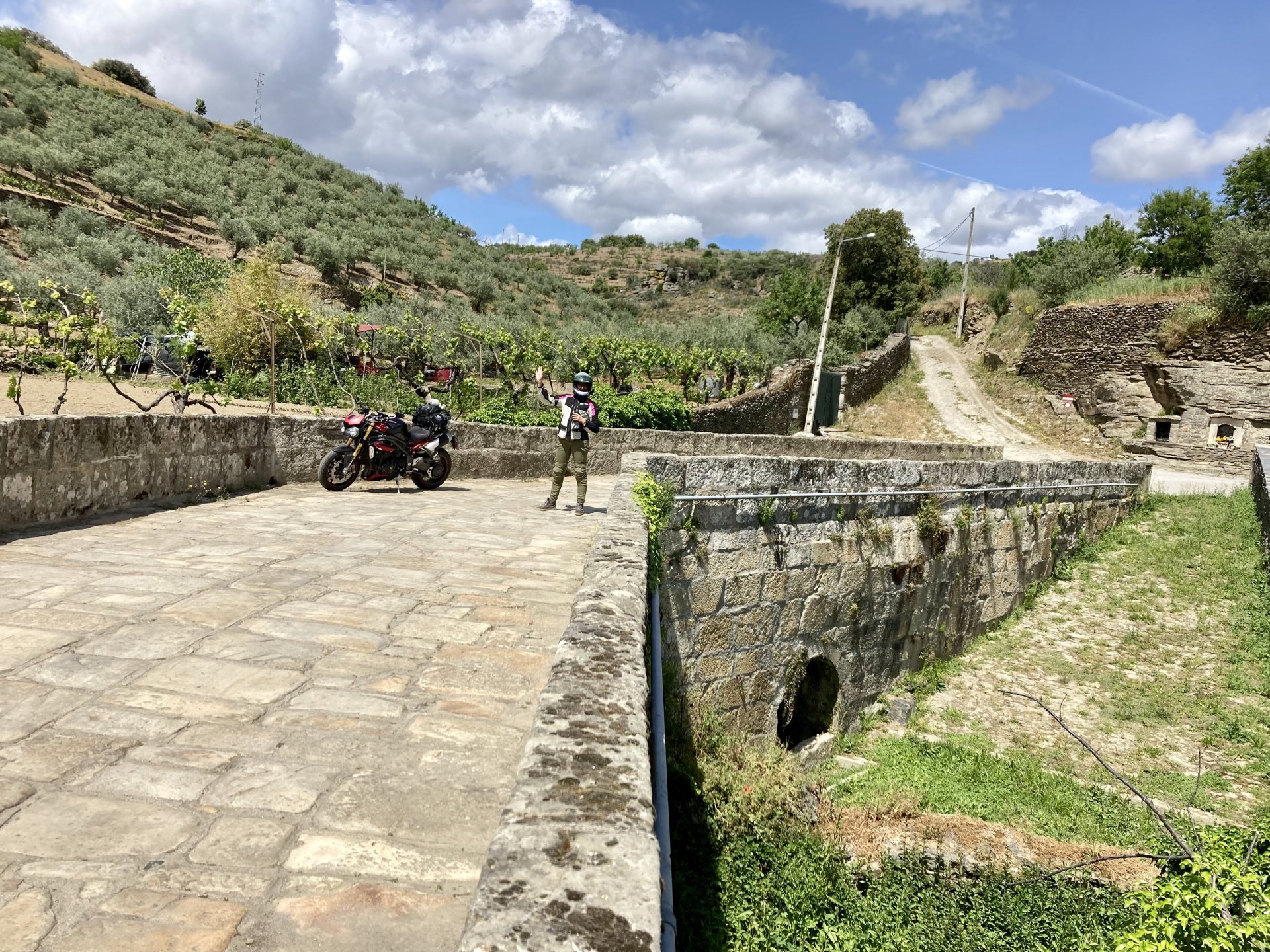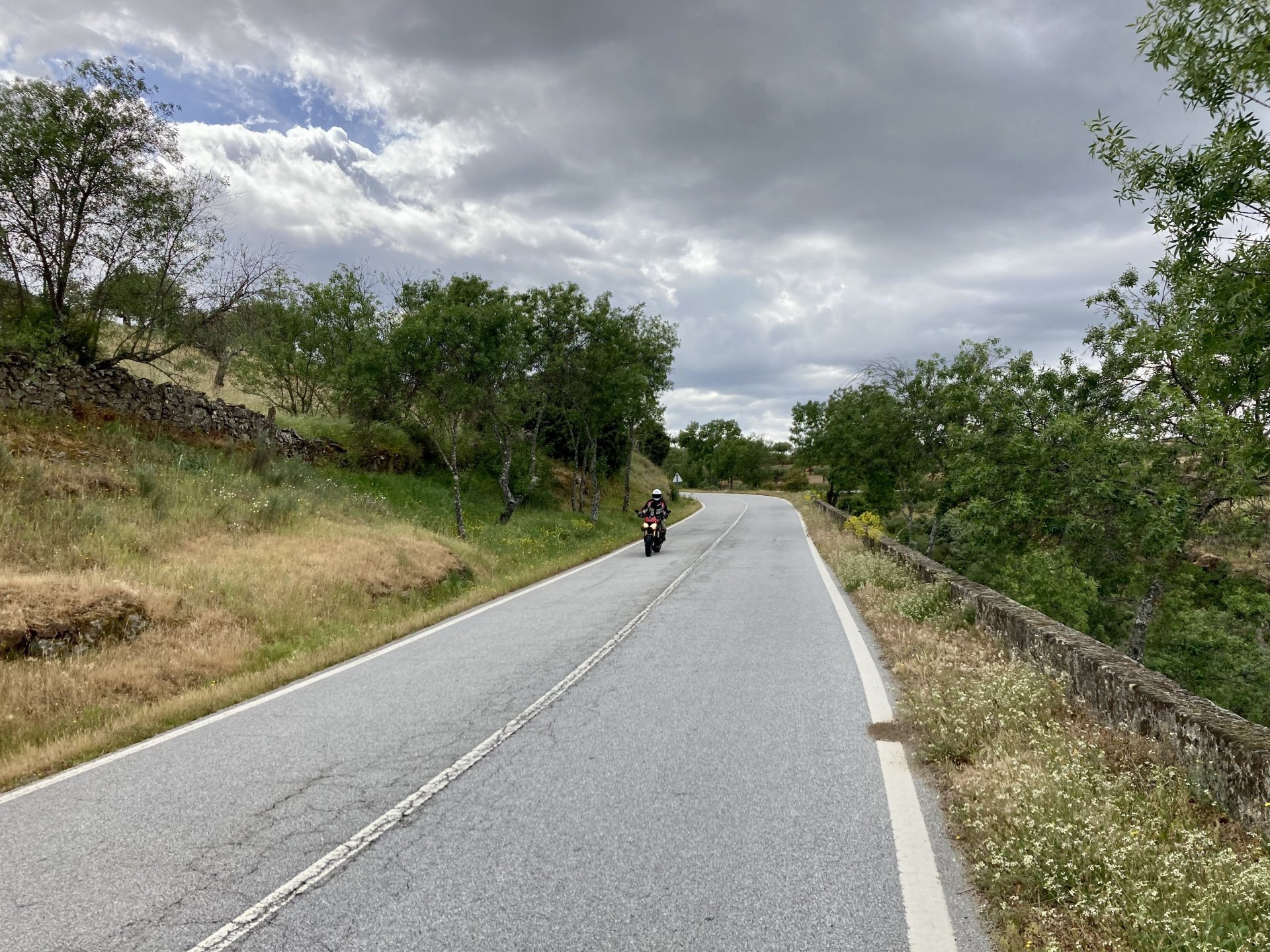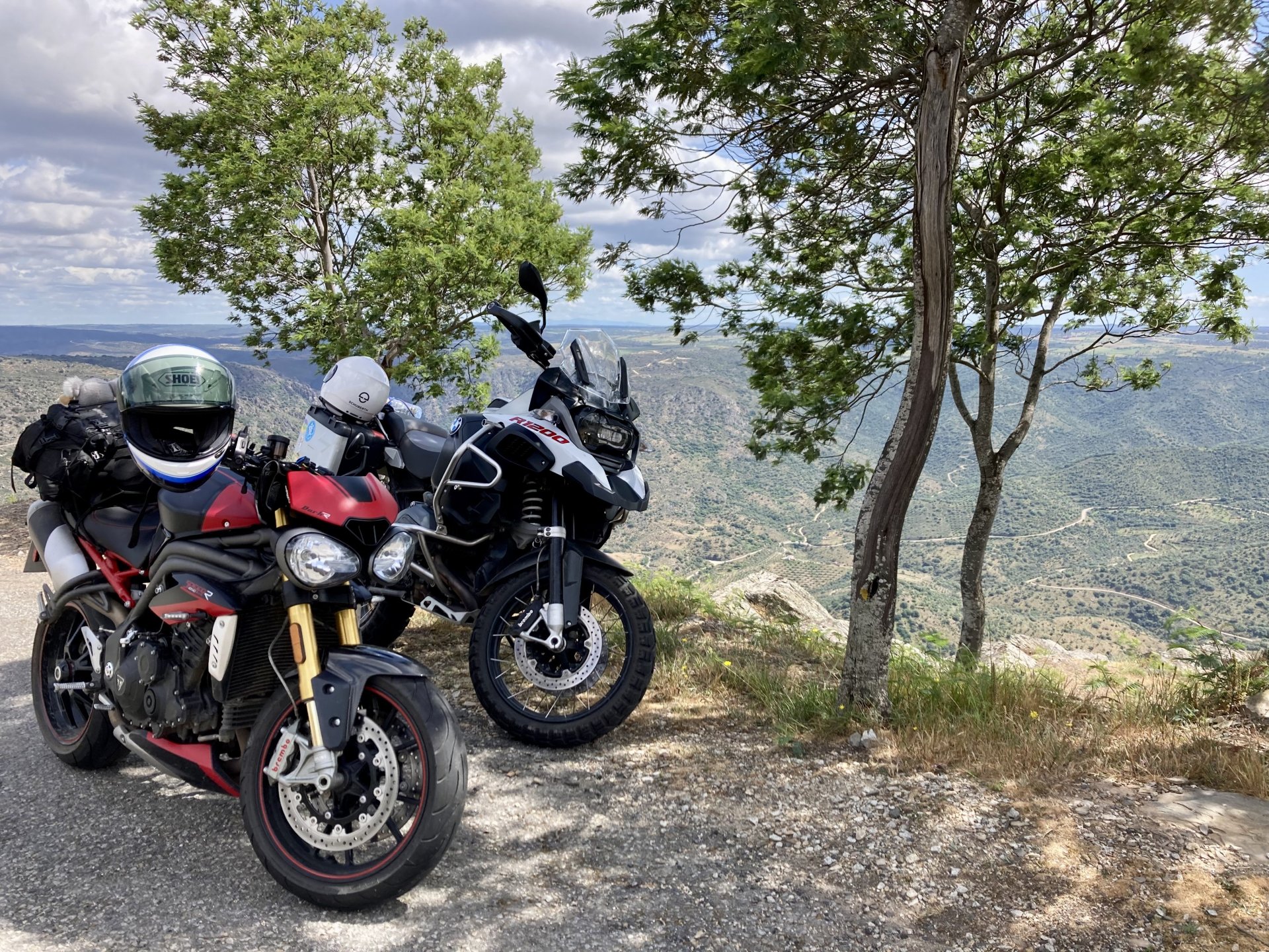 After my previous solo ride to Tras os Montes, Sofia had a few days to get away from being a vet and felt like going and checking the place out too, so that's what we did. Tras os Montes is sadly ignored by most tourists and even most portuguese tourists don't know the place. On one side this is bad, on the other it's very cool because it's a land of harsh climates, harsh landscape (that I've been told sometimes looks like Scotland), and authentic people and places, a lot of this is usually lost with bigger volume tourism. The aim was to go north, spend a couple of days at my parent's to keep my dog company, and then head north and inland in search of amazing old landscapes and good rustic meals. Tras os Montes reminds me of a time of kings, with it's abundant sweet chestnut trees, old castles, and stone walls that endure time. First, starting from the south / center of Portugal: I set of from my home near Lisbon on a monday morning, the sun was out and the day was to be sunny and plenty warm. I was early getting out, had already cleaned my place the day before so after taking out the trash the blinds were shut and the place left until my next stay. When I see that house closed I better leave quick or my emotional side takes over and I end up staying a few days more. I take only small roads, after a while I stop by a dam for breakfast at a cafe and a few work calls to get a few issues done for the day: Quickly made a friend, that abandoned her owner and came to check out my last bit of toast: Arrived at Constancia, quaint small town by the Tejo river with the claim of fame that very important historic poet Luis de Camões once lived here for a while. I stopped, had an espresso, and proceeded to wait for @Sofia, at the time setting off from Ericeira via motorways to catch up, she made it in illegally quick fashion but still gave me an hour to sit around watching country town life unfold. Posto de Turismo is where you get information about museums, tour guides, etc, and it's set up in the old jail house. Cool stuff, I did go up there to see the inside but it was closed. The sky was amazingly blue, and the warmth was arriving, it was supposed to be 30º that day. A contrast to the following days. At almost midday, Sofia arrived after her motorway blast, ready to take off a layer or two of warm clothing, and head into smaller slower roads heading up through the center of Portugal. We managed to eat a cheese and ham toast for lunch, which was a pleasant surprise, and continued north through dense forrests, here starting to look back from the first noticeable hills Not many pictures were taken, here's another friend that popped up while stopped for refreshments: Pampilhosa da Serra, roads around here are just underrated, this is hill and forrest country and the roads just seem to be well maintained, and fun enough to enjoy in all sorts of bikes. We stopped at a lookout over the town for a breath, and for me to think of the following roads. We had already settled on a historic hotel for the night so the general destination was set, just not the specific road to get there. I struck a pose: Brief stop at Gois, where I frequently get lost and exit on the wrong direction. Gois hosts Portugal's second biggest bike rally, after Faro. This is more of a portuguese thing, deep in the center of the country and away from touristy Algarve beaches. As we approach our hotel, which is deep in a forrest nature park, I stop for a bucolic pee and to enjoy the coolness the dense forest provides after a warm day on the bike. We park the bikes for the night, and quickly have a shower in time for a stroll around the property. Hour hotel is Palacio do Bussaco, a proper palace built for a real king. Rooms are run down and severely overvalued, but the building itself is amazingly characterful and the gardens and special forest around it are breathtaking. I never heard so many bees around, flowers are in bloom but we were later on having a glass of wine outside and you could hear the millions of bees in the background, like if a distant natural white noise. Sofia knows all about the story of the place, I am a little bit more of a simpleton and just enjoy the trees and birds and some (overpriced) wine. After a lovely dinner, we enjoy a walk around the gardens (like you do), before turning in. Tomorrow I have mountains and twisty roads planned! Before checking out, we walk a little around the forrest / garden surrounding the hotel, I learn that we have a special kind of cedar that only exists in this place. Cool stuff! ced Adequate parking location for the GS, although to be fair if I had my choice I would have left it under cover. I think the artisans that sculpted those pillars wouldn't have minded. From Bussaco and Luso, we set of to Serra do Caramulo for a coffee, some amazingly twisty roads up the hill have Sofia in a good mood after a little more than an hour to get there. Again, we set off, down the other side of Serra do Caramulo, and up Serra da Arada, we ride up a road I used to be very familiar with back when I used to race up here on the Transalp almost every weekend. The road twists up the hill with gravel and dirt thrown in on some bends, luckily for the Speed Triple it was better kept now but still a little out of spec for the sports bike like chassis of that bike. I forgot how harsh that road was, but it does make up for it with amazing views once you make it up there. BOTM: We ride through a few Serras, heading north, and I really put the Speed Triple and Sofia through some harsh roads, temperatures also reach 29º which doesn't bother me much but we were going slowly and it taxes you. A brief stop with a view After a longish day we reach the Douro river, which is just 40 minutes away from my parents' place. We take a breath of fresh riverside air. My dad was called in for a surprise visit to the doctor in Lisbon, so we made a two day stop in Espinho to hang out with Costa while they went away. It was a c