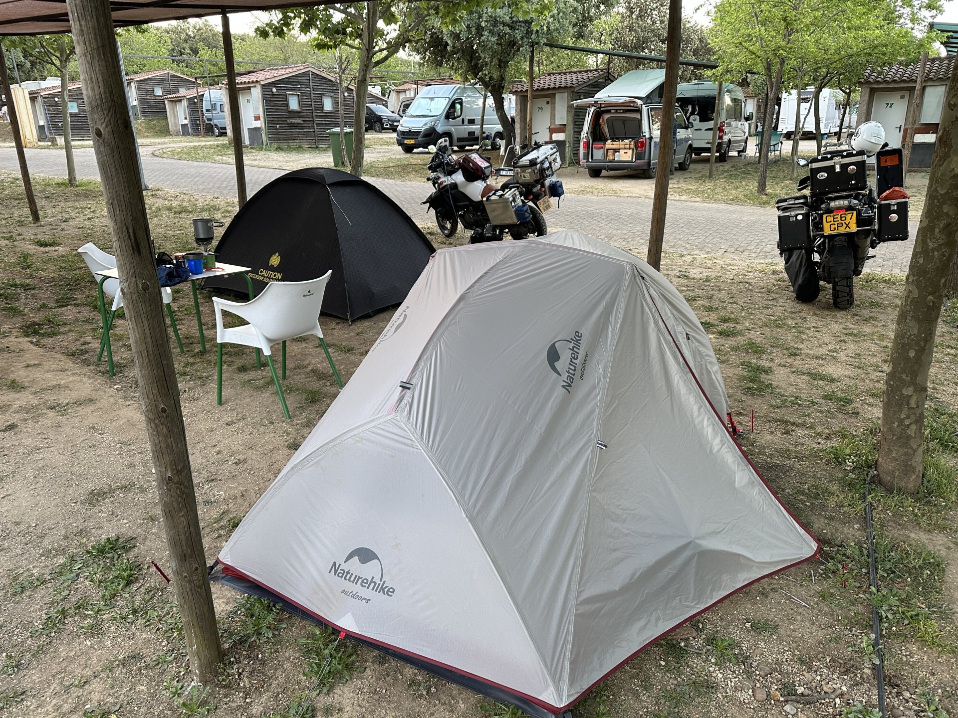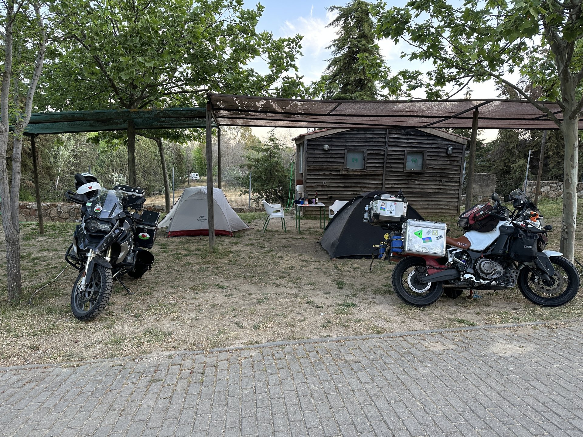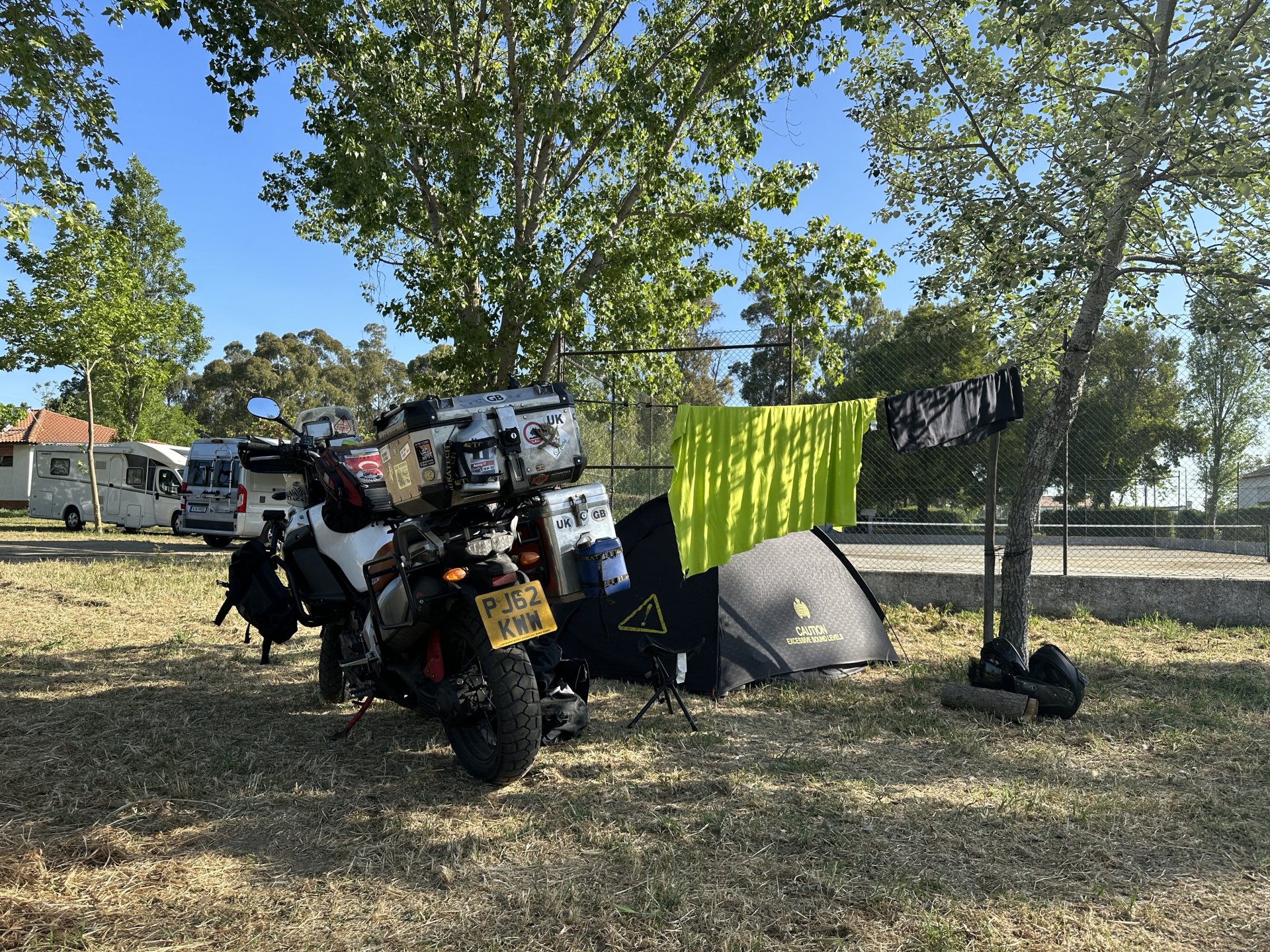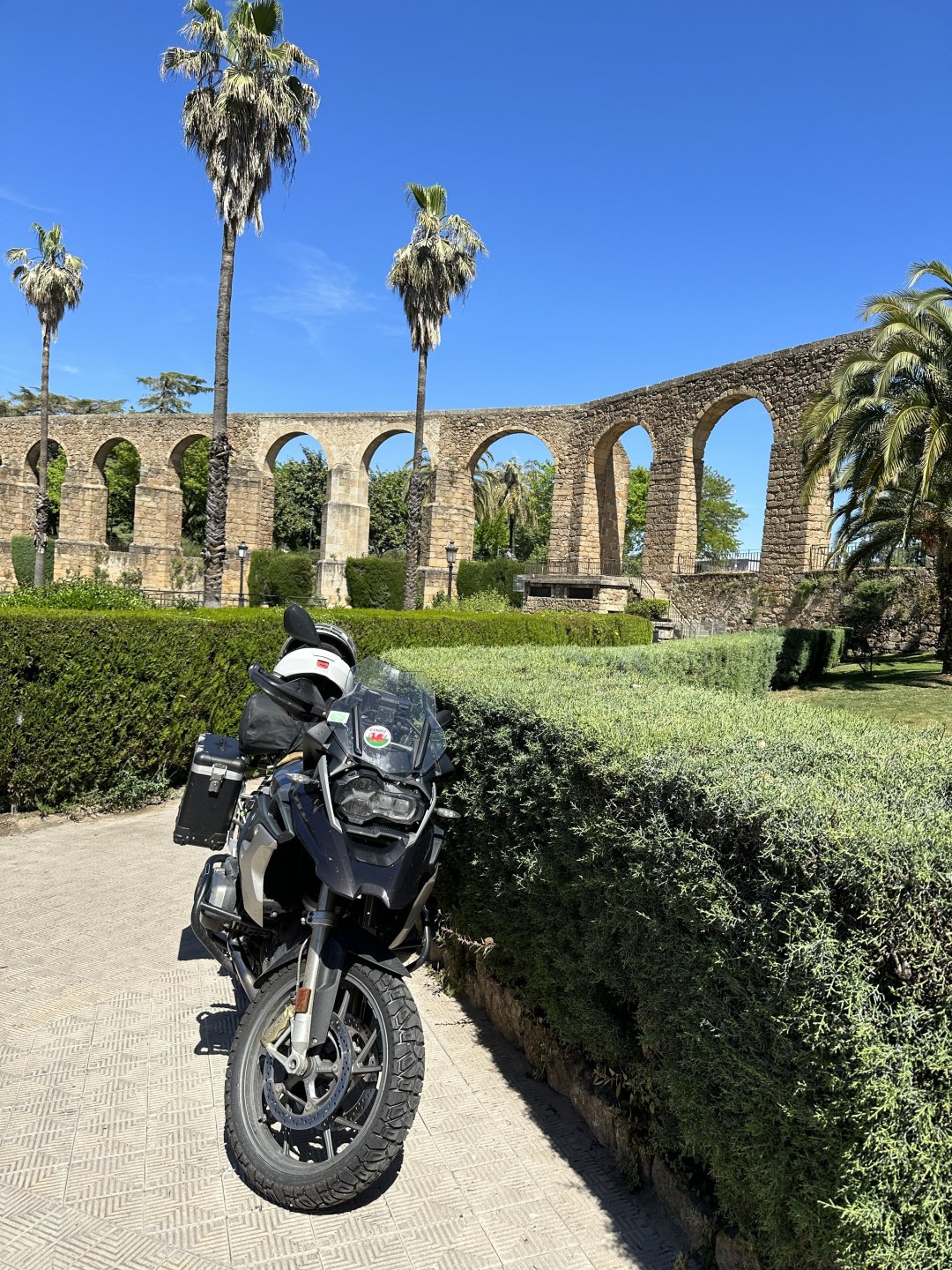 The next day I realised why I'd heard a few sirens during the night. Hotel was opposite the fire station. Then it was south again, on the motorways. We stopped for coffee and fuel, and for Titus to look for insects. Another bit of motorway to Plasencia where I had read of an aqueduct that was supposed to be worth seeing. By the time that we got there my brain was nicely cooked so after grabbing some photos and slurping water it was back onto the motorway heading for Caceres where we were to camp for the night. We arrived, with my brain cooked a bit more, at the campsite and before even going to the pitch it was beer time. Back on the bikes and up to the pitch. All a bit strange having out own toilet and shower! A guy rocked up, barney who was a few pitches down from us. He was in the queue in Millay behind us. Small world. Anyway it was time for more beer and tapas so that was it for the night. A very pleasant evening after all the motorway riding.6 points