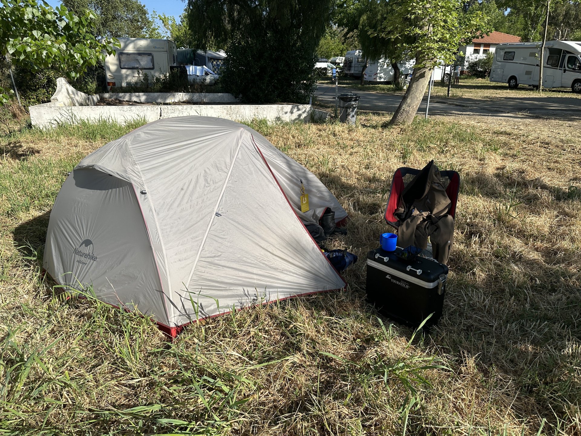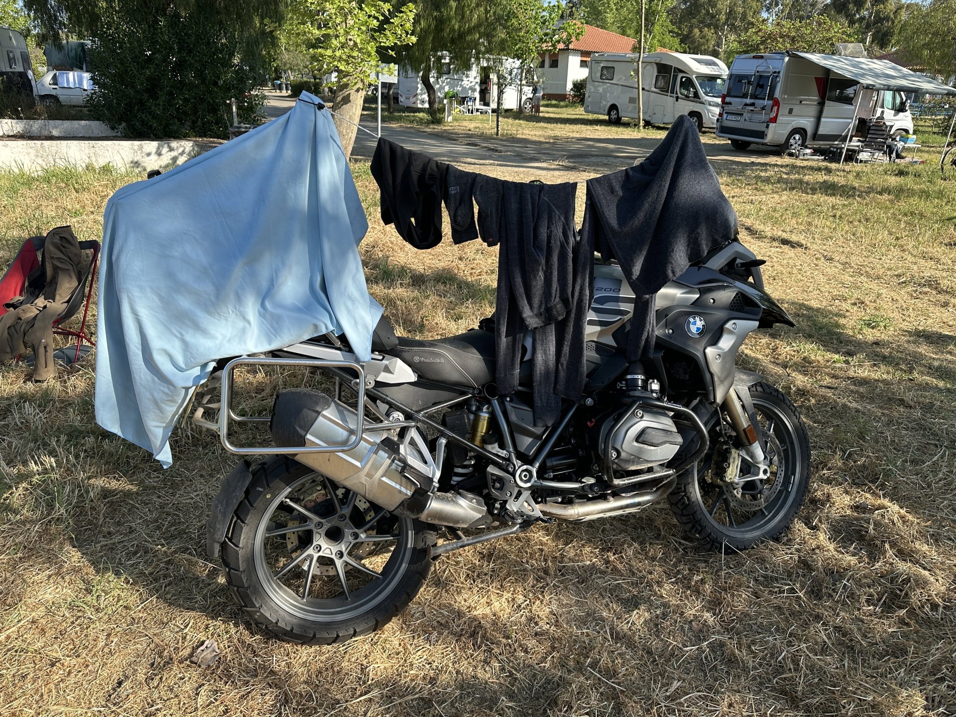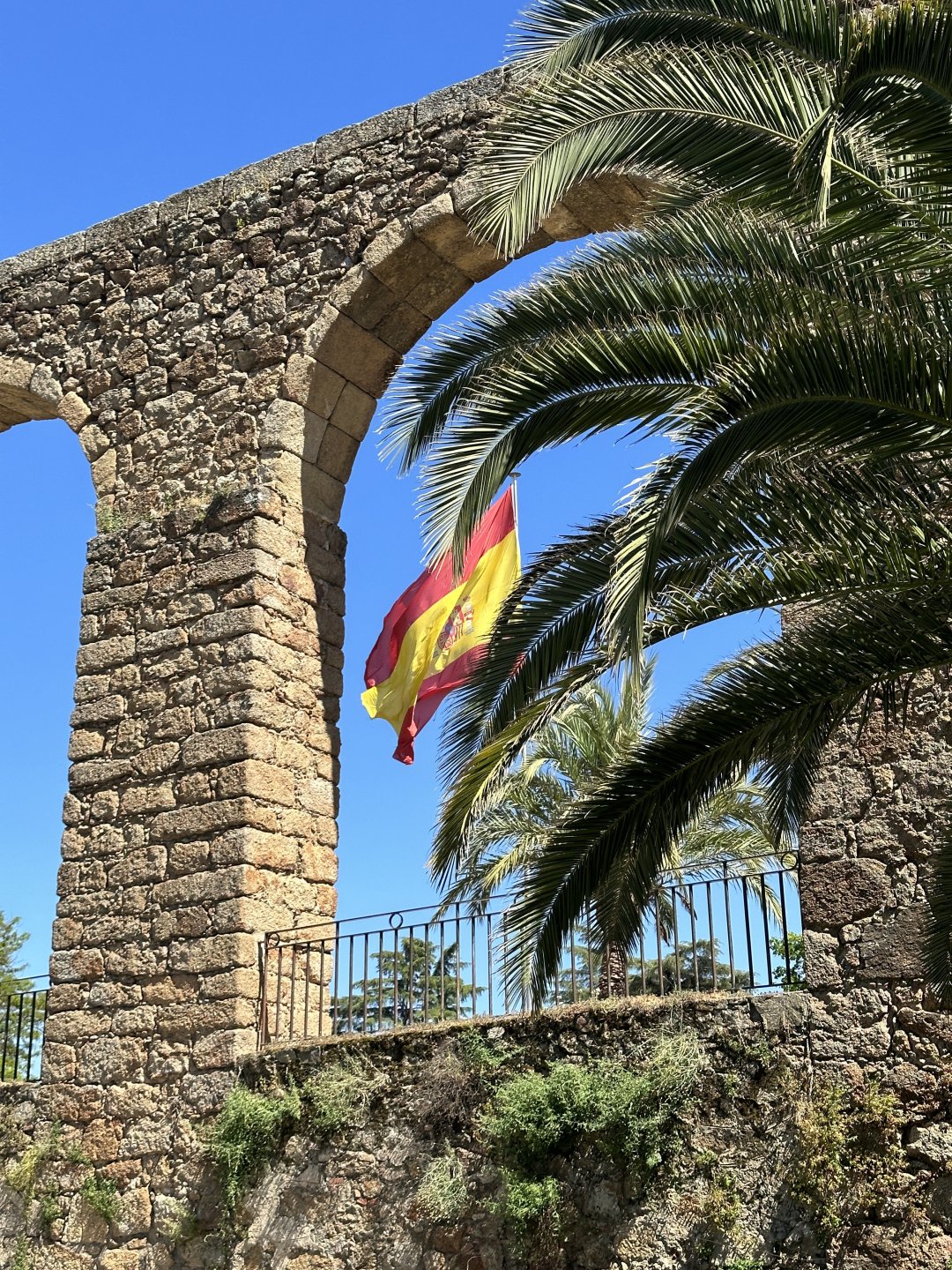 The next day I realised why I'd heard a few sirens during the night. Hotel was opposite the fire station. Then it was south again, on the motorways. We stopped for coffee and fuel, and for Titus to look for insects. Another bit of motorway to Plasencia where I had read of an aqueduct that was supposed to be worth seeing. By the time that we got there my brain was nicely cooked so after grabbing some photos and slurping water it was back onto the motorway heading for Caceres where we were to camp for the night. We arrived, with my brain cooked a bit more, at the campsite and before even going to the pitch it was beer time. Back on the bikes and up to the pitch. All a bit strange having out own toilet and shower! A guy rocked up, barney who was a few pitches down from us. He was in the queue in Millay behind us. Small world. Anyway it was time for more beer and tapas so that was it for the night. A very pleasant evening after all the motorway riding.6 points