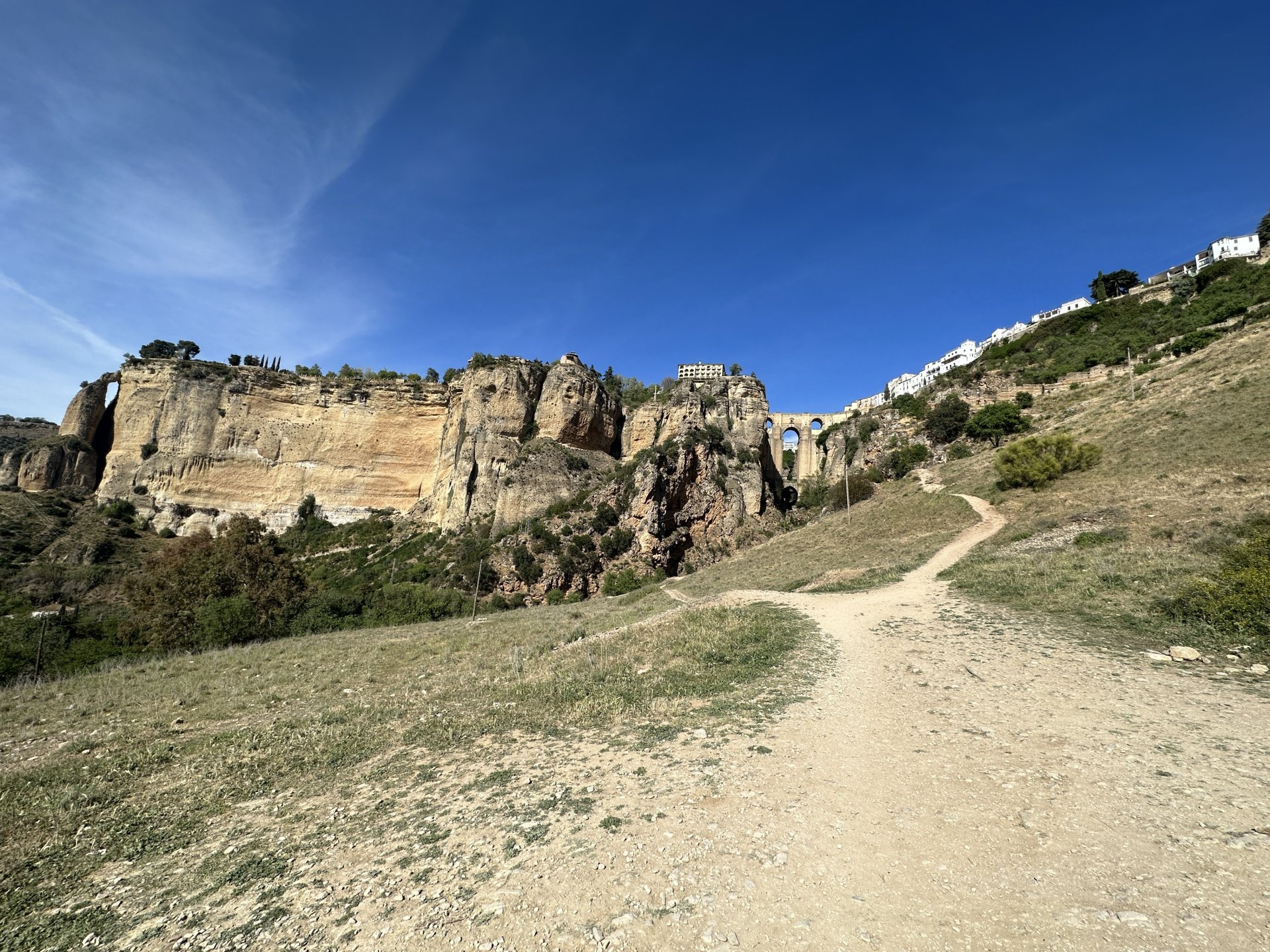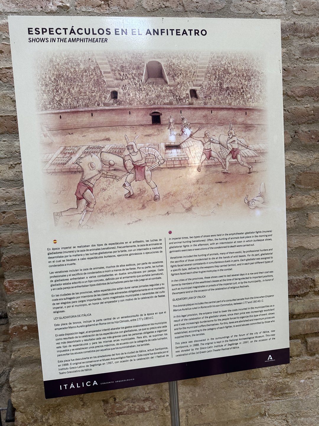 It was decided after a phone call that we would make it to Marbella in a day. It would be across country as well without as many motorways, a plus. The negative was that it was getting hotter! We went to Italia just north of Seville to look at some stuck together stones. I would normally have enjoyed exploring the remains of one of the Romans' largest amphitheatres, but by the time we got there I was running hot, and thought that sheltering under the trees by the entrance was more attractive. Anyway we didn't have a lot of time so Omar and I went for a wander while Titus kept an eye on the bikes. Italica Amphitheatre Then we joined the gridlock that was Seville. I was fuming at this point as my GPS was offering a route avoiding the city. It was generally all that I dislike about cities, heat and traffic, all to save 20 miles. We followed some pleasant enough roads towards Ronda and I was looking forward to a coffee or beer in the shade somewhere when I realised that we were heading towards the town centre. Great I thought - beer. Anyway I was wrong. We went down some cobbled goat path that led to a viewpoint of the bridge above the gorge where apparently people were thrown out of the door to their deaths. It was all that I could do to grab my hat and water and then shelter under a bush until it was time to move! Had it been cooler I'm sure that it would have been a wonderful place to visit. Ronda. The track that we came down was to the right out of shot. I enjoyed the ride down from Ronda to the coast, a tarmac ribbon of bends, bends and more bends. It would have been more fun with less traffic in cooler weather but I still enjoyed it really. It was beer on arrival and more tapas. It was very good of Carmel to put us up for three nights. Lots of beer consumed! Local poster that caught my eye.6 points