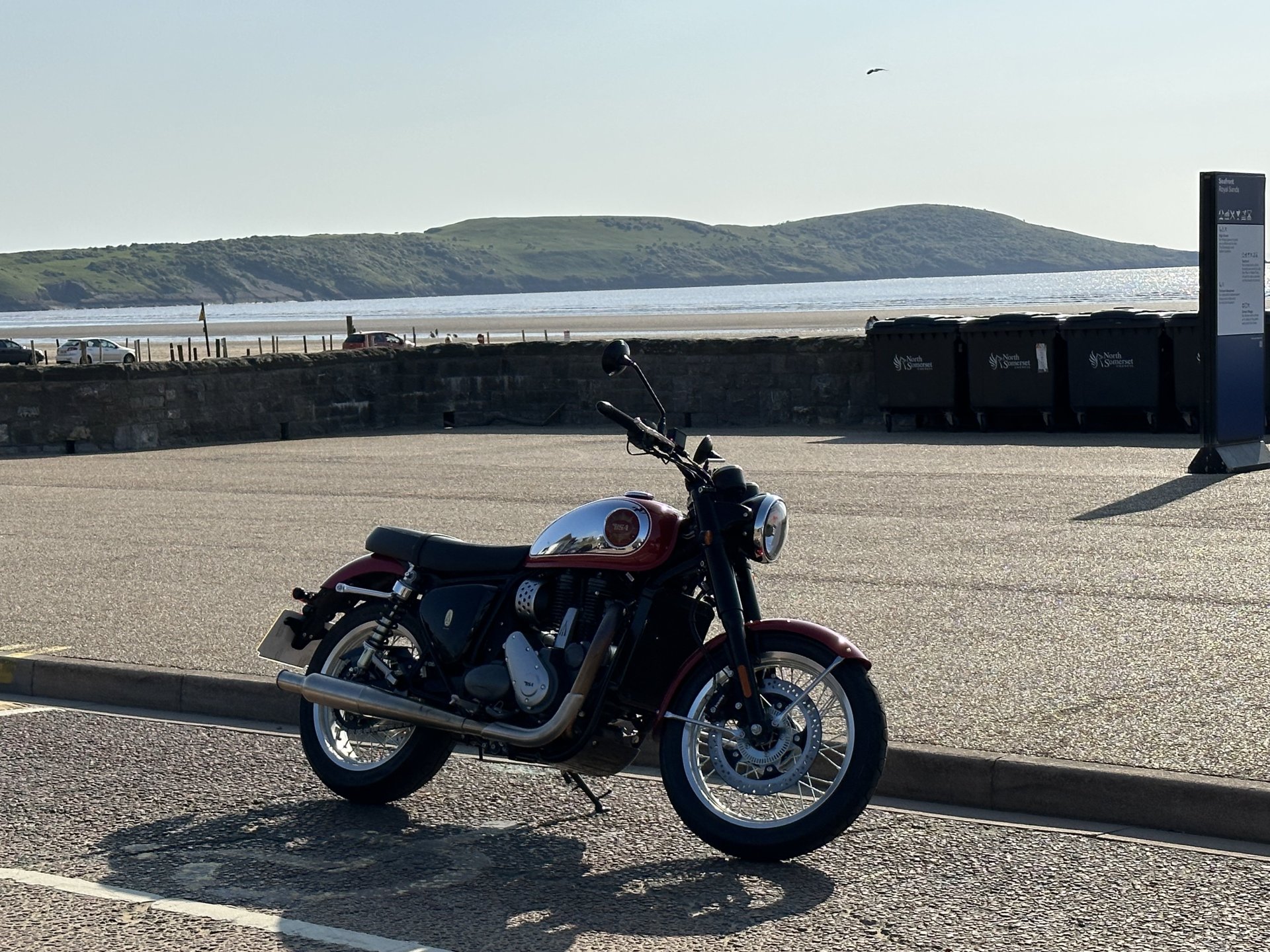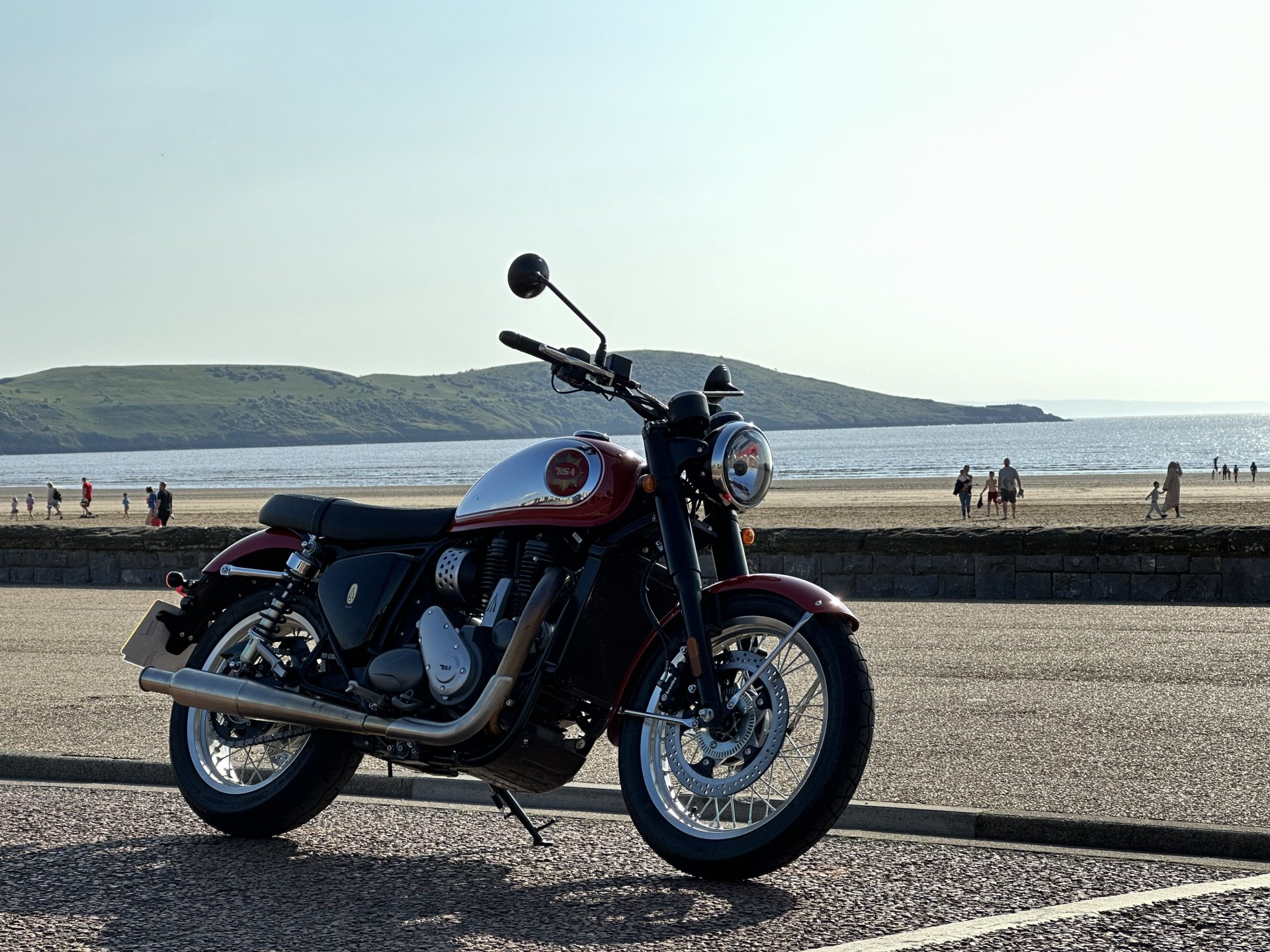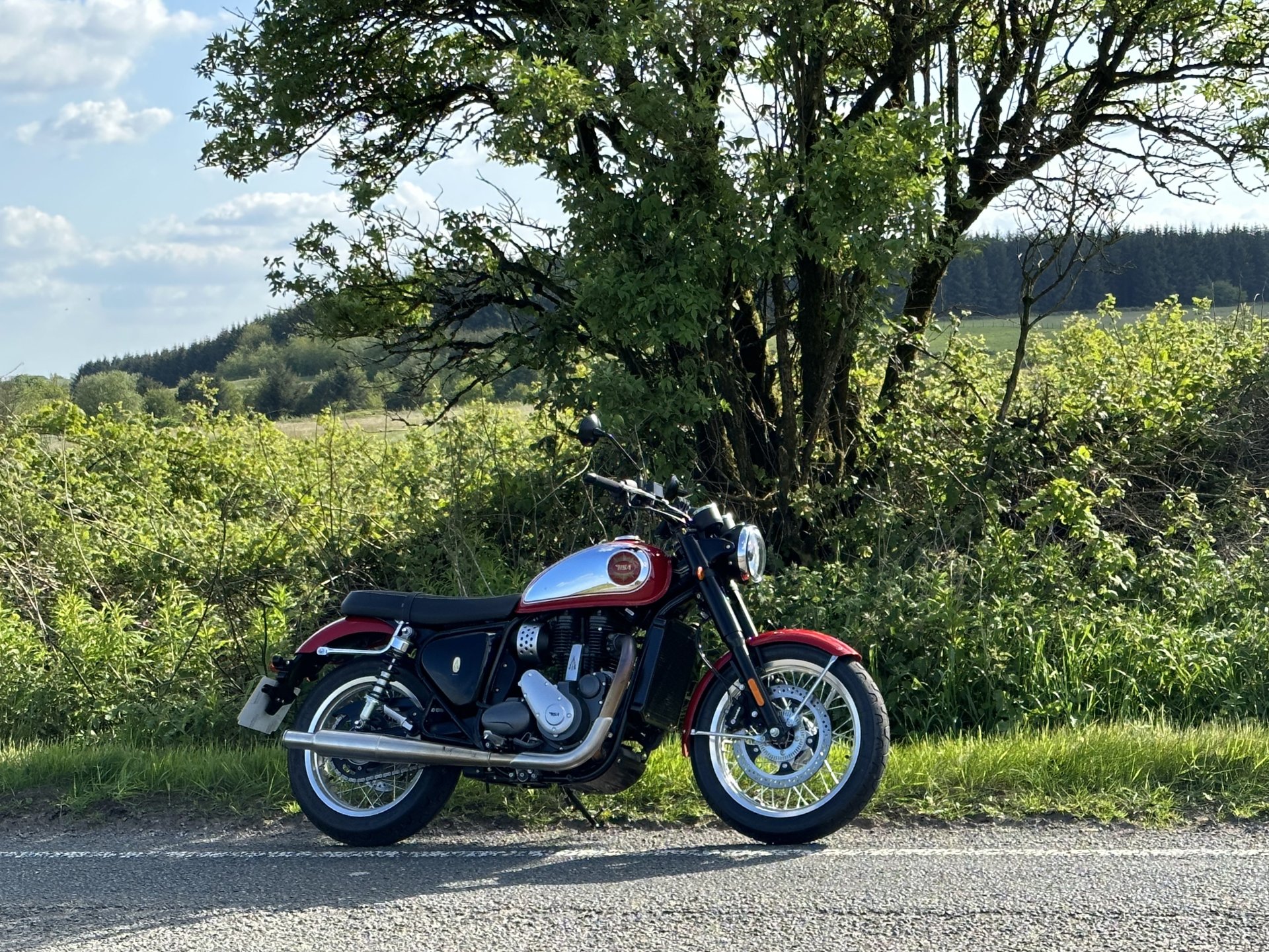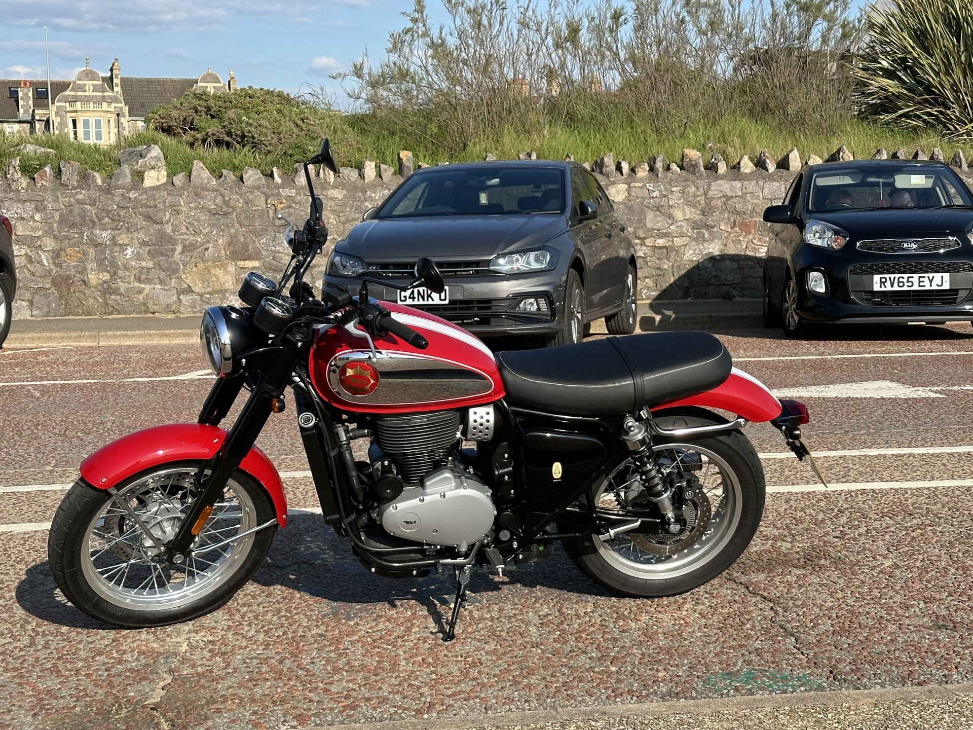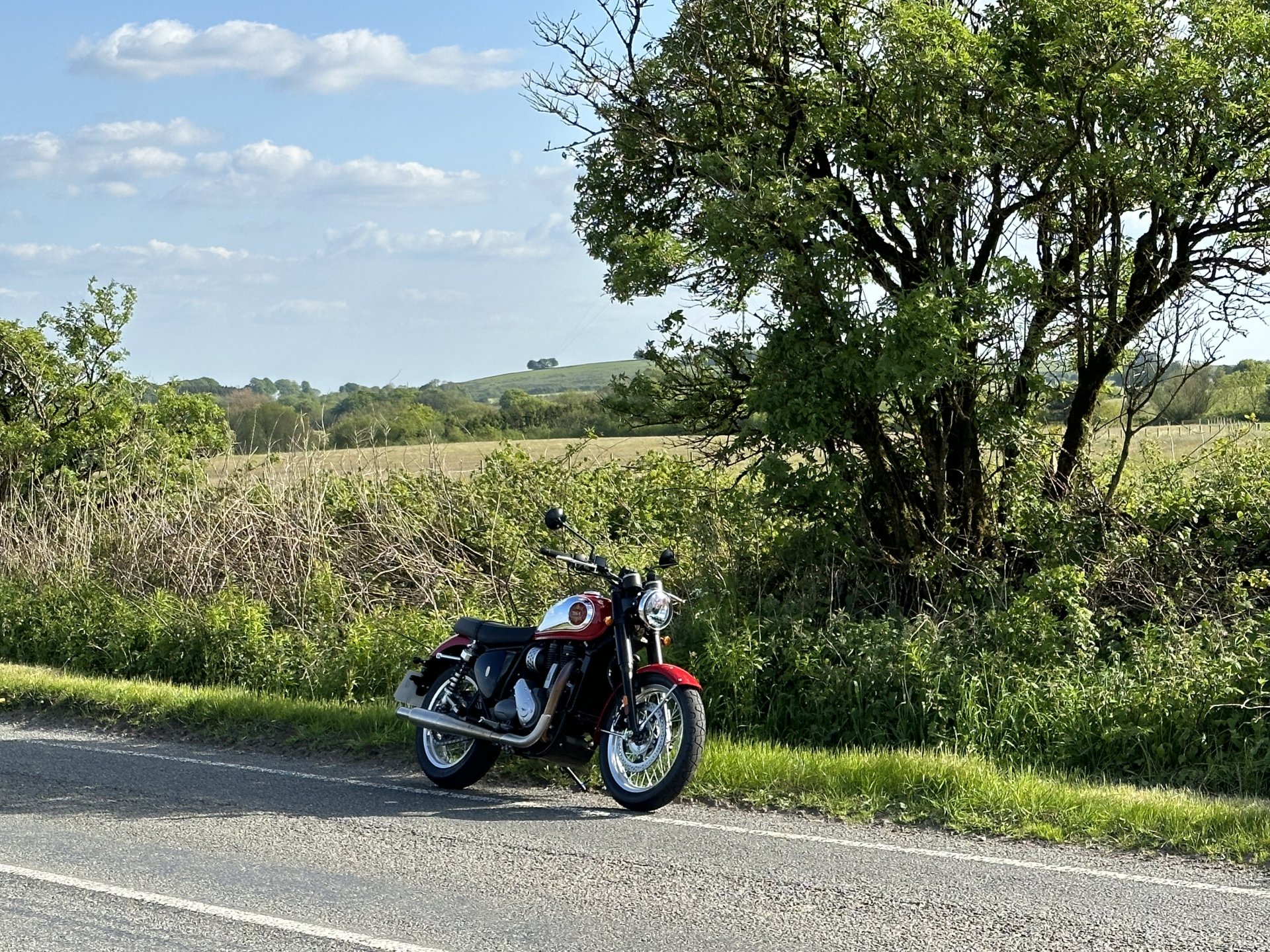 Lovely. Smooth, easy to handle. Not as planted as I’m used to at the speeds it can do but the suspension is to my mind the perfect combo of being able to soak up and still go round a corner.. a bit. Still running it in so not really giving it any real beans but (on a closed private road) it went to 80 what felt like quickly without trying, theres a lot more there for sure. It’s a lot of bike for the money. I hesitate to say this because I do like the T120 but I enjoyed this more. For what I think of as a low bhp bike it’s surprisingly present. It feels good to ride, nicely put together, obviously not on a par with the 9T or a Ducati scrambler build or power wise but not the rattly tin tractor feel of a RE and closer to a Triumph. It is to my mind undeniably pretty. Cosmetically the stickers really are a let down and something I can see me having to remedy in the future. I also really dislike the placement of the exhaust. If you look at the pic closely you’ll see black marks from my boots where it runs unsleeved too close the peg. You’ll see the same marks in youtube reviews so its not just me. I’ve adjusted my foot position but even so pah! It’s not a bike for thrills and spills but if you’re not after the Sunny Sunday ride experience and want more it can give you a lot more, it just wouldn’t be my first choice for that sort of thing, then again thats why I chose it. What surprises me most is how light it feels, it feels lighter than every bike we have (bar the Livewire), it is easy to manoeuvre off the bike, important if you’re not built like a brick shit house. It’s trustworthy placement wise. I’m normally cautious filtering through traffic on a brand new bike until I get used to it, this one is an almost instant connect, I found it very easy to filter with. It fits exactly into the gap I wanted it to, I feel absolutely no urge to wring it, which on more powerful bike I feel goaded into (it’s not me govn’r it’s the bike, honest) and on less powerful bikes I find myself pushing them as hard as I can and thinking more.. give me a bit MORE This is the bike that I can see me enjoying now and for a long time. If it was my only bike I would hold onto my licence but still enjoy riding. Bikes always bring a song to mind when riding them and this one out in the sunshine is the Eagles Peaceful Easy Feeling.5 points
