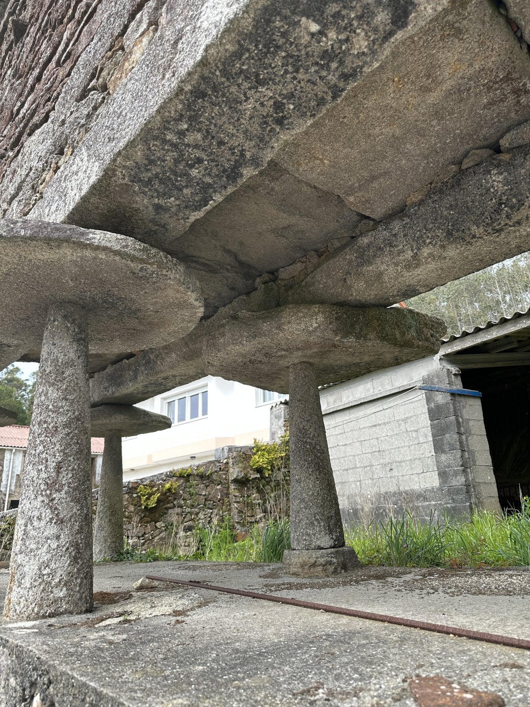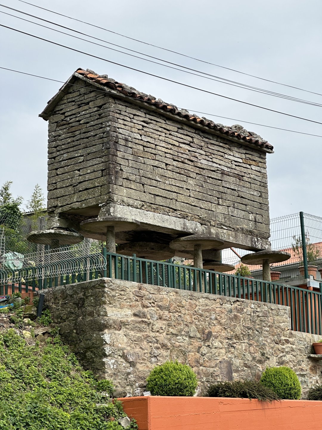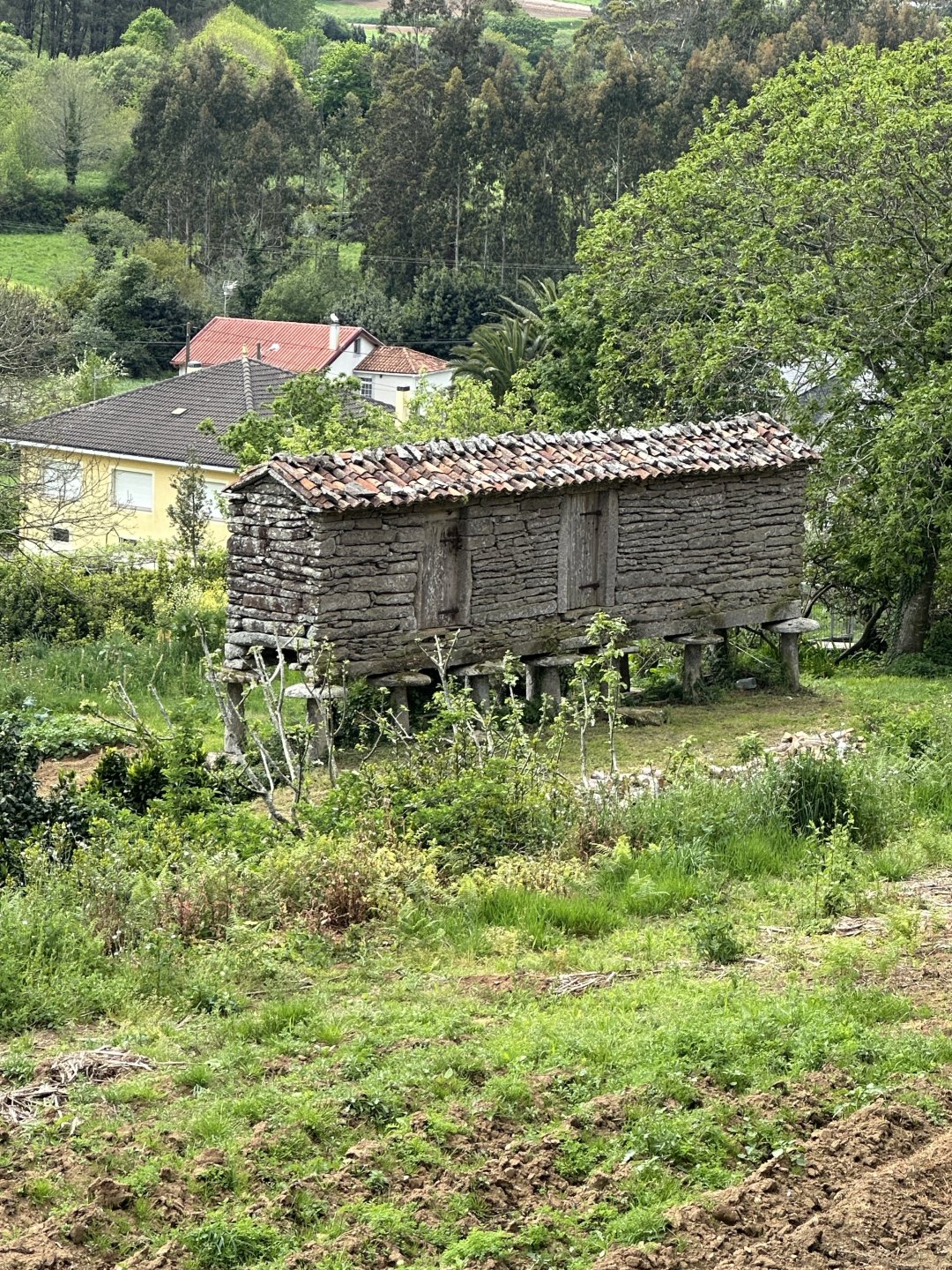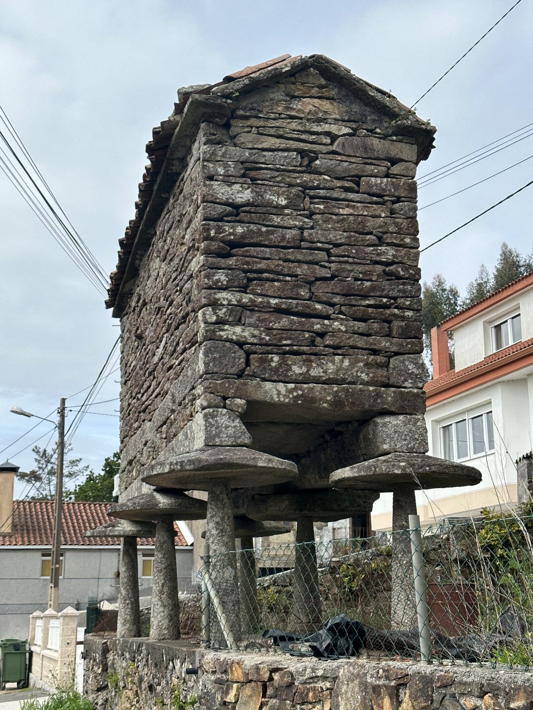 The ride to the next place somewhere between Santiago de Compostela and Fisterra wasn't as pleasant as the roads I'd ridden in the last few days. Traffic was pretty heavy and the scenery was more urban in nature. I only stopped briefly for coffee and doughnut and to check my phone. The room I'd found was only €40 for two nights! Cheapest stop of the whole trip. Downstairs there was a small supermarket with a bar- restaurant attached, and all run by the same family. The following day I'd planned to ride over to Fisterra to see the sea but it rained! I had a wander around the village or hamlet more like, and pent the rest of the time enjoying being cool, reading and dozing. My mate who has a house in Brittany contacted me and asked if I was popping over. This set me to thinking. I had no plan so rather than wander Europe aimlessly I decided to head up to his place. Stop for setting the Garmin Some photos of the village The bar Must have rained recently Trees breaking up the rocks Someone must have a wood burner There were several of these traditional grain stores about, some in use, and others seemed to be more of an ornamental thing. Horreo Local church and graveyard I've no idea what this is, but it looked interesting. Some sort of dead plant maybe. A modern take on the idea4 points