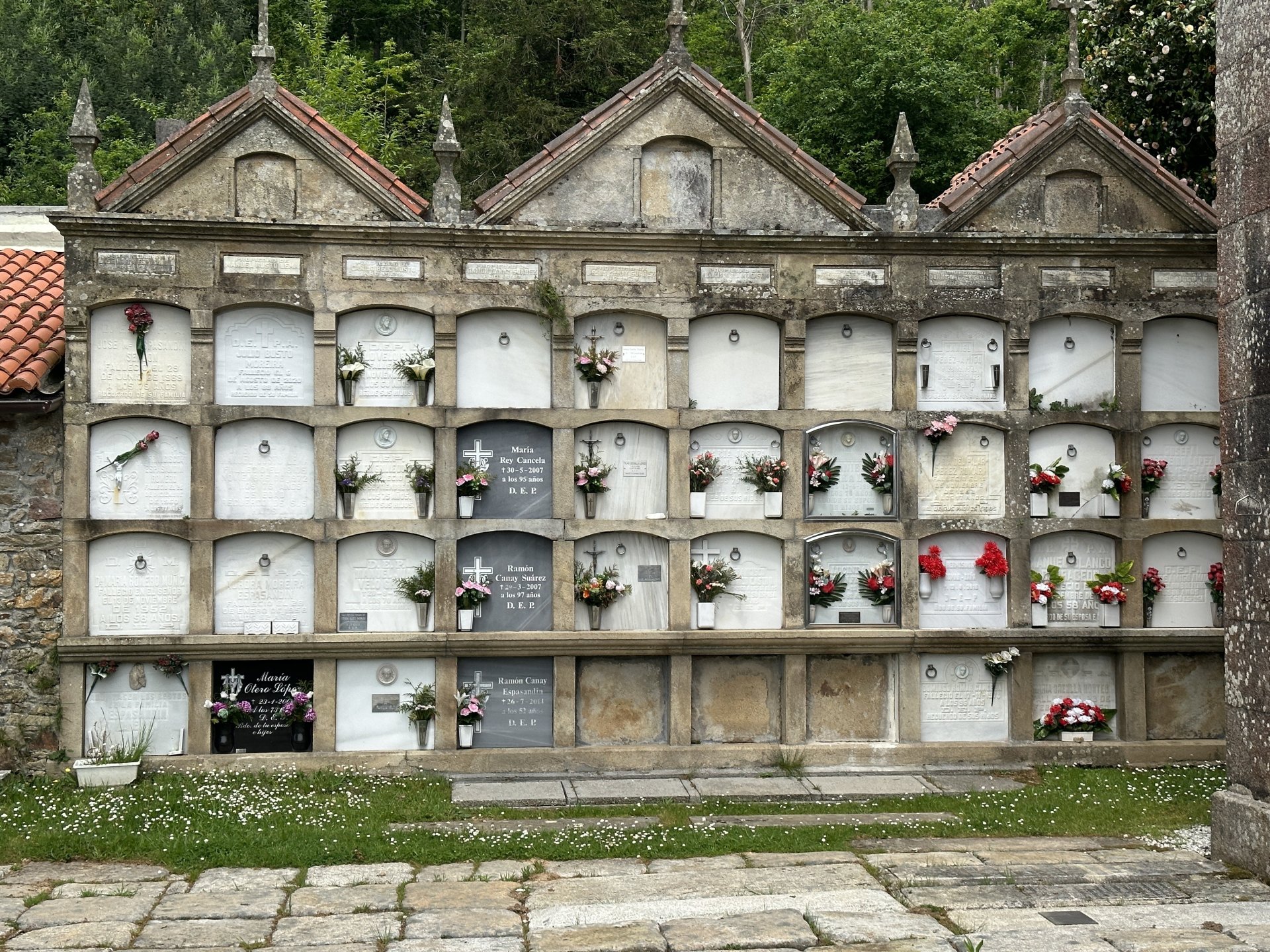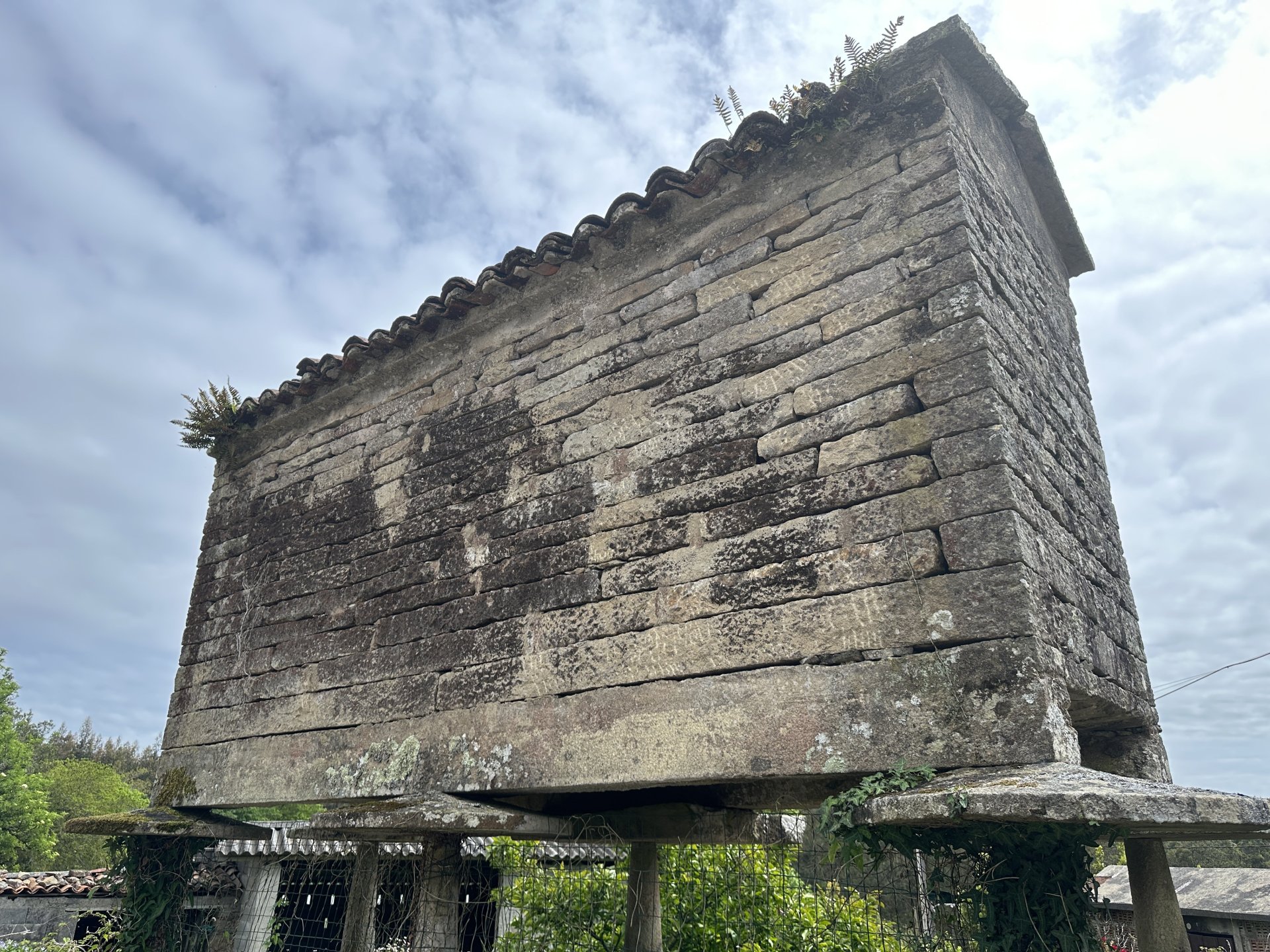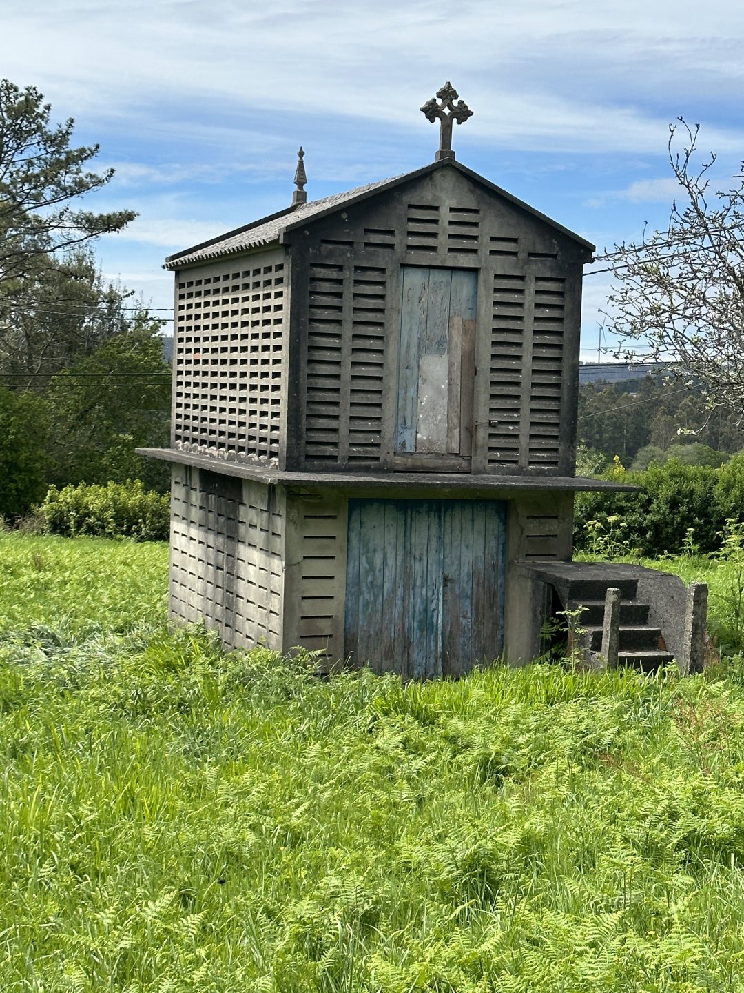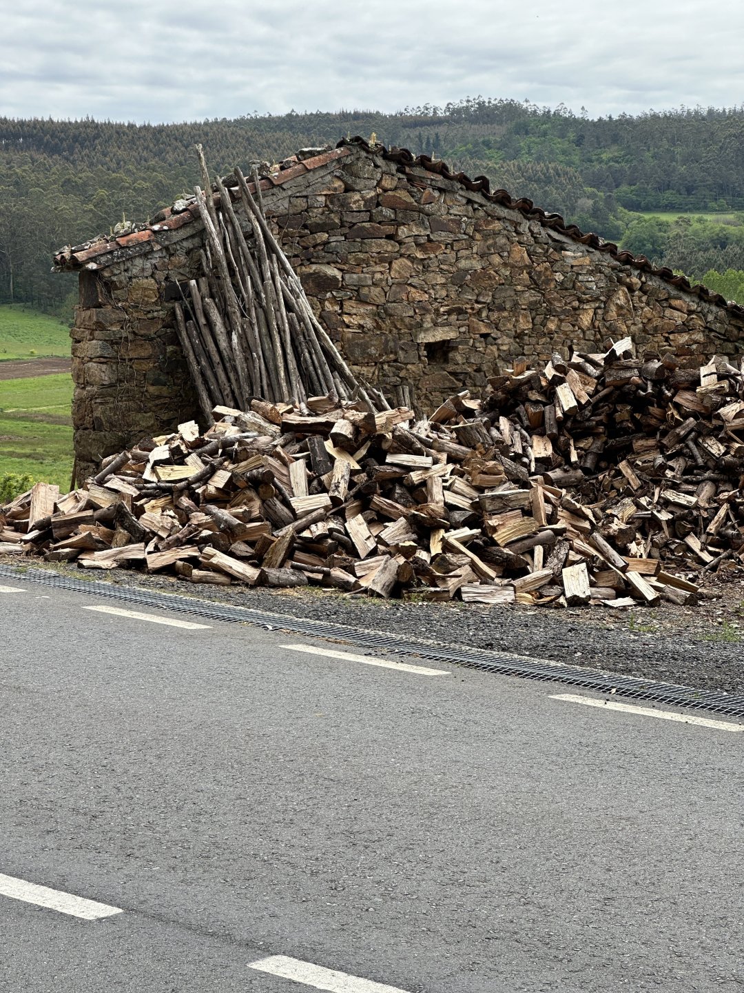 The ride to the next place somewhere between Santiago de Compostela and Fisterra wasn't as pleasant as the roads I'd ridden in the last few days. Traffic was pretty heavy and the scenery was more urban in nature. I only stopped briefly for coffee and doughnut and to check my phone. The room I'd found was only €40 for two nights! Cheapest stop of the whole trip. Downstairs there was a small supermarket with a bar- restaurant attached, and all run by the same family. The following day I'd planned to ride over to Fisterra to see the sea but it rained! I had a wander around the village or hamlet more like, and pent the rest of the time enjoying being cool, reading and dozing. My mate who has a house in Brittany contacted me and asked if I was popping over. This set me to thinking. I had no plan so rather than wander Europe aimlessly I decided to head up to his place. Stop for setting the Garmin Some photos of the village The bar Must have rained recently Trees breaking up the rocks Someone must have a wood burner There were several of these traditional grain stores about, some in use, and others seemed to be more of an ornamental thing. Horreo Local church and graveyard I've no idea what this is, but it looked interesting. Some sort of dead plant maybe. A modern take on the idea4 points
