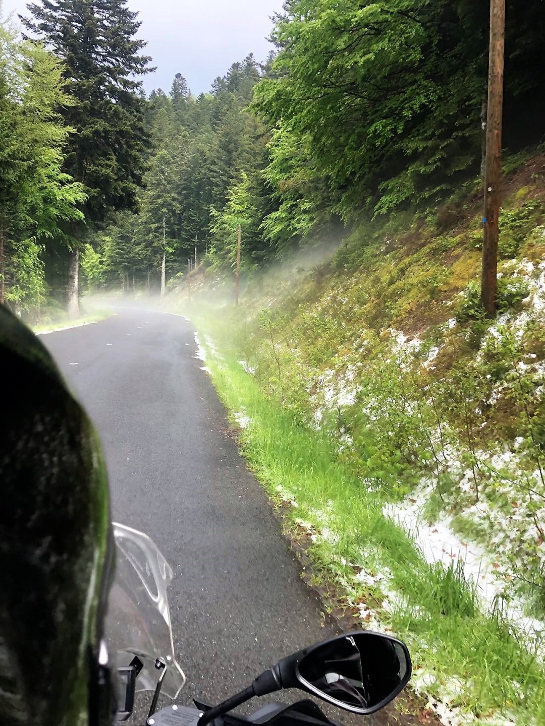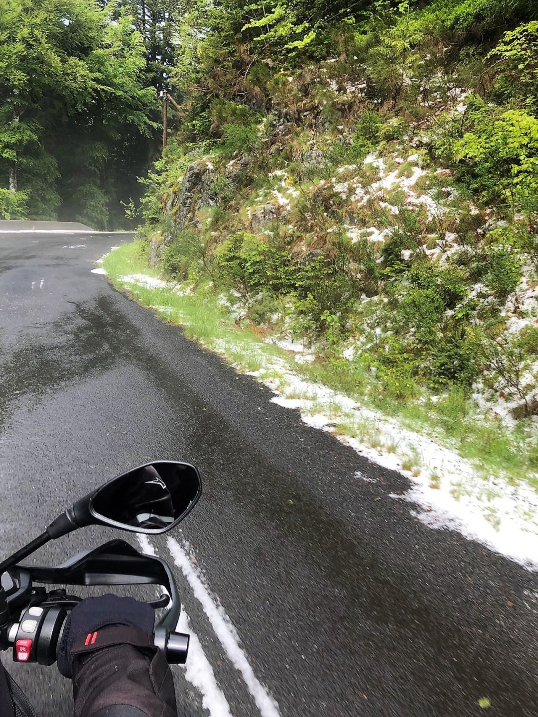 Sunday turned out glorious, 8 am breakfast scary picture. I wasn't navigating the rest of this so the route is a bit vague but something like this on sunday morning Lunch was at Les Vans " Pintade facon Tadjine et legumes de saison" followed by a proper "Créme Brulée" that hadn't been fucked about with by adding chutneyed marmalade of bean shoots or whatever the pansy fucking parisien parisites thnik is fashionable now... it was 31degC acording to the sign in the square and I could rally have done with a wee siesta, but there were many more hairpin bends and tight twisty valleys to do before the end of the day so we set off again for this bit the river to the east is the Rhone and top right is Valence, to give you an idea of where we were. there were still some nasty storm cells in the area but we managed to avoid most of them, running just under the trailing edge of one and the leading edge of another during the afternoon. We were Lucky because the storms were dropping hail and a couple of times, around a bend the temps would rop 20deg in 100m, you'd ride into a wall of fog lifting off a rapidly cooled road surface and see piles of hailstones along the roadside, suggesting a storm had gone through only a few minutes before us. One of the girls managed to get a couple of pics we got back to the hotel without problem and pretty much repeated the previous nights debauchery, starting with Pastis and finishing with Liqeur de Verveine... The hotel chef said he'd made a special effort for us and his "two wheeled trout" was excellent:4 points