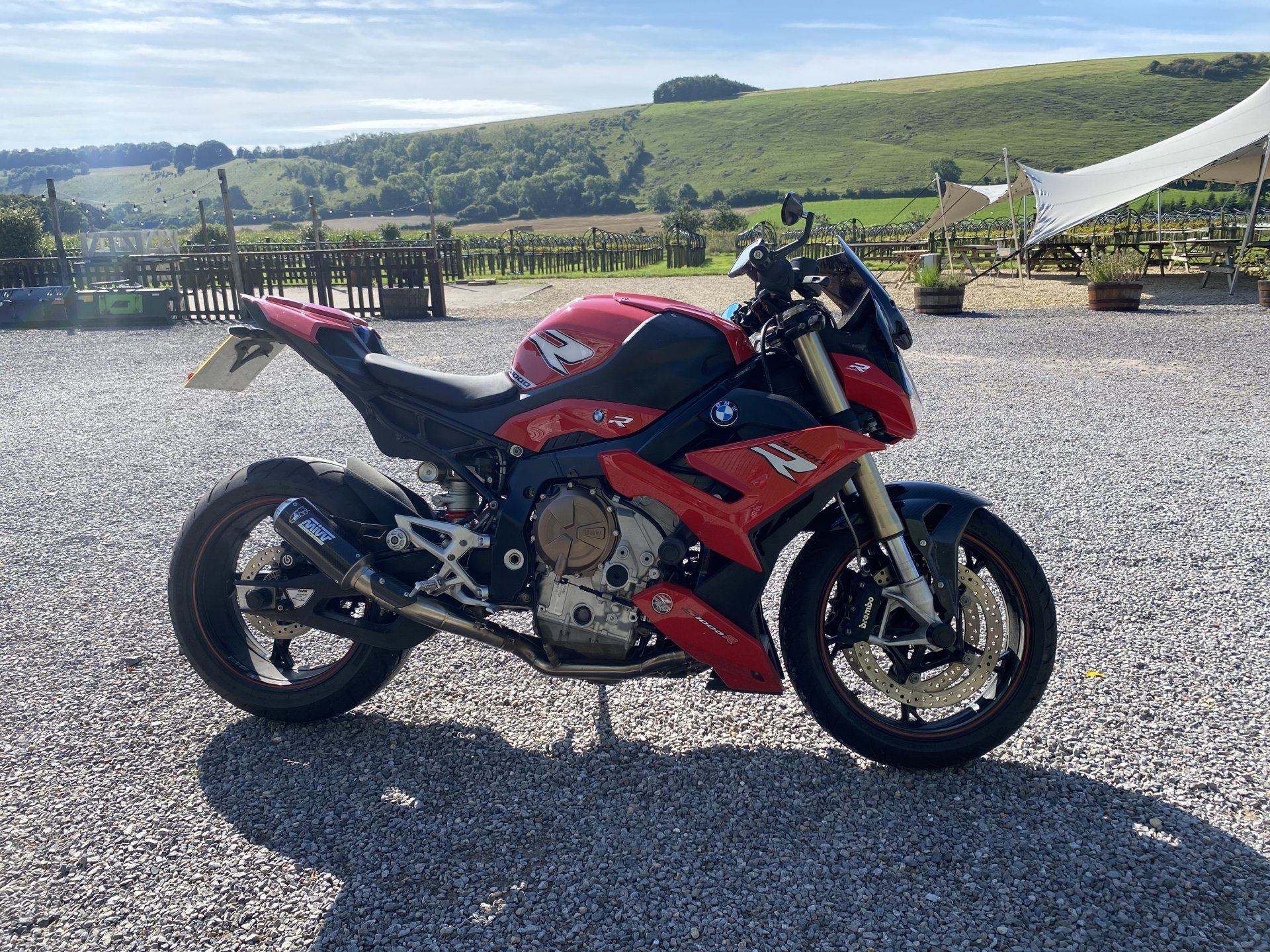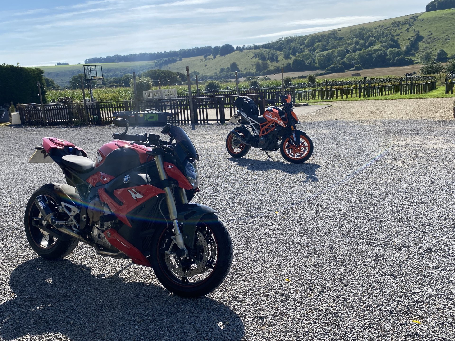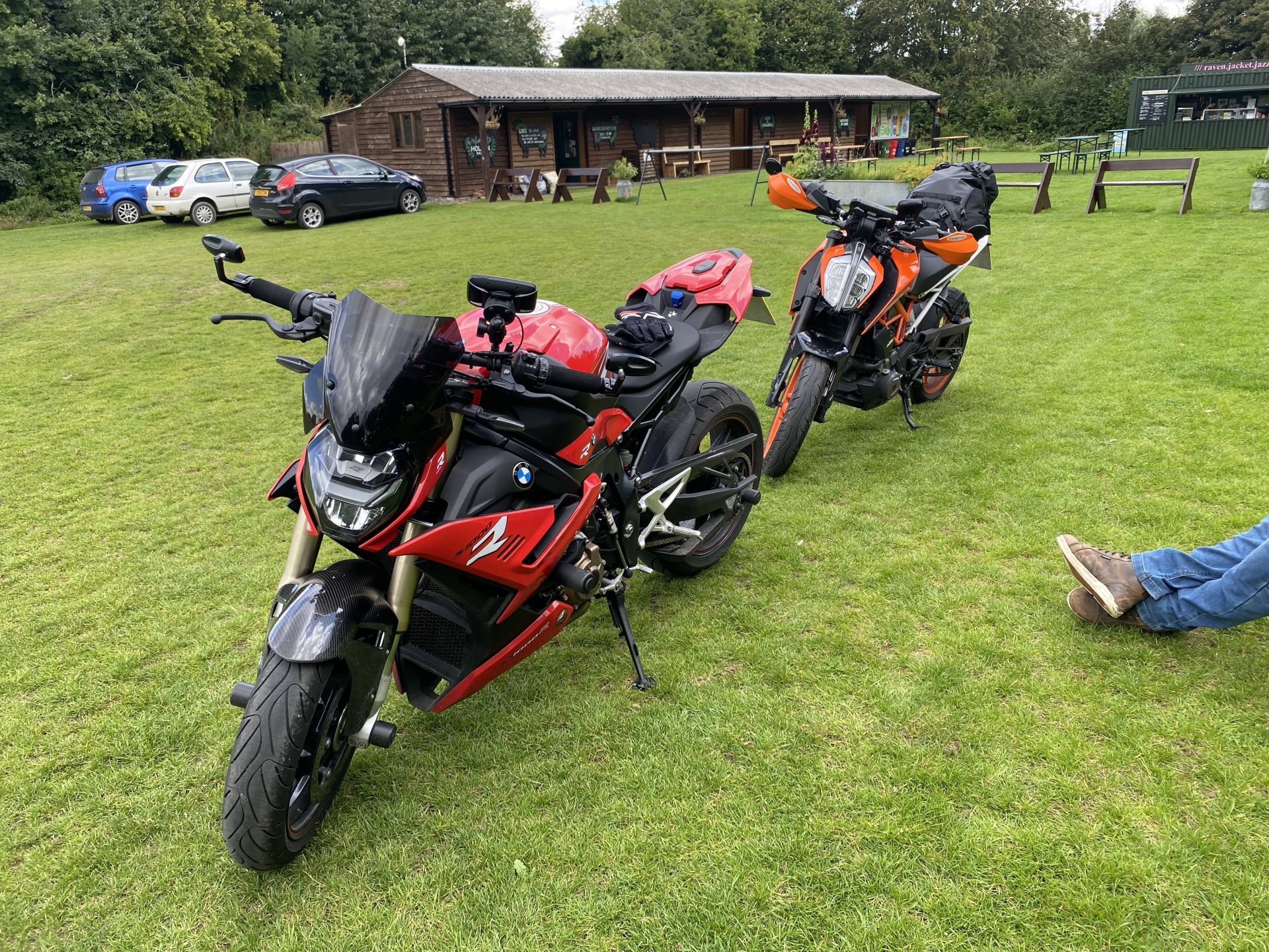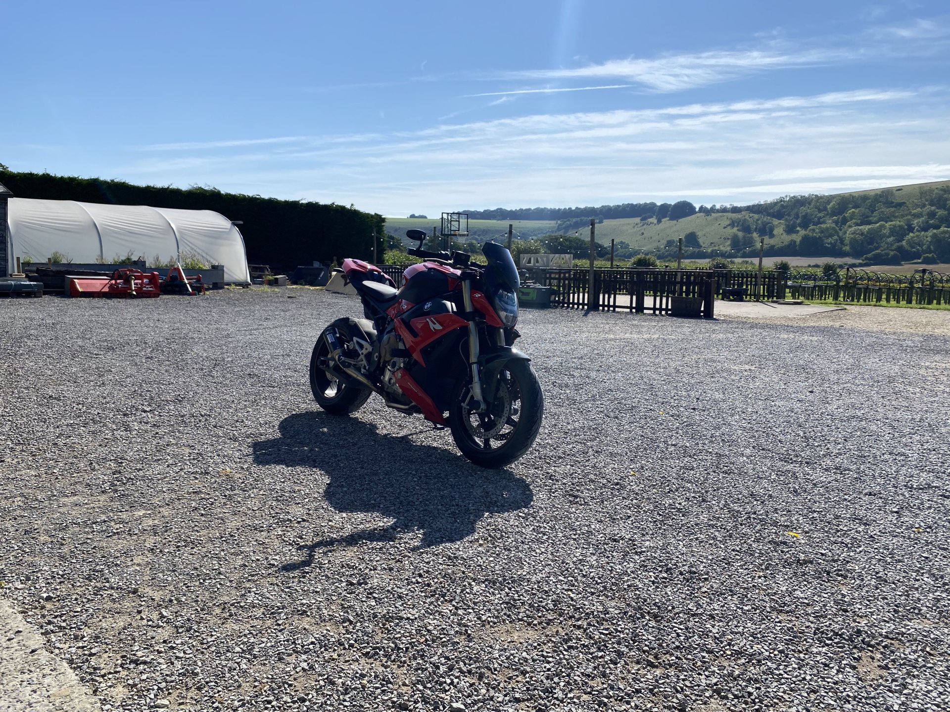 I was doing a double visit last weekend, Friday, Saturday at The Wiltshire Motorcycle Rally at Salisbury Rugby Club, followed by riding to north Devon on Sunday morning to visit my son and his family. I packed light (for me) and tried to cram everything into a top box, roll bag and tank bag. I was determined not to use panniers. I seem always hit super rush hour traffic whenever I have panniers and I was determined not to be stuck and unable to squeeze through gaps due to being wider than usual. I made the right decision. I left home and an hour later I arrived at my mate’s house to find that upon hearing that I was staying narrow, he was going to do the same so he could follow me through those same gaps in the traffic. He was right to copy me! We set off, first thing we crossed the Thames on the Dartford bridge straight into our first queue. The bridge has a 50mph average speed camera zone on it. As we were filtering between very slow moving lorries, 50 was not an option anyway, so not having to try and maintain a slower speed than you want to travel. The motorway opened up and after about a mile we hit the first 70mph section and it had just normal traffic in it. It was a warm day so this at least meant we could cool off a bit now. Anyone who uses the M25 will know it is filled with speed cameras on the overhead gantries and the ones that don’t still have the road markings as if they have to fool people into sticking to the limit. Very soon we saw a reduction on the overhead limits, a sign that there is a queue ahead and sure enough we were back to squeezing between vehicles for mile after mile. I made use of personality, hooter and headlights and most drivers moved over when they saw us coming through. When we finally got off the motorway we hit some beautiful and deserted country roads. I had only had my breakfast so far and I wanted to get some food in me before we pitched tents at the rally. I’d had a look before leaving and knew there were a few roadside cafes on the A30 near the rally site and we pulled into one. My mate ordered a bacon, egg and black pudding baguette, no style or finesse. His arrived instantly, my all day breakfast took ages, I suppose the clue was in the name. A man, who may or may not have been the cook stood telling us that Wednesdays was bike night. He said this while standing next to the sign that said the very same thing, so he was probably right. The site was in a rugby club field within walking distance of Old Sarum, the iron age hillfort that went on to become a Roman camp, a castle, a town complete with cathedral and finally deserted when everyone pissed off and built Salisbury instead. Some sort of argument with the castle guards I read somewhere. I said to my mate that when he saw a green volcano in the distance we would almost be there. The site is right on the edge of Salisbury, housing estate on one side, countryside on the other. We gained entry after me not finding the entrance gate first go and riding round the block. This was because they didn’t have a gate, just a section of fence they removed when they noticed you pull up. I just said our name and numbers, no paper tickets, a large man put a lime green paper wrist band on us both. One each I mean, not the same one like Sidney Poitier and Tony Curtiss in The Defiant Ones. We then had to ride through the stalls around to the other side of the marquee where another large man was waiting, camping was where they told you, no free-for-all as they were worried about how much room they had. I pulled up next to the man and I swear he pointed at the lines of tents and asked if I could see the bike. I replied, with, ‘What, the bike next to that other bike by the bikes?’. This went right over his head, so I asked which one and he named a colour this time which narrowed it down to 3 or 4. We parked up and I started putting my tent up, slowed by the fact my mate pinched my mallet when I wasn’t looking and used it himself for his own tent. I noticed that we seemed to be the only people in the whole place not wearing a leather waist coat covered in top and bottom rockers, must be a local fashion in Wiltshire. My mate's latest main bike, some sort of Triumph. We headed over to the rugby club and got some drinks, I was melting from trying to push pegs into tock hard ground with my bare hands and needed the fluid. My Guinness looked a bit off, but perhaps they use different water here. They had those special glasses that flex when you are carrying them. I don’t think I got back to my table with full drinks once over the weekend. Then we heard the first bit of music, so headed over to the marquee, we got the table right at the front. Everyone else seemed to have to sit together based on club membership and bicep size. I have to say there wasn’t one bad band, they were all cracking. I did worry about all the houses surrounding us, but not to worry, all music stopped at 10pm which was weird but understandable. I had a wander off between drinks into the car park to look at Old Sarum as the sun was going down. I decided I was going to walk up to it in the morning and have a wander around. The next morning I was awoken about 6:30am by the firing up of an open Harley pipe a few inches from one of my ears. Fuck it I thought, I didn’t want a lie in anyway. I got up and walked to the coffee stall and bought a cup of coffee and chatted to the stall owner. I asked if he was local and was he there when the Russians left the nerve agent lying about (Novichok). He said he had been, they had all had to be lined up and be tested by men in hazmat suits and then wash all clothes and bedding a few times before they got the all clear. I wasn’t worried about any left over nerve agent though, my pants would protect me! I drained my coffee add walked up to the ‘non-gate’. Someone on the front tent shouted at me to just lift it out of the base and put it back afterwards. I walked up the road towards Old Sarum