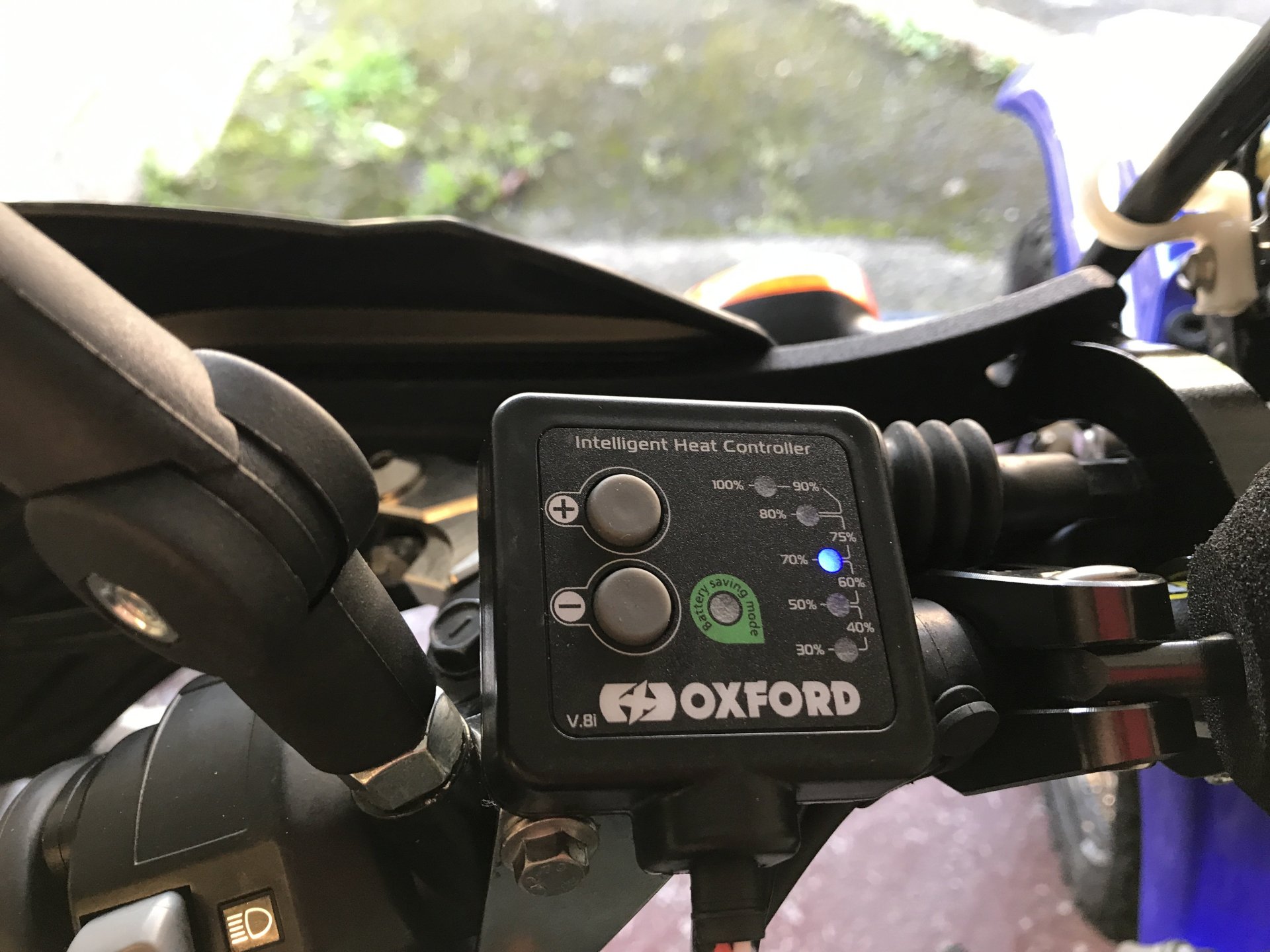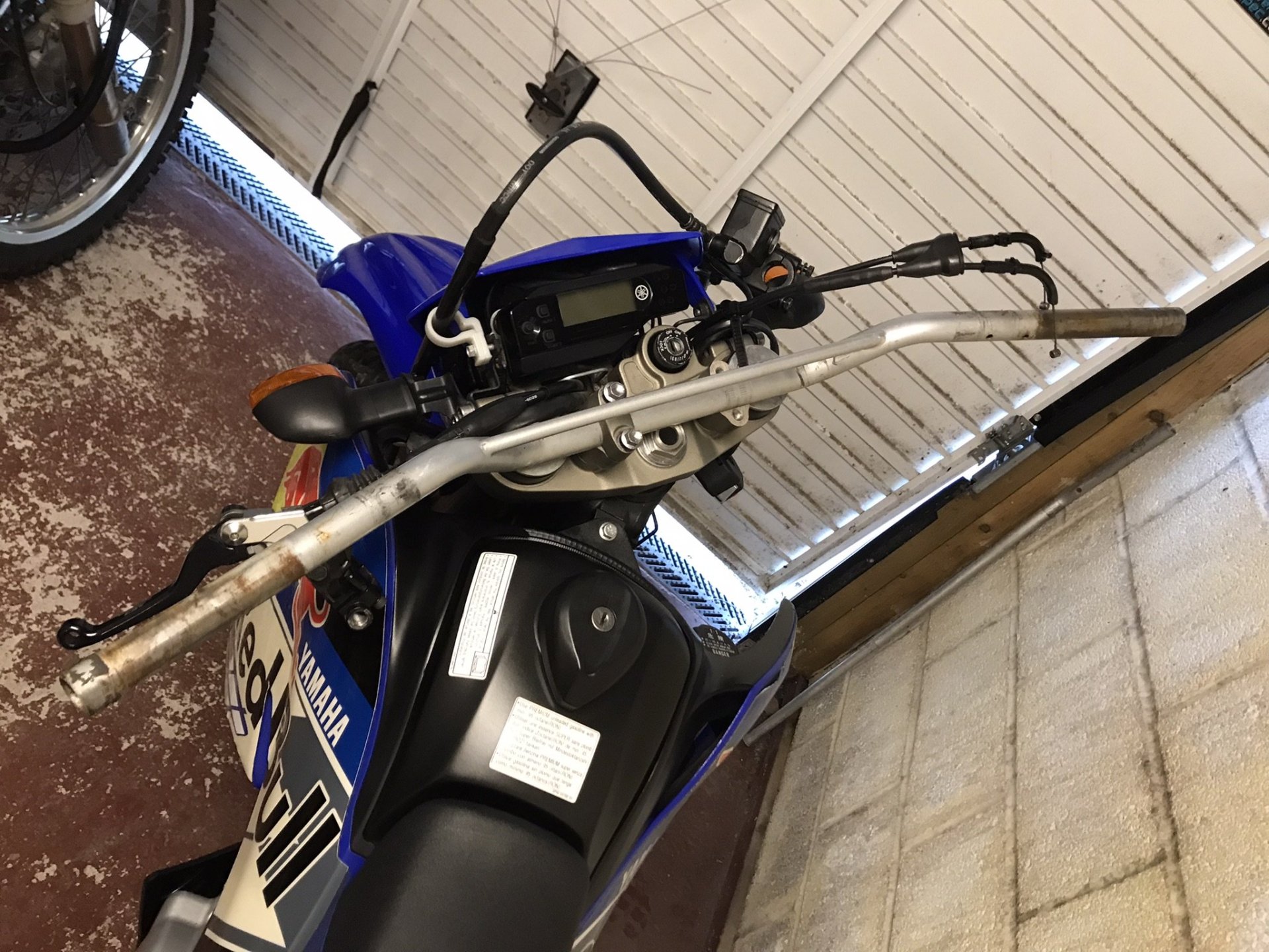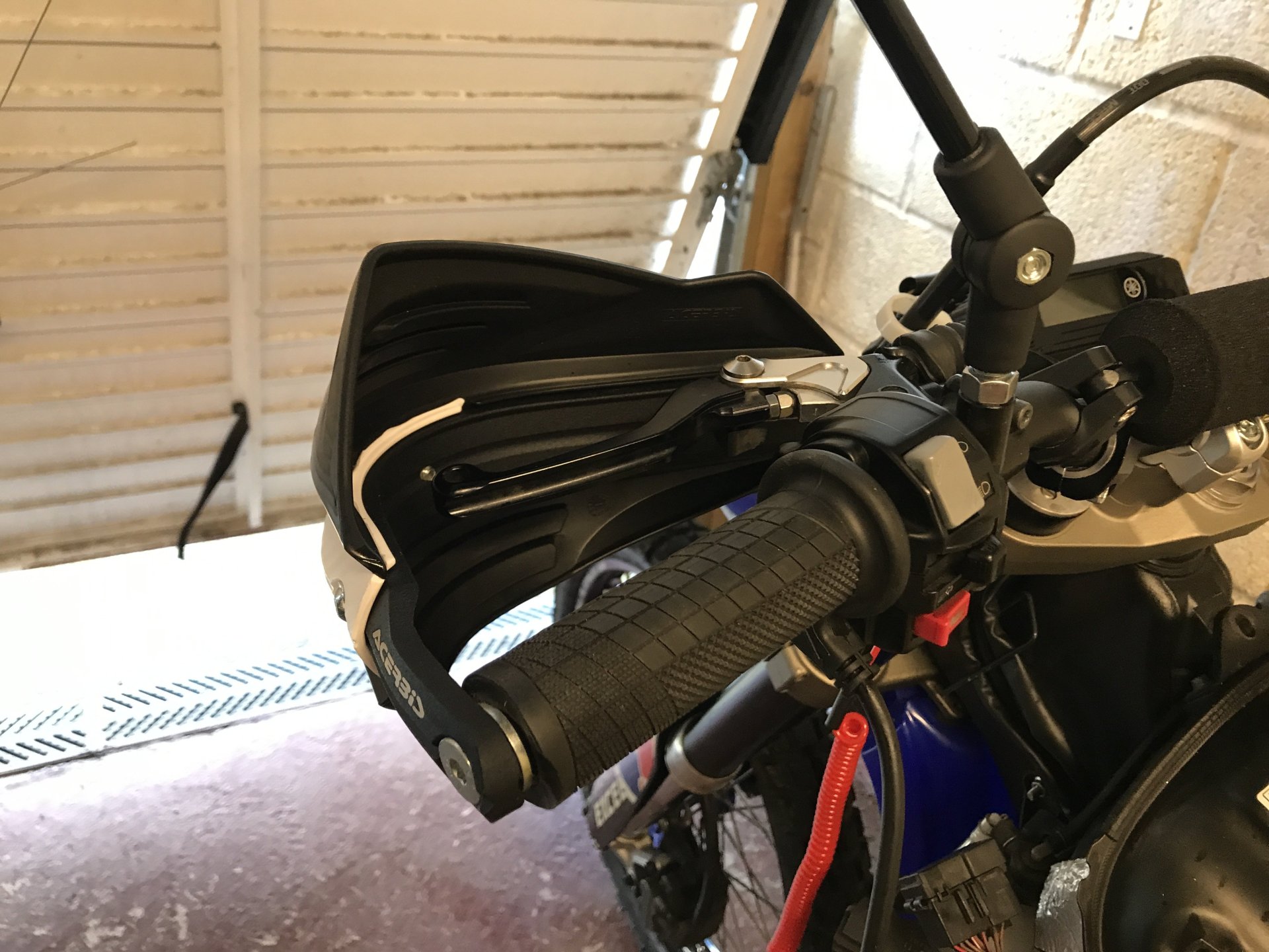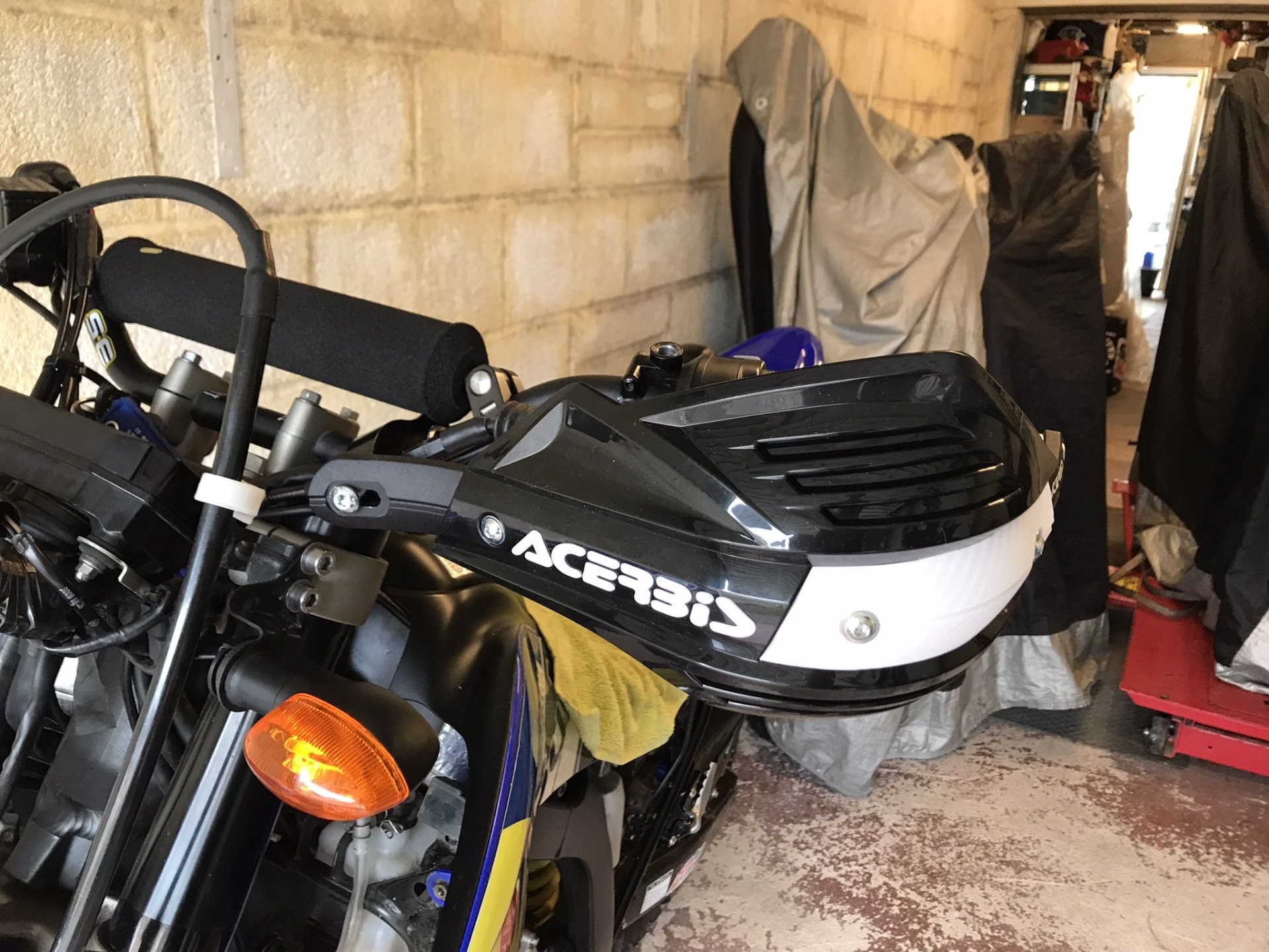 So about a month ago I came across this bike for sale, I'll admit that this model was not on my radar at all but after going to have a look at it I bought it there and then. No matter how good a secondhand bike is there are usually some things you need to address , whether that be personal preference or something not working quite right. I have bought this bike primarily for trail riding , it probably won't be a dual purpose bike like my CRF250 Rally was as the Donkey can fulfill that role. So with that in mind there were some things it needed to be right for me. First and foremost was a change of handlebars as the O/E bars were too narrow and not high enough so a Pro-Taper CR High was ordered along with some SW Motech 20mm risers and Acerbis X-Factor hand guards...... The O/E bars were stripped of their belongings ................... and the new items fitted. It all went together without too much fuss...................... and then some Oxford Advanced heated grips were fitted...............3 points