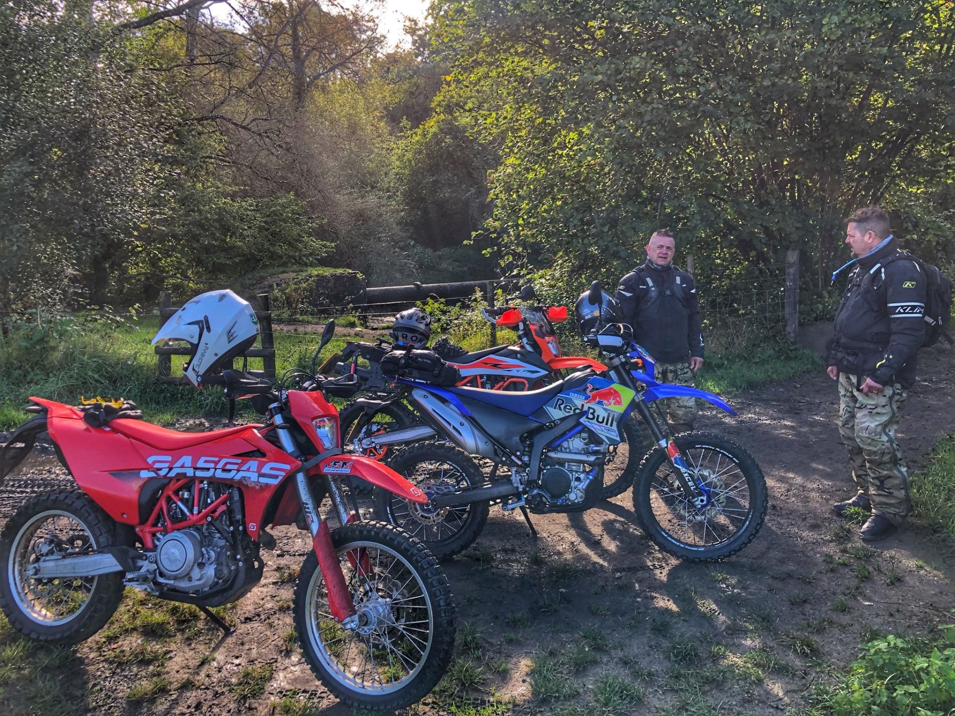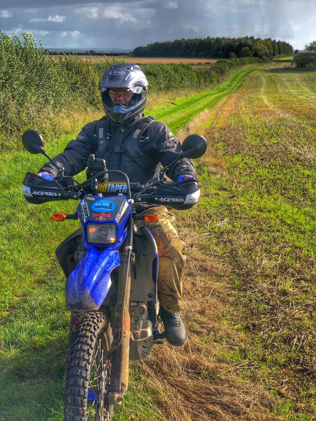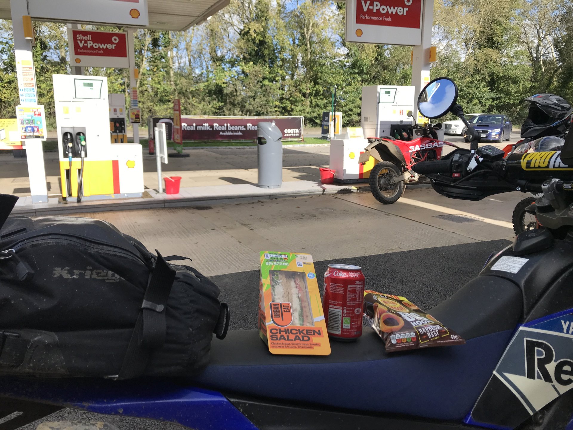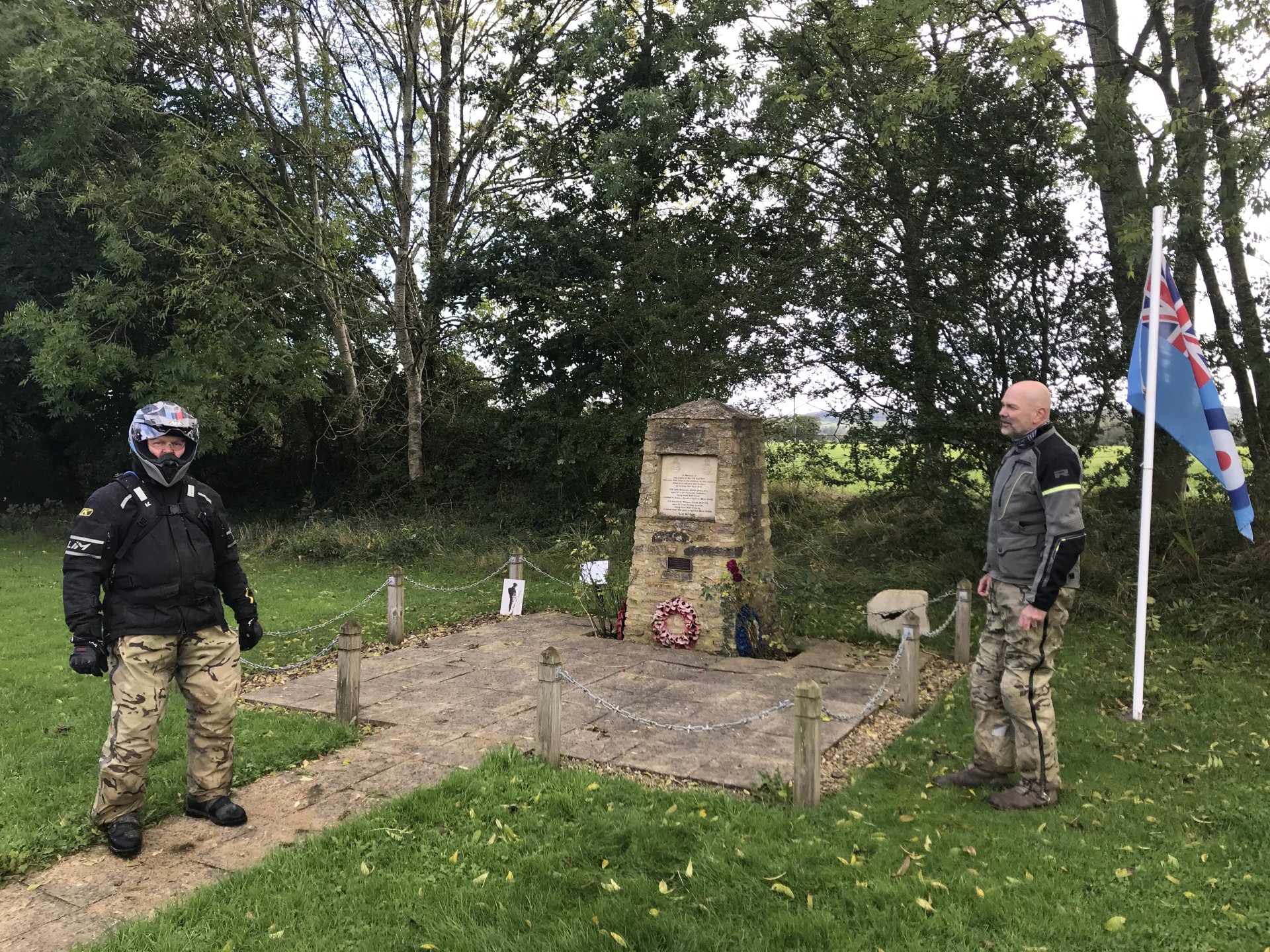 So today was the day to get the little Yamaha out on the lanes so I planned a route for me and my mate Gaz (who lives in Redditch) to meet near Cirencester and do a loop of about 80 miles . The then anti was upped as Big Tone decided to join us on his brand new Gas Gas 700ES. I set off about 08.30 and made my way up to Badminton via the A46 and then some back roads.............. We were meeting at the AV8 cafe at Kemble airfield, it was definitely open this time as @Sir Fallsalot wasn't coming ............ and after a coffee and a sausage baguette we were off. We rode down the Fosseway and Gaz braved the ford while we watched .......... and on we went down as far south as Castle Coombe race circuit where we than turned east but with a stop for coffee from our flasks ........... Once we got to Startley we stopped pay our respects at the RAF memorial .............. Onwards through more lanes coverd in shit and puddles until we got to Fairford. We stopped in athe fuel station there for a lunch a la @Earache (where the hell is he ?) ............ After lunch we went North but Gaz got a puncture on the first lane of the afternoon................... Once it was sorted we carried on but spent most of the afternoon dodging showers . There were still some nice lanes though despite the soggy conditions.............. Once we got to the A429 Gaz headed off north to get back home while me and Tone dodged showers going south. The little Yamaha peformed faultlessly, I'm very happy with it. I just need to see if there is any adjustment on the rear shock but everything else was fine5 points