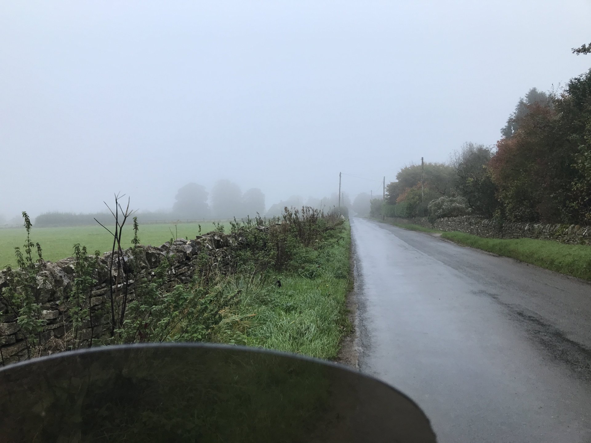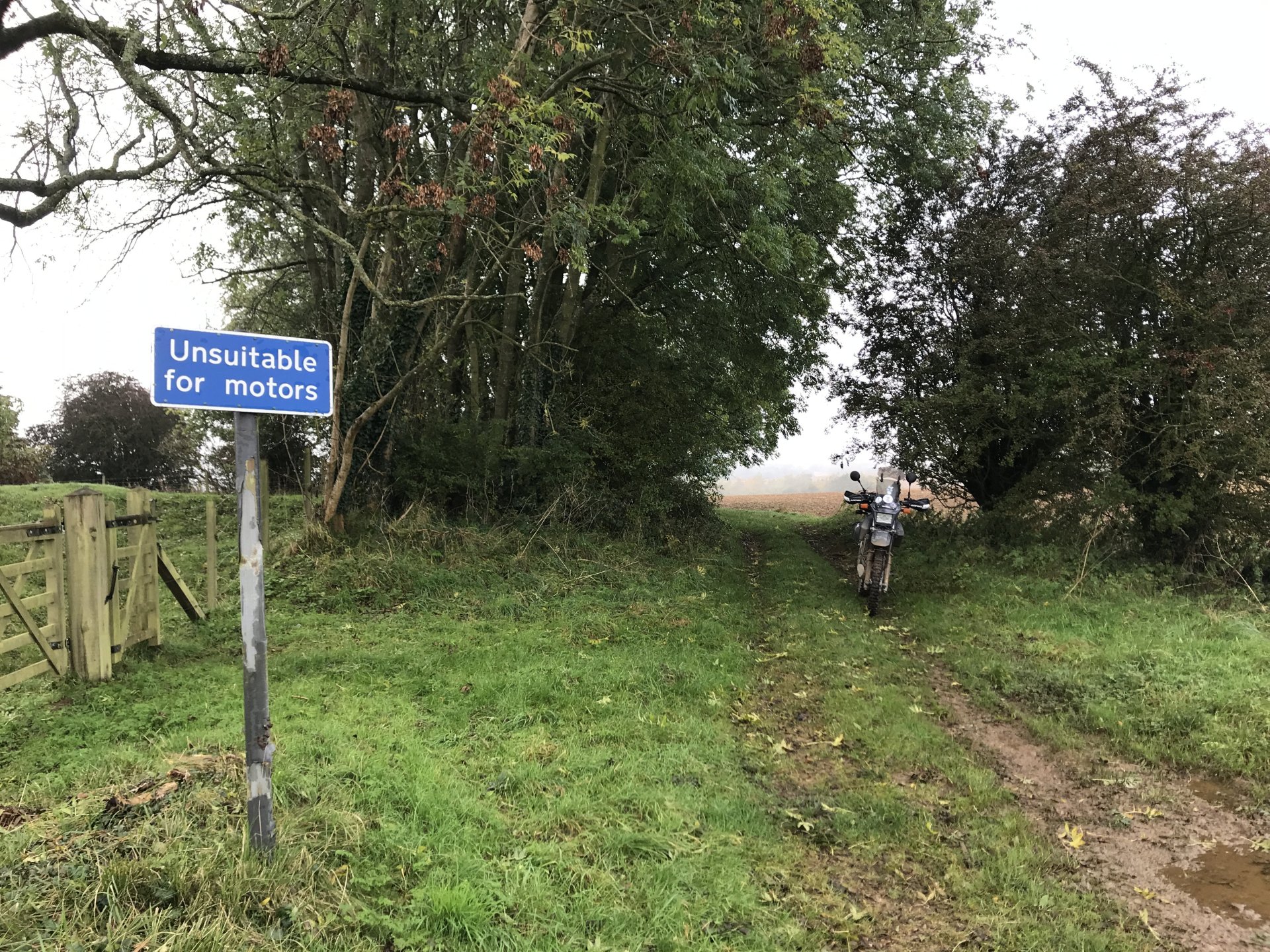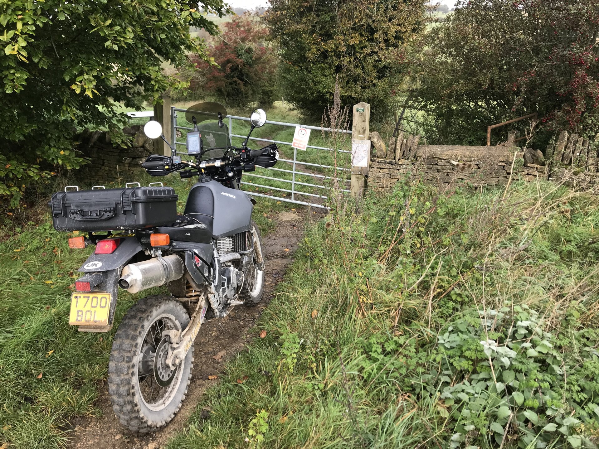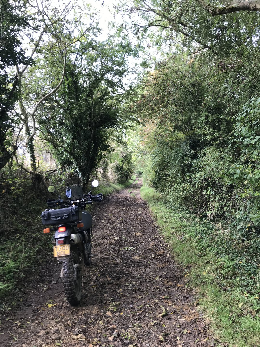 So having seen the sad passing of James Higgs I thought I'd look at his you tube channel and see where his last videos were. He had put up a video of a lane at Naunton on the Cotswolds so today I decided to go and ride it and a few others in his memory. The weather was decent when I left Bristol at 9.00 but by time I got onto the Cotswolds it was quite foggy.......... By time I got up to the old WW2 airfield near Chedworth I was dying for a piss so into the woods I went, while I was there I stumbled upon an old building . @XTreme would have been proud of me but there were no dead dogs inside so I left a bit sharpish ........... I got down to Compton Abdale and there was evidence of how wet it has been ............... I rode through Salperton and onto the first lane which ends at the Notgrove long barrow .................. There was evidence of me bashing through the undergrowth on my top box.............4 points