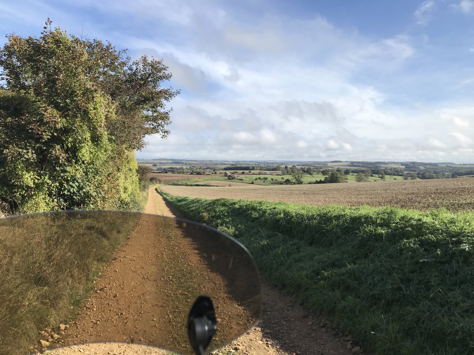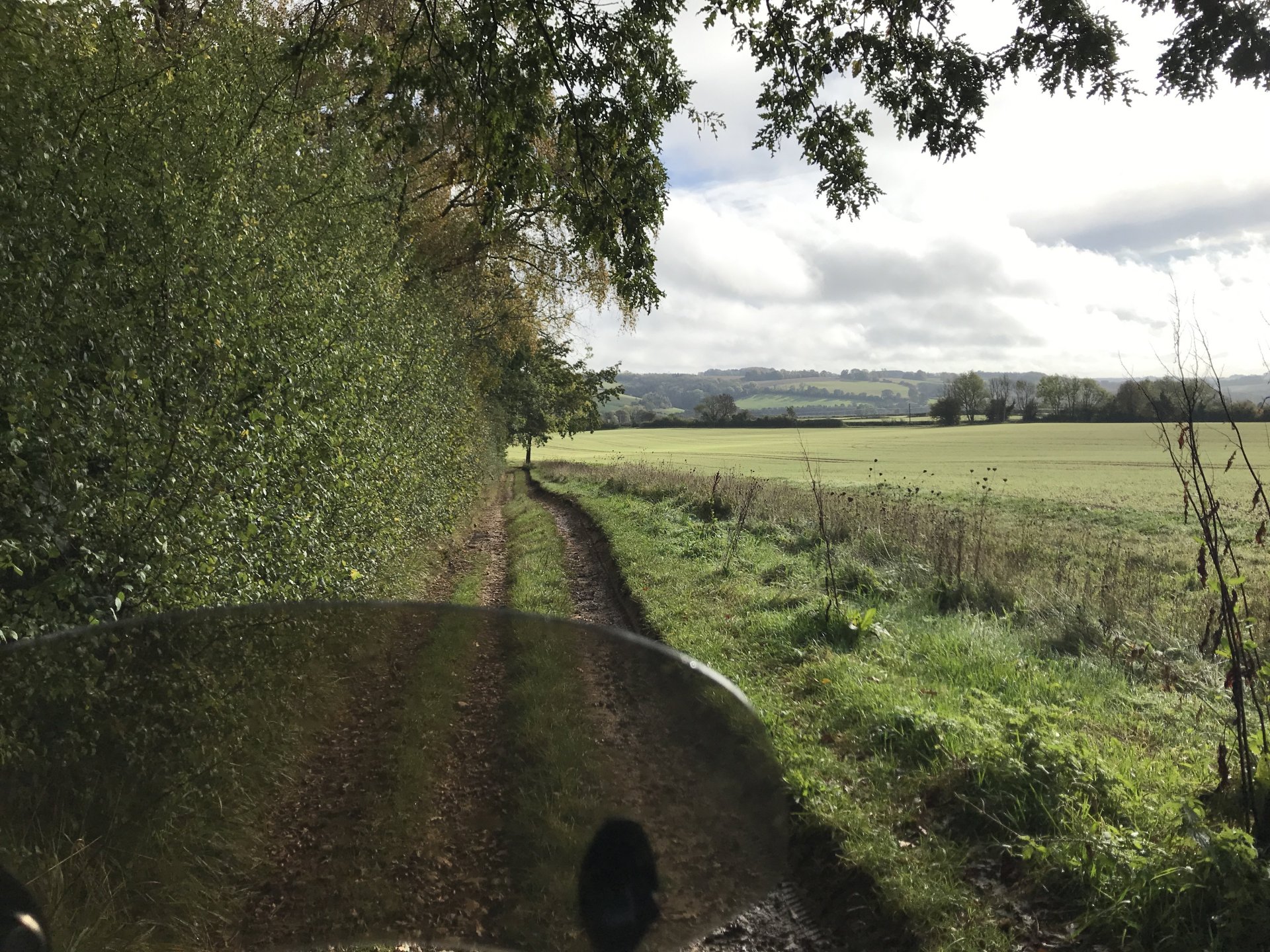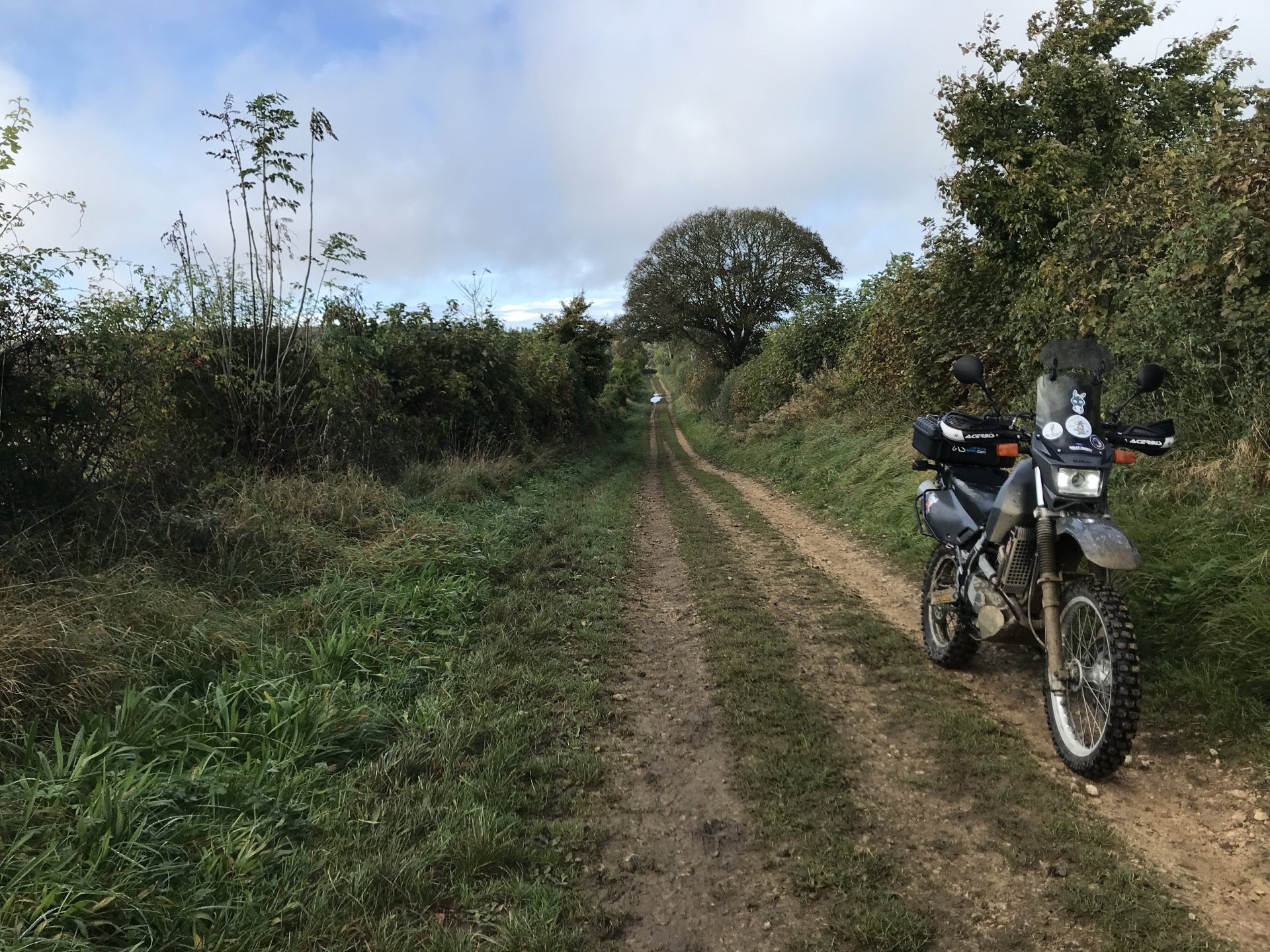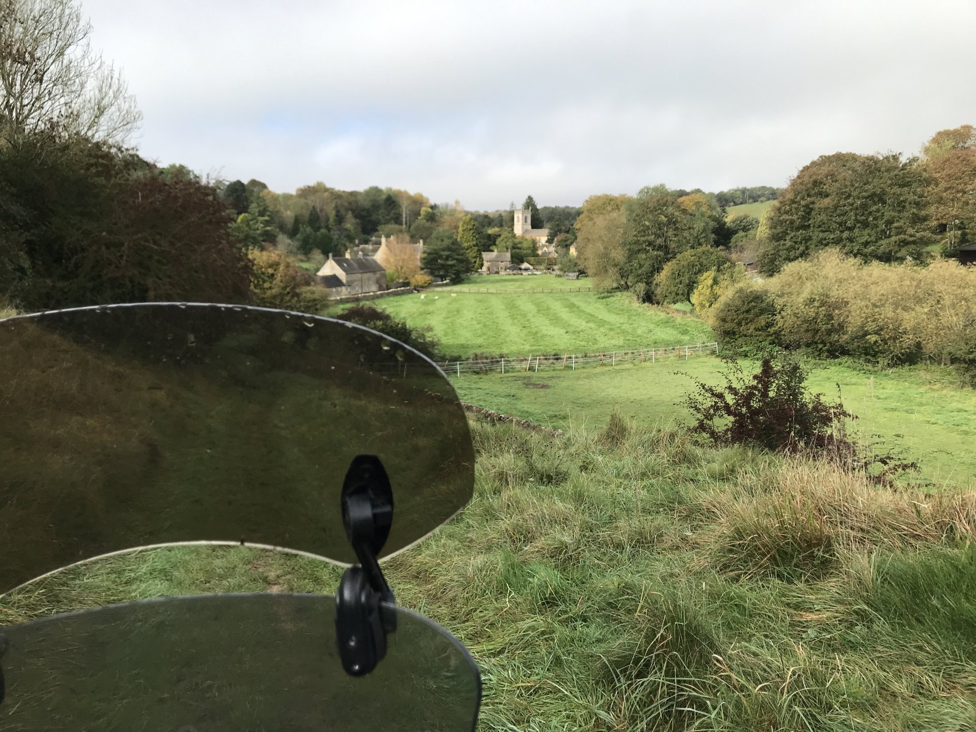 So having seen the sad passing of James Higgs I thought I'd look at his you tube channel and see where his last videos were. He had put up a video of a lane at Naunton on the Cotswolds so today I decided to go and ride it and a few others in his memory. The weather was decent when I left Bristol at 9.00 but by time I got onto the Cotswolds it was quite foggy.......... By time I got up to the old WW2 airfield near Chedworth I was dying for a piss so into the woods I went, while I was there I stumbled upon an old building . @XTreme would have been proud of me but there were no dead dogs inside so I left a bit sharpish ........... I got down to Compton Abdale and there was evidence of how wet it has been ............... I rode through Salperton and onto the first lane which ends at the Notgrove long barrow .................. There was evidence of me bashing through the undergrowth on my top box.............4 points
