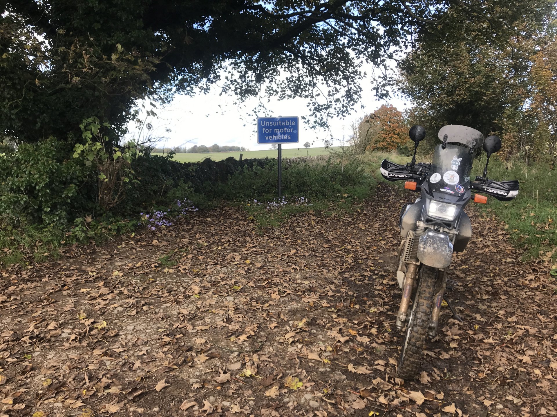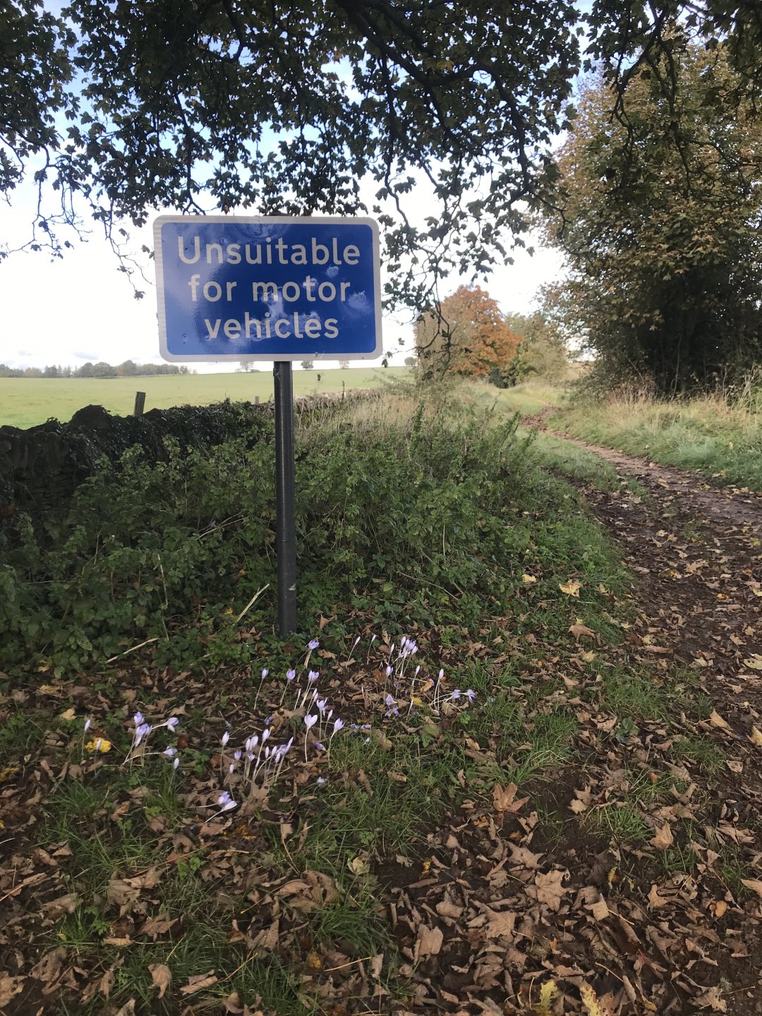 After a swift coffee from my flask I rode down to Naunton to ride the lane that James had ridden three months ago ........... Then i rode some more lanes in the area.............. and then onto the fords at Kineton. The concrete exit ramp nearly caught me out here as it was very square-edged and caused me to stall on the exit but luckily i started quickly and got away without dropping the bike ........... and then I rode some more lanes before turning south ............. This one was annoying as it had SIX gates along it, a pain in the arse when you're on your own ................ At the end of Ryknild street I came across this , what's going on when Crocuses are growing in October ? and then I rode some proper green lanes to get back to the Fosseway north of Cirencester............. I also found a new (to me) lane on the way back ............. and then stopped at my cross to get a photo ............ and then the rest of the way back was spent dodging showers...............5 points