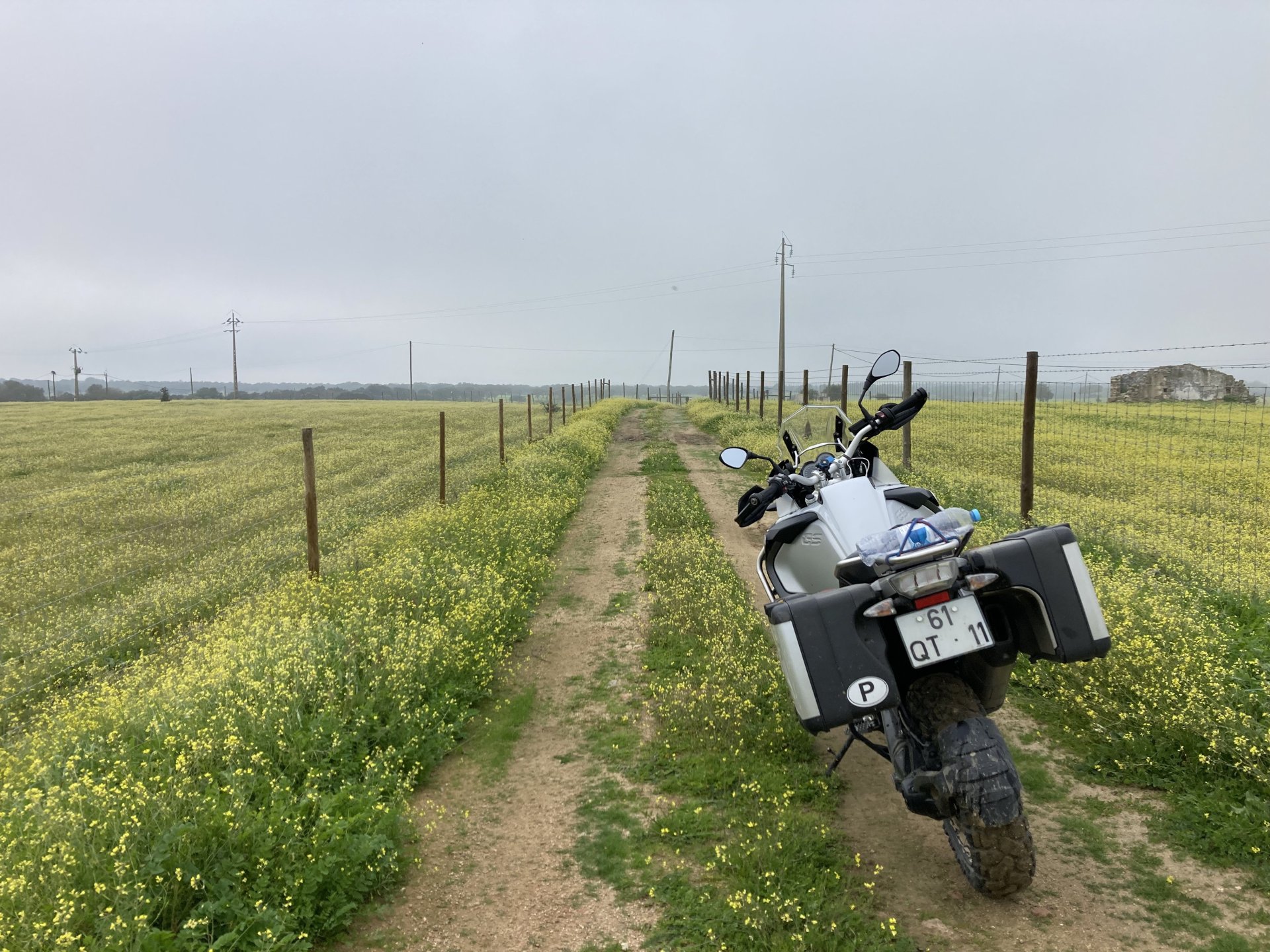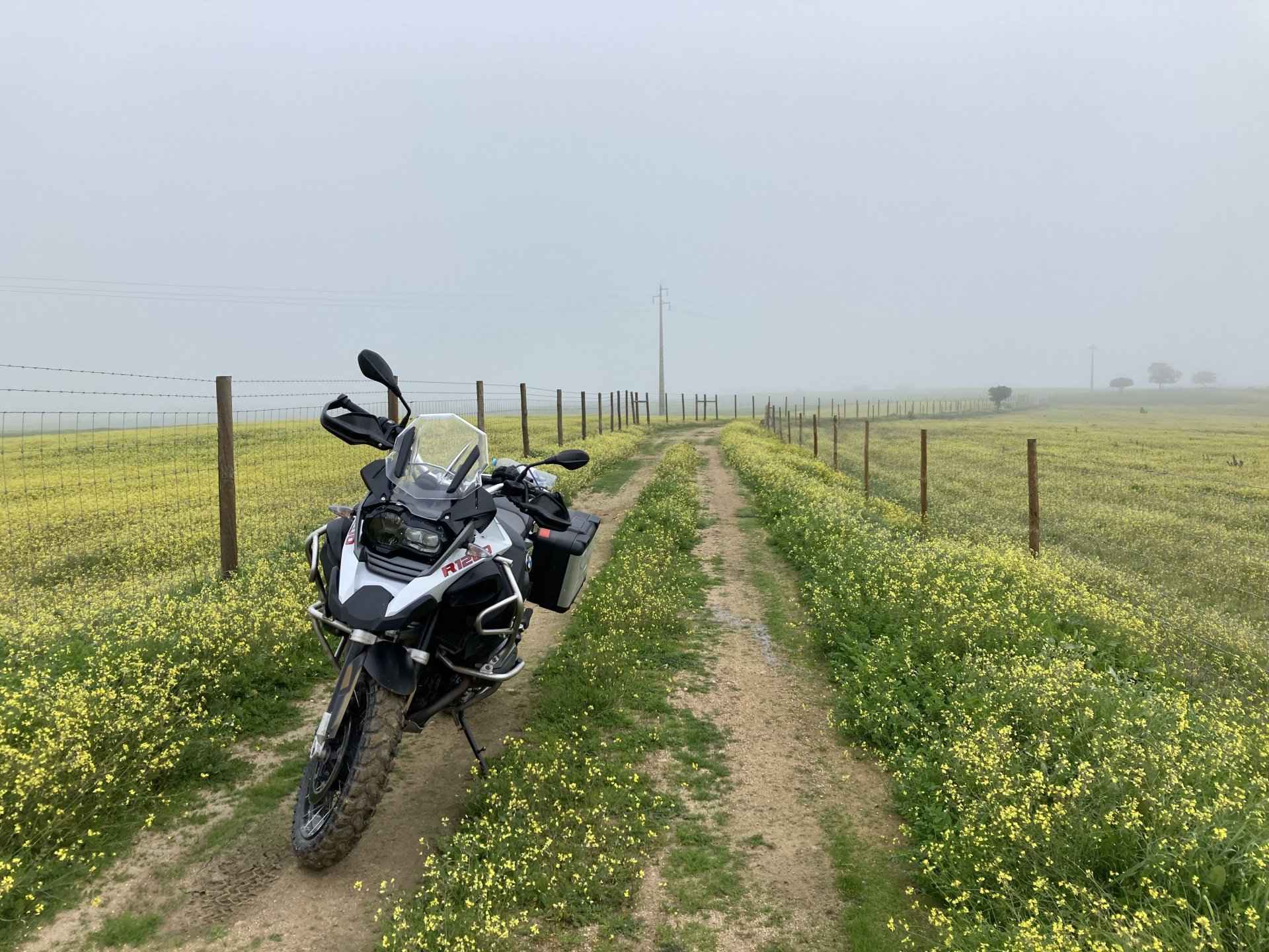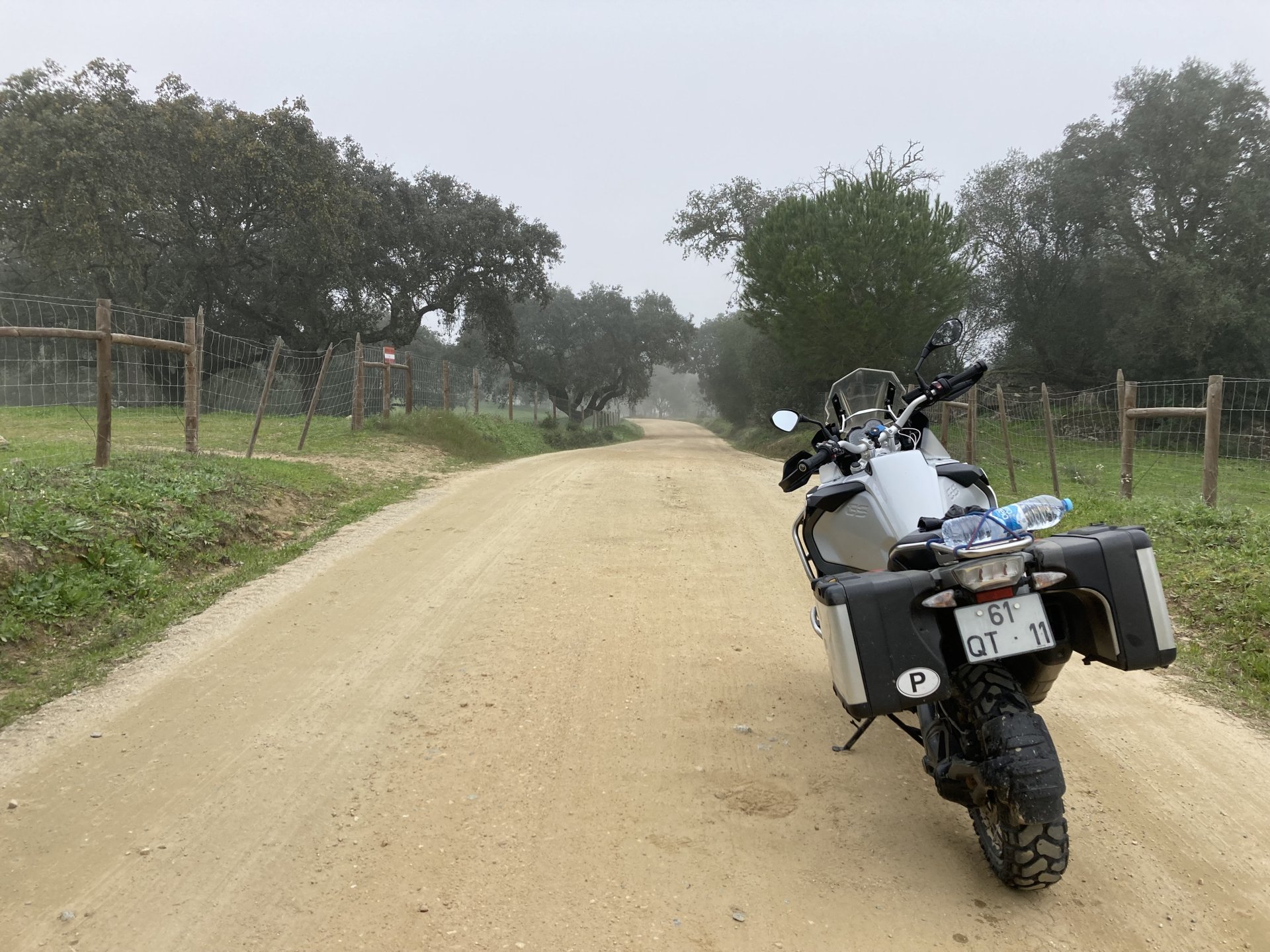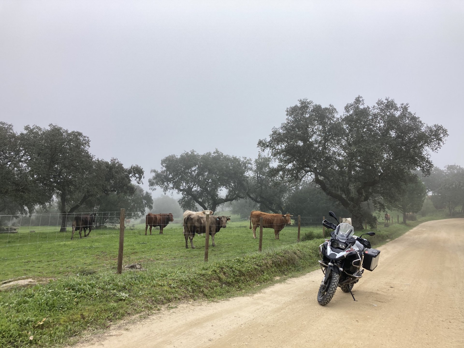 Woke today to another very wet foggy morning, riding out of the hotel the fog was too thick to see much of anything so I went up to the castle doors to see if there was a nice view, and indeed there was, quite the view: On the picture above, if you look to the two dots in the sky over the bike's rear luggage rack, and zoom in, you'll see two hot air balloons. Can only imagine they would have to wait for the fog to dissipate before landing, but there must have been quite the view from up there. The fog wasn't going nowhere, so I rode off heading back home. Stopped for an espresso in Estremoz, about an hour later, and enjoyed a little bit of sunshine to warm up, but as soon as I got back on the road it got cold again, beats rain though. Took a little detour through a few kms of dirt road, to see a very moody Alentejo: Bit farther on, did a wrong turn and ended up on a slightly more muddy path that turned out to be a dead end, so stopped for a another look around. The bike threw up a little mud on that trail, but most of it was cleared from a shallow water crossing, by 13:00 I was back on the road, hungry and cold so did another little detour and stopped at a very VERY old school cafe / grocery store / bar, and had a snack. There's four little dogs working there, they are always up for a snack too and they could sniff something delicious I was seduced and they ended up having some of my sandwich filling Almost back home, waiting for the green light to cross the old bridge: And that's it, the bike is filthy and looking very epic, I'm not going to wash it today, and maybe not until tuesday or wednesday, but it's dry and garaged. This wasn't the trip I was looking for, but ended up appreciating a little spot of Portugal I might return more often to, can't go wrong with riding nice dirt roads, cool views, quiet nights, and good food and wine.2 points