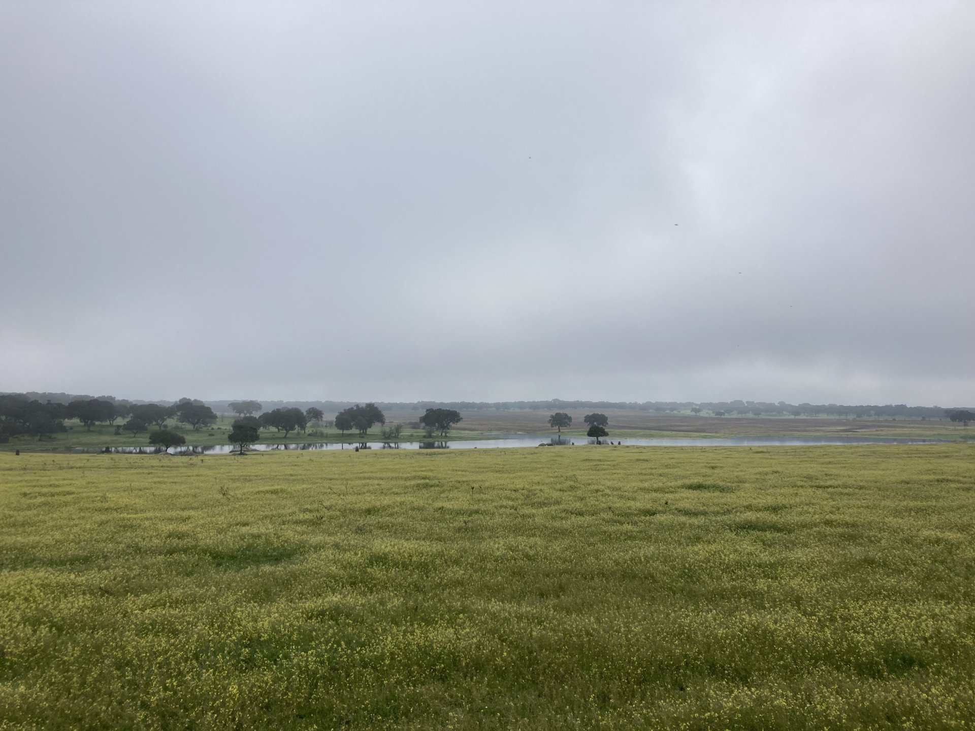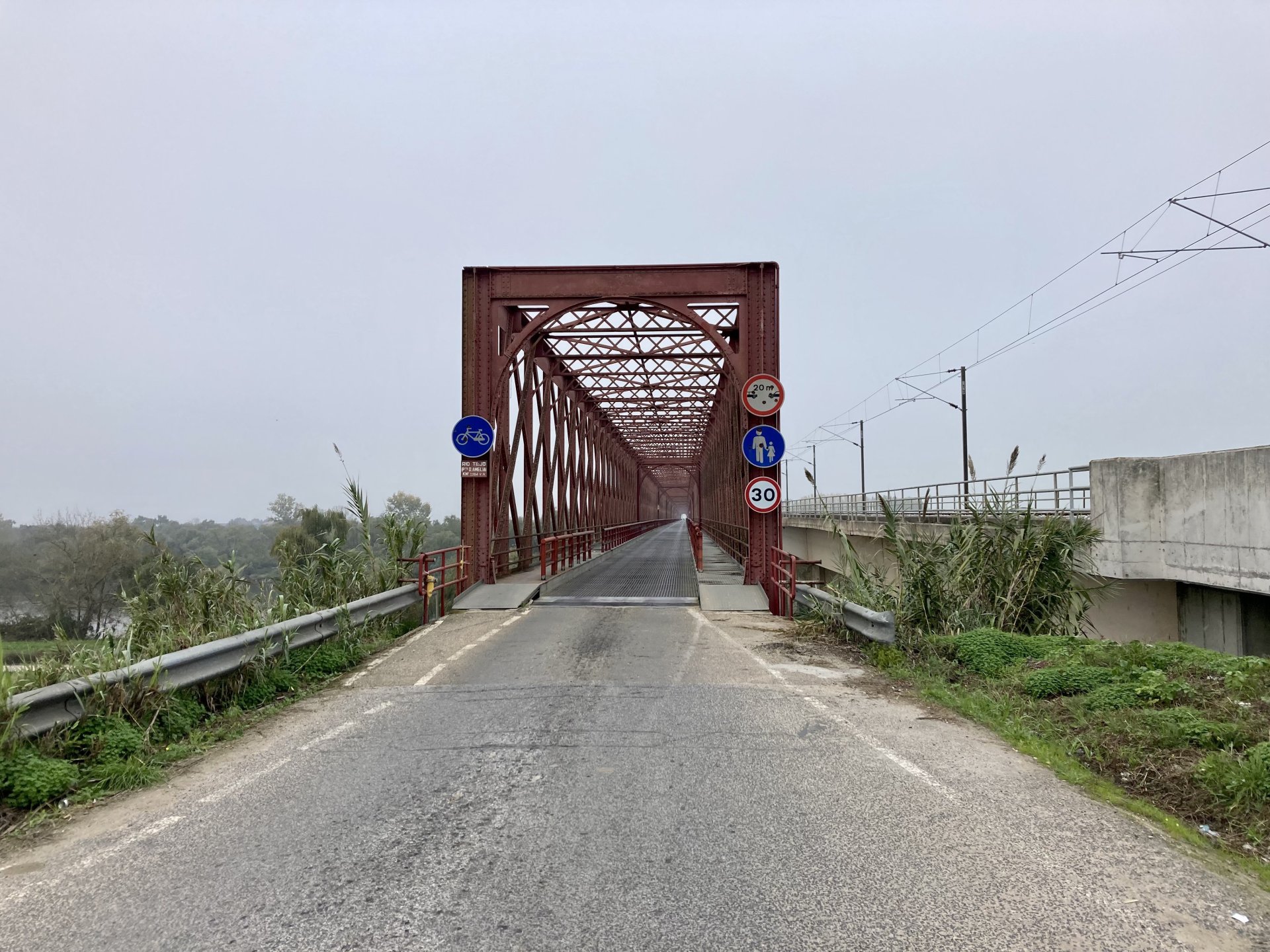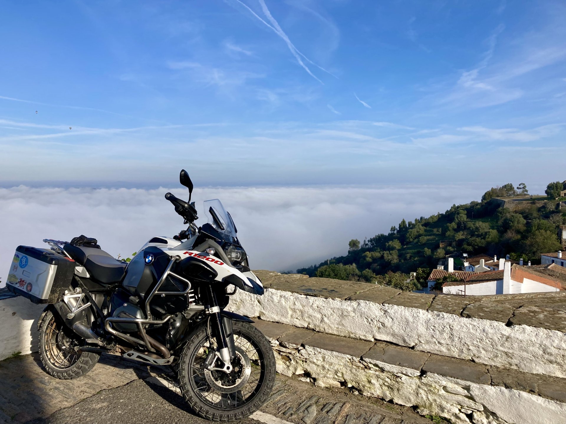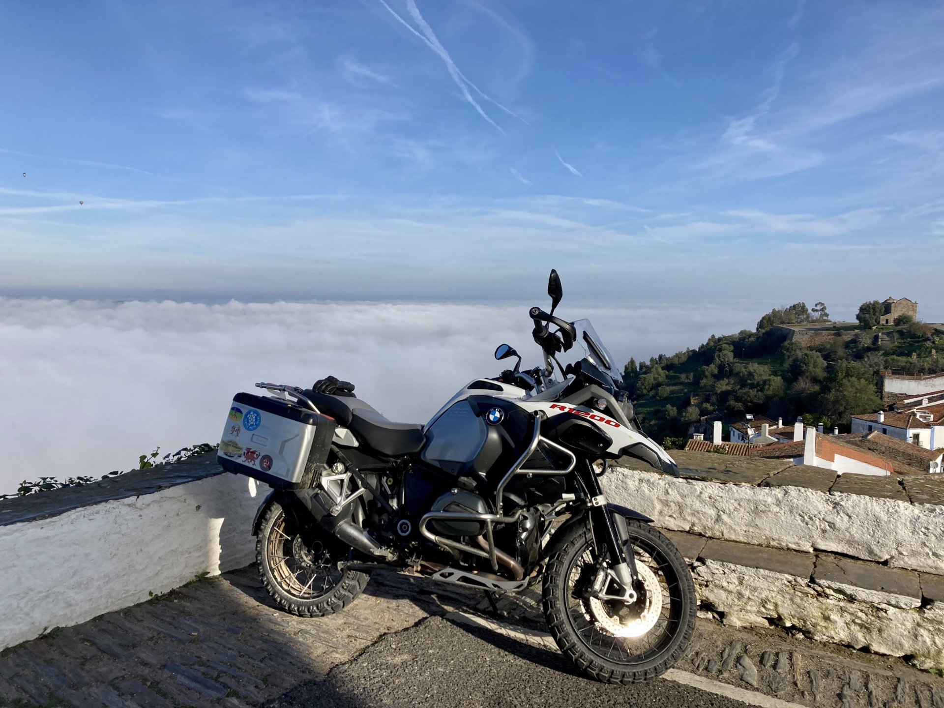 Woke today to another very wet foggy morning, riding out of the hotel the fog was too thick to see much of anything so I went up to the castle doors to see if there was a nice view, and indeed there was, quite the view: On the picture above, if you look to the two dots in the sky over the bike's rear luggage rack, and zoom in, you'll see two hot air balloons. Can only imagine they would have to wait for the fog to dissipate before landing, but there must have been quite the view from up there. The fog wasn't going nowhere, so I rode off heading back home. Stopped for an espresso in Estremoz, about an hour later, and enjoyed a little bit of sunshine to warm up, but as soon as I got back on the road it got cold again, beats rain though. Took a little detour through a few kms of dirt road, to see a very moody Alentejo: Bit farther on, did a wrong turn and ended up on a slightly more muddy path that turned out to be a dead end, so stopped for a another look around. The bike threw up a little mud on that trail, but most of it was cleared from a shallow water crossing, by 13:00 I was back on the road, hungry and cold so did another little detour and stopped at a very VERY old school cafe / grocery store / bar, and had a snack. There's four little dogs working there, they are always up for a snack too and they could sniff something delicious I was seduced and they ended up having some of my sandwich filling Almost back home, waiting for the green light to cross the old bridge: And that's it, the bike is filthy and looking very epic, I'm not going to wash it today, and maybe not until tuesday or wednesday, but it's dry and garaged. This wasn't the trip I was looking for, but ended up appreciating a little spot of Portugal I might return more often to, can't go wrong with riding nice dirt roads, cool views, quiet nights, and good food and wine.2 points