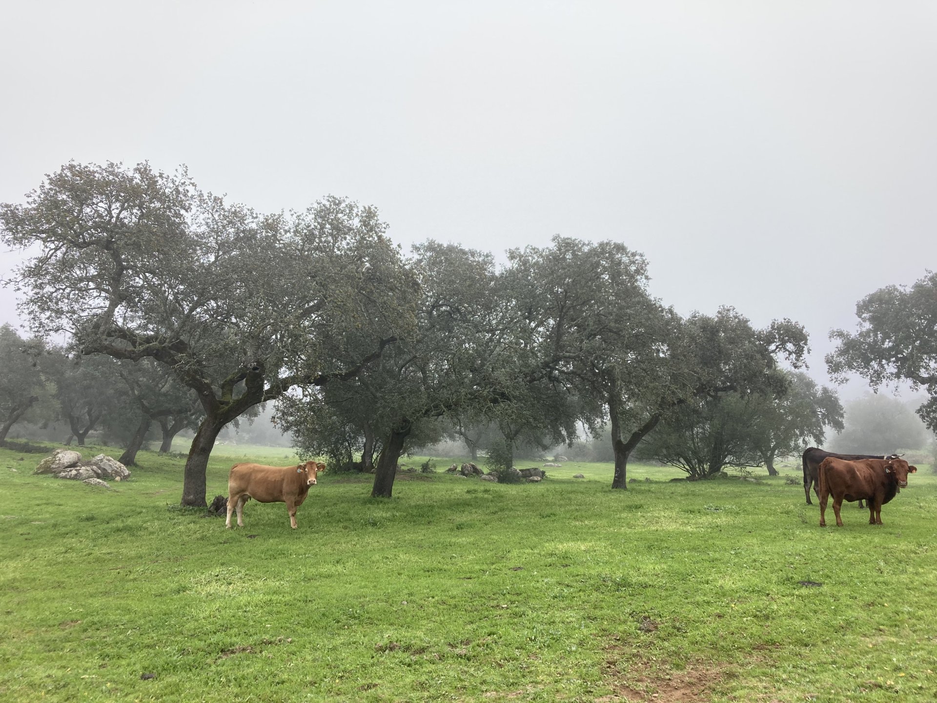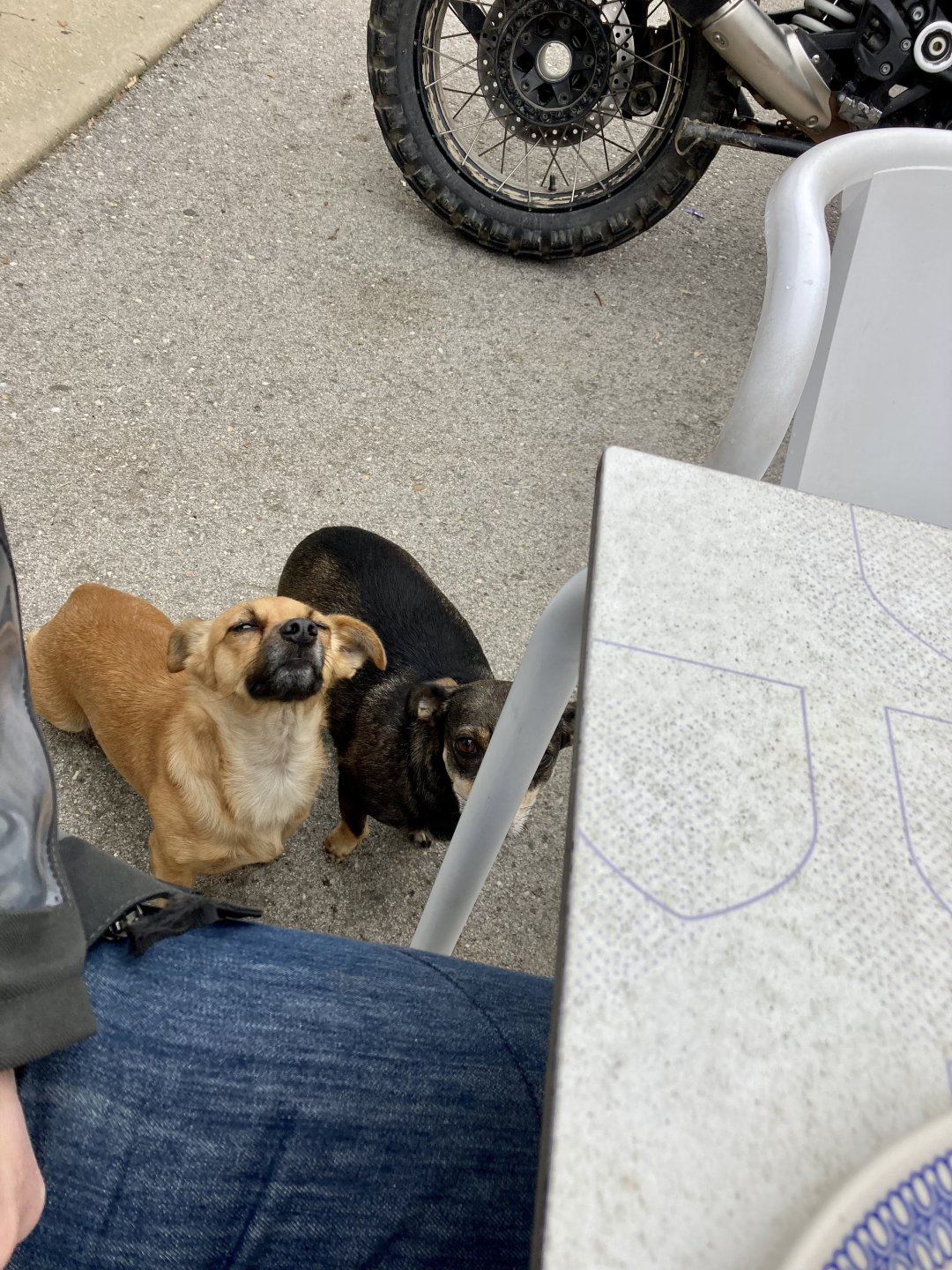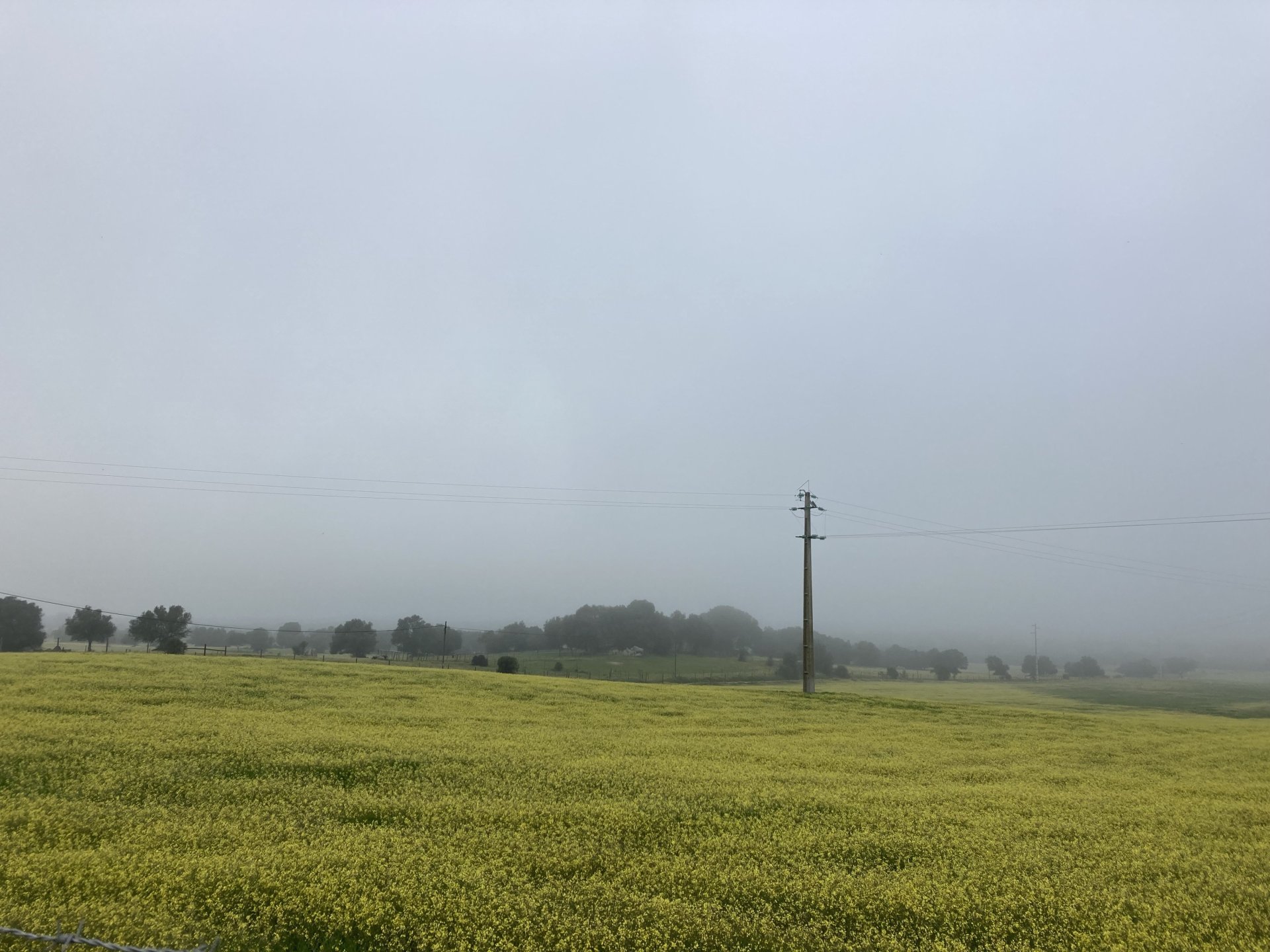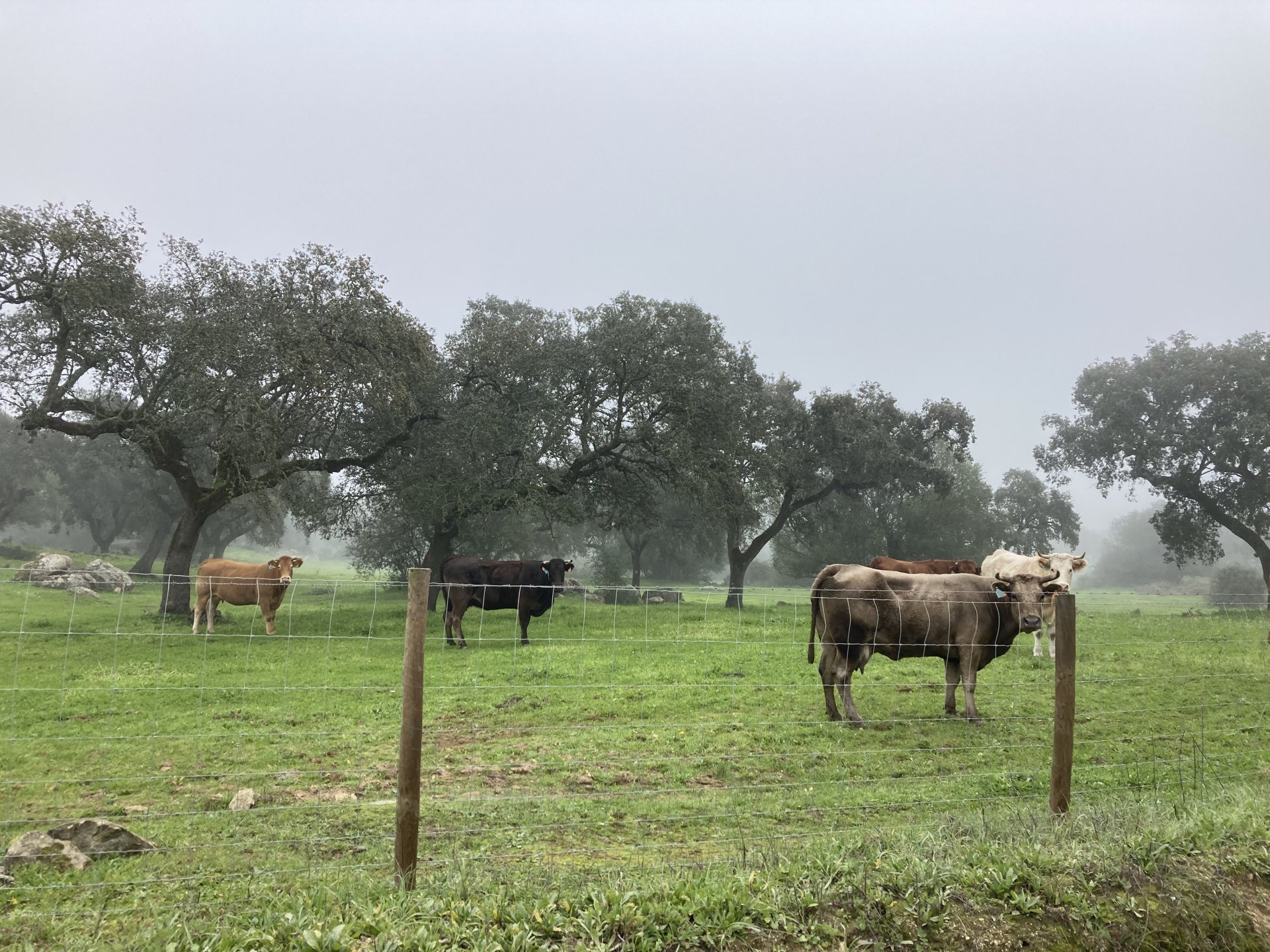 Woke today to another very wet foggy morning, riding out of the hotel the fog was too thick to see much of anything so I went up to the castle doors to see if there was a nice view, and indeed there was, quite the view: On the picture above, if you look to the two dots in the sky over the bike's rear luggage rack, and zoom in, you'll see two hot air balloons. Can only imagine they would have to wait for the fog to dissipate before landing, but there must have been quite the view from up there. The fog wasn't going nowhere, so I rode off heading back home. Stopped for an espresso in Estremoz, about an hour later, and enjoyed a little bit of sunshine to warm up, but as soon as I got back on the road it got cold again, beats rain though. Took a little detour through a few kms of dirt road, to see a very moody Alentejo: Bit farther on, did a wrong turn and ended up on a slightly more muddy path that turned out to be a dead end, so stopped for a another look around. The bike threw up a little mud on that trail, but most of it was cleared from a shallow water crossing, by 13:00 I was back on the road, hungry and cold so did another little detour and stopped at a very VERY old school cafe / grocery store / bar, and had a snack. There's four little dogs working there, they are always up for a snack too and they could sniff something delicious I was seduced and they ended up having some of my sandwich filling Almost back home, waiting for the green light to cross the old bridge: And that's it, the bike is filthy and looking very epic, I'm not going to wash it today, and maybe not until tuesday or wednesday, but it's dry and garaged. This wasn't the trip I was looking for, but ended up appreciating a little spot of Portugal I might return more often to, can't go wrong with riding nice dirt roads, cool views, quiet nights, and good food and wine.2 points