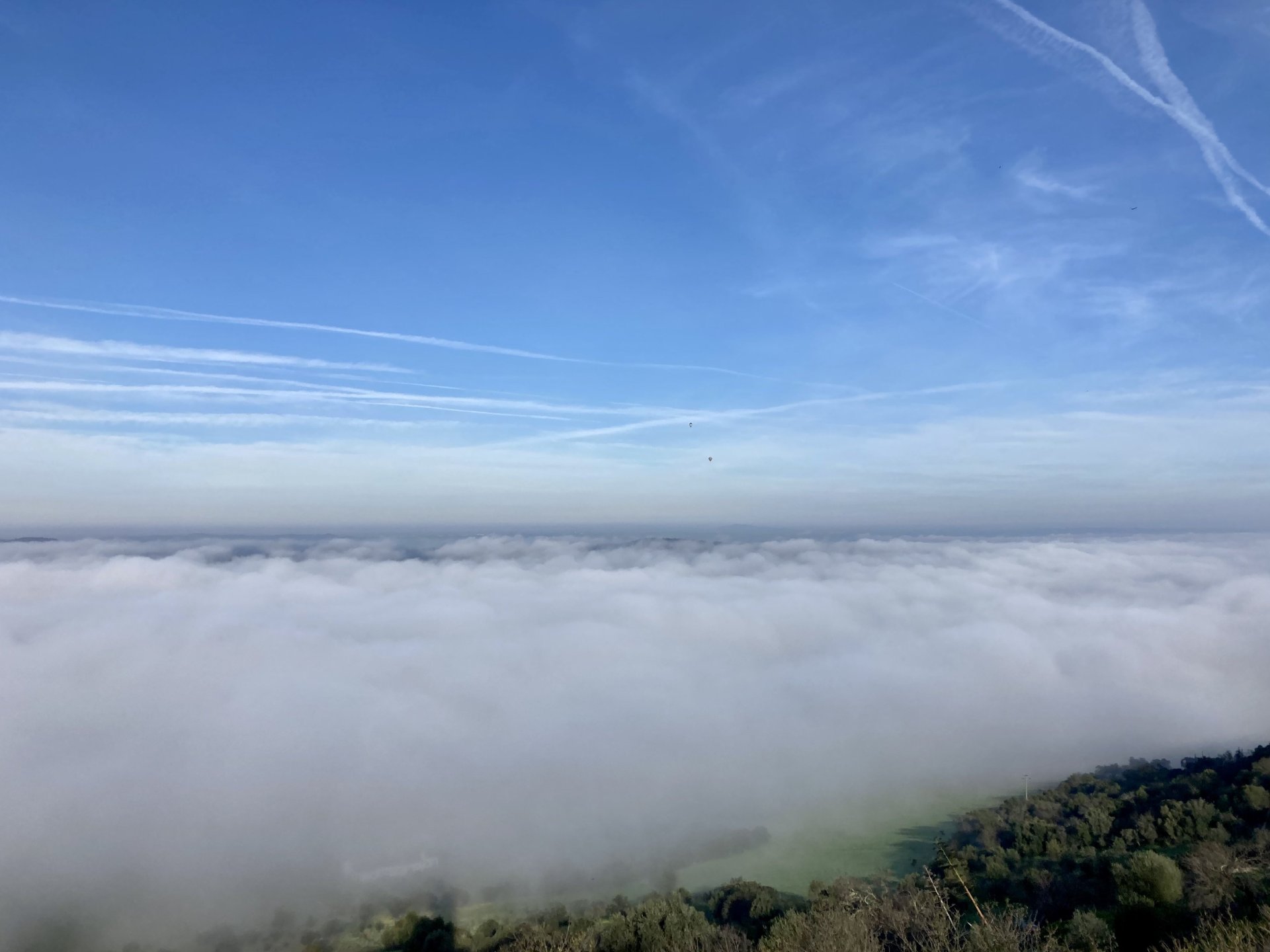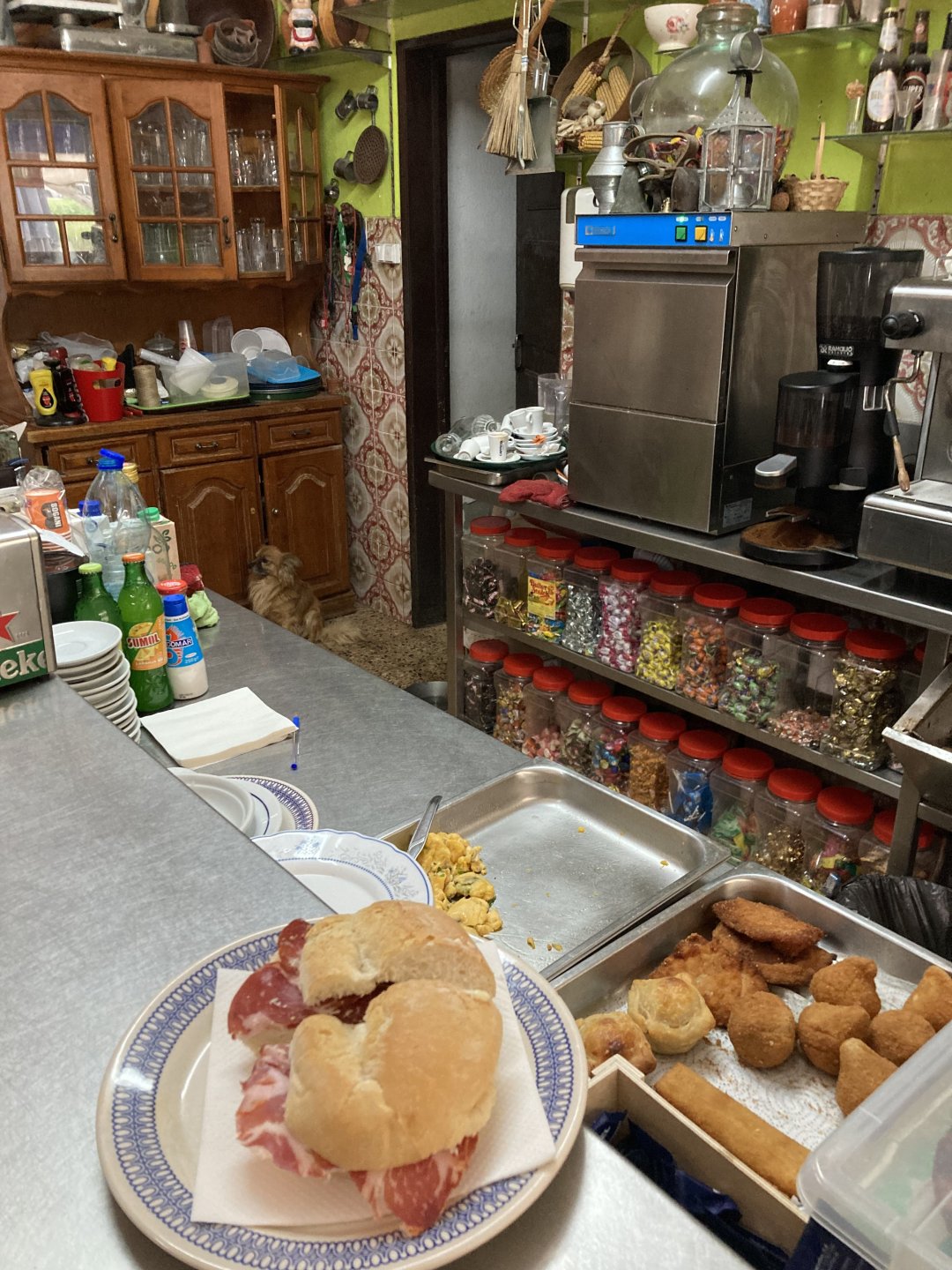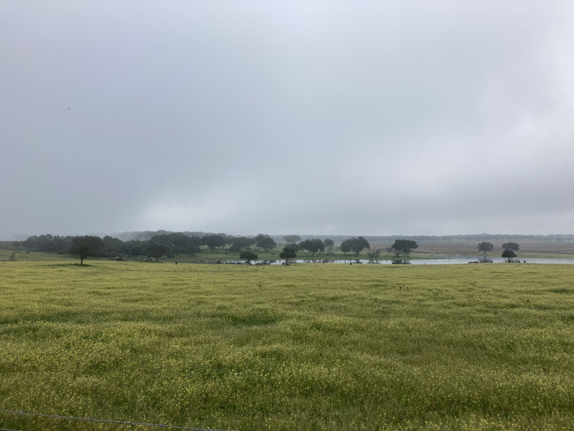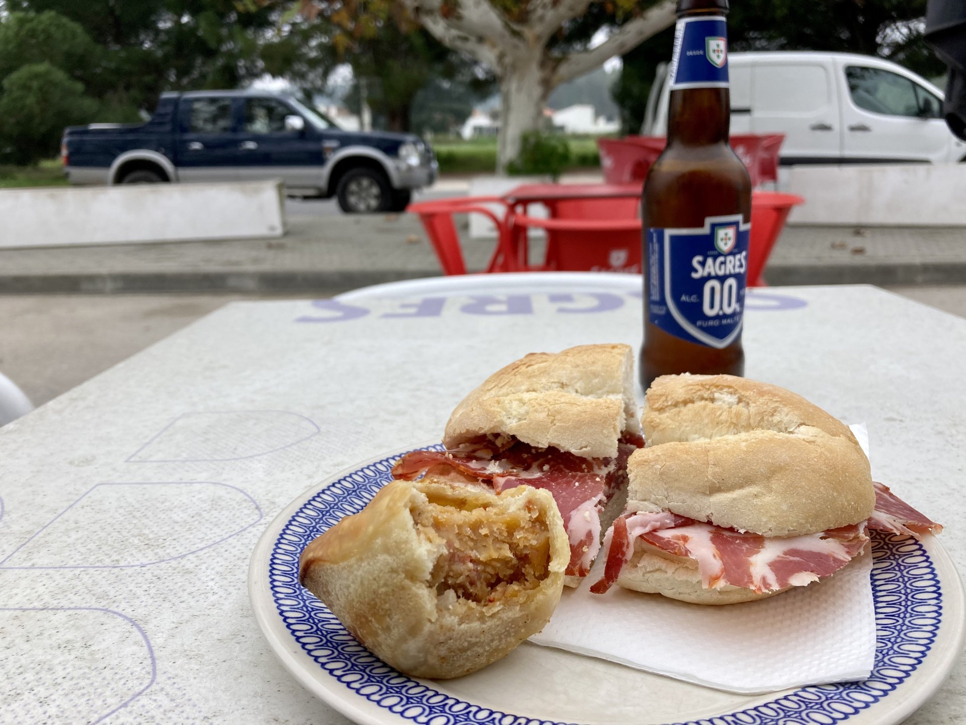 Woke today to another very wet foggy morning, riding out of the hotel the fog was too thick to see much of anything so I went up to the castle doors to see if there was a nice view, and indeed there was, quite the view: On the picture above, if you look to the two dots in the sky over the bike's rear luggage rack, and zoom in, you'll see two hot air balloons. Can only imagine they would have to wait for the fog to dissipate before landing, but there must have been quite the view from up there. The fog wasn't going nowhere, so I rode off heading back home. Stopped for an espresso in Estremoz, about an hour later, and enjoyed a little bit of sunshine to warm up, but as soon as I got back on the road it got cold again, beats rain though. Took a little detour through a few kms of dirt road, to see a very moody Alentejo: Bit farther on, did a wrong turn and ended up on a slightly more muddy path that turned out to be a dead end, so stopped for a another look around. The bike threw up a little mud on that trail, but most of it was cleared from a shallow water crossing, by 13:00 I was back on the road, hungry and cold so did another little detour and stopped at a very VERY old school cafe / grocery store / bar, and had a snack. There's four little dogs working there, they are always up for a snack too and they could sniff something delicious I was seduced and they ended up having some of my sandwich filling Almost back home, waiting for the green light to cross the old bridge: And that's it, the bike is filthy and looking very epic, I'm not going to wash it today, and maybe not until tuesday or wednesday, but it's dry and garaged. This wasn't the trip I was looking for, but ended up appreciating a little spot of Portugal I might return more often to, can't go wrong with riding nice dirt roads, cool views, quiet nights, and good food and wine.2 points