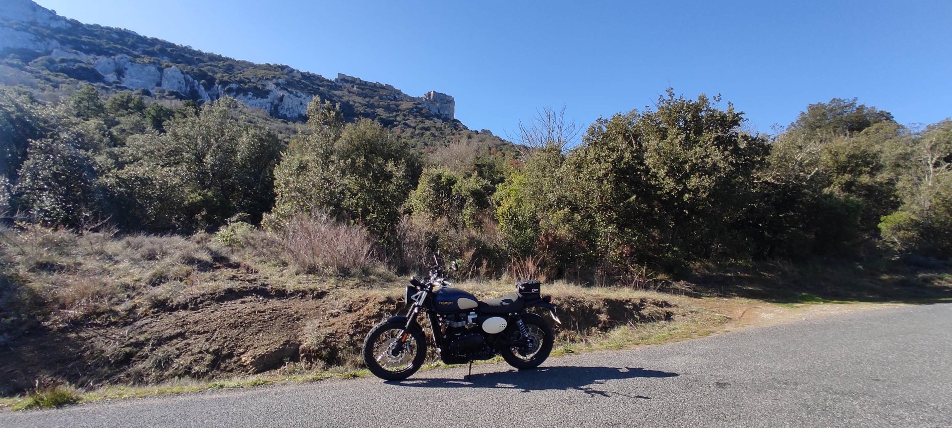 After a couple of wet days the sun got his hat on today. It was still slightly fresh and a bit windy first thing, but I couldn't resist getting out on the bike. I put Villerouge Termenes into the sat-nav and headed in that direction. The route took me on Narbonne's northern bypass and I turned off and headed up and across, past the Abbaye Fontfroide and towards Tournissan. I turned off that road and headed towards Villerouge-Termenès, which is a nice twisty road in the Corbieres. I got to Villerouge and stopped for a minute, but I was enjoying the ride, so I switched off the Sat-nav and decided that I'd just see where I ended up. I was in a village called Laroq-de-Fa and saw a road sign for the Château Quéribus, so I swung off onto that road. It wound through the hills and into Massac, where I swung a tricky right turn towards Soulatgé. There I picked up the road along the valley, towards Duilhac-sous-Peyrepertuse, which took me under the Château Peyrepertuse that sits on a rocky ridge. I passed through Duilhac-sous-Peyrepertuse and past the Château de Quéribus. I then went through Padern and along its gorge, towards Tuchan, where I got caught out by the lack of road signs, but eventually found the right road. This road took me past the Château d'Aguilar and towards Villeneuve-les-Corbières. From there I went through Durban-Corbières and turned left onto the road to Thézan-des-Corbières. There I got back onto the road past Abbaye Fontfroide and back to Narbonne and home. I've no idea how far this loop was, but I was out for about 4hrs, so I'm guessing at around 200kms or thereabouts. The roads were pretty twisty and narrow, so it wasn't a fast ride!7 points