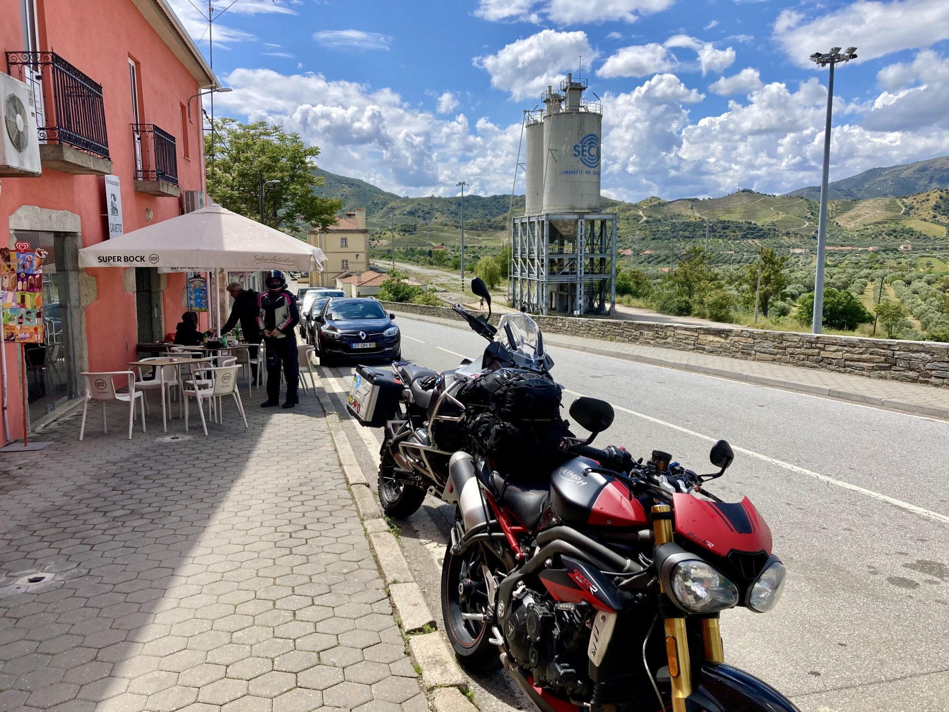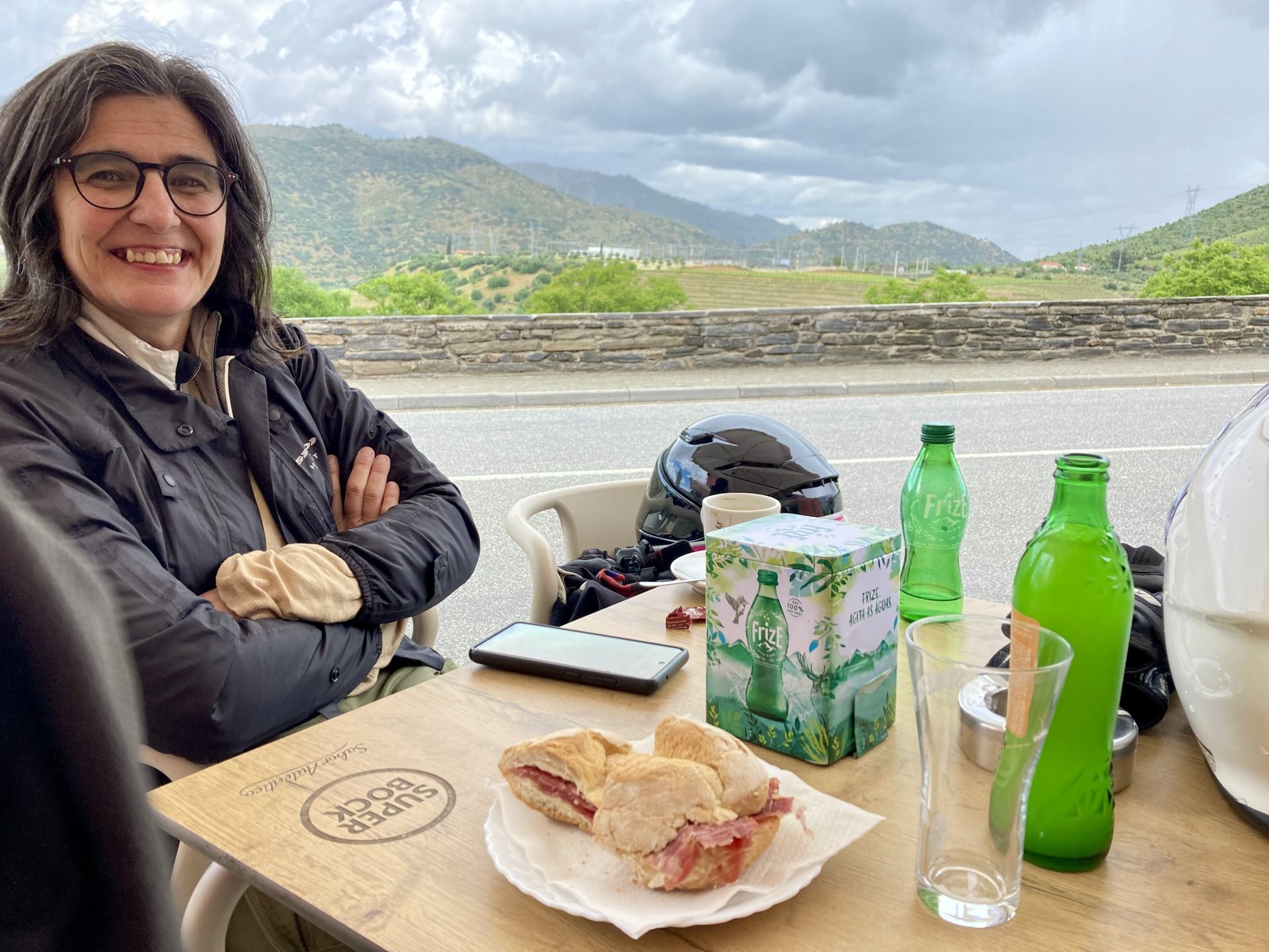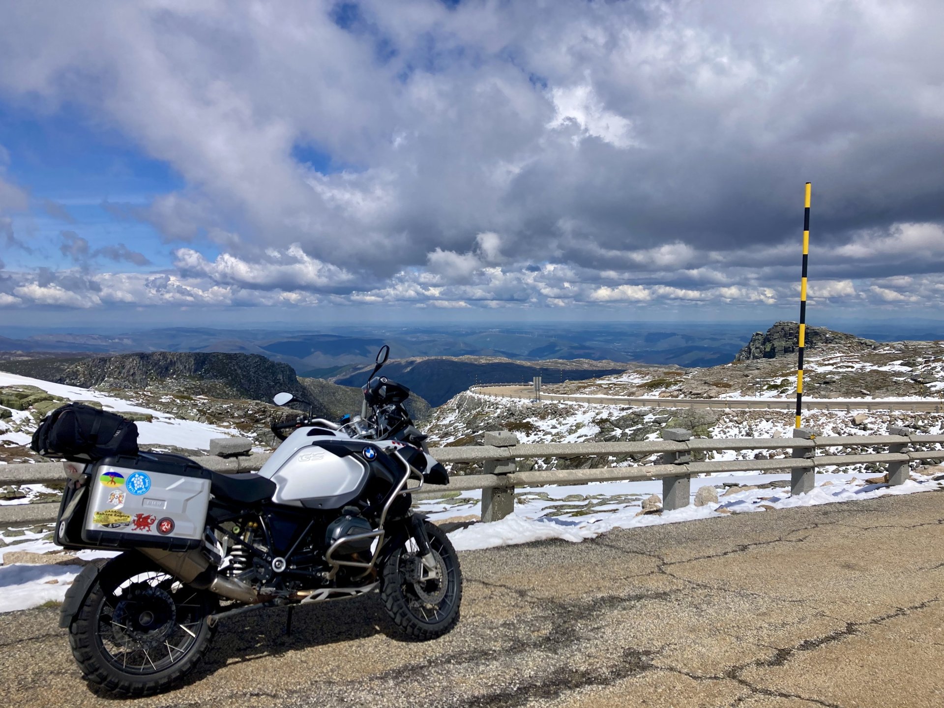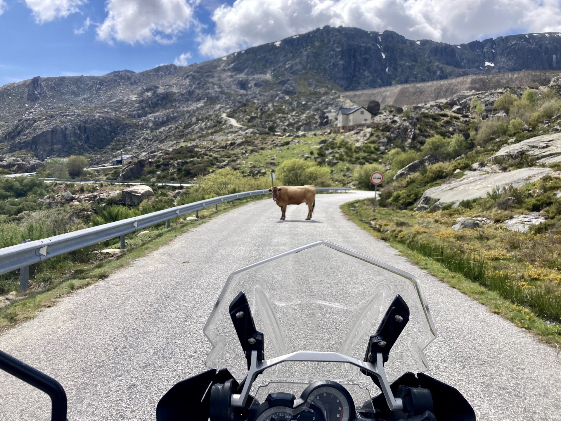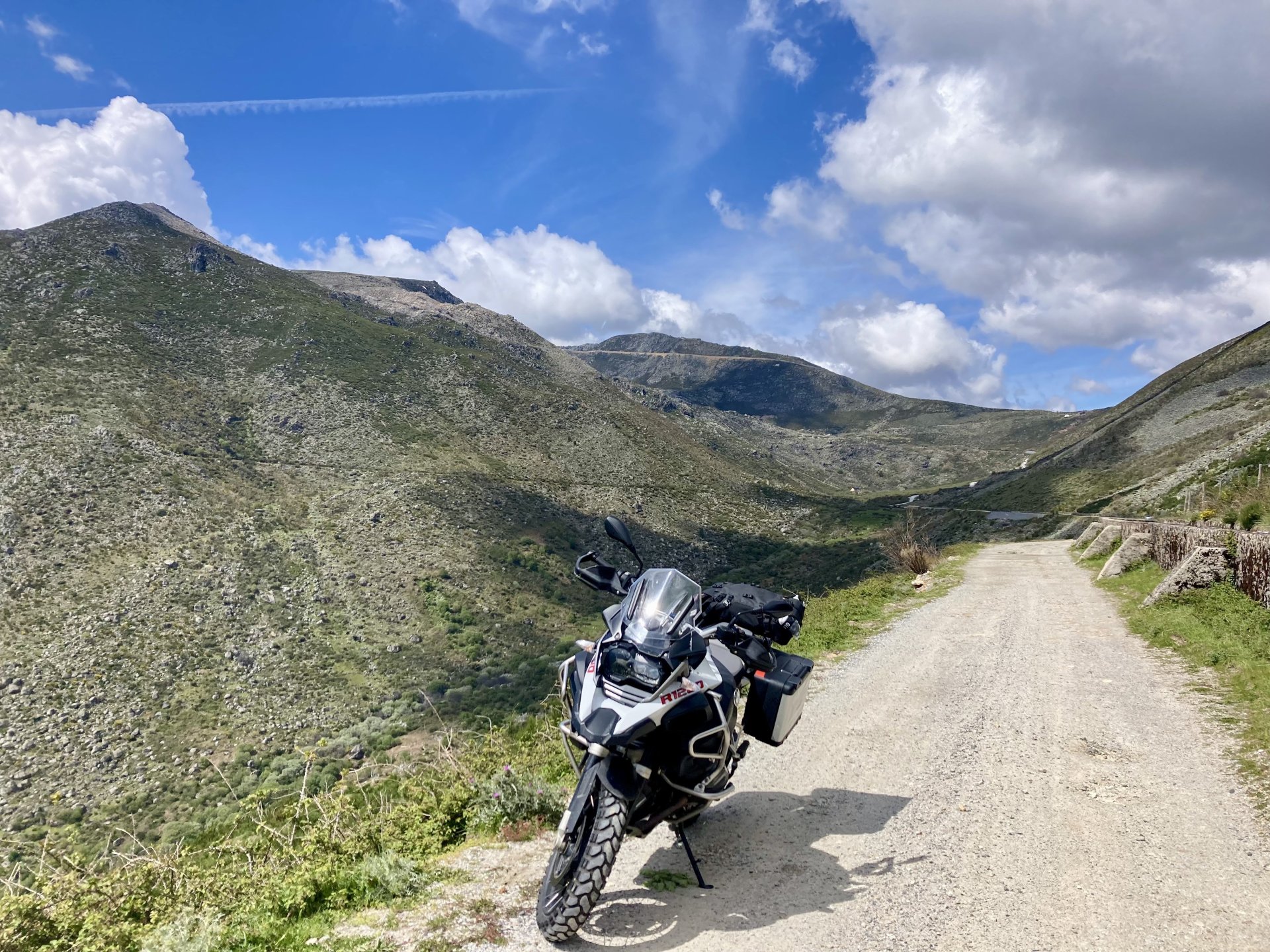 I left home to go and meet up with Sofia to help guide one of her motorcycle tours. Meeting in Tras os Montes, near the inner North Portuguese border, where we'd meet her client the next day. Hardly no stops this day as I left later than planned. Did take back roads to get there though, before meeting with Sofia at Pocinho, by the Douro river. A stop on the way over to take a look at an access road to a farmhouse where we'd stop a few days later. It's quite steeper than it looks on pictures, surface not maintained as it's basically a work service road for vineyards. It's really the sort of stuff I love to ride on but not to everyone's taste. We had been enjoying almost summer like weather during the previous 2 or 3 weeks, but the forecast was changing and I rode through a few showers on the way there. Spirits were high and I was met with a ham sandwich upon arrival. Sofia had two british friends riding down as well, doing the north of Portugal in dirt roads and mostly off tarmac tracks, we were to meet them for a coffee since we had now time to spare before our destination for the night. Met up in a little village, and I took a few pictures while we waited. We ended up waiting more than anticipated because it turns out they were coping with a rear tire puncture. Eventually they arrived, their bung didn't do it repairing the puncture and it had a slow leak. Considering this a saturday afternoon in the middle of nowhere, and that most shops around would be closed on sunday, I gave it a go using my trusty repair kit. It worked like a charm, they carried on with the trip and it's still going strong today. While all this went on, the weather changed again and a heavy rain arrived. We waited a little while having a coffee. We made it home for our room for the night later than scheduled and after the last bit of the ride being in cold rain. Went to have dinner at my favourite restaurant, a proper beef rib perfectly cooked on coal. Happy times! That night we stayed in an old lady's little air b n b style place in a farm house, the bikes enjoyed the night inside the farm size garage, most garages in this area are big enough for full size tractors to drive in and our with trailers, so the GS could barely fit in. Contrary to previous weeks, this night temperatures were already quite low with a minimum of 0ºC. We rode off at around 4º or 5º in search of a cafe to have breakfast in, we weren't in a hurry because we were only expecting to meet up with Sofia's client by mid afternoon. Didn't make it 3 or 4 km down the road when we came upon a french guy with a fallen down Transalp 750. He dropped it parking on the side of the road, and couldn't get it back up. After lifting the bike, I managed to put his sidecase back on, it had both broke the lid and the mechanism that locks it onto the bike. Sofia had a strap that was used to then hold it all together, can't say I rate Honda's luggage very high after that incident. We did spend some time having coffee, then going to fuel up the bikes, and then already in the afternoon went to visit a village right near the border waiting for time to pass. Weather was cold and rainy. Eventually we found this warm little place for a snack and to get away from the cold. Will post almost no pictures of the tour itself as most of them feature a person that doesn't deserve to be shown in this forum , however, the next couple of days were blessed with big clouds and the odd threat of rain but overall really nice conditions to be out on bikes, if it had been in January. First day Our stop for a picnic lunch: And final stop point for the night, right before the hotel and dinner: Next day, we made it up to Portugal's highest point, only a brief rain shower on the way there, but overall great conditions. Even had lunch by a lake under glorious sun. The road up the mountain: Up there the temperatures were around 0º when we got there at around 14:30 to 15:00, pretty cold but the big clouds and brisk air made for great views. Up there it's often foggy and you can't see anything. Going down the mountain the other side, we took a little dirtroad. I went ahead to check if it was muddy, it wasn't. I wasn't happy to have this face off with a local cow, who wasn't happy to face a noisy bike either. We spent that night at an amazing place with a couple of horses. They're friendly enough but are of a wild breed, not really for riding, and like to take nibbles at your hands. Will continue later on or tomorrow, don't have that many pictures to post but there will be something.6 points