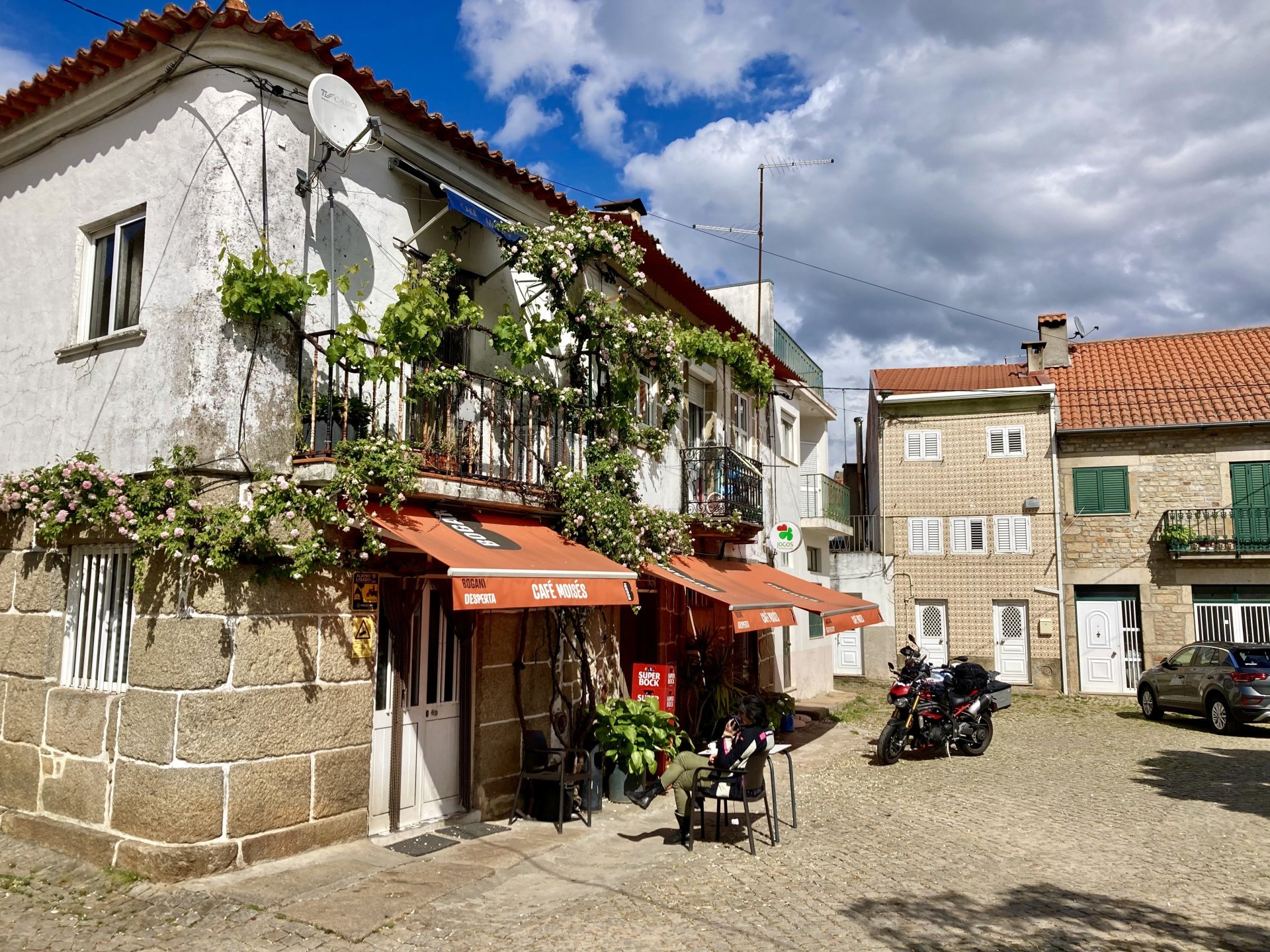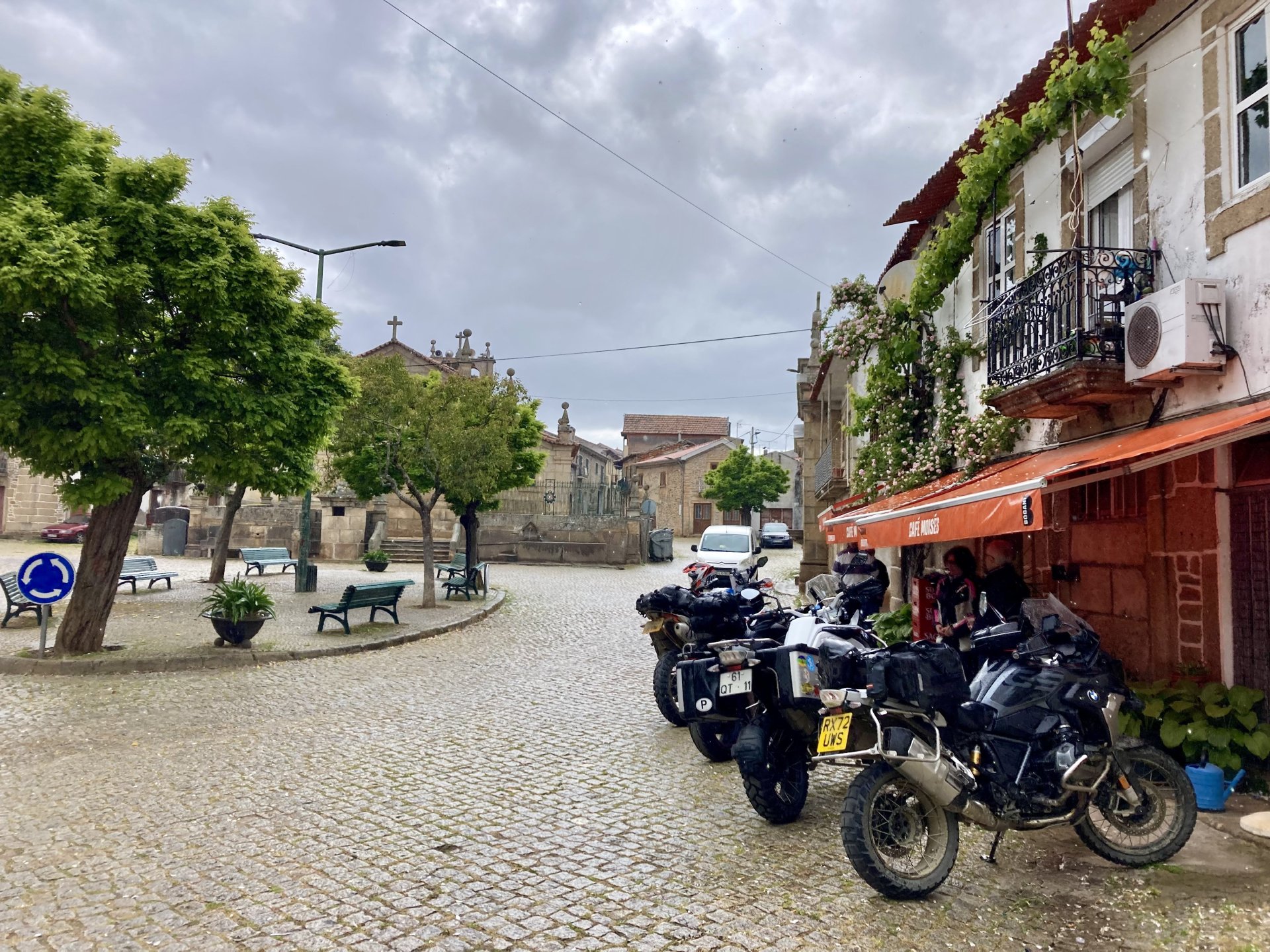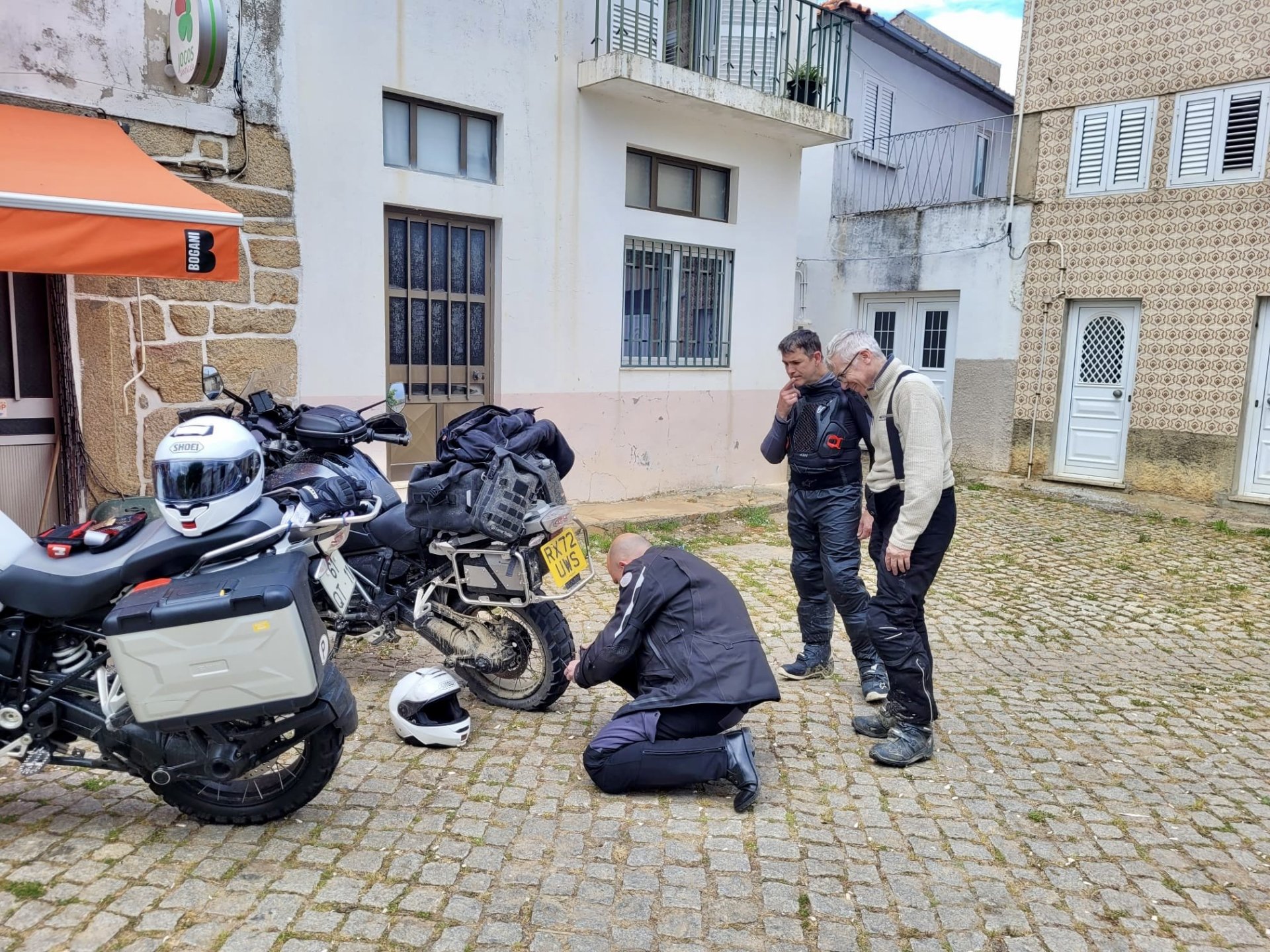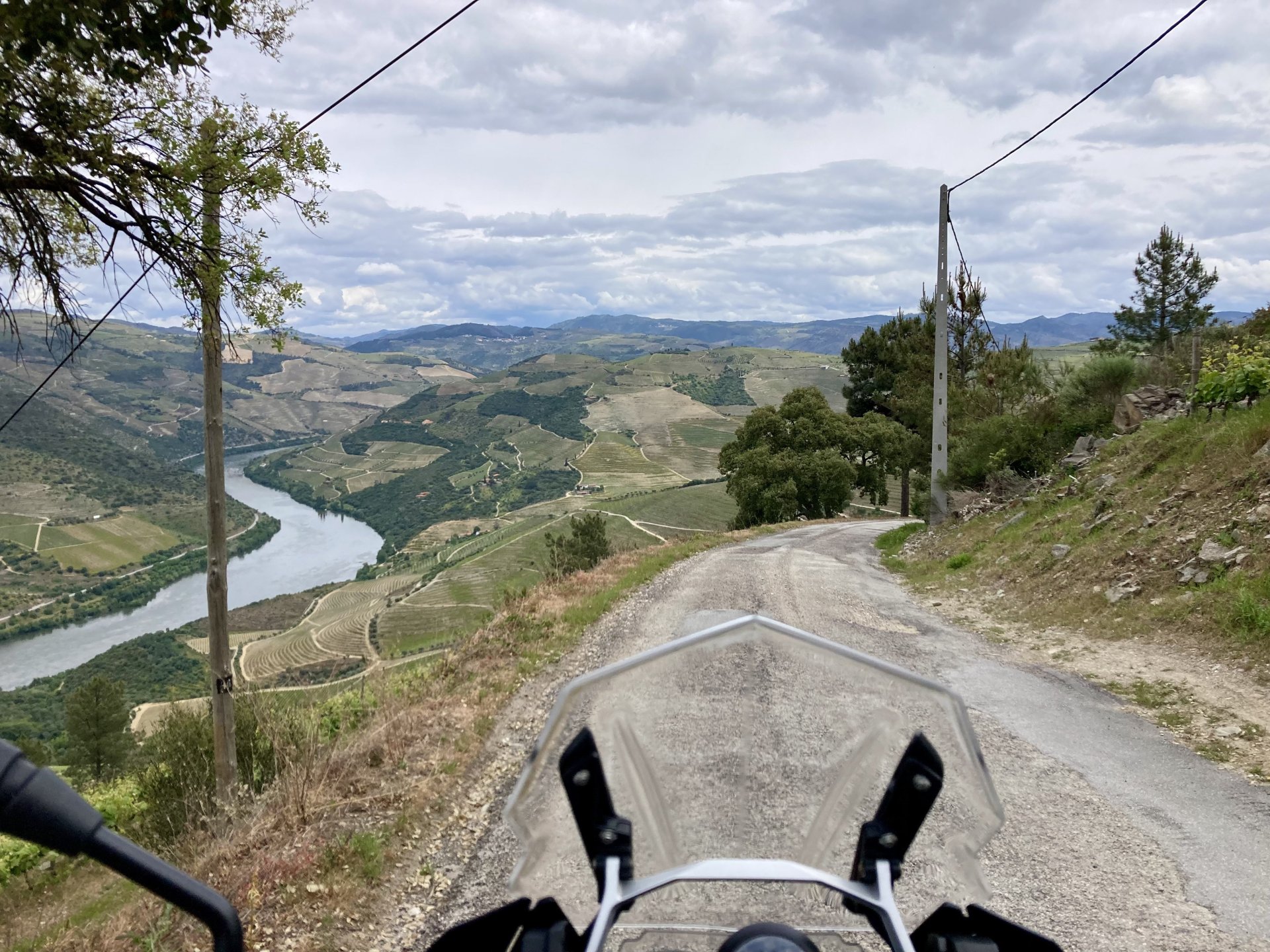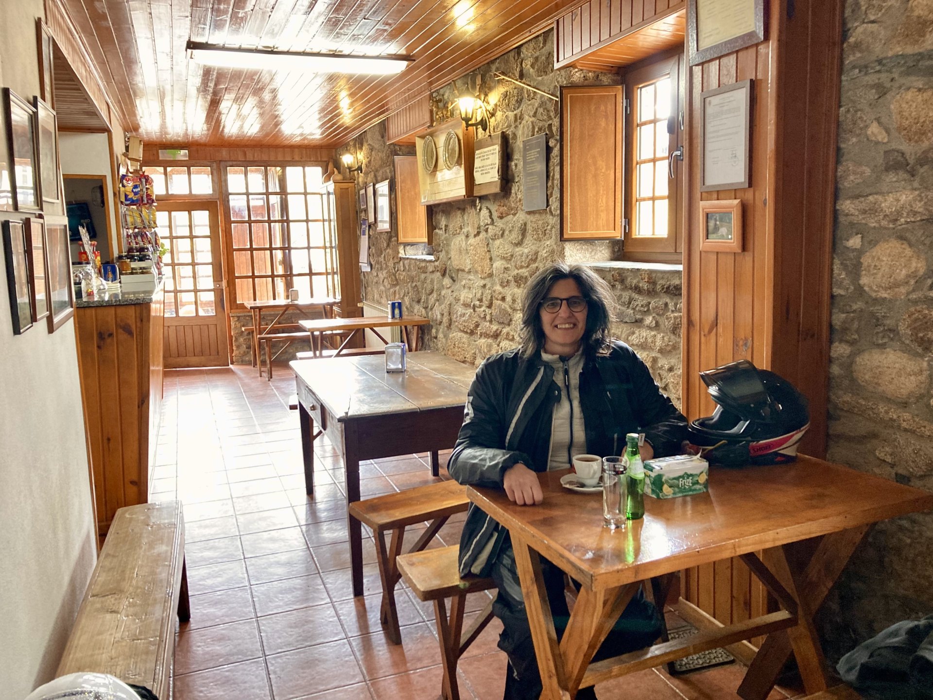 I left home to go and meet up with Sofia to help guide one of her motorcycle tours. Meeting in Tras os Montes, near the inner North Portuguese border, where we'd meet her client the next day. Hardly no stops this day as I left later than planned. Did take back roads to get there though, before meeting with Sofia at Pocinho, by the Douro river. A stop on the way over to take a look at an access road to a farmhouse where we'd stop a few days later. It's quite steeper than it looks on pictures, surface not maintained as it's basically a work service road for vineyards. It's really the sort of stuff I love to ride on but not to everyone's taste. We had been enjoying almost summer like weather during the previous 2 or 3 weeks, but the forecast was changing and I rode through a few showers on the way there. Spirits were high and I was met with a ham sandwich upon arrival. Sofia had two british friends riding down as well, doing the north of Portugal in dirt roads and mostly off tarmac tracks, we were to meet them for a coffee since we had now time to spare before our destination for the night. Met up in a little village, and I took a few pictures while we waited. We ended up waiting more than anticipated because it turns out they were coping with a rear tire puncture. Eventually they arrived, their bung didn't do it repairing the puncture and it had a slow leak. Considering this a saturday afternoon in the middle of nowhere, and that most shops around would be closed on sunday, I gave it a go using my trusty repair kit. It worked like a charm, they carried on with the trip and it's still going strong today. While all this went on, the weather changed again and a heavy rain arrived. We waited a little while having a coffee. We made it home for our room for the night later than scheduled and after the last bit of the ride being in cold rain. Went to have dinner at my favourite restaurant, a proper beef rib perfectly cooked on coal. Happy times! That night we stayed in an old lady's little air b n b style place in a farm house, the bikes enjoyed the night inside the farm size garage, most garages in this area are big enough for full size tractors to drive in and our with trailers, so the GS could barely fit in. Contrary to previous weeks, this night temperatures were already quite low with a minimum of 0ºC. We rode off at around 4º or 5º in search of a cafe to have breakfast in, we weren't in a hurry because we were only expecting to meet up with Sofia's client by mid afternoon. Didn't make it 3 or 4 km down the road when we came upon a french guy with a fallen down Transalp 750. He dropped it parking on the side of the road, and couldn't get it back up. After lifting the bike, I managed to put his sidecase back on, it had both broke the lid and the mechanism that locks it onto the bike. Sofia had a strap that was used to then hold it all together, can't say I rate Honda's luggage very high after that incident. We did spend some time having coffee, then going to fuel up the bikes, and then already in the afternoon went to visit a village right near the border waiting for time to pass. Weather was cold and rainy. Eventually we found this warm little place for a snack and to get away from the cold. Will post almost no pictures of the tour itself as most of them feature a person that doesn't deserve to be shown in this forum , however, the next couple of days were blessed with big clouds and the odd threat of rain but overall really nice conditions to be out on bikes, if it had been in January. First day Our stop for a picnic lunch: And final stop point for the night, right before the hotel and dinner: Next day, we made it up to Portugal's highest point, only a brief rain shower on the way there, but overall great conditions. Even had lunch by a lake under glorious sun. The road up the mountain: Up there the temperatures were around 0º when we got there at around 14:30 to 15:00, pretty cold but the big clouds and brisk air made for great views. Up there it's often foggy and you can't see anything. Going down the mountain the other side, we took a little dirtroad. I went ahead to check if it was muddy, it wasn't. I wasn't happy to have this face off with a local cow, who wasn't happy to face a noisy bike either. We spent that night at an amazing place with a couple of horses. They're friendly enough but are of a wild breed, not really for riding, and like to take nibbles at your hands. Will continue later on or tomorrow, don't have that many pictures to post but there will be something.6 points