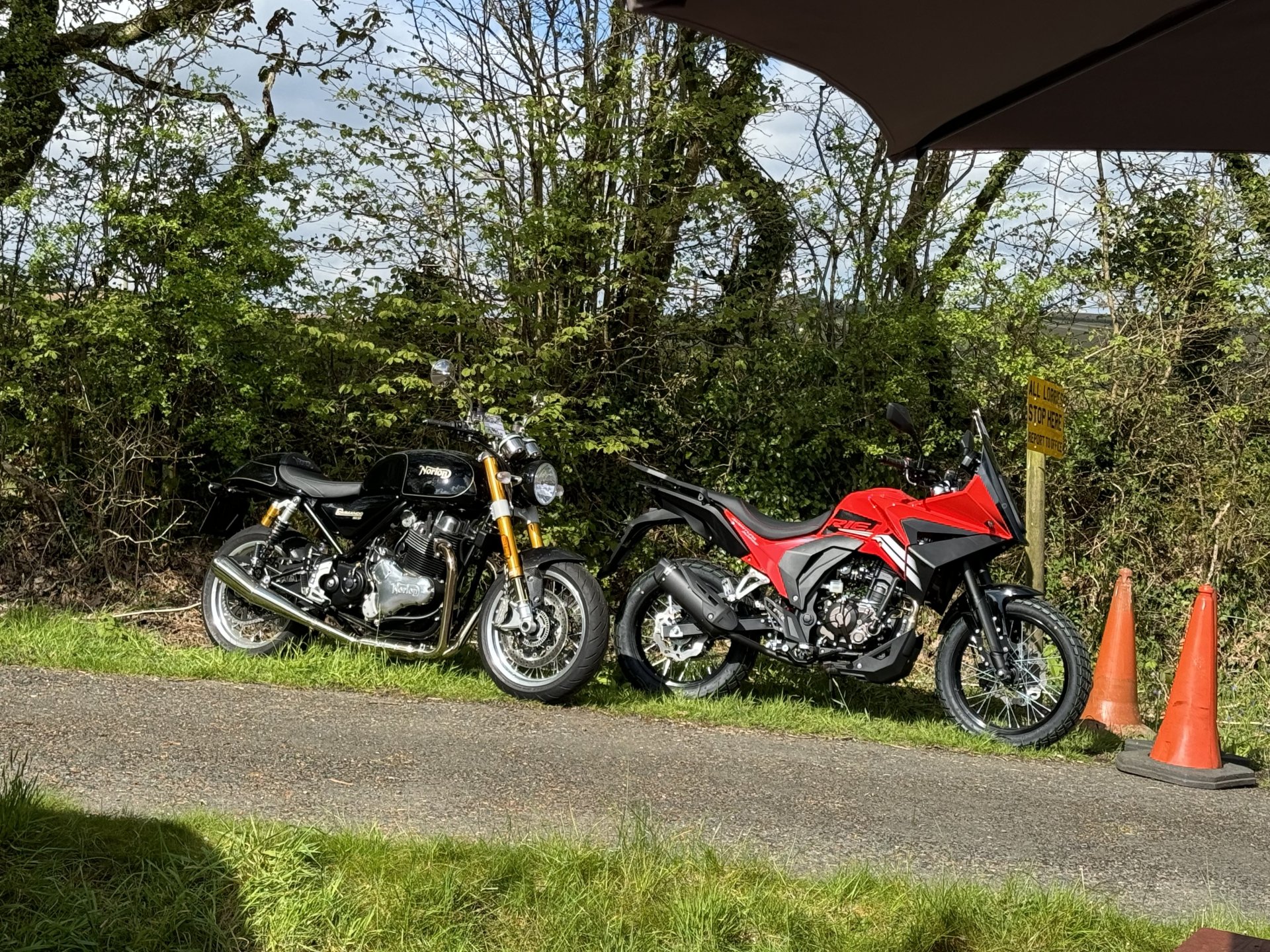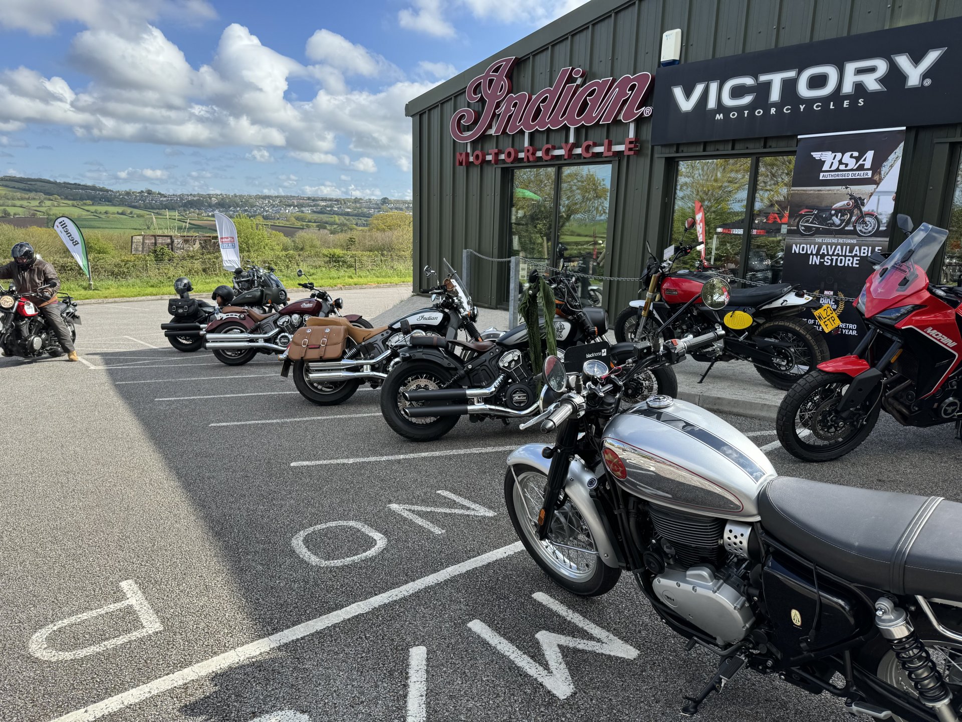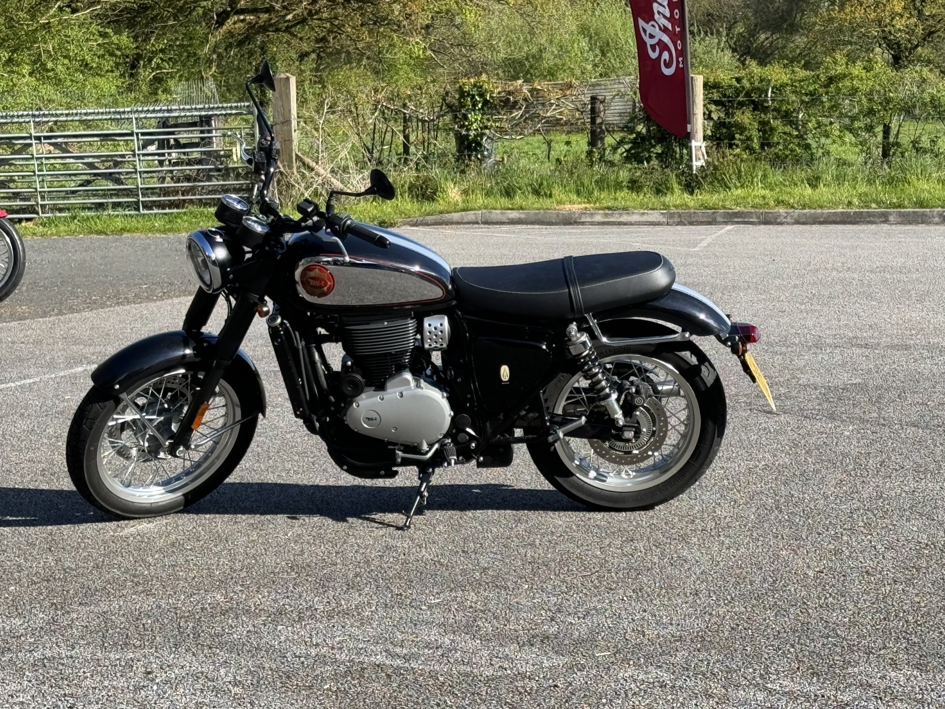 Well I got up bright and early to take the test ride and got to Thor Motorcycles around 8:45 as the ride was booked for 9:00 am. All still unpacking when I got there so I sat down and had a cuppa whilst they got their shit together, no problem. Anyway I got out for a lead ride, which was not advertised, at 9:30. The youngest was disappointed as no pillions on test rides apparently, bit short sighted I would say as any bike I get I would want to ride with a pillion given that I rarely ride alone nowadays. I bribed her with a cheeseburger and Fanta for her breakfast from the burger wagon, which also was not free as advertised. Don't really care about that but I can see someone will moan and it pays to do as you say in the long run IMHO. Anyway back to the ride out, the owner of Thor came out on his BSA and lead me out through the lanes to Cardinham then out on the A30 for a blast down to Innis Downs junction. Off there through Bugle to Roche then out to Victoria Interchange and the old A30 to Lanivet and back to Thor. A good 45 minute ride were the owner of Thor (Colin) rode like a fuck wit the whole way, weaving all over the shop to keep his tyres warm (Twat), blasting through speed limits and riding really aggressively around motorists. Certainly didn't endear himself to several cars he was tailgating. Anyway to the BSA, pleasant enough to ride, but couldn't get away from the fact it felt flat. To be fair it only had 100 miles on it so must have been tight and did loosen up as it warmed up and the ride went on. Around the back lanes across Bodmin Moor it felt great with plenty of torque and a nice positive gearbox, never going past 50mph. Gauges were small and hard to read but good enough and did look pretty. Ergonomically, nice sit up riding position, comfy seat and I could flat foot it easily. Once we were out on the A30, a fast dual carriageway, the BSA sat at 70mph quite comfortably, a few vibes crept in at 75 but went again at 80, never ventured past 85 as the bike just did not really want to. Colin was off in the distance so must have travelling a fair bit quicker. I guess his 22 plate bike was well run in. No wind protection was really noticeable at 70 plus and would get tiring quickly, or would for me. Passing cars on the A30 was a bit risky as the mirrors were blurred and the right hand side one had vibrated out or adjustment and was pointing skyward. I corrected it but it soon moved again. I got the impression that the bike would sit at 70mph all day if you wanted to but that is not where you would necessarily want to ride it for comfort. Now to be fair to Colin he took me on a good route of varying conditions which did highlight the bikes strengths. He went much further and faster than I would have done on my own so appreciate being lead. Would I buy one, definitely not. I can see it would be nice to bimble around on, round the lanes on a sunny Sunday afternoon but just didn't feel like serious transport to me, I certainly wouldn't consider commuting or travelling on it. Although of course it could do both these things but there are bikes much better suited to those tasks out there. The BSA looked lovely to my eye and did seem quite well finished. I think I liked looking at it more than I did riding it. For £6k I think it is probably good value if you want what it does well. Not for me even as a second bike. On a side note riding the BSA, made me appreciate how much I like my Hornet.5 points
