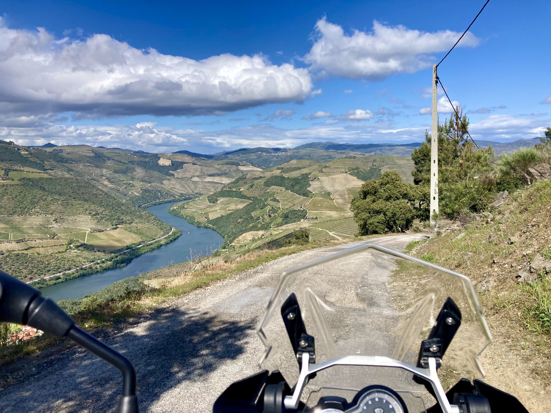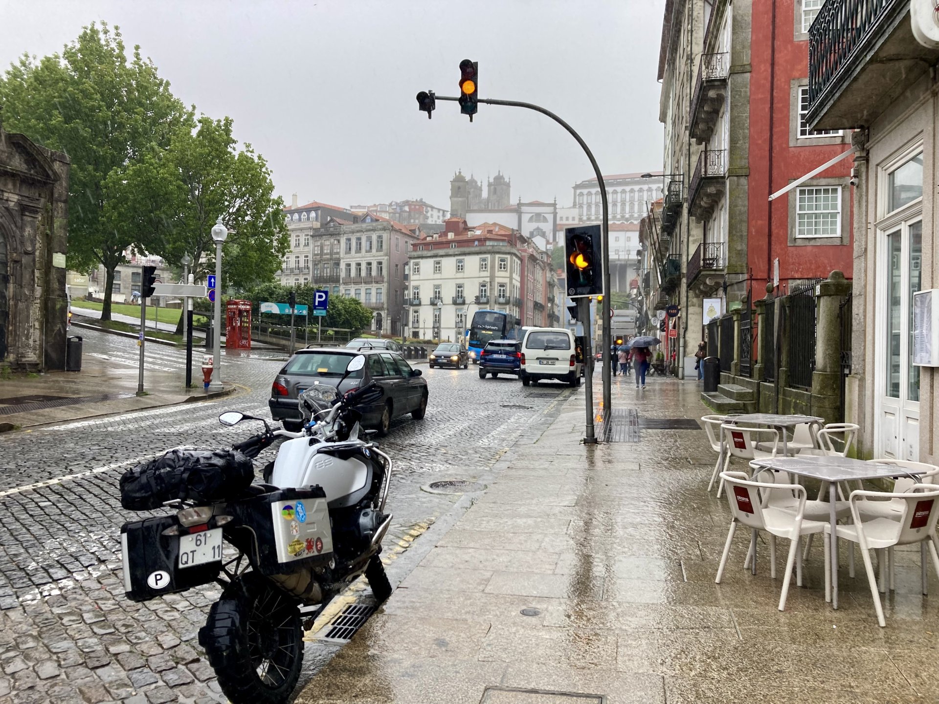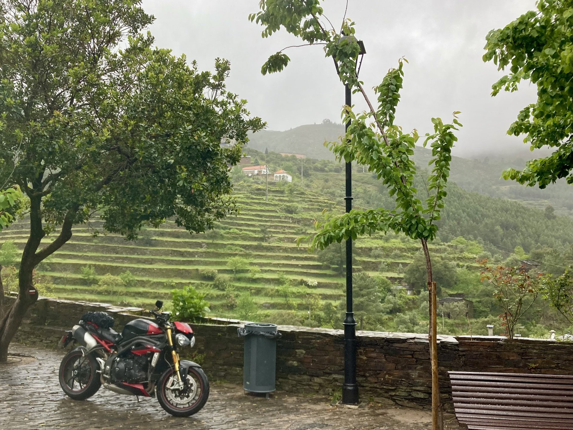 Morning arrived with rain, and plenty of it And under that weather we first tried some small country roads in the mountains, to then escape that with a beeline to the hotel for that evening. Arriving earlier than planned, we took a look at the local porcelain factory and museum. Took this picture just for you lot That evening we stayed in a lovely hotel, and caught an uber to go out for a typical great meal. All was well, in the morning we left with a promise of improving weather, but somehow that turned the other way and got worse. I, in a flash of optimism caused by some brief visions of blue skies turned up a mountain and that turned out to be a big mistake. Up there the promise of blue skies quickly turned into dark low clouds, and after a few minutes, snow fall. I didn't stop for pictures, the snow was falling quite heavily and the roads were suddenly with 4 to 5 cm of it, I was worried that by stopping it would quickly get to unrideable conditions, plus the mood wasn't for stopping and enjoying the views. Slowly, but as quickly as possible, we went down the mountain and out of the snow, to dive into a restaurant and warm up with hot soup and a great grilled steak. Properly warmed up, again we pointed the bikes towards a warm shower, made it to Porto in little more than an hour, that night we ate some tapas and listened to a little Fado. Next morning arrived, and we were heading up the Douro river. As we got ready to get out of the underground parking garage, we could hear the rain starting to pour outside A few moments, later, stopped in a very wet Porto while people were putting on their rain overalls. Two or three hours later of riding under lots of rain, we reached the high Douro and stopped to enjoy a deserved break in the weather. Clouds were moving very quickly, so whatever sunshine we had was brief. We rode the other 30 to 45 minutes up to our stay for the night, in a farmhouse, and braved the last kms of farm service roads. Great views on the roads to get there and upon destination. Over a nice meal watered with the farm's own wine, we ended our tour. The following day we faced some more moody skies on the way back home.6 points