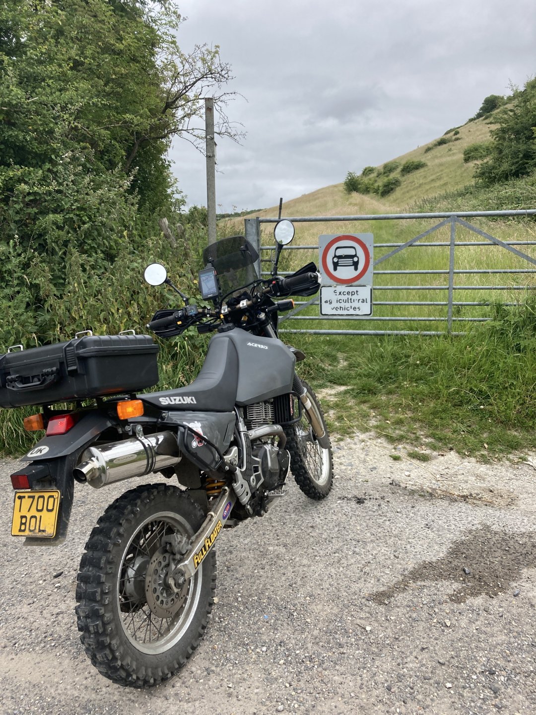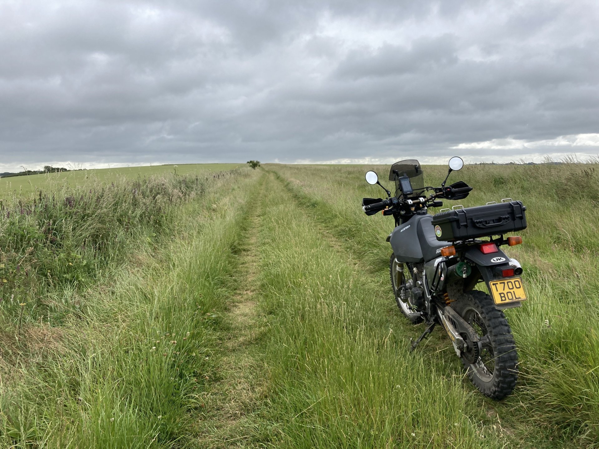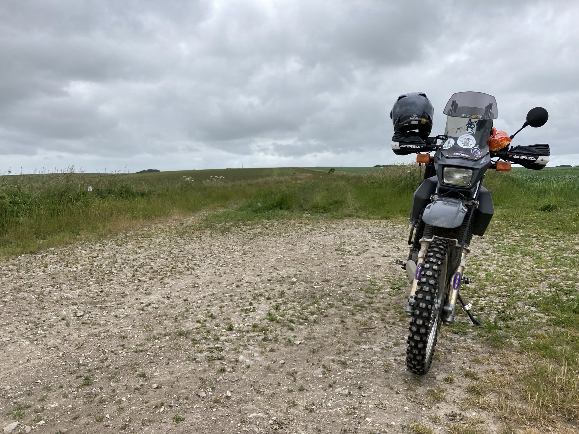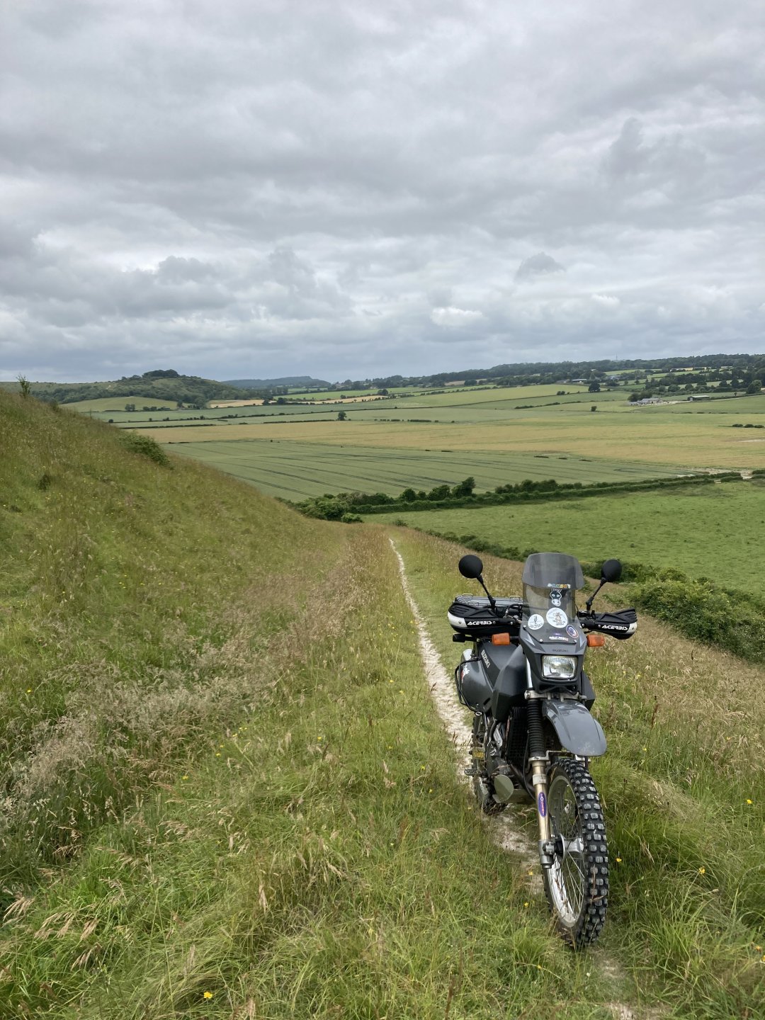 I was up early this morning and away by 7am . Took my usual route south until I got to the first lane near Gare Hill .............. It's that time of the year where a lot of the lanes are overgrown but I battled through it. Next I climbed up White Sheet Hill and stopped at the top to have a quick look at the round barrow .......... and then it was straight across the B3095 and across Mere Down ............... I dropped down through East Knoyle and came across an old windmill on the escarpment..................... The view from the windmill down over the hill.................... More overgrown stuff was taken on , I hate it when the ruts are hidden in the long grass After riding all along the ridge of the second part of White Sheet Hill I went up the lovely climb near the Fovant badges - https://en.wikipedia.org/wiki/Fovant_Badges and then rode on past the Salisbury racecourse ................... I rode around the back of Salisbury and up the Woodford Valley to get to the byway that leads to Stonehenge ............ Zoom in to see Stonehenge in the background................. I was planning on cutting across the Plain now but there was a big Army exercise going on so all routes were closed ................ So I changed my route and rode up the holloway at Potterne and then around the back of Devizes to head for home.......... It was a good day out all in all but I managed to snap the plunger that releases the lock on my prosthetic leg so I will have to get that sorted now. Also I've come to the conclusion that I need to let the DR650 go as it's just to tall for me now, it'll be a sad day when it goes but the WR250 is so much more manageable.5 points